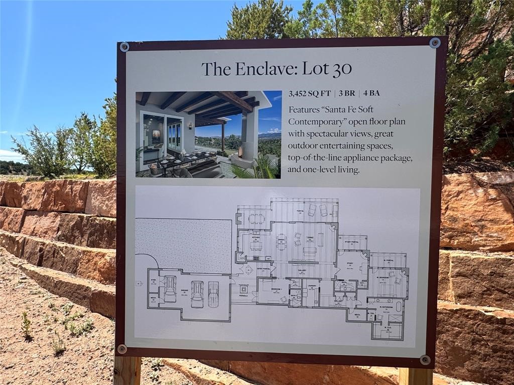 Lot 30 in The Enclave at Monte Sereno offers exceptional value, with the price including all development and site preparation. The lot features a pad-ready site and comes with fully approved architectural plans, ready for submission to the city of Santa Fe. As one of the lartest lots in the subdivision, Lot 30 is ideally positioned at the top of The Enclave. The southern edge of the building site overlooks a serene green space, adding a unique view dimension and enhancing the already spectacular vistas of the Sangre de Cristo Mountains. Bueyers may choose to work with Monte Sereno's premier builder, Odai Construction, or select a builder of their choice. Any modifications to the approved plan are subject to review by the developer, rather than the Monte Sereno Architectural Control Committee (ACC). Construction must begin within two years of lot purchase. Residents of The Enclave enjoy living in a truly gated section of Monte Sereno, located at the northernmost tip of the City of Santa Fe. High-speed fiber optic internet connectivity is available, ensuring fast and reliable digital access.