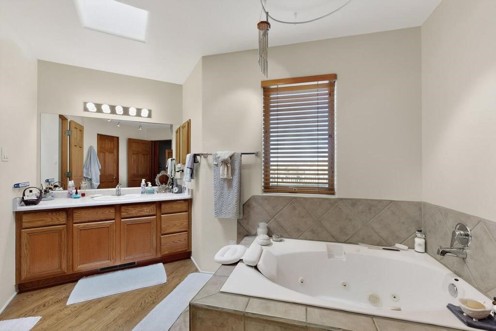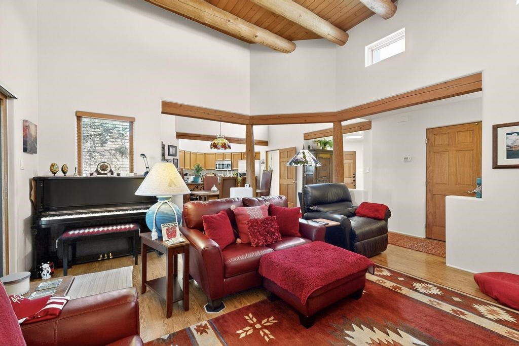 Don't miss this charming single-level home in Pueblos del Sol featuring three bedrooms and two bathrooms. This residence showcases classic Santa Fe details such as Vigas and a cozy Kiva fireplace. Lots of natural light streaming in from five skylights throughout the home. The open floor plan provides great flow and comfortable bedroom separation, while the spacious deck with a solid portal--accessible from both the living room and primary bedroom--offers the perfect place to relax and enjoy the beautiful mountain views. York Central air conditioning and a two-car garage complete this wonderful Santa Fe home. Additionally, the raised subfloor design allows for easy access to plumbing for repairs or modifications. Situated on a large, beautifully landscaped corner lot with native plants and an apricot tree, the property backs onto a greenbelt for added privacy. Recent updates include a finished garage with a new door (2016), a new TPO roof (2021), new coyote and dog-eared fencing (2021), stucco patched and stained (2025), a new hot water heater (2025), and a new sump pump (2023). We invite you to come take a look at this wonderful property.