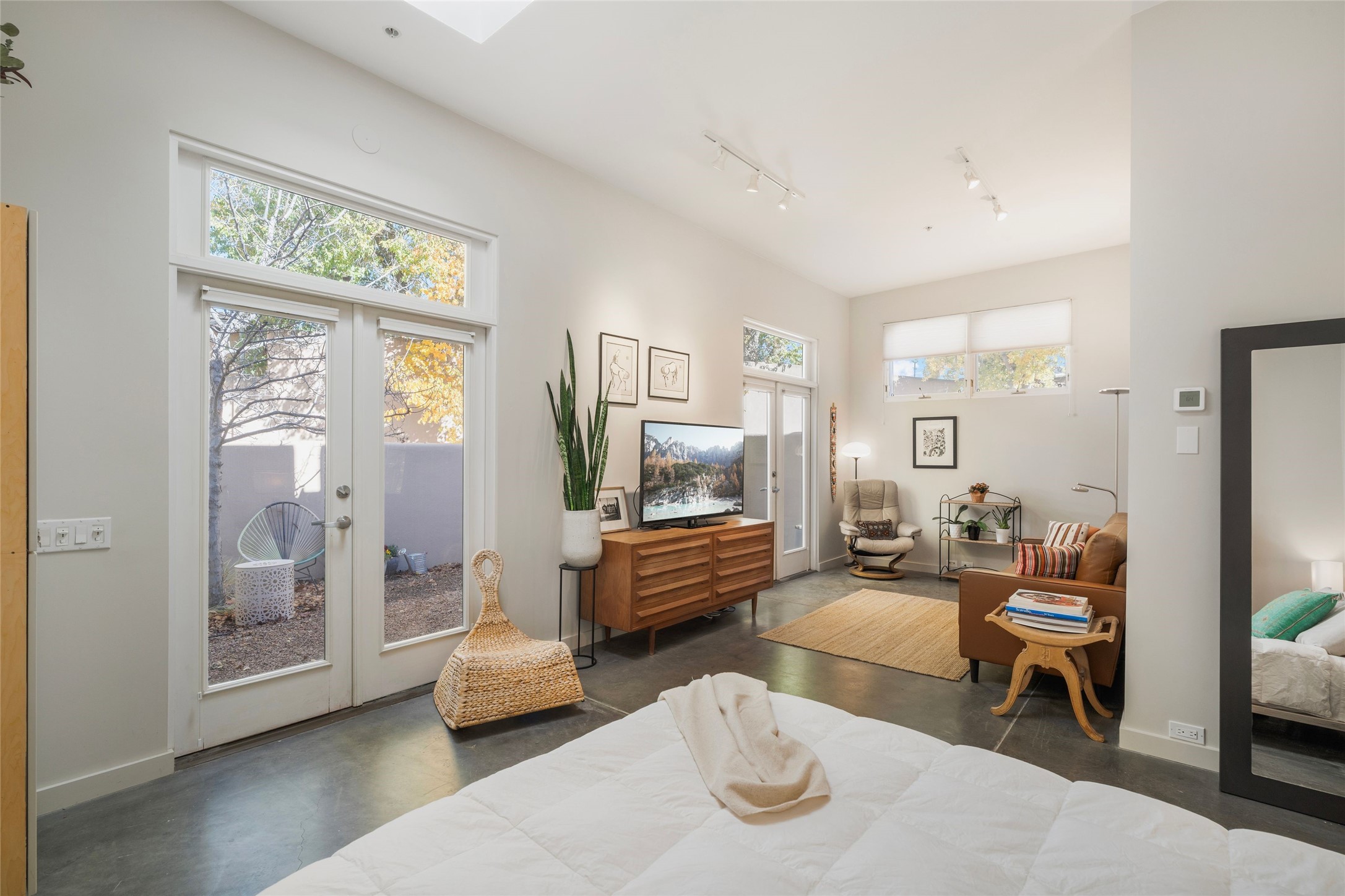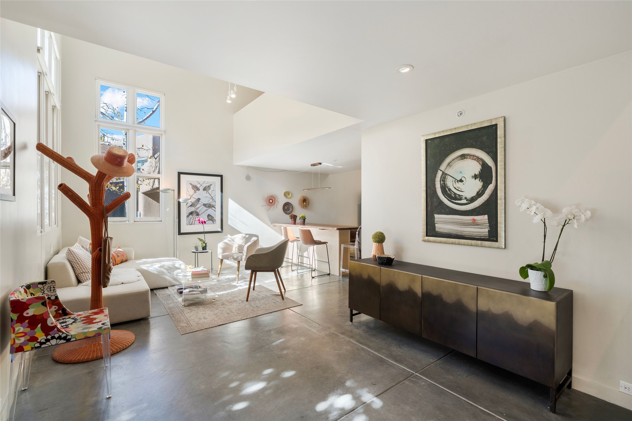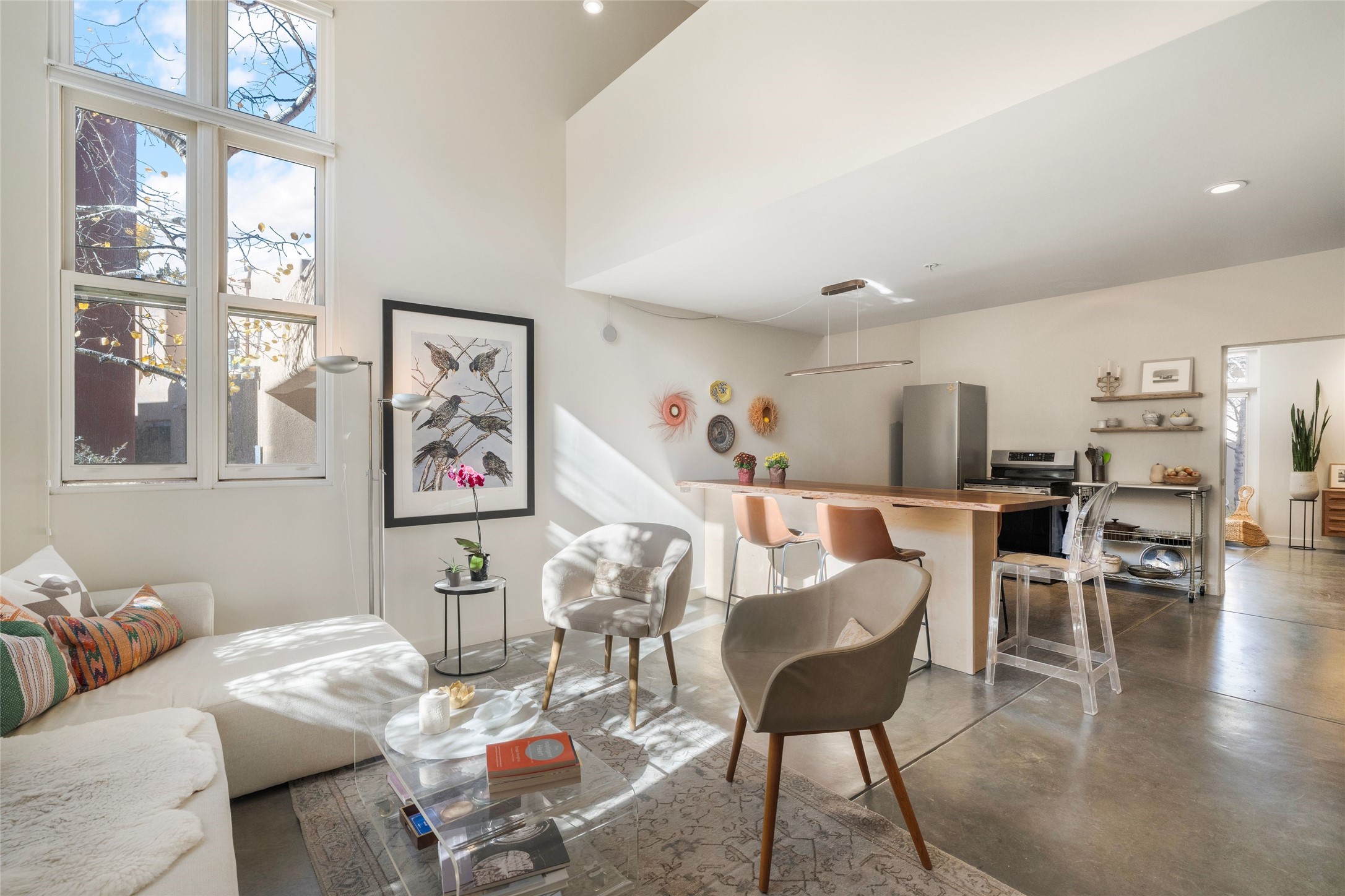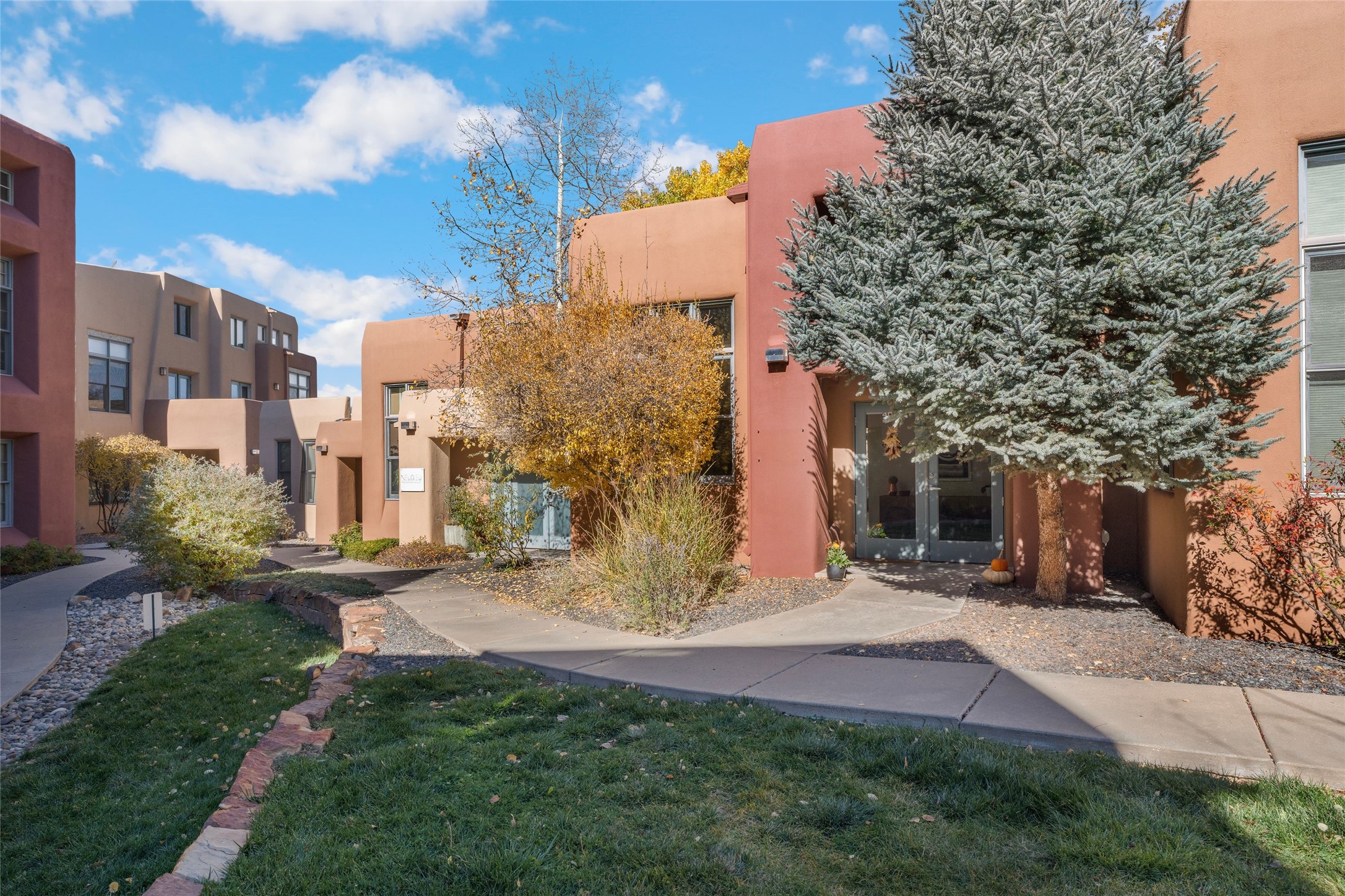 Set within the tranquil, landscaped interior of the Marquez Lofts complex, this bright, stylish condo--with no unit above it--has a desirable ground-floor entrance and rare, private back courtyard. The kitchen is creatively divided into two areas. Sink and storage are tucked tidily into a Butler's Pantry wing while a refrigerator and induction stove run along the wall behind the gorgeous, live edge, cherry and sapele wood dining counter by Boxcar Woody. A gentle flight of steps, with under-stair storage, leads to the sleeping loft. Downstairs, the spacious main bedroom has an ensuite, bath. Two double doors access the walled courtyard, perfect for pets or as an intimate retreat. Alternatively, with its back gate entry, this space could serve clients, leaving the main section for personal use. Graced with character, convenience and contemporary charm, this live-work dwelling favors the needs of creatives, entrepreneurs, and anyone seeking a residential refuge in a prime location by the Railyard, restaurants and shopping.