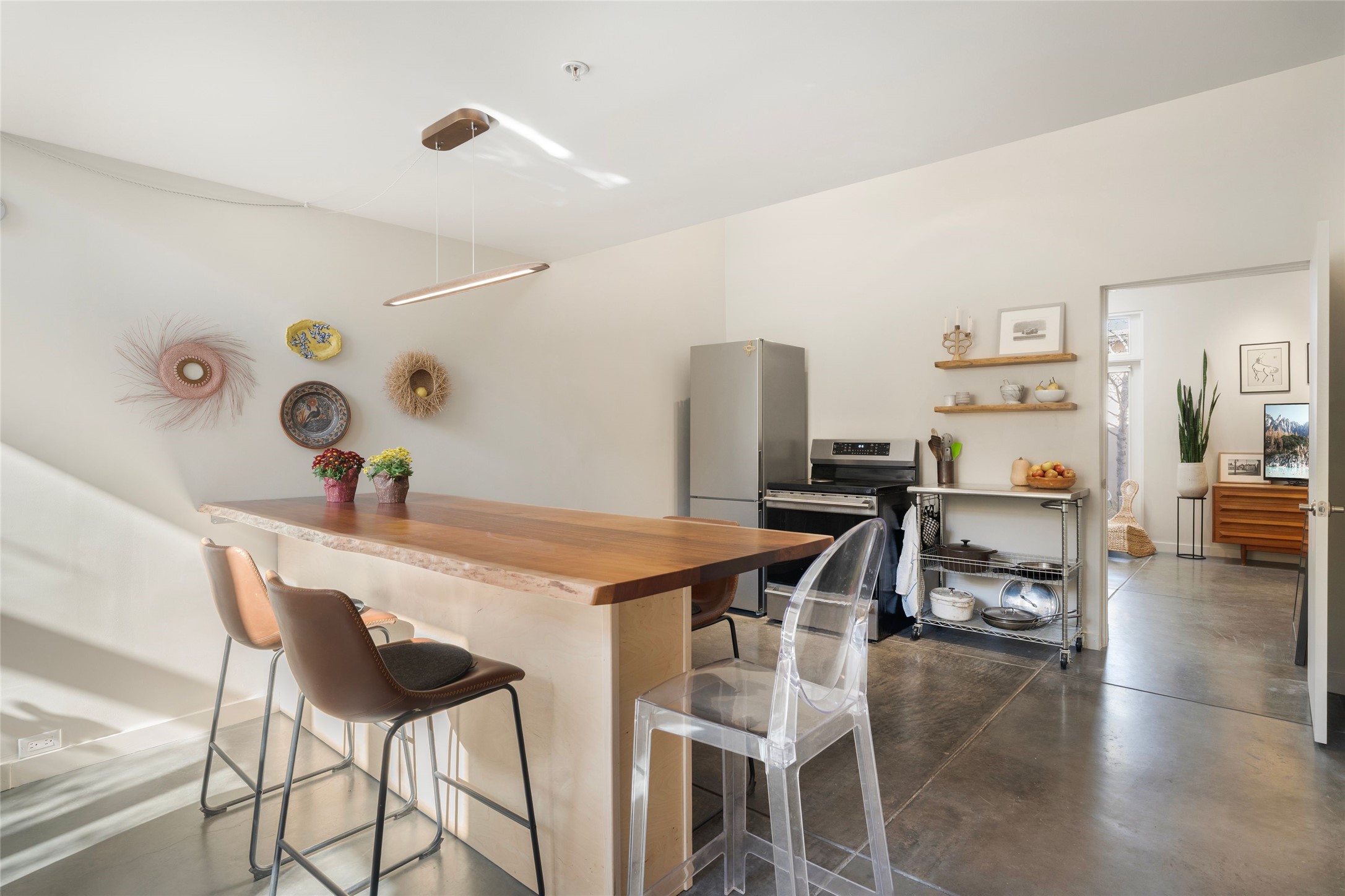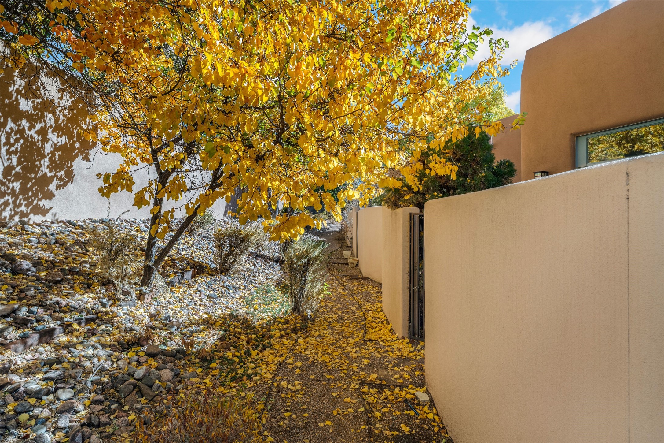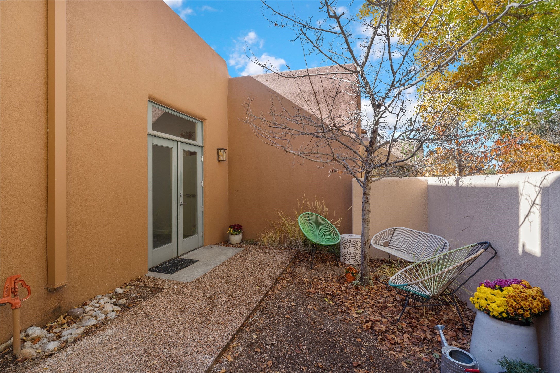Set within the tranquil, landscaped interior of the Marquez Lofts complex, this bright, stylish condo--with no unit above it--has a desirable ground-floor entrance and rare, private back courtyard. The kitchen is creatively divided into two areas. Sink and storage are tucked tidily into a Butler's Pantry wing while a refrigerator and induction stove run along the wall behind the gorgeous, live edge, cherry and sapele wood dining counter by Boxcar Woody. A gentle flight of steps, with under-stair storage, leads to the sleeping loft. Downstairs, the spacious main bedroom has an ensuite, bath. Two double doors access the walled courtyard, perfect for pets or as an intimate retreat. Alternatively, with its back gate entry, this space could serve clients, leaving the main section for personal use. Graced with character, convenience and contemporary charm, this live-work dwelling favors the needs of creatives, entrepreneurs, and anyone seeking a residential refuge in a prime location by the Railyard, restaurants and shopping.