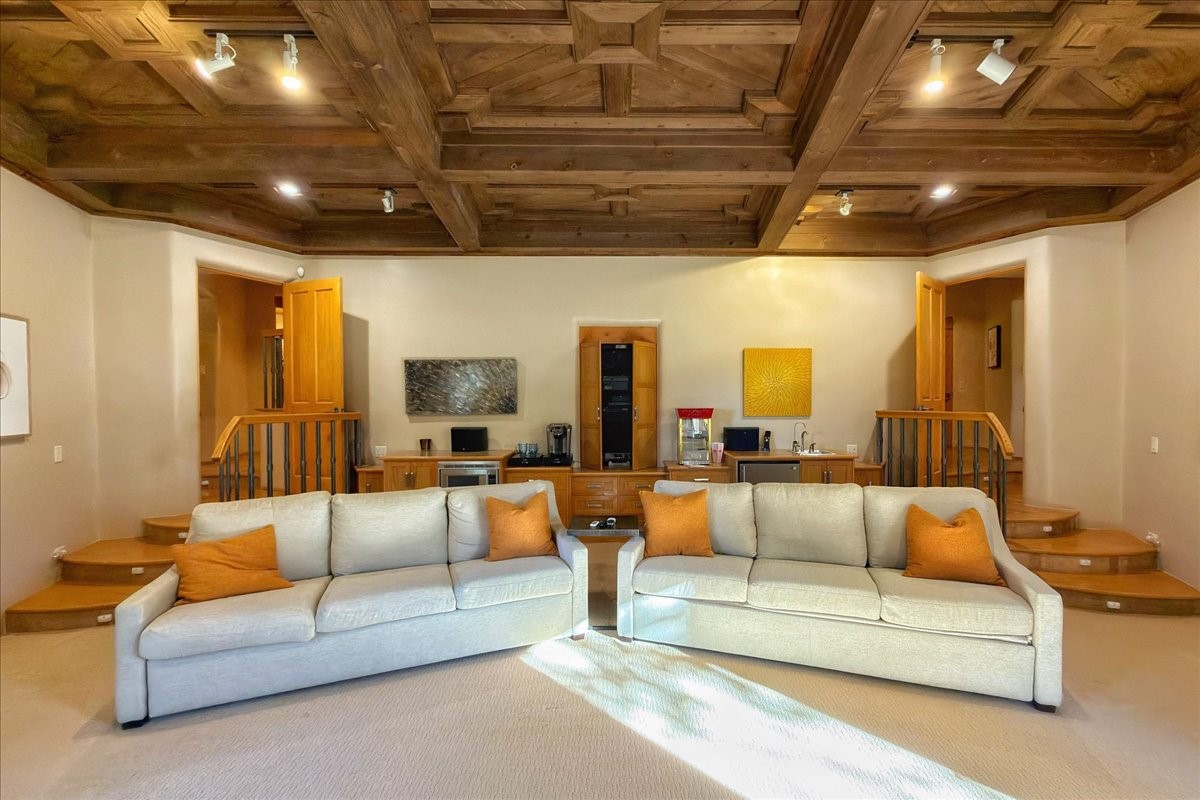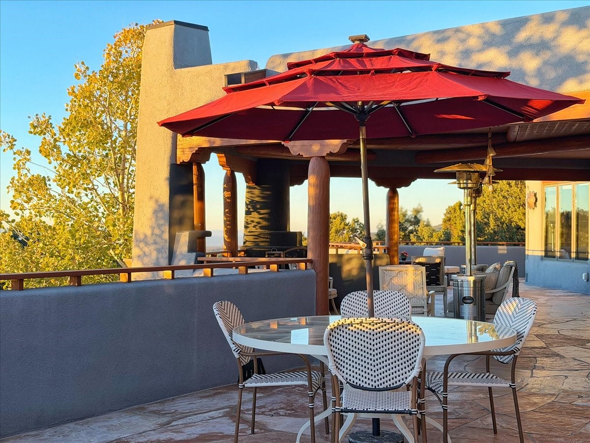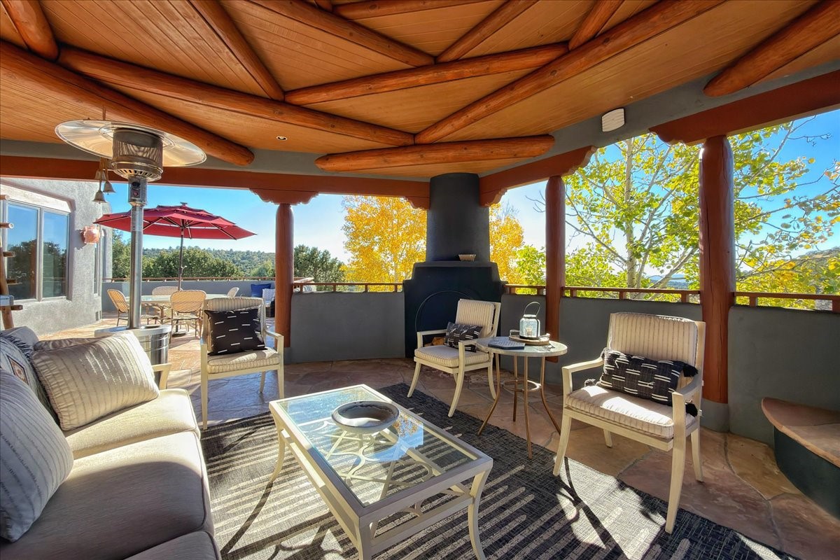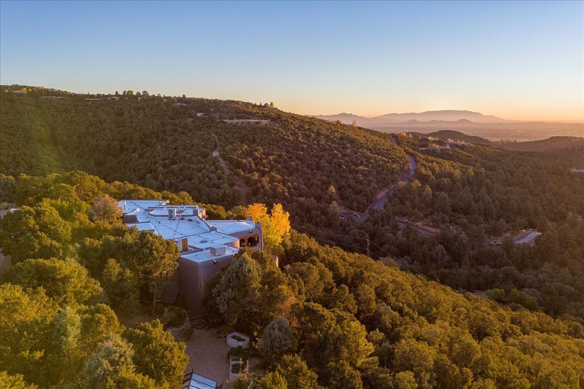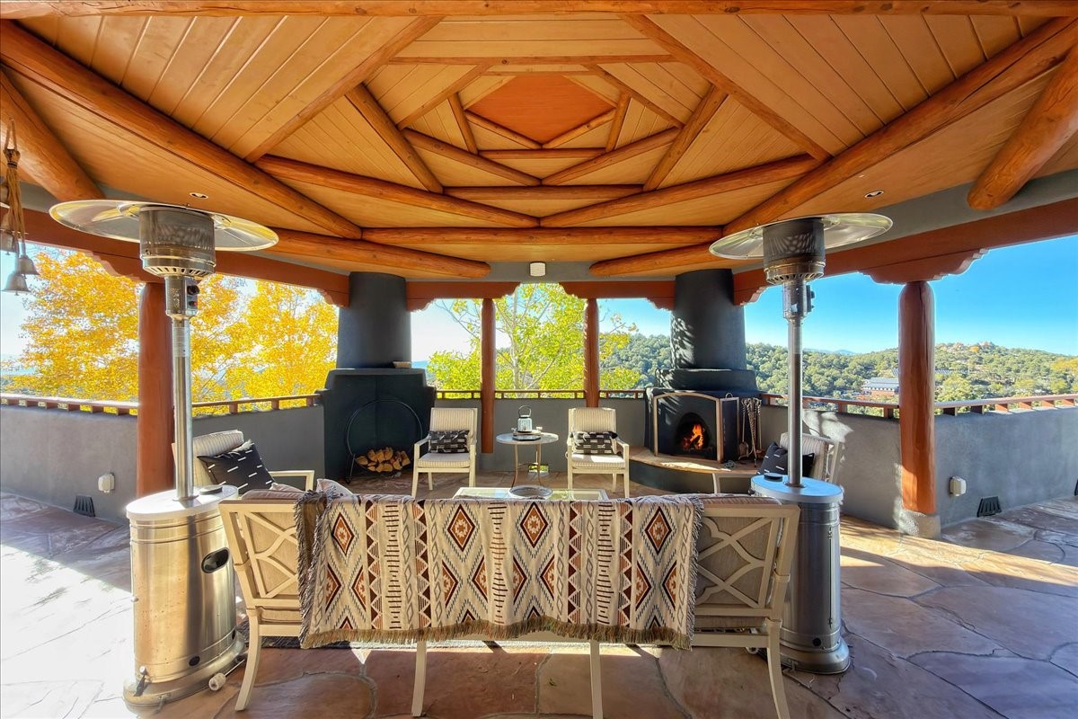 Whispering Hill--where nature's quiet beauty keeps its own gentle secrets. Set within Hyde Park Estates, this architectural statement captures panoramic vistas that are rare even for Santa Fe--a dramatic sweep of horizon, sculpted mountains, and ever-changing light. Designed with a flexible five-bedroom layout, Whispering Hill offers versatility without sacrificing elegance. The main level functions as a complete living environment, ideal for those who prefer life without stairs. A tranquil primary suite, sophisticated gathering areas, and rare hardwood cabinetry set a tone of refined luxury from the moment you arrive. Throughout the residence, artisan ceilings--each one individually crafted--serve as sculptural centerpieces across both levels and extend to the outdoor entertaining terrace, where their artistry meets the surrounding landscape with extraordinary effect. The Media Room, anchored by a gigantic viewing screen, was envisioned for cinema, live sporting events, and immersive entertainment--an atmospheric space designed for true enjoyment. The lower level continues the architectural flow with a second primary suite and additional bedrooms, each offering direct outdoor access to terraces, pathways, and quiet corners of the landscape. Outdoor living expands with multiple areas to gather, including a radiant-heated portal, a GreenHouse, secluded seating spaces designed for unplugged relaxation, and a private hot tub positioned just outside one of the lower-level bedrooms--a serene vantage point for stargazing and quiet evenings. From the elevated main terrace, you can see 10,000 Waves, Santa Fe's renowned Japanese-inspired spa nestled among the pines. Across the grounds, irrigated landscaping enhances the natural contours of the site, ensuring year-round beauty, color, and ease of care. Climate comfort is thoughtfully supported by eight strategically placed mini-splits for individualized heating and cooling, working in tandem with the primary systems to ensure four-season comfort at altitude. A pre-listing home inspection has already been completed, offering added transparency and confidence for prospective buyers. Minutes from the Santa Fe Plaza, Whispering Hill is an exceptional choice for those seeking either a full-time luxury residence or an elevated secondary retreat. With premium upgrades far too numerous to list, rare materials, master craftsmanship, and one of Santa Fe's most compelling vantage points, Whispering Hill stands as a true Santa Fe masterpiece--a seamless fusion of design, nature, and elevated mountain living.