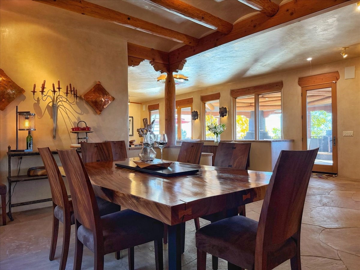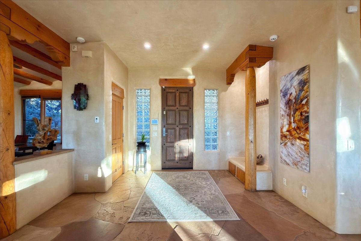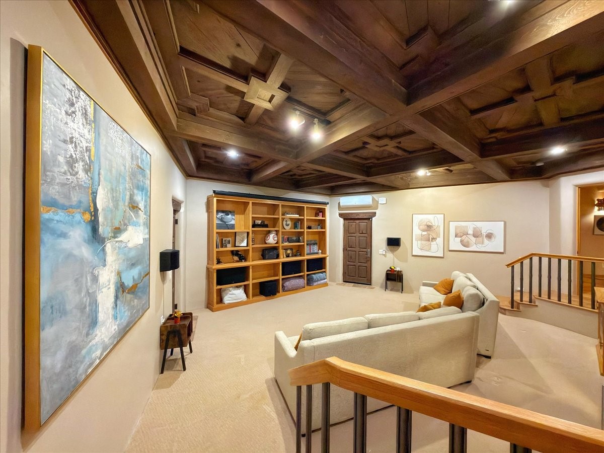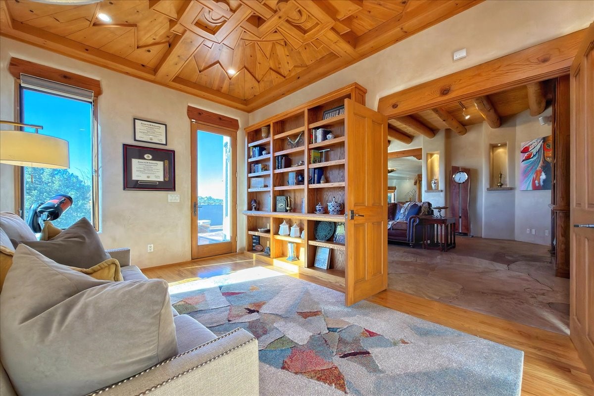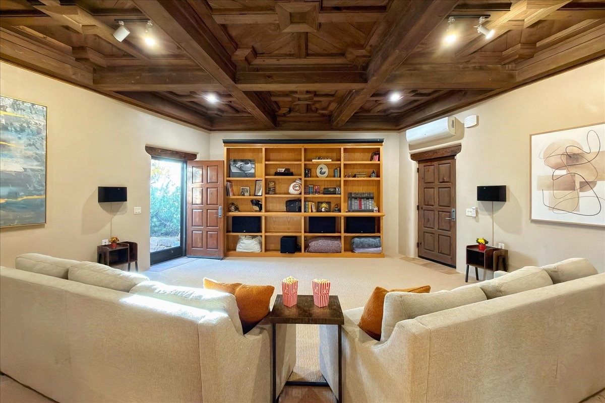 Whispering Hill--where nature's quiet beauty keeps its own gentle secrets. Set within Hyde Park Estates, this architectural statement captures panoramic vistas that are rare even for Santa Fe--a dramatic sweep of horizon, sculpted mountains, and ever-changing light. Designed with a flexible five-bedroom layout, Whispering Hill offers versatility without sacrificing elegance. The main level functions as a complete living environment, ideal for those who prefer life without stairs. A tranquil primary suite, sophisticated gathering areas, and rare hardwood cabinetry set a tone of refined luxury from the moment you arrive. Throughout the residence, artisan ceilings--each one individually crafted--serve as sculptural centerpieces across both levels and extend to the outdoor entertaining terrace, where their artistry meets the surrounding landscape with extraordinary effect. The Media Room, anchored by a gigantic viewing screen, was envisioned for cinema, live sporting events, and immersive entertainment--an atmospheric space designed for true enjoyment. The lower level continues the architectural flow with a second primary suite and additional bedrooms, each offering direct outdoor access to terraces, pathways, and quiet corners of the landscape. Outdoor living expands with multiple areas to gather, including a radiant-heated portal, a GreenHouse, secluded seating spaces designed for unplugged relaxation, and a private hot tub positioned just outside one of the lower-level bedrooms--a serene vantage point for stargazing and quiet evenings. From the elevated main terrace, you can see 10,000 Waves, Santa Fe's renowned Japanese-inspired spa nestled among the pines. Across the grounds, irrigated landscaping enhances the natural contours of the site, ensuring year-round beauty, color, and ease of care. Climate comfort is thoughtfully supported by eight strategically placed mini-splits for individualized heating and cooling, working in tandem with the primary systems to ensure four-season comfort at altitude. A pre-listing home inspection has already been completed, offering added transparency and confidence for prospective buyers. Minutes from the Santa Fe Plaza, Whispering Hill is an exceptional choice for those seeking either a full-time luxury residence or an elevated secondary retreat. With premium upgrades far too numerous to list, rare materials, master craftsmanship, and one of Santa Fe's most compelling vantage points, Whispering Hill stands as a true Santa Fe masterpiece--a seamless fusion of design, nature, and elevated mountain living.