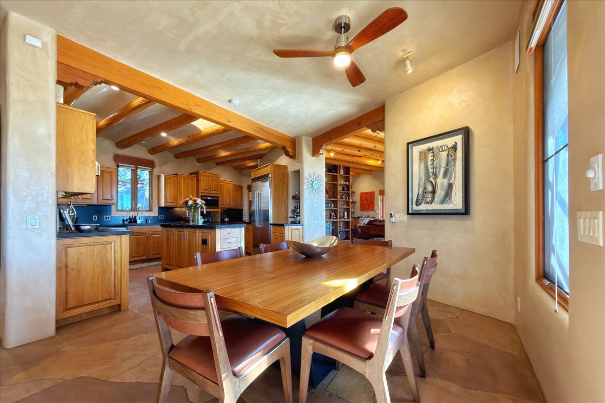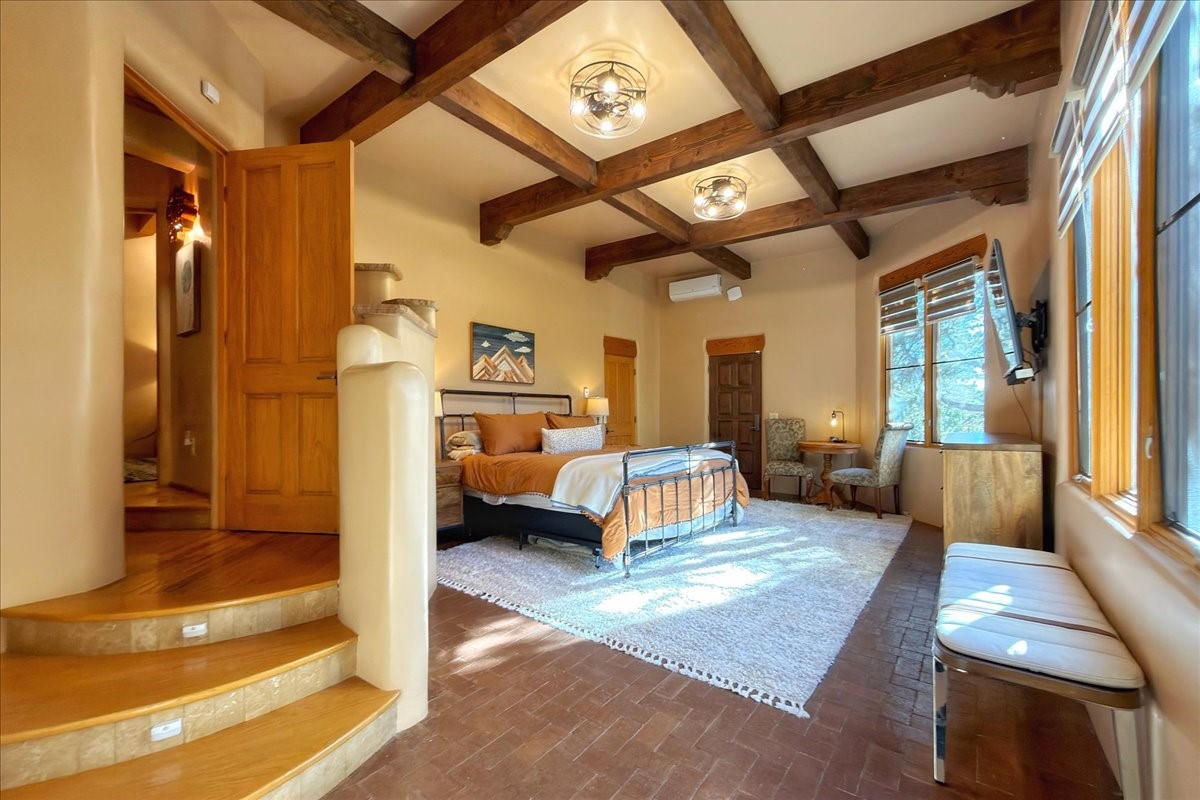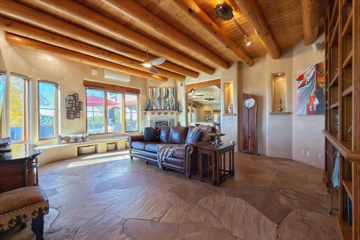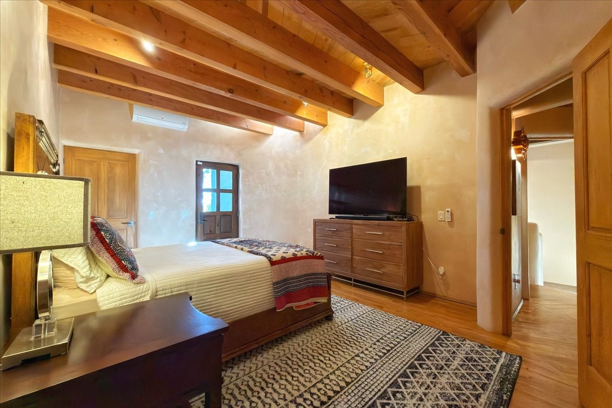 Whispering Hill--where nature's quiet beauty keeps its own gentle secrets. Set within Hyde Park Estates, this architectural statement captures panoramic vistas that are rare even for Santa Fe--a dramatic sweep of horizon, sculpted mountains, and ever-changing light. Designed with a flexible five-bedroom layout, Whispering Hill offers versatility without sacrificing elegance. The main level functions as a complete living environment, ideal for those who prefer life without stairs. A tranquil primary suite, sophisticated gathering areas, and rare hardwood cabinetry set a tone of refined luxury from the moment you arrive. Throughout the residence, artisan ceilings--each one individually crafted--serve as sculptural centerpieces across both levels and extend to the outdoor entertaining terrace, where their artistry meets the surrounding landscape with extraordinary effect. The Media Room, anchored by a gigantic viewing screen, was envisioned for cinema, live sporting events, and immersive entertainment--an atmospheric space designed for true enjoyment. The lower level continues the architectural flow with a second primary suite and additional bedrooms, each offering direct outdoor access to terraces, pathways, and quiet corners of the landscape. Outdoor living expands with multiple areas to gather, including a radiant-heated portal, a GreenHouse, secluded seating spaces designed for unplugged relaxation, and a private hot tub positioned just outside one of the lower-level bedrooms--a serene vantage point for stargazing and quiet evenings. From the elevated main terrace, you can see 10,000 Waves, Santa Fe's renowned Japanese-inspired spa nestled among the pines. Across the grounds, irrigated landscaping enhances the natural contours of the site, ensuring year-round beauty, color, and ease of care. Climate comfort is thoughtfully supported by eight strategically placed mini-splits for individualized heating and cooling, working in tandem with the primary systems to ensure four-season comfort at altitude. A pre-listing home inspection has already been completed, offering added transparency and confidence for prospective buyers. Minutes from the Santa Fe Plaza, Whispering Hill is an exceptional choice for those seeking either a full-time luxury residence or an elevated secondary retreat. With premium upgrades far too numerous to list, rare materials, master craftsmanship, and one of Santa Fe's most compelling vantage points, Whispering Hill stands as a true Santa Fe masterpiece--a seamless fusion of design, nature, and elevated mountain living.