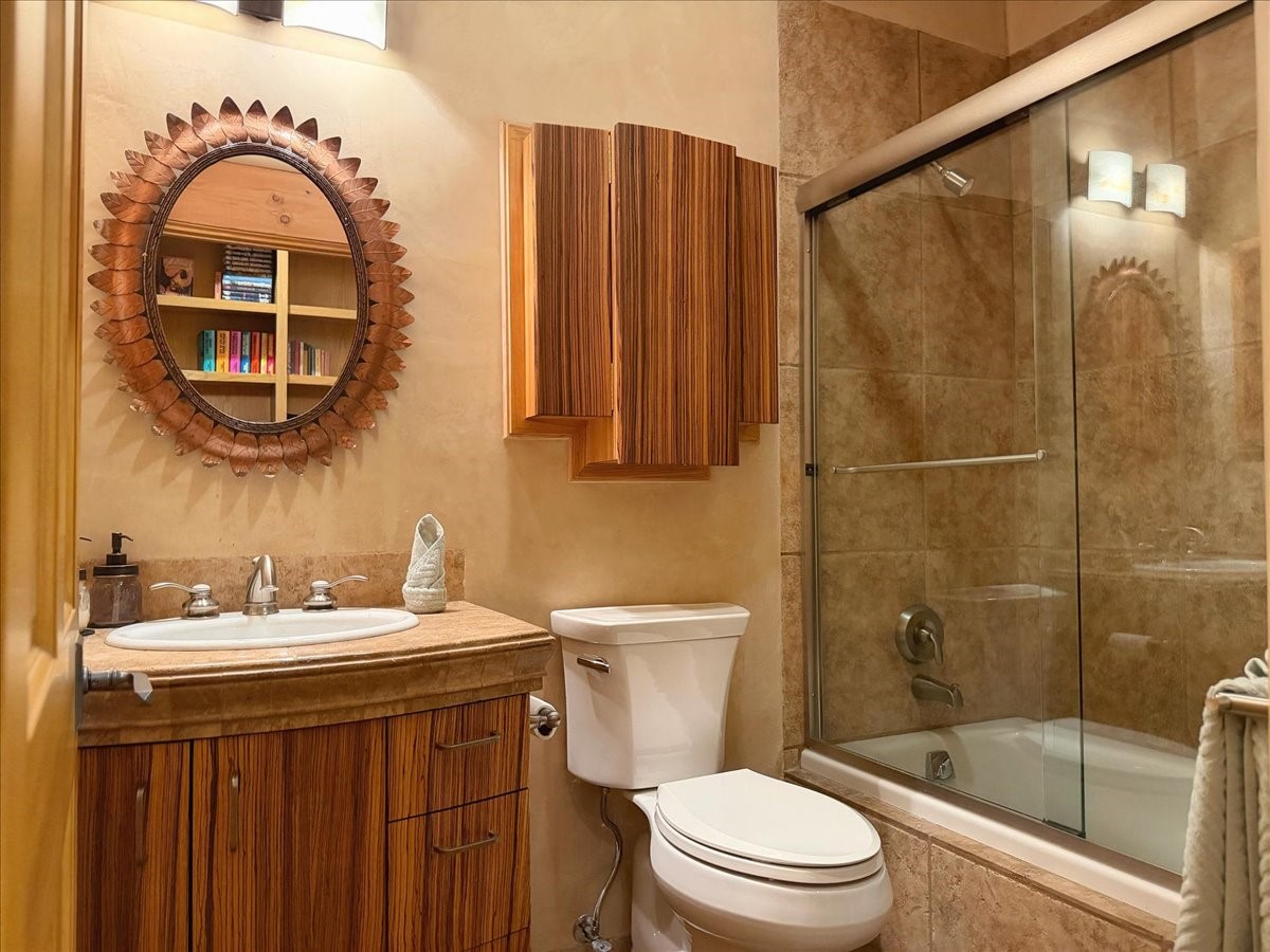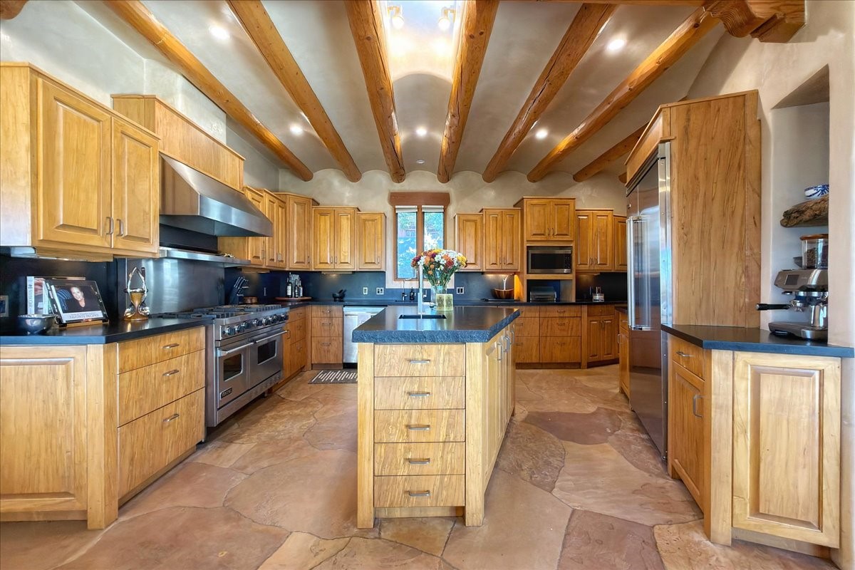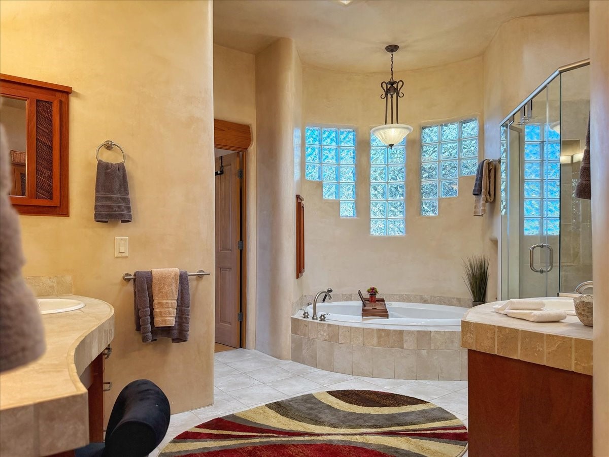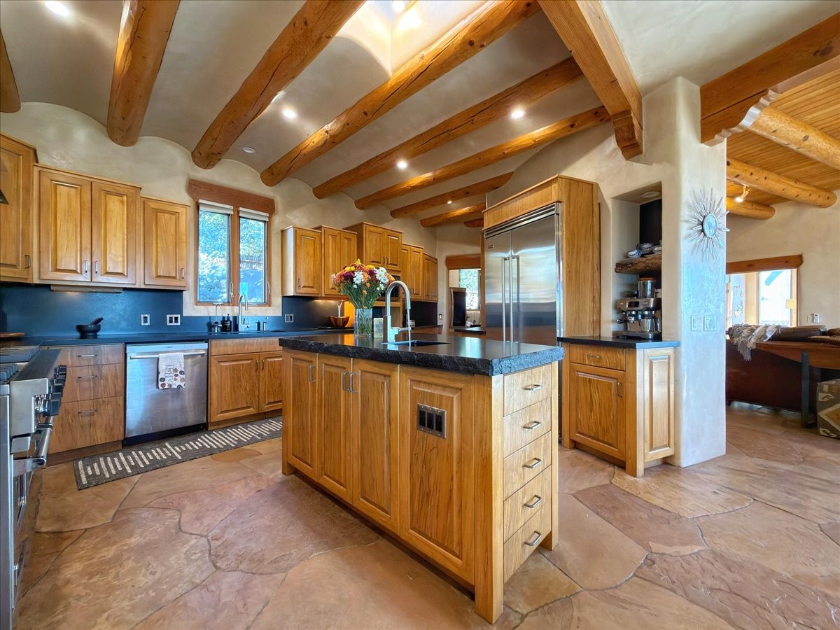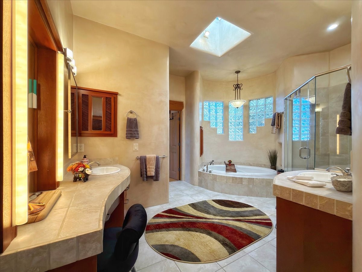 Whispering Hill--where nature's quiet beauty keeps its own gentle secrets. Set within Hyde Park Estates, this architectural statement captures panoramic vistas that are rare even for Santa Fe--a dramatic sweep of horizon, sculpted mountains, and ever-changing light. Designed with a flexible five-bedroom layout, Whispering Hill offers versatility without sacrificing elegance. The main level functions as a complete living environment, ideal for those who prefer life without stairs. A tranquil primary suite, sophisticated gathering areas, and rare hardwood cabinetry set a tone of refined luxury from the moment you arrive. Throughout the residence, artisan ceilings--each one individually crafted--serve as sculptural centerpieces across both levels and extend to the outdoor entertaining terrace, where their artistry meets the surrounding landscape with extraordinary effect. The Media Room, anchored by a gigantic viewing screen, was envisioned for cinema, live sporting events, and immersive entertainment--an atmospheric space designed for true enjoyment. The lower level continues the architectural flow with a second primary suite and additional bedrooms, each offering direct outdoor access to terraces, pathways, and quiet corners of the landscape. Outdoor living expands with multiple areas to gather, including a radiant-heated portal, a GreenHouse, secluded seating spaces designed for unplugged relaxation, and a private hot tub positioned just outside one of the lower-level bedrooms--a serene vantage point for stargazing and quiet evenings. From the elevated main terrace, you can see 10,000 Waves, Santa Fe's renowned Japanese-inspired spa nestled among the pines. Across the grounds, irrigated landscaping enhances the natural contours of the site, ensuring year-round beauty, color, and ease of care. Climate comfort is thoughtfully supported by eight strategically placed mini-splits for individualized heating and cooling, working in tandem with the primary systems to ensure four-season comfort at altitude. A pre-listing home inspection has already been completed, offering added transparency and confidence for prospective buyers. Minutes from the Santa Fe Plaza, Whispering Hill is an exceptional choice for those seeking either a full-time luxury residence or an elevated secondary retreat. With premium upgrades far too numerous to list, rare materials, master craftsmanship, and one of Santa Fe's most compelling vantage points, Whispering Hill stands as a true Santa Fe masterpiece--a seamless fusion of design, nature, and elevated mountain living.