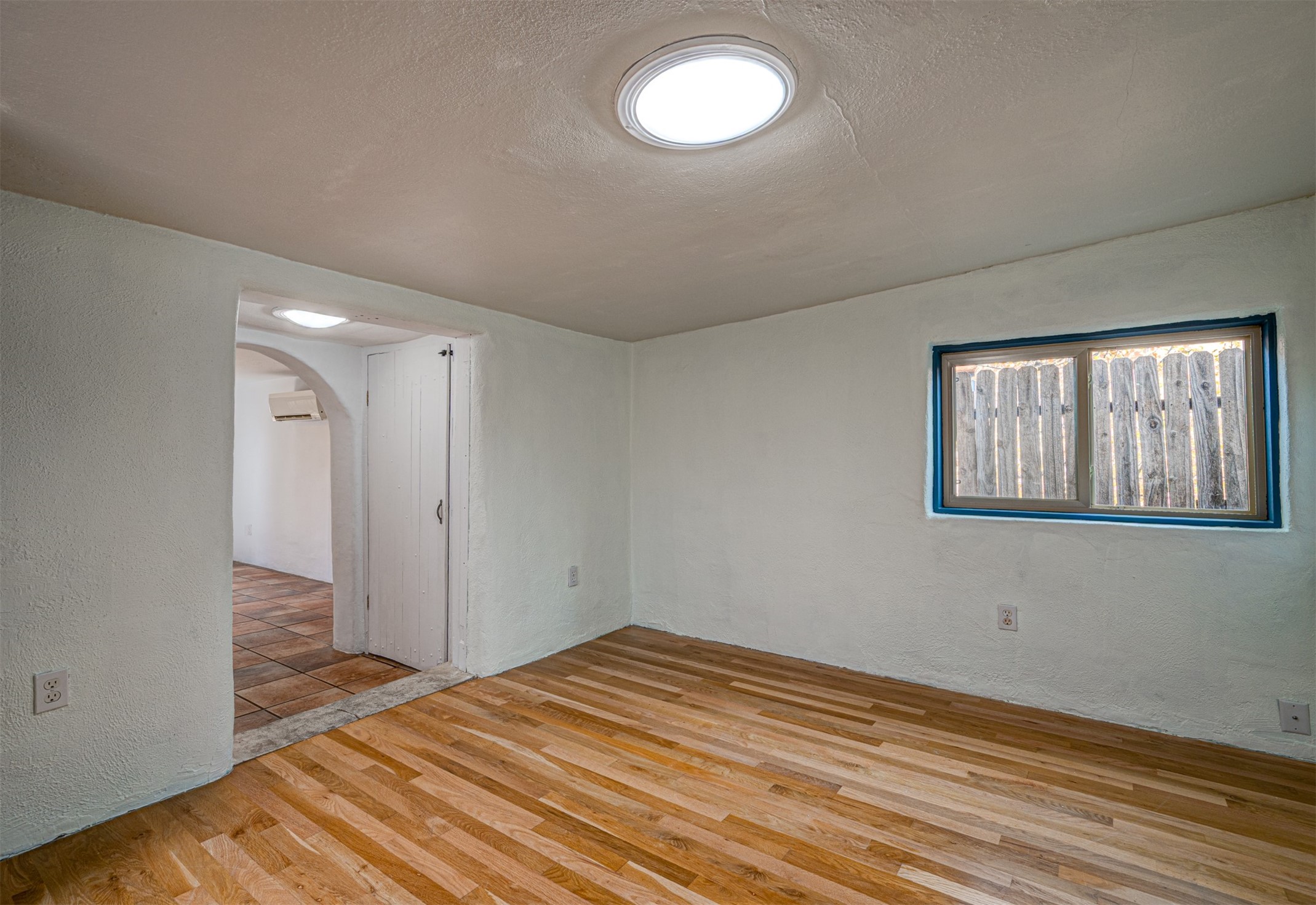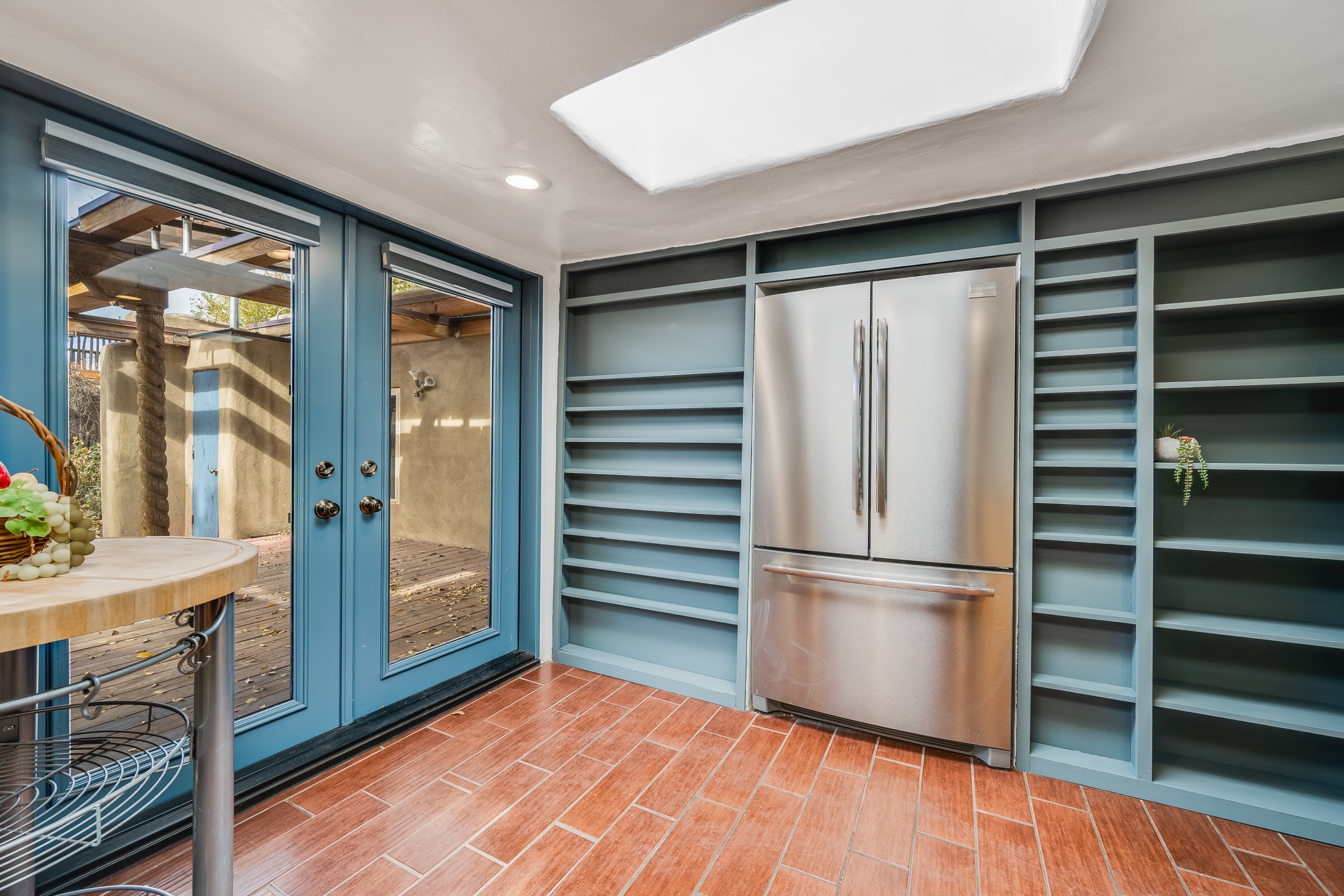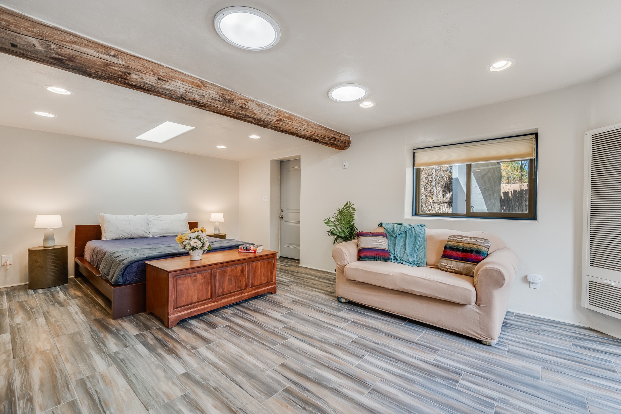 Located in the vibrant Railyard neighborhood just steps from the bustling Santa Fe Farmers Market and the Railyard Park, this charming single level abode offers 1,885 square feet of interior living space, manicured grounds, and exceptional proximity to all things Santa Fe. The floorpan features three spacious bedrooms and two bathrooms, as well as a detached studio with bath and kitchenette for additional living space, artistic endeavors, or work. Timeless New Mexican architecture is showcased throughout, with hand-carved vigas and beams, wood floors, and kiva fireplaces--one gas and one wood-burning. The main kitchen is outfitted with stainless steel appliances, stone countertops, and allows for a seamless flow into the dining and living areas- perfect for everyday living or entertaining guests. Skylights, newer windows and French doors bathe the interior with natural light while a SOLAR PV system adds a touch of sustainability. With a fully fenced yard, the uber private outdoor retreat is complemented by a hot tub and mature fruit and shade trees, a storage shed, and water feature. This downtown oasis is the ideal full-time residence, vacation home, or income-generating property. Whole Foods Market, local shops, parks, and restaurants are just a short distance away, adding convenience to its unique charm. Unparalleled flexibility of use in one of Santa Fe's most accessible and desirable areas at a compelling price point is a true one-of-a-kind opportunity.