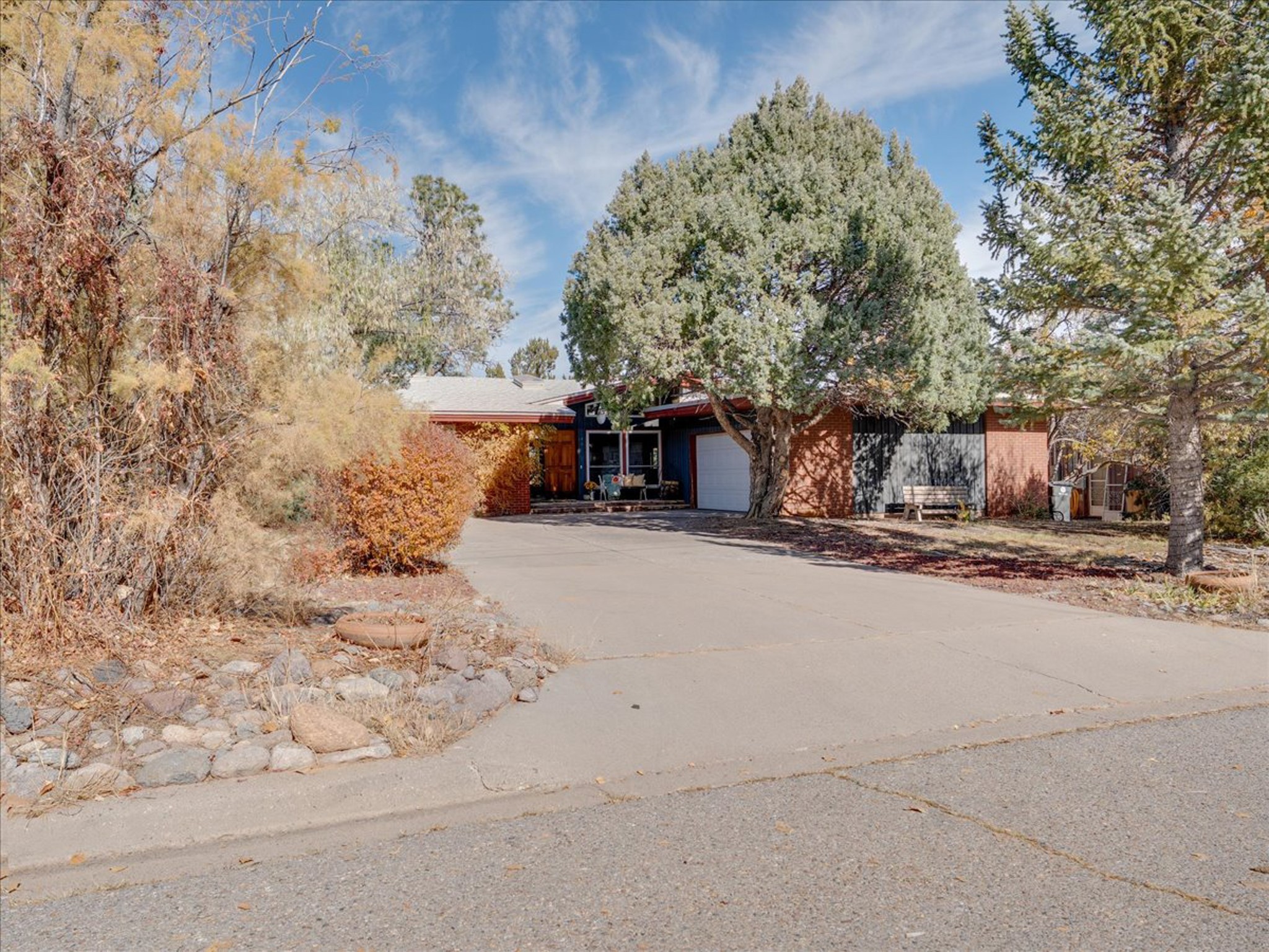 Stunning Barranca Mesa home overlooking Rendija Canyon. Perched on a generous 0.335-acre canyon lot, this property offers the best of both worlds - expansive outdoor space paired with sweeping canyon views. Mature pine trees provide natural beauty, shade, and privacy. Inside, a spacious living room features floor-to-ceiling picture windows and a striking raw-edge quartz fireplace with a wraparound mantle that flows into the dining room, which is large enough to serve as a second living area. The bright white kitchen offers ample room for an eat-in nook, pantry, and the adjacent laundry room provides direct garage access, functioning perfectly as a mudroom or drop zone. The primary suite includes a built-in vanity, a walk-in closet, and large windows facing the canyon. Three additional bedrooms and a guest bath complete the floor plan. From the dining room, step out onto a lovely balcony overlooking the canyon, ideal for morning coffee or evening sunsets. You'll also find a fenced dog run with low-maintenance artificial turf, perfect for pets. Recent updates include a new roof (2024), a new heating system (2025), new flooring (2025), a refrigerator (2025), interior paint (2025), new blinds in the living room, family room, kitchen, and a bedroom (2025), and newer double-pane windows (2005). This is a rare opportunity to own a beautiful home with unmatched canyon views on Barranca Mesa. This one is not to be missed! Schedule a private showing today. Disclosure: Owner Broker