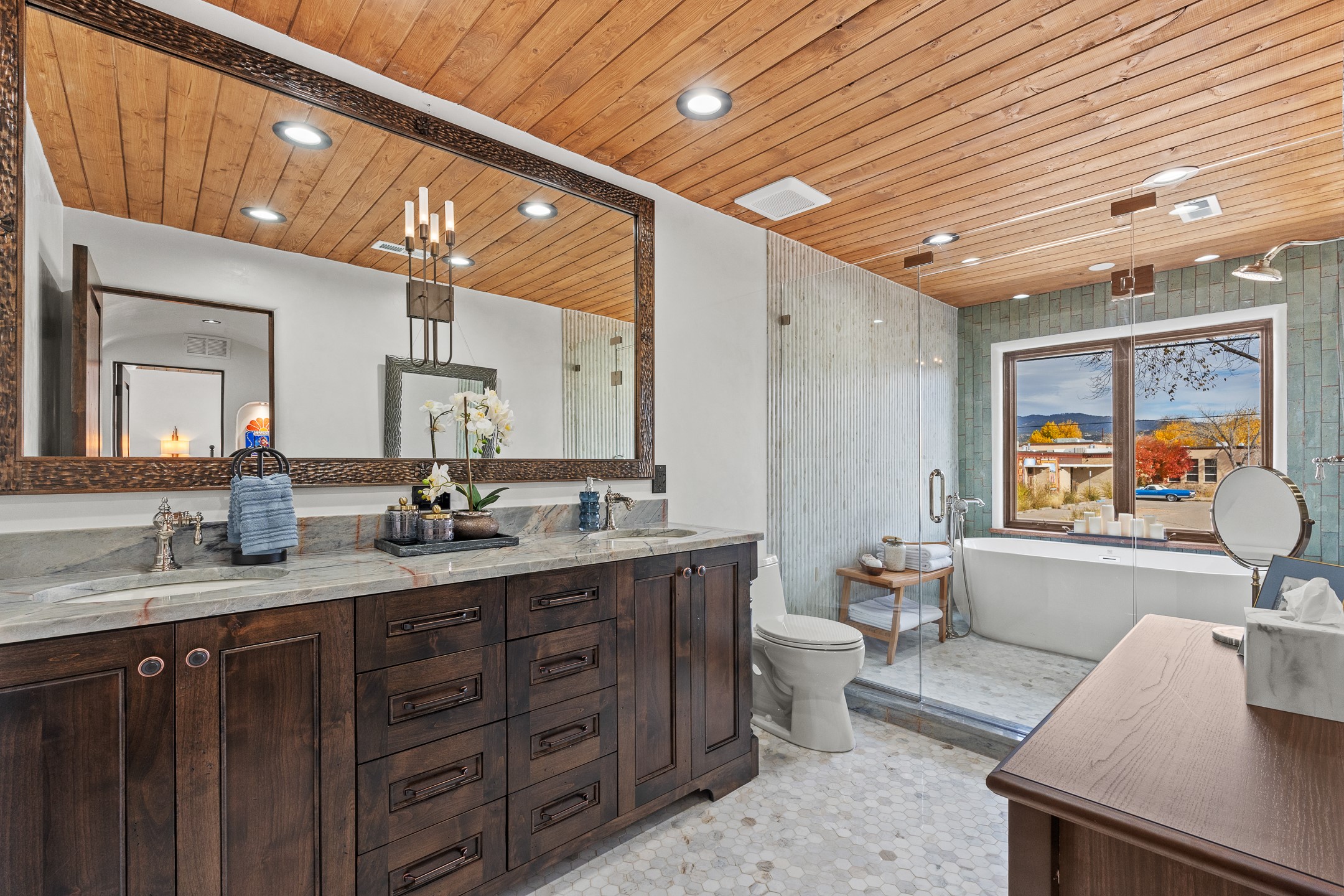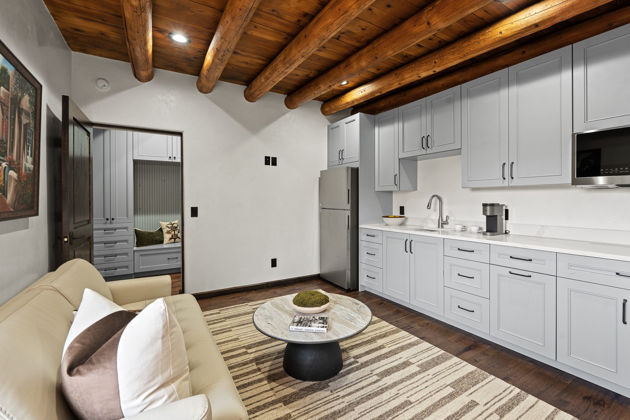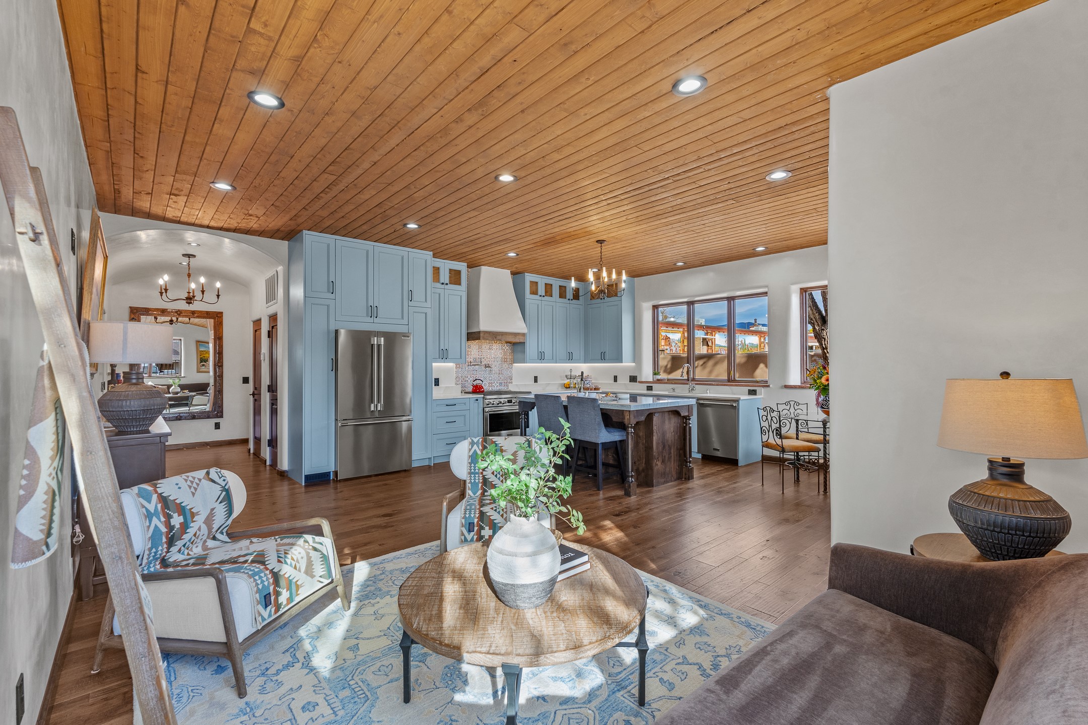 Timeless Santa Fe Charm Just Steps from the Railyard. Nestled in one of Santa Fe's most coveted locations, this beautifully restored adobe offers a rare blend of historic charm and modern luxury--just steps from the vibrant Railyard District and a short walk to the Plaza and Canyon Road. Originally constructed in the early 1900s, this 3-bedroom residence is complete with an attached studio or 4th bedroom that has been meticulously renovated to preserve its authentic character. Original vigas, flawless diamond plaster walls, arched entryways, and tongue-and-groove ceilings with recessed lighting create a warm, light-filled ambiance on a desirable corner lot. The home features two spacious primary suites--one on each level--offering flexibility and privacy. Entire second floor is dedicated to a primary suite with spa like bathroom with views of the Sangre De Cristo Mountains, an extra large closet and oversized suite with roof top access and dry bar with wine fridge. The attached studio, on the main level has its own private entrance, which is perfect for guests, extended family, or a dedicated creative space. The open-concept kitchen is a true showpiece, featuring new stainless steel appliances, a custom hood, hand-painted tile backsplash, and a stunning mix of Cambria and Quartzite countertops. Custom cabinetry, artistic lighting of hand forged steel and alabaster fixtures add a refined touch throughout. Nearly every room includes an ensuite bath with marble or quartzite countertops, premium Kohler plumbing fixtures, and exceptional craftsmanship in the tile showers. Rich, hand-scraped hickory wood floors flow seamlessly throughout, completing this designer-inspired remodel where no detail was overlooked. A rare opportunity to own a timeless Santa Fe treasure--just moments from world-class restaurants, galleries, and boutique shopping Santa Fe has to offer. The house appears to be permit eligible for an STR permit subject to change should someone new apply.