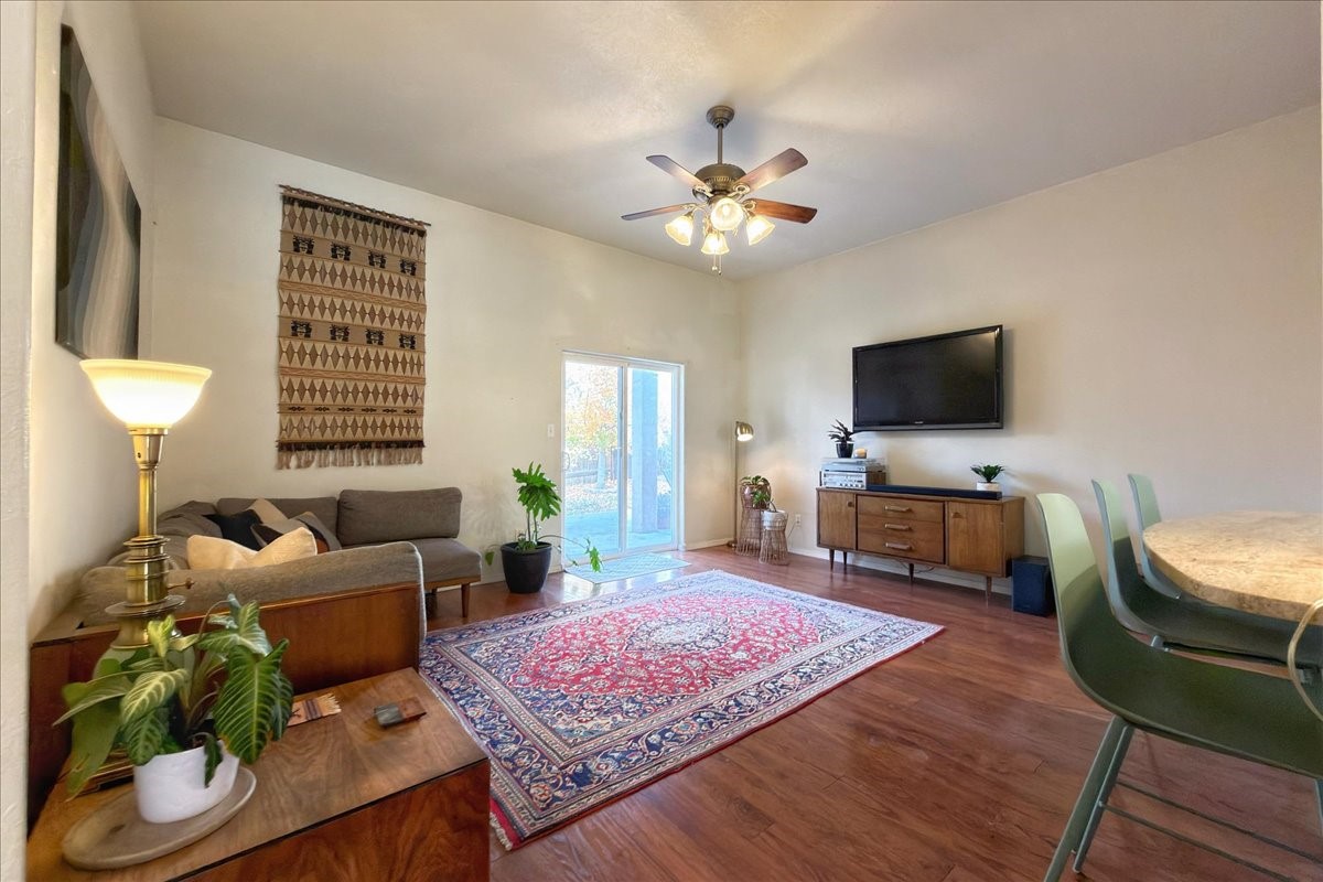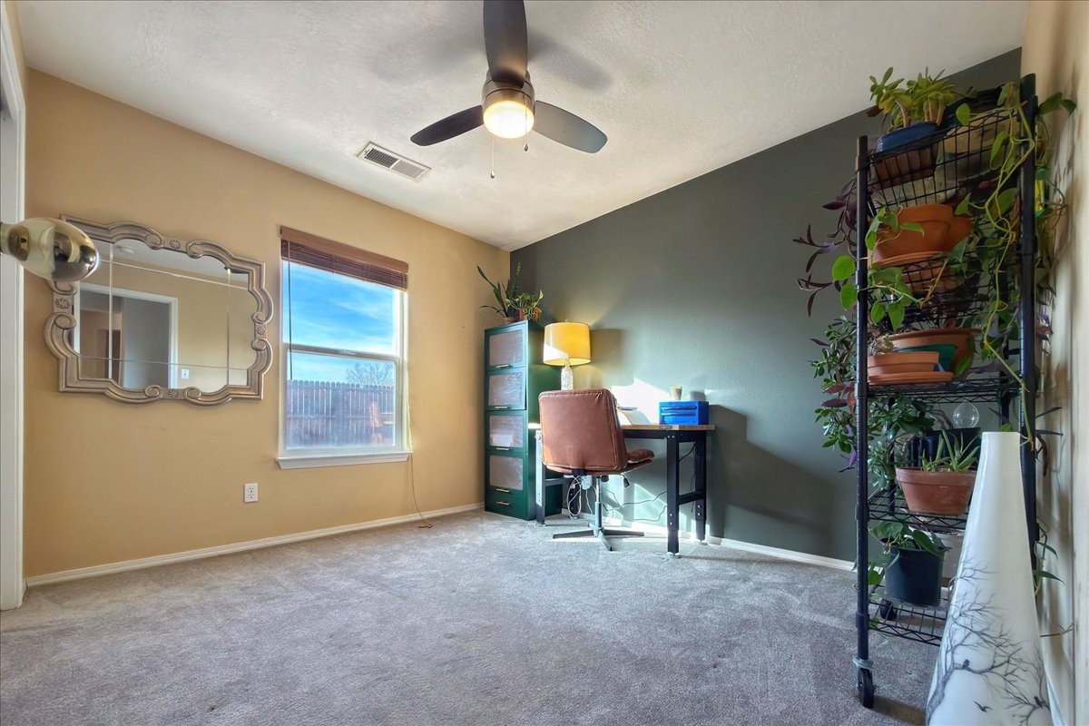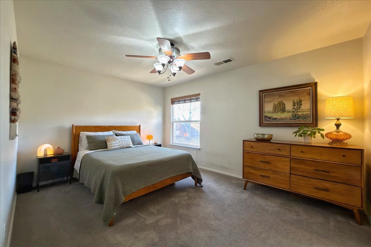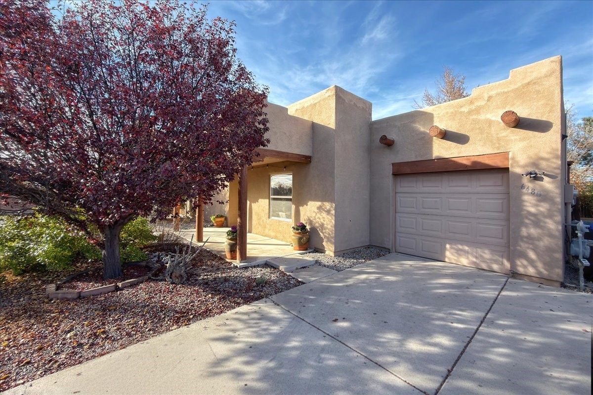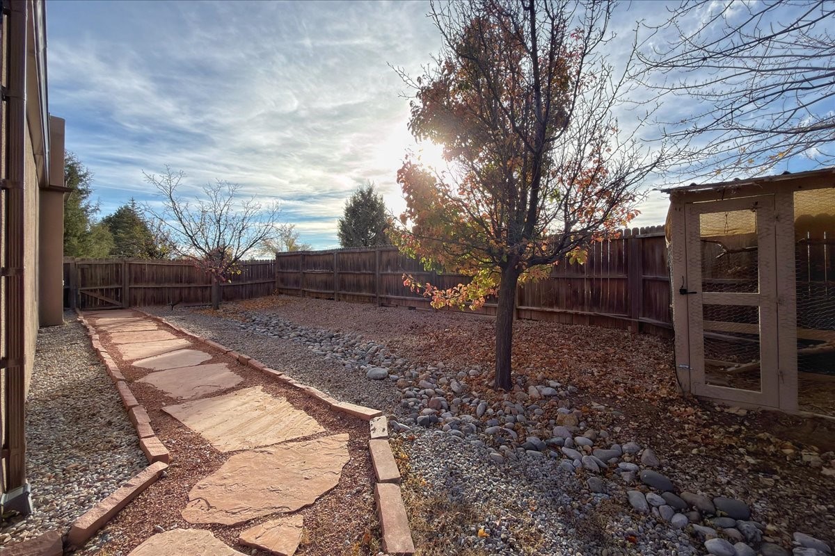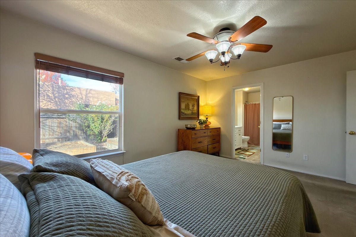 This charming single-level, three-bedroom, two-bath home is perfectly situated in a cul-de-sac, offering privacy and comfort. The spacious living area is filled with natural light, creating an open and welcoming atmosphere. The kitchen features granite countertops and new appliances. The bedrooms are spacious and versatile, ideal for guests, a home office, or a flex room. There are energy-efficient solar panels on the roof. Outside, the large lot includes beautiful rose bushes, raised garden beds, and a storage shed. Conveniently located close to highways, restaurants, and shopping.