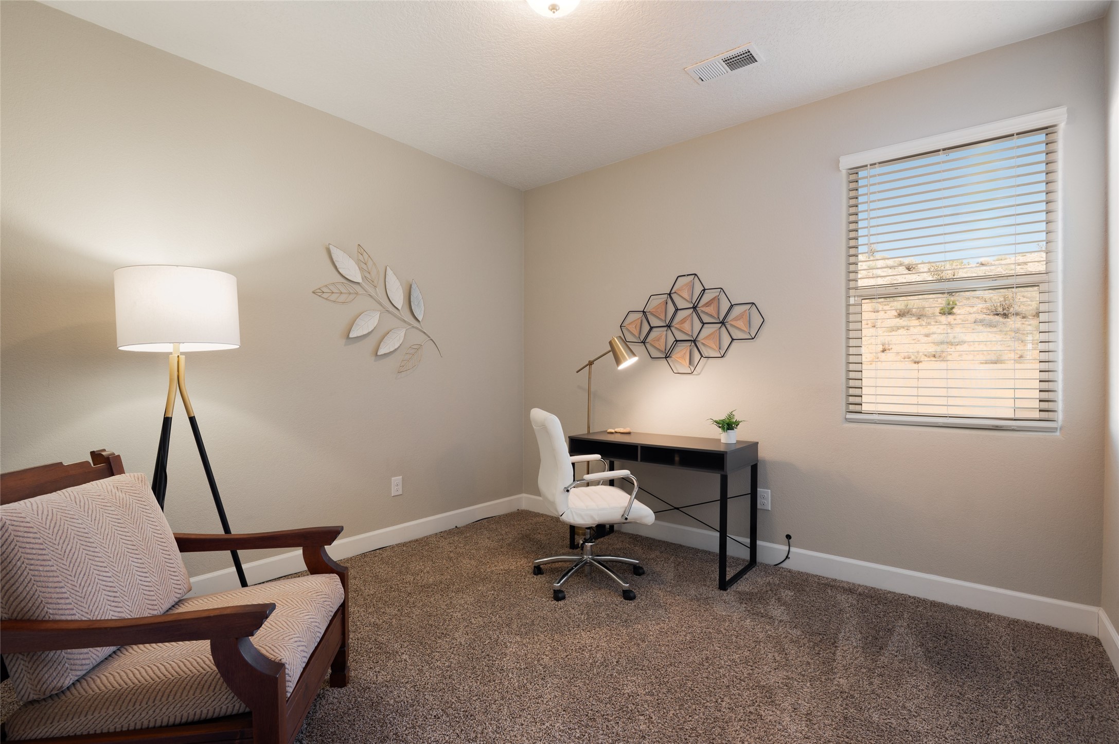 Warm, inviting home in beautiful Mariposa at the north end or Rio Rancho. Spectacular community surrounded by nature. Miles of trails, community pool and a gym. This home is located in a gated community at the end of a cul-de-sac beside open space. Secure and Serene. Spacious kitchen/dining/living area is a perfect gathering space, filled w/ natural light & offers generous counter space, gas stove, stainless appliances & walk-in pantry. The floor plan is open yet offers privacy in bedroom wings. Large primary suite w/ double sinks, separate tub, walk-in shower & large walk-in closet w/ access to laundry room. Three additional bedrooms are each connected to a bathroom, including one Jack-n-Jill & one en suite. Comfortable office space is perfect for those who work from home or can offer a second living space near bedrooms. Gorgeous custom landscaped back yard w/ pergola & putting green perfect for relaxing outdoors. Generous Three car garage.
