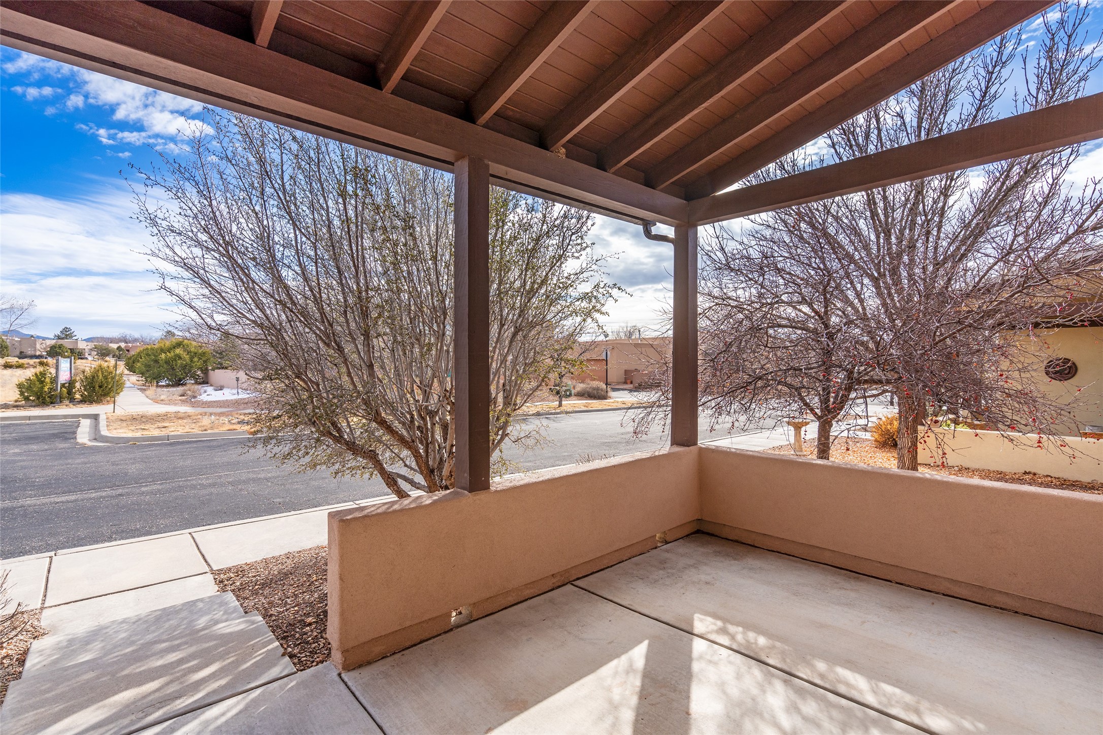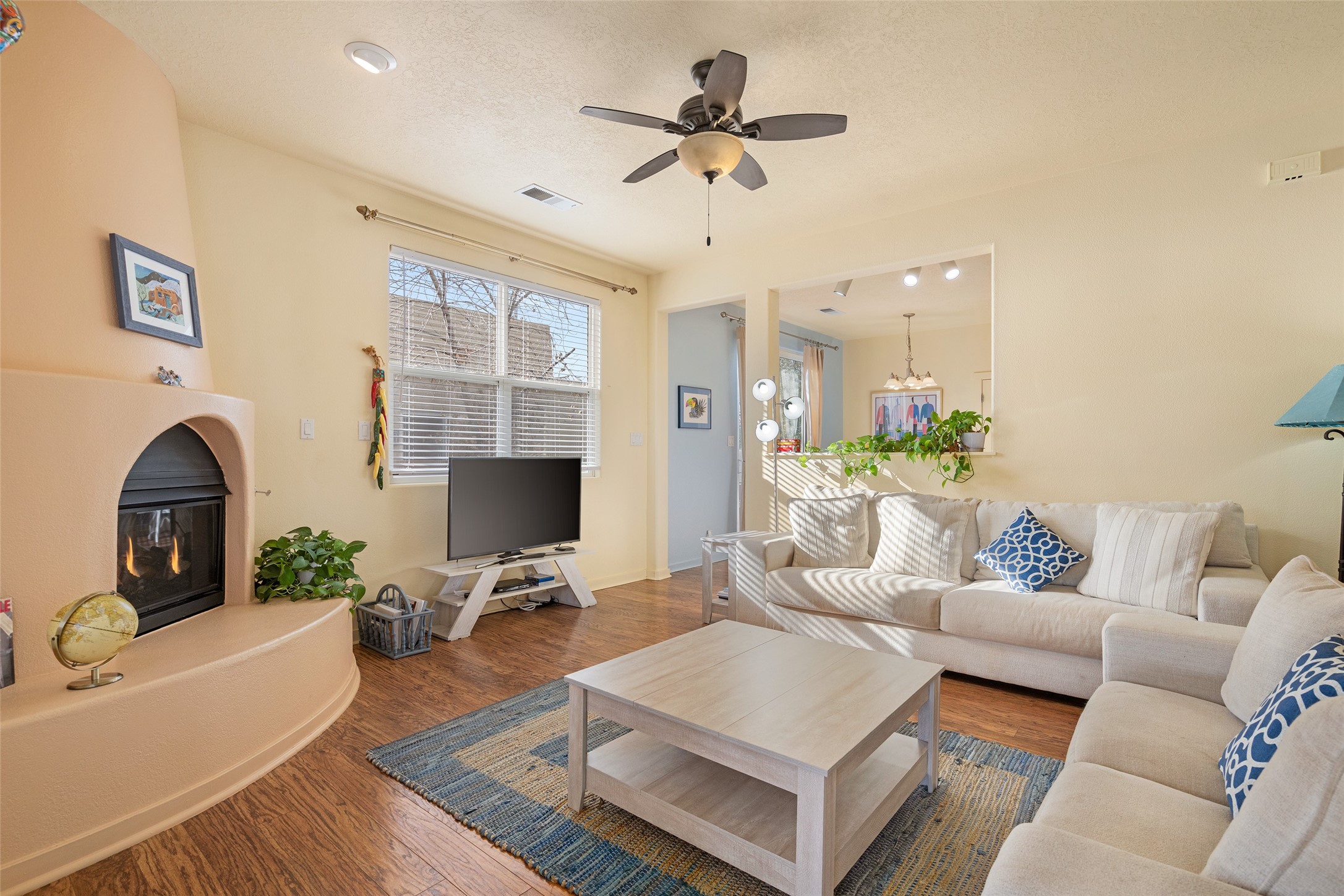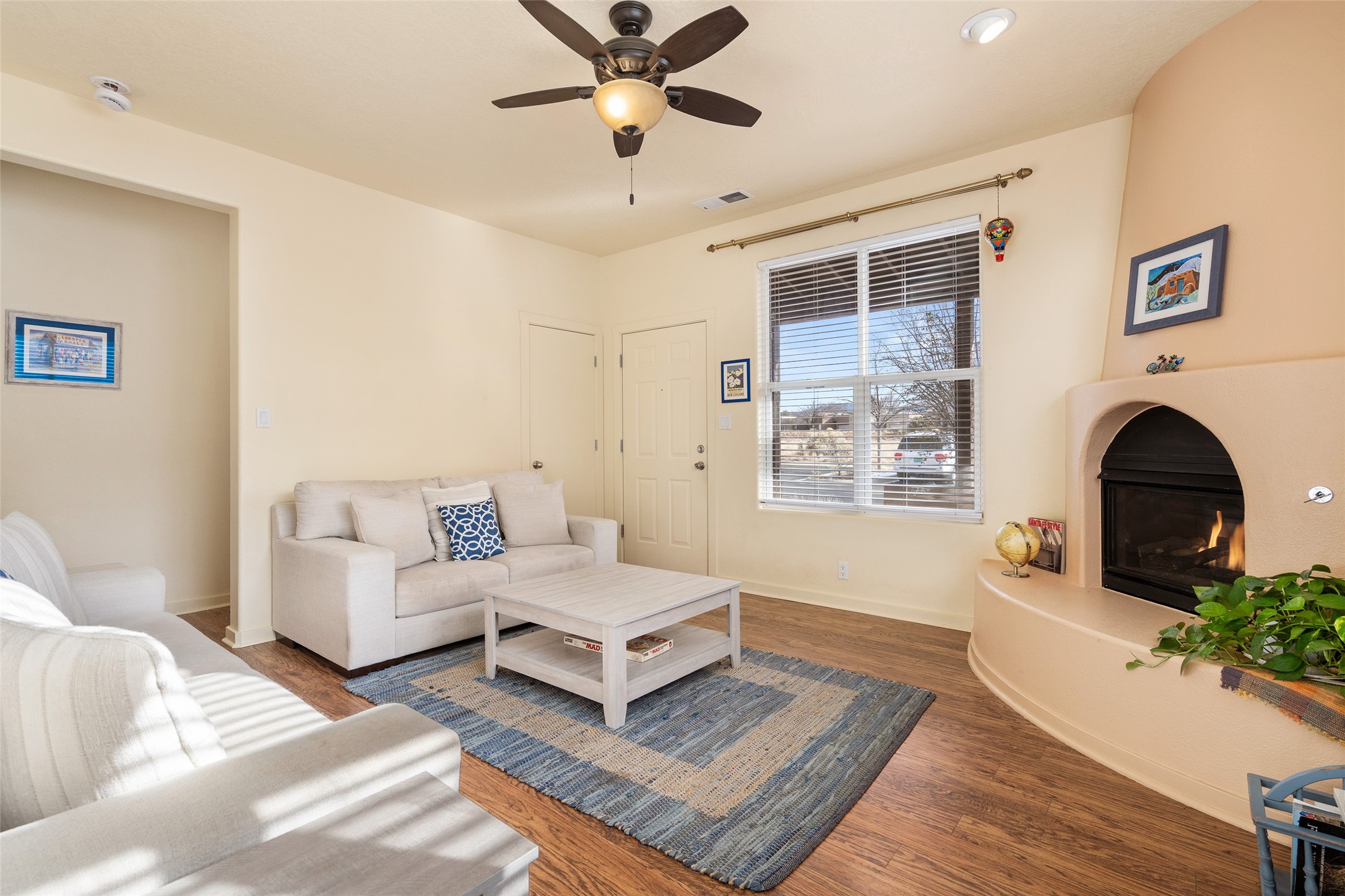 Discover this charming, well maintained, light-filled home offering approximately 1,047 sq ft in the peaceful Rancho Viejo community, boasting 12 miles of walking/biking trails and just south of Santa Fe. Surrounded by the Jemez, Ortiz, and Sangre de Cristo mountains, this residence enjoys a beautiful setting with a front yard that opens to unobstructed views--including a stunning look at the Ski Basin. The outdoor space is ideal for enjoying a relaxing lunch, cultivating a small garden, or simply taking in the surrounding tranquility. Inside, the primary bedroom features a full ensuite bathroom and a generously sized walk-in closet. The kitchen is equipped with newer appliances, a spacious pantry, and a functional layout that flows seamlessly through the bright and inviting living areas. Enjoy the home's sweet kiva fireplace on chilly days or turn on the refrigerated air to cool down in the Santa Fe summers. The home's overall floor plan is thoughtfully designed for comfort and ease and includes ample closet space for everyday living! Located just a short walk from the serene Rancho Viejo Village Park Plaza, and only one mile from Santa Fe Community College, this home offers exceptional convenience. You'll be minutes from shopping, dining, medical facilities, and enjoy quick access to I-25 and the 599 Relief Route.Brand new to the market--schedule your showing today so you don't miss this wonderful opportunity!