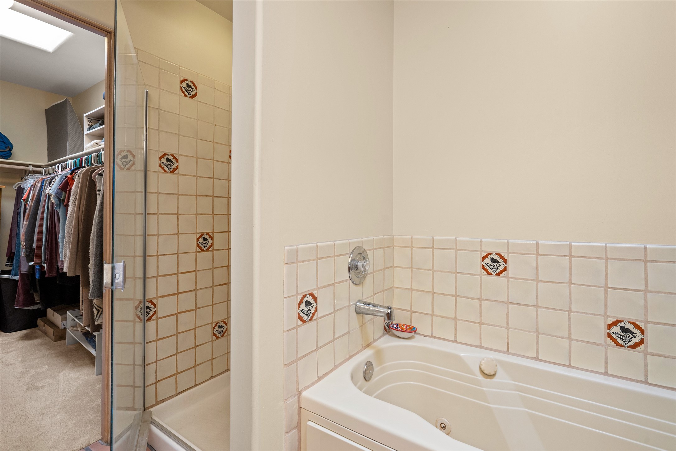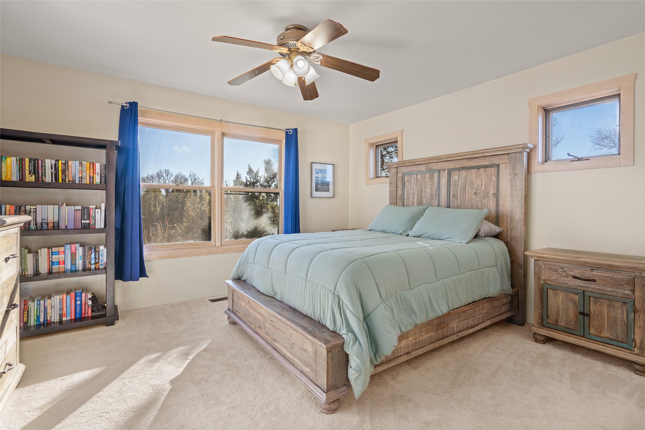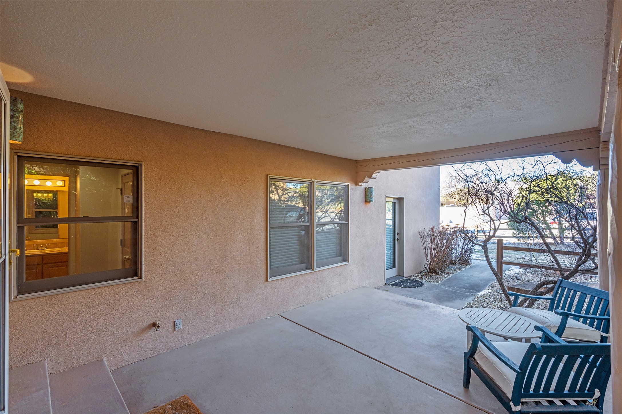 Welcome home! This light and bright two-story home in the quiet neighborhood of Pueblos del Sol, offers convenience, southwest character with vigas and a kiva fireplace as well as thoughtful updates throughout. Enjoy the classic Saltillo tile flooring on the main level and a mature, fully fenced, tree-filled backyard that provides both shade and charm to enjoy while sitting on the finished back deck! Upstairs, you'll find three sunny bedrooms with newer carpet, including a spacious primary suite featuring a generous walk-in closet and a bathroom illuminated by skylights that welcome in beautiful New Mexico sunshine. And don't forget the heated 2 car garage for conveneince! Ideally located, this home offers quick access to coffee shops, restaurants, medical facilities, and an easy commute to I-25, 599, and Hwy 285/84. Schedule a showing today, don't miss this one!
