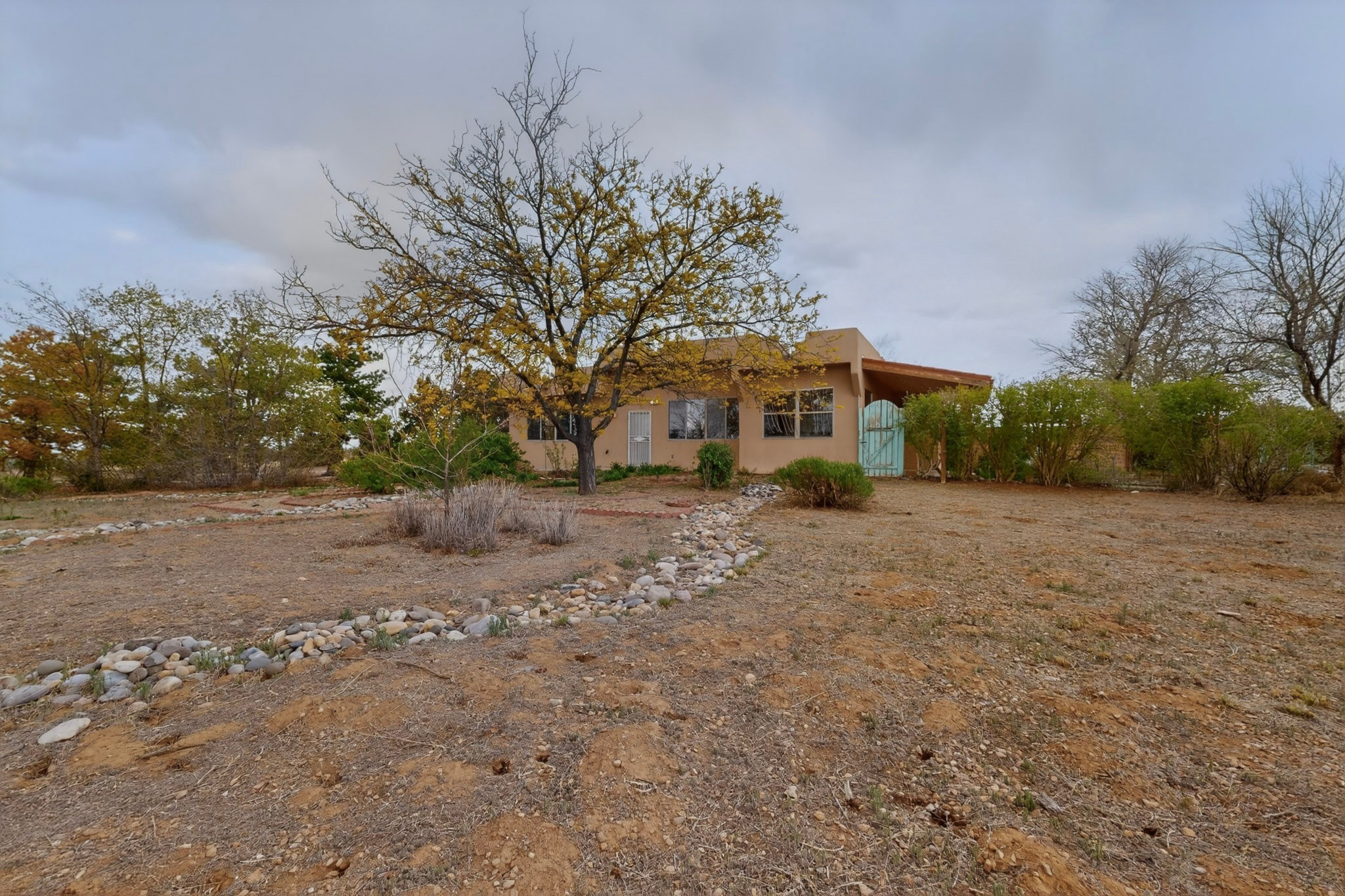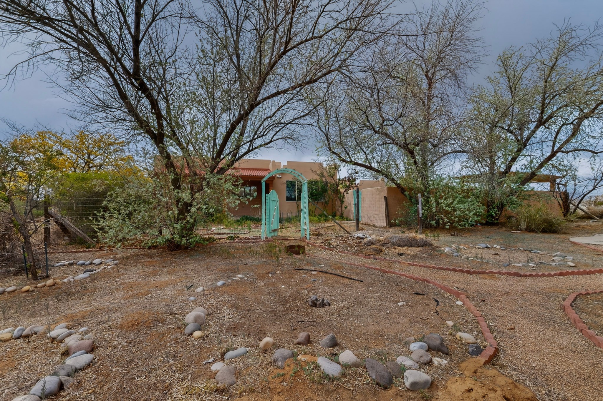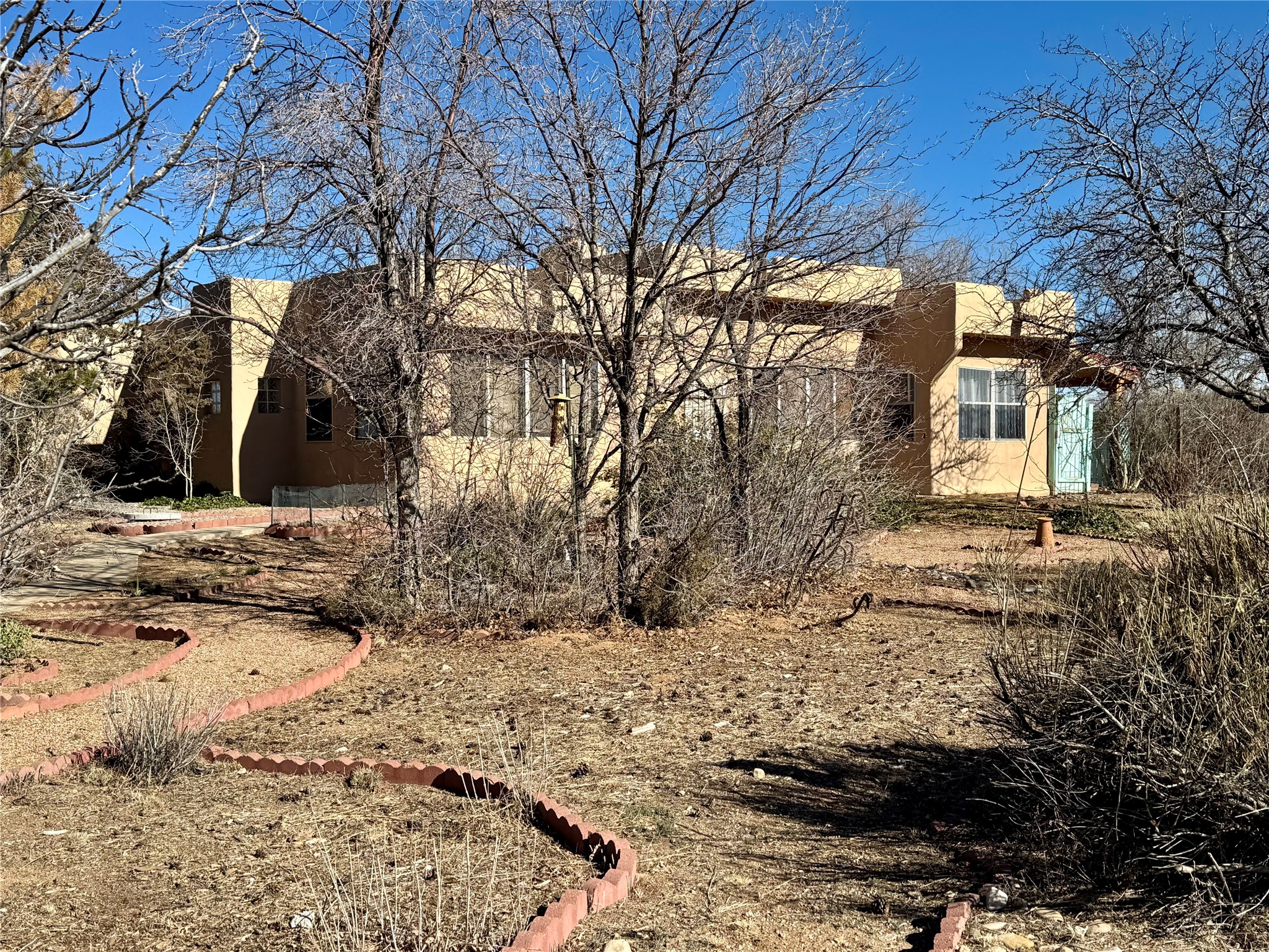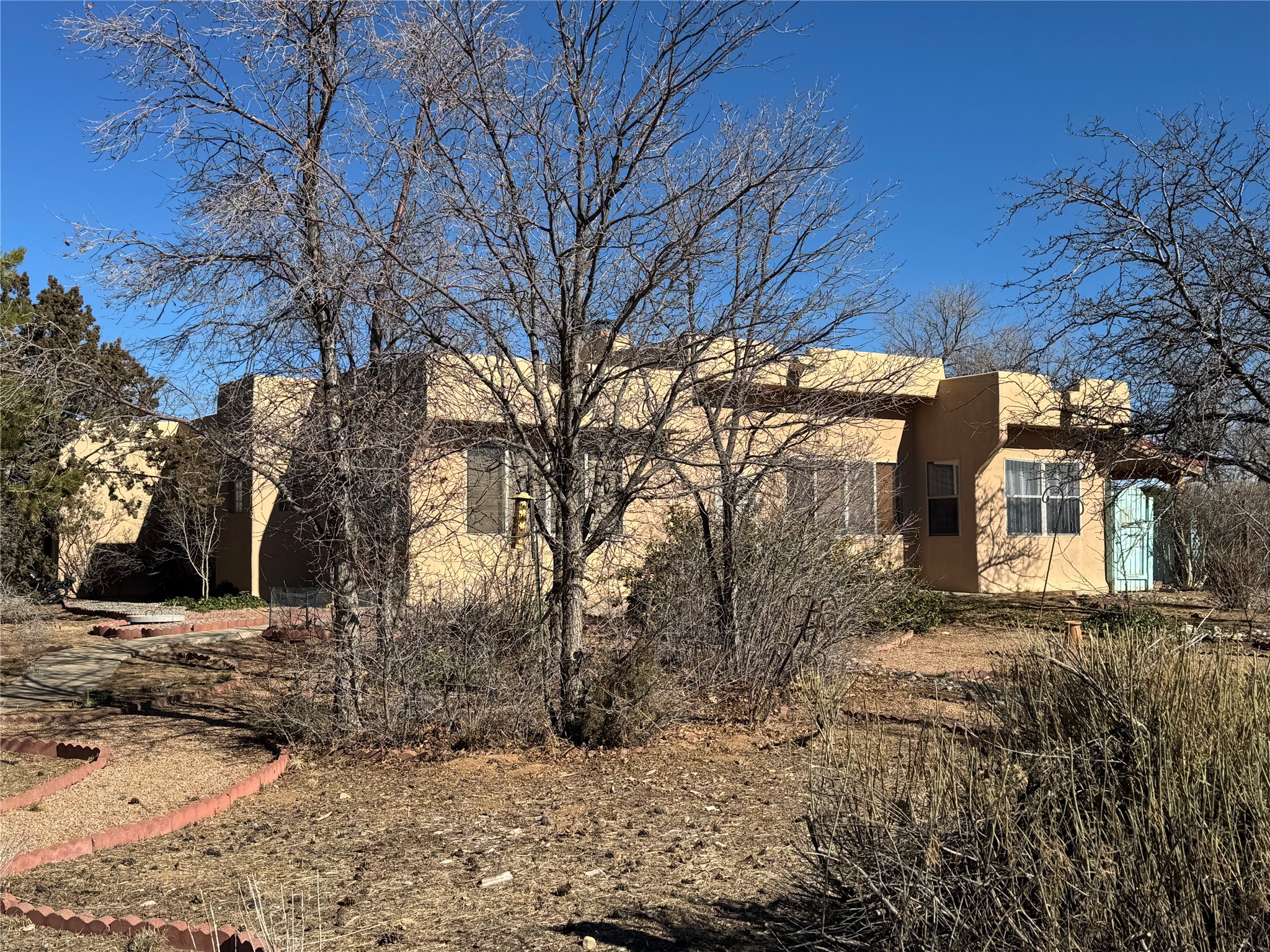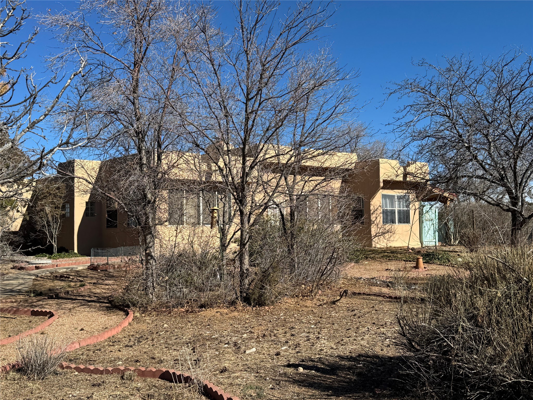 Located on a quiet cul de sac this was custom designed and built for the original owner in 1995. A bright and light contemporary, open plan design, with good separation between main and guest bedrooms, plus there is an office area and what became a working clay art studio. This 2000sf home is sited on 1.99 acres a part of which became a delightful fenced and private small orchard and gardens. There is a large 2 car garage with room for a kiln, work area and storage. The home has suffered neglect and will need some repair and renovation, this is an estate sale and the sellers are not planning to make any repairs. Paved roads make an easy access to Eldorado amenities, local shopping centers and easy reach into Santa Fe.