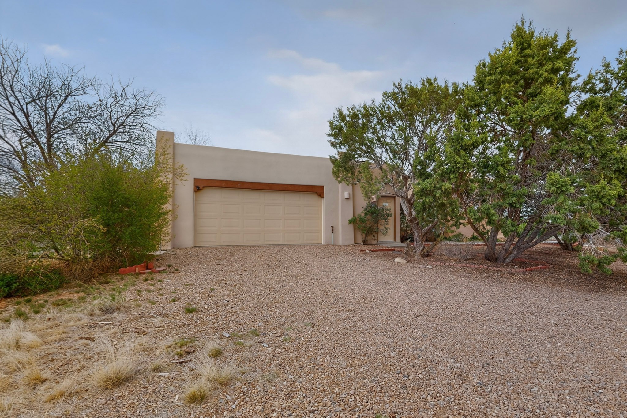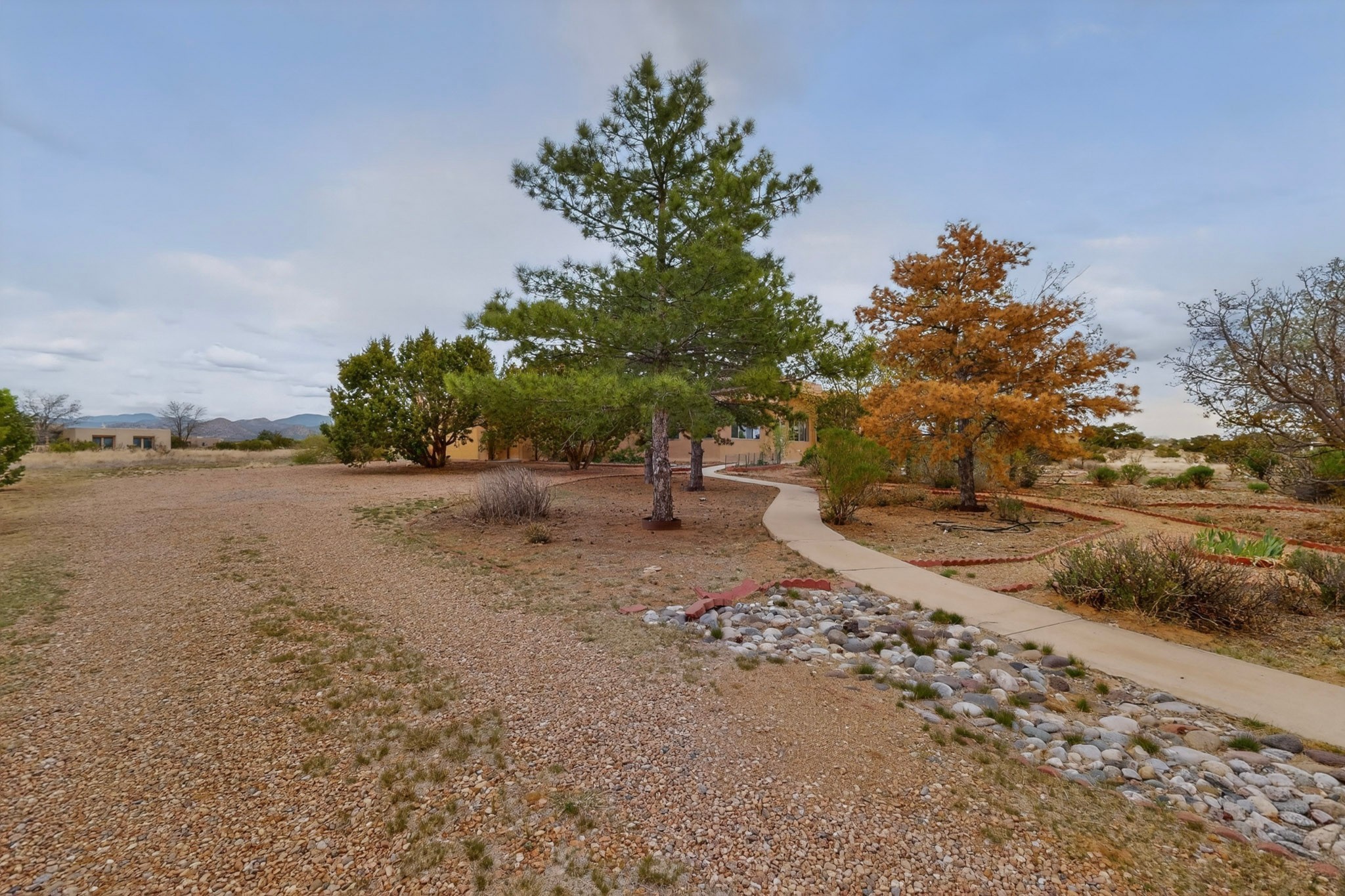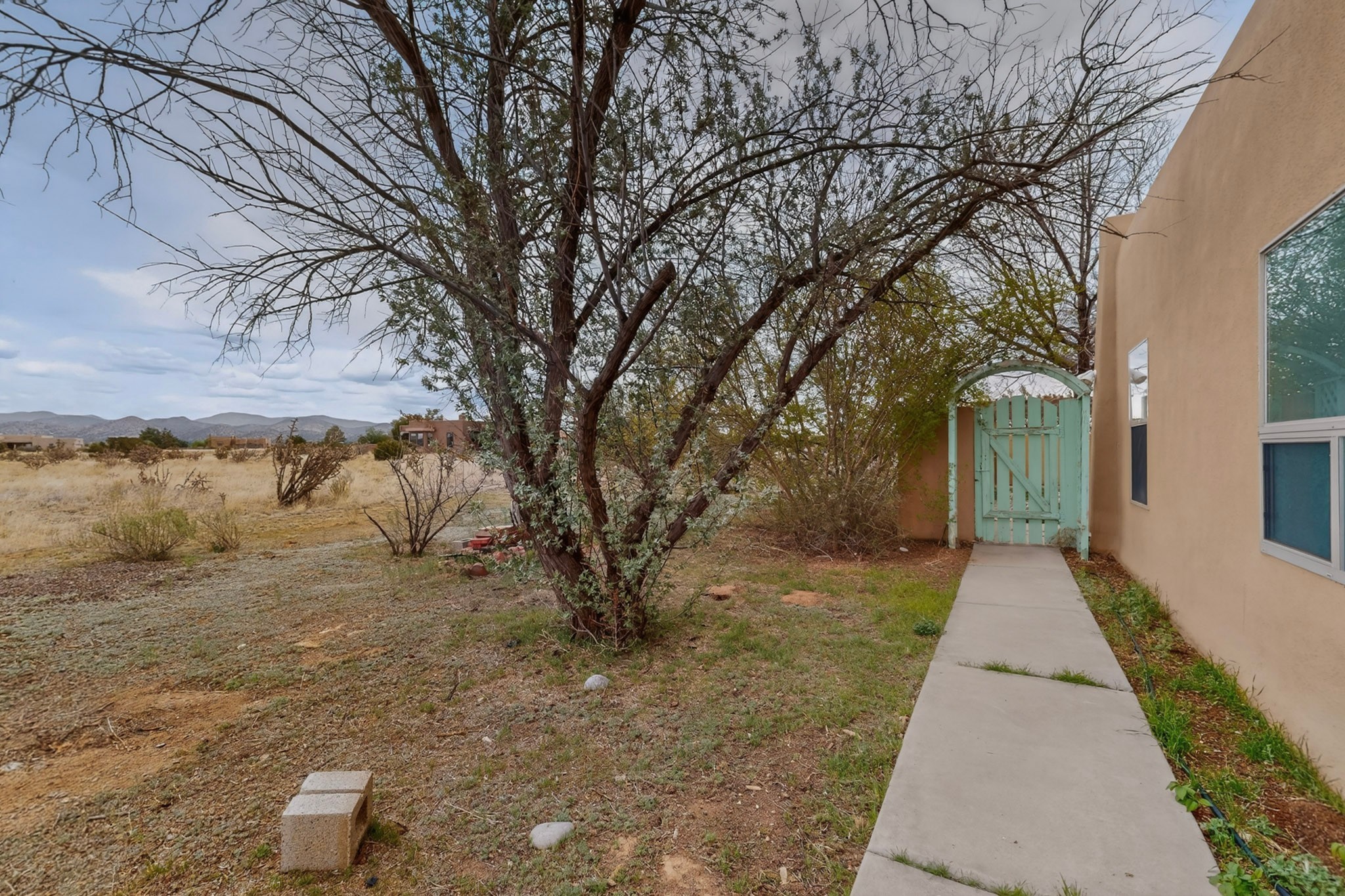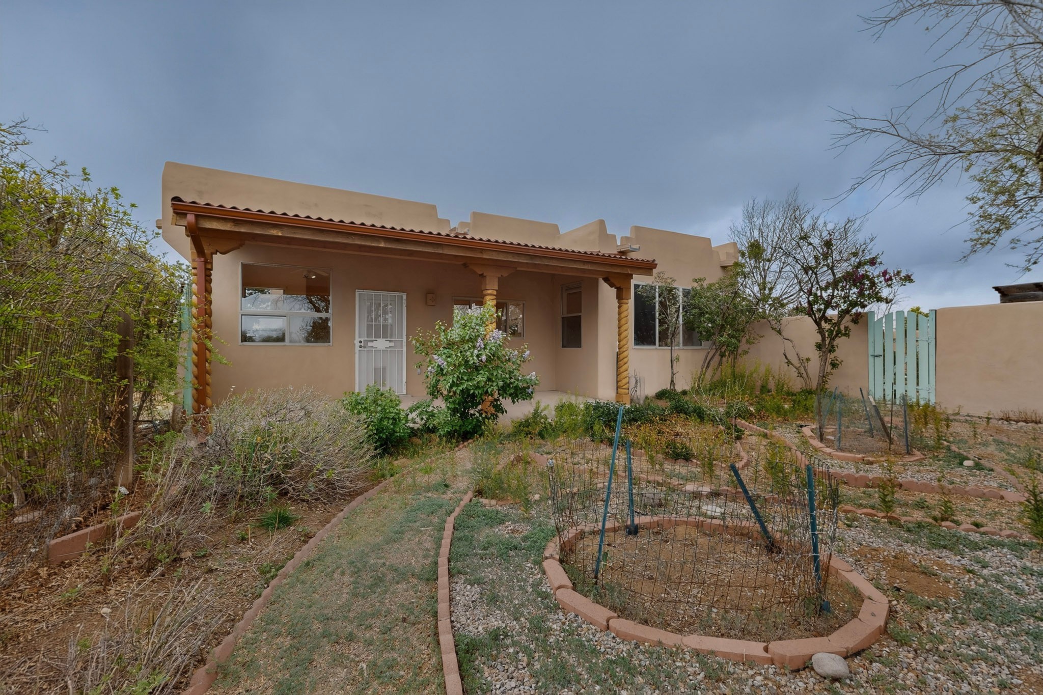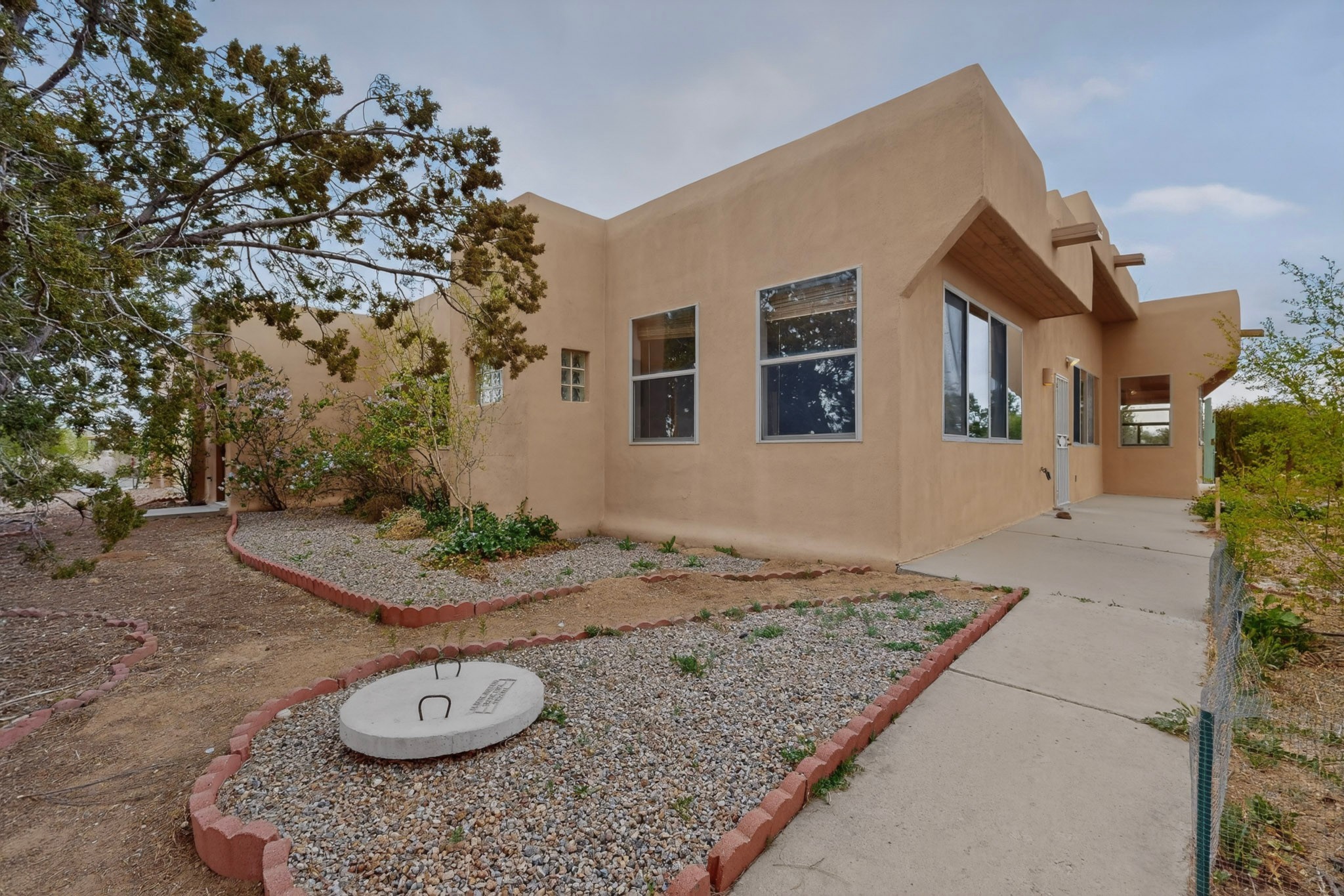 Located on a quiet cul de sac this was custom designed and built for the original owner in 1995. A bright and light contemporary, open plan design, with good separation between main and guest bedrooms, plus there is an office area and what became a working clay art studio. This 2000sf home is sited on 1.99 acres a part of which became a delightful fenced and private small orchard and gardens. There is a large 2 car garage with room for a kiln, work area and storage. The home has suffered neglect and will need some repair and renovation, this is an estate sale and the sellers are not planning to make any repairs. Paved roads make an easy access to Eldorado amenities, local shopping centers and easy reach into Santa Fe.