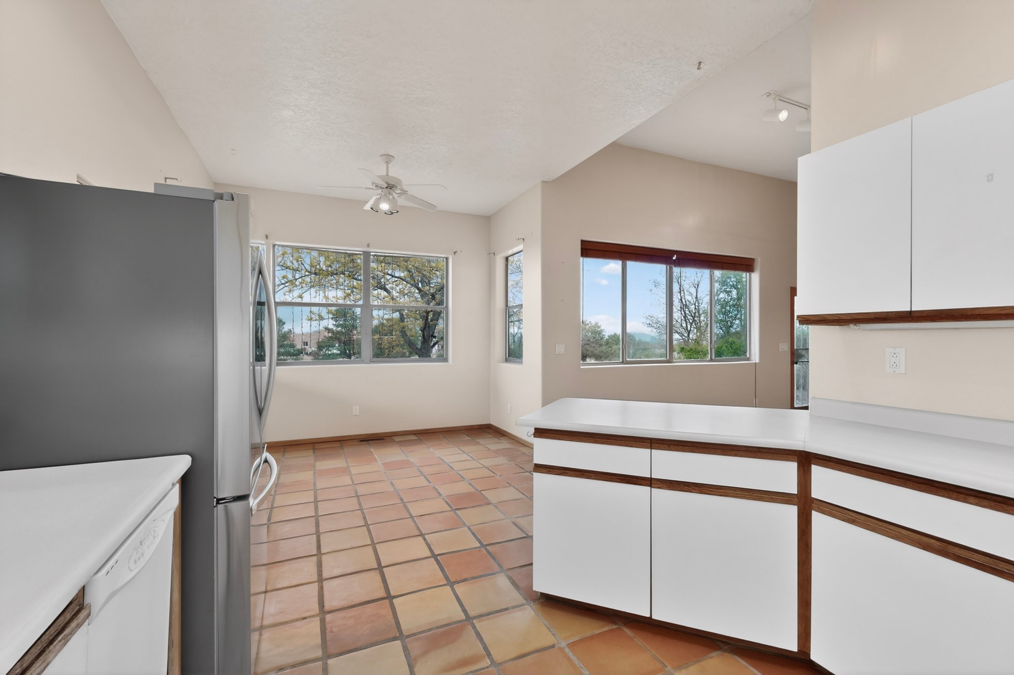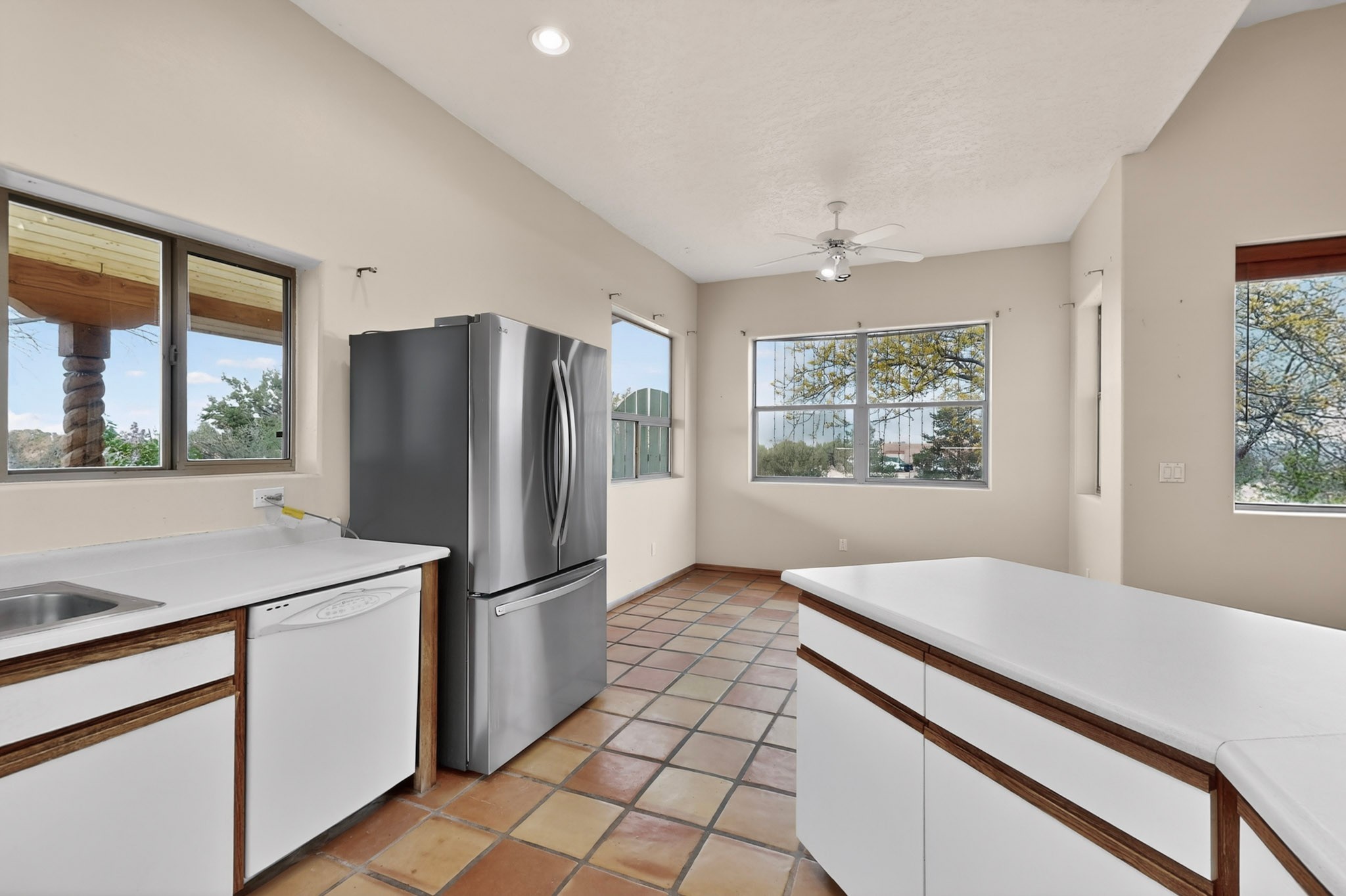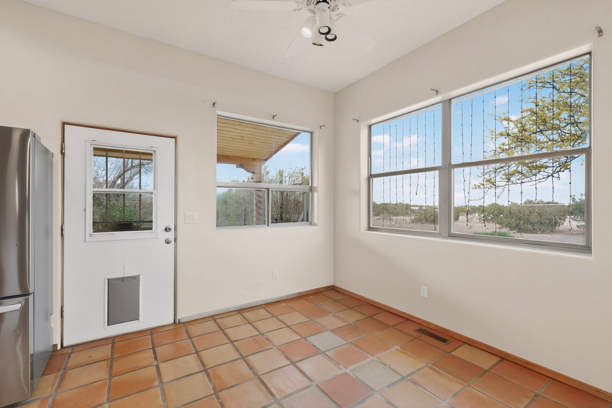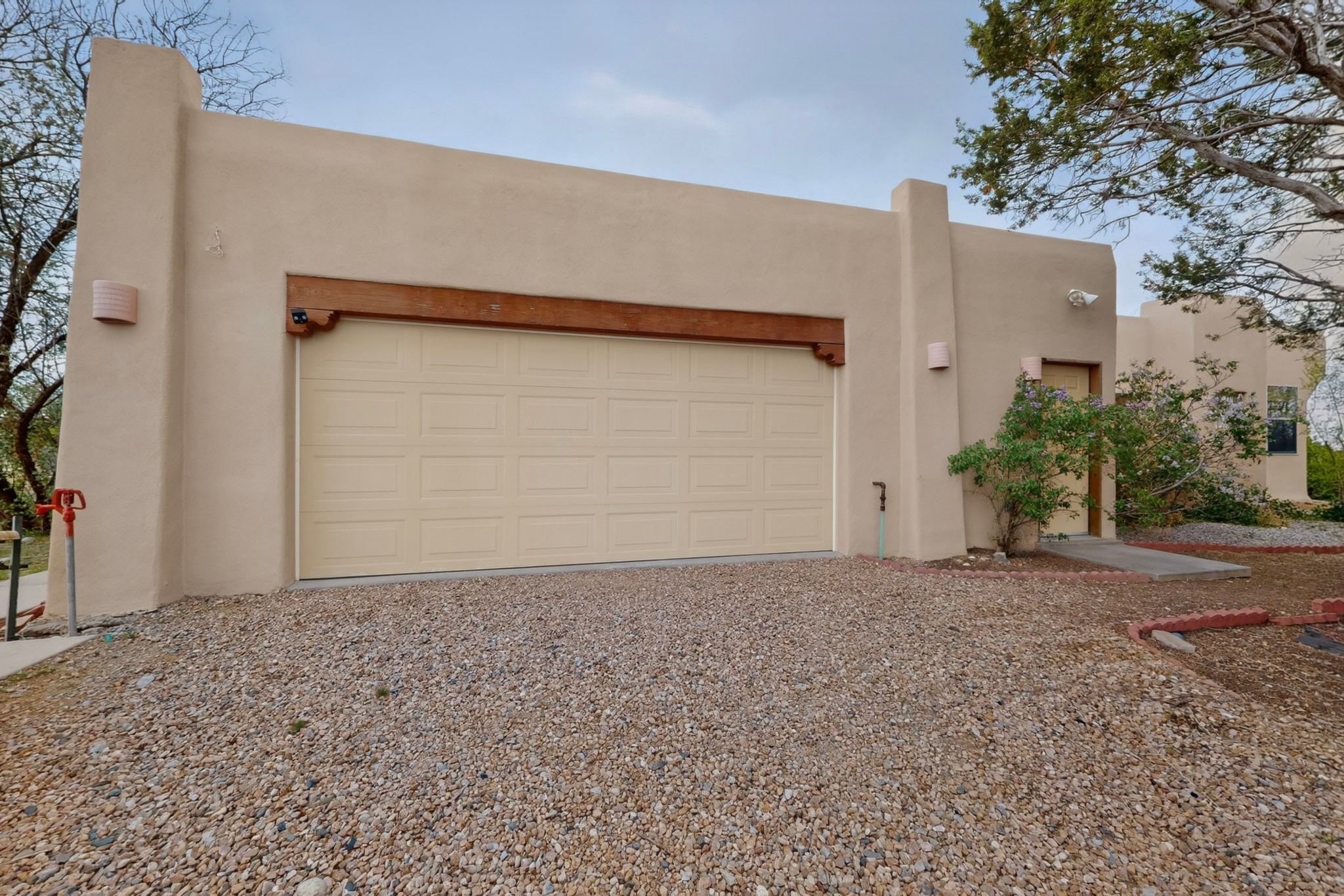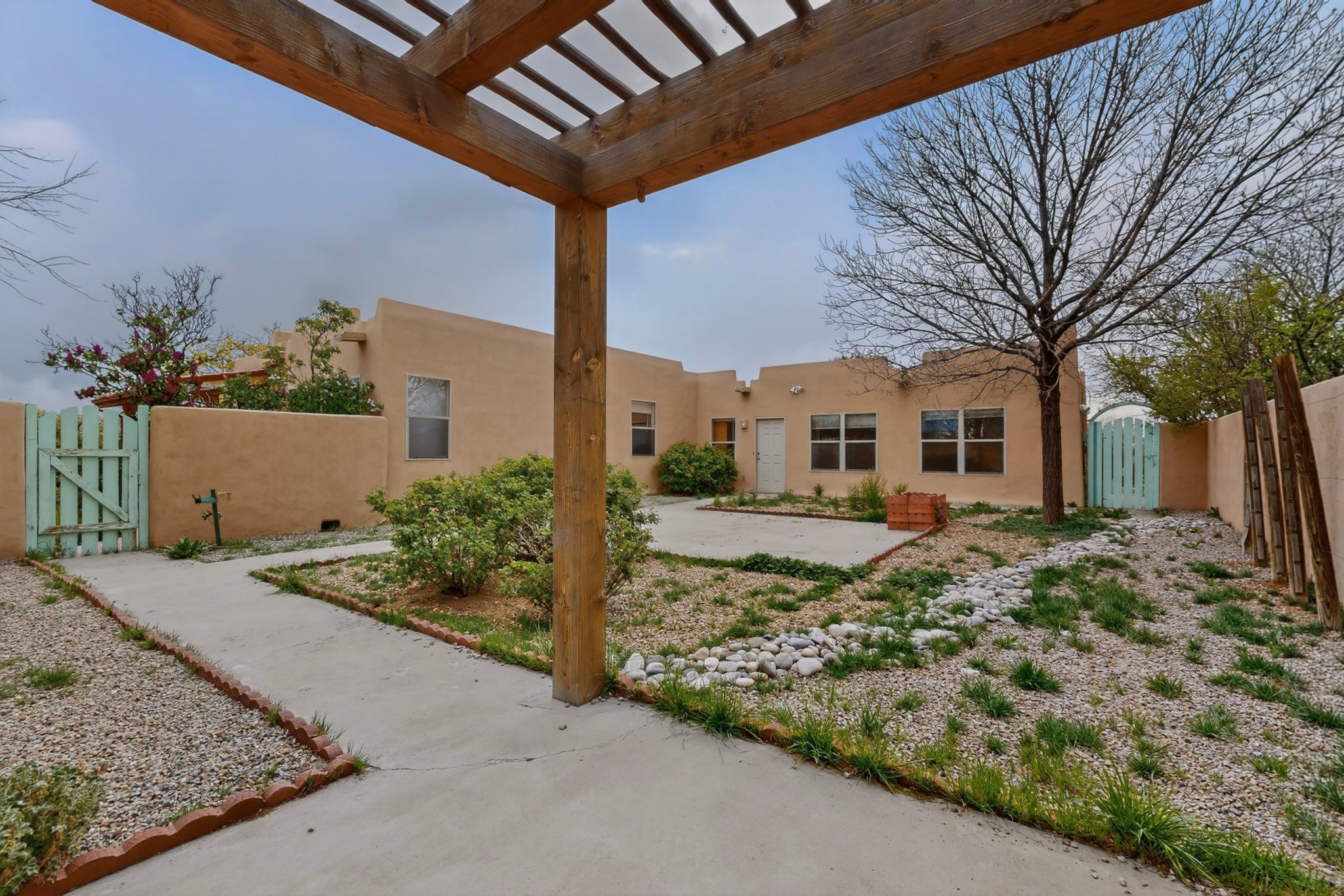 Located on a quiet cul de sac this was custom designed and built for the original owner in 1995. A bright and light contemporary, open plan design, with good separation between main and guest bedrooms, plus there is an office area and what became a working clay art studio. This 2000sf home is sited on 1.99 acres a part of which became a delightful fenced and private small orchard and gardens. There is a large 2 car garage with room for a kiln, work area and storage. The home has suffered neglect and will need some repair and renovation, this is an estate sale and the sellers are not planning to make any repairs. Paved roads make an easy access to Eldorado amenities, local shopping centers and easy reach into Santa Fe.
