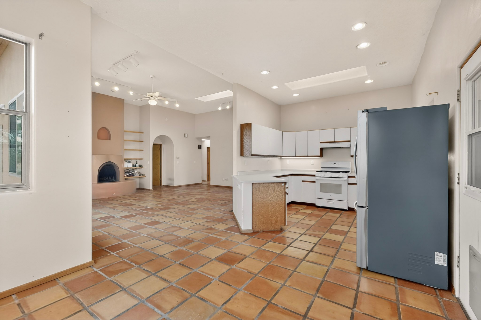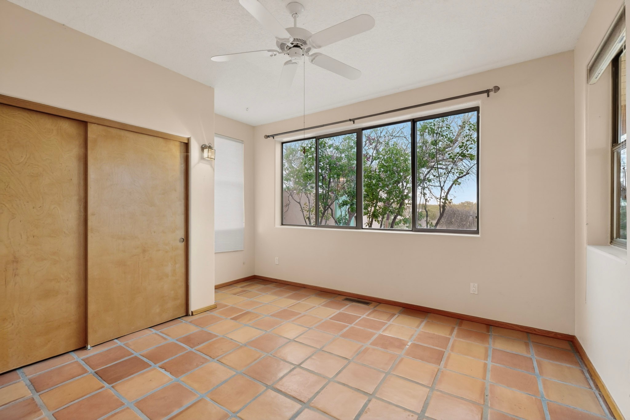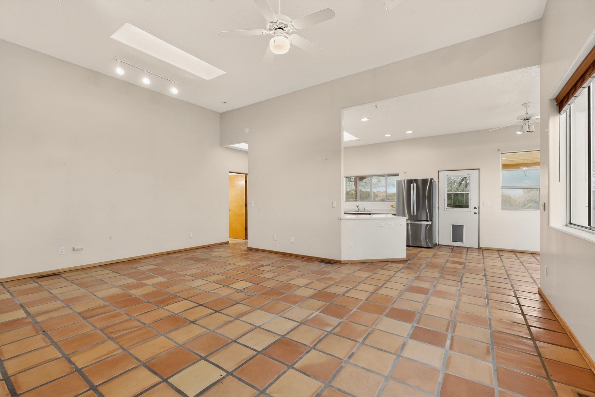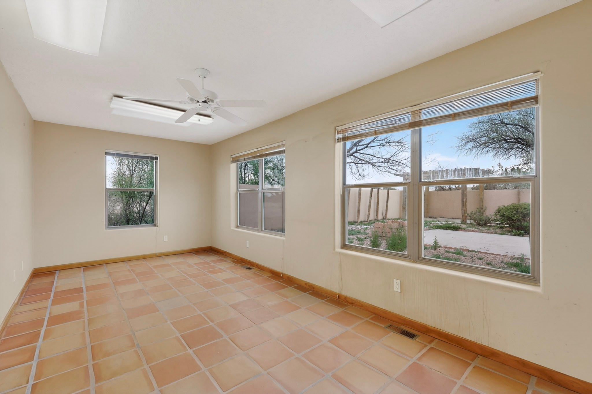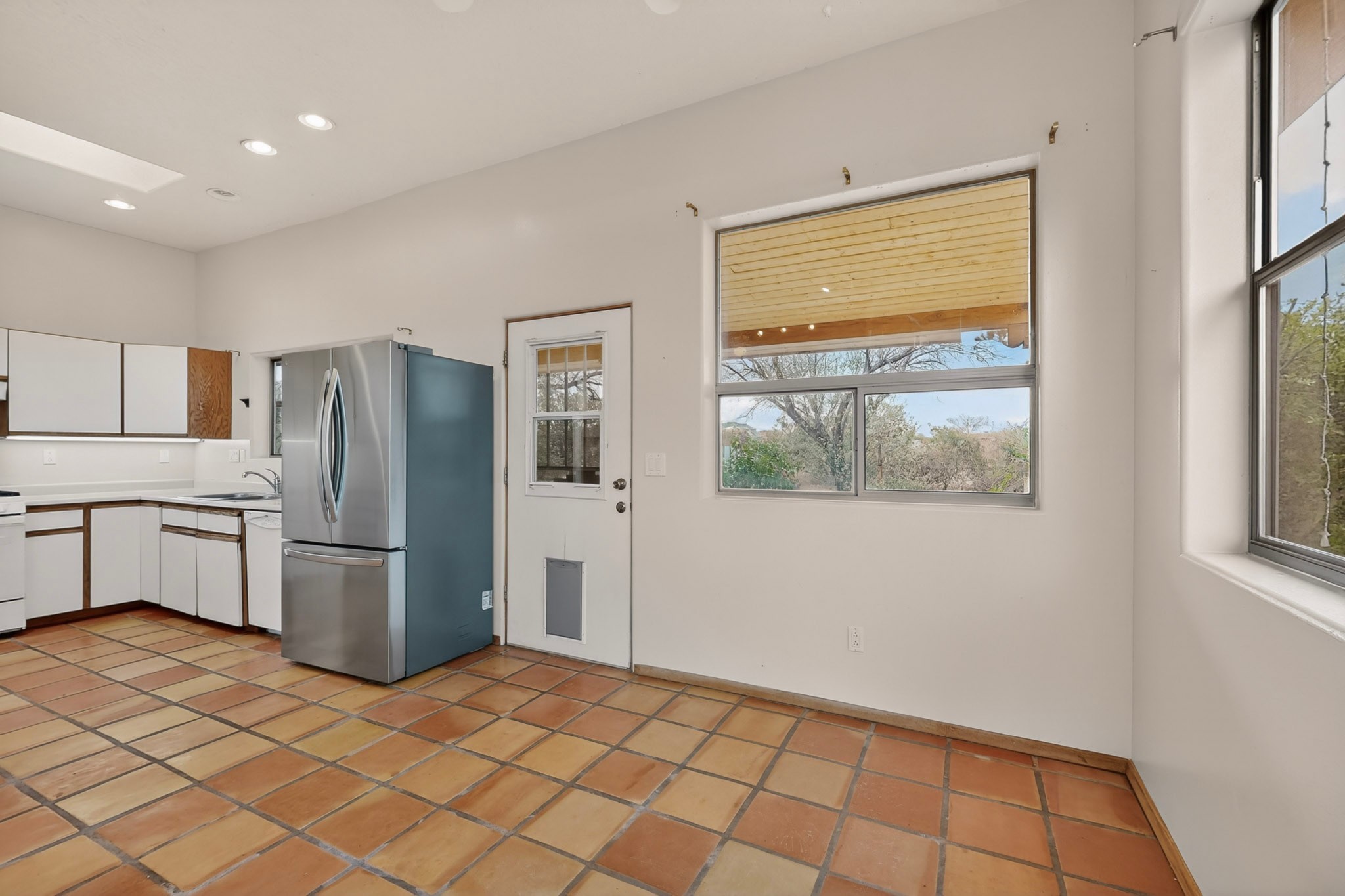Located on a quiet cul de sac this was custom designed and built for the original owner in 1995. A bright and light contemporary, open plan design, with good separation between main and guest bedrooms, plus there is an office area and what became a working clay art studio. This 2000sf home is sited on 1.99 acres a part of which became a delightful fenced and private small orchard and gardens. There is a large 2 car garage with room for a kiln, work area and storage. The home has suffered neglect and will need some repair and renovation, this is an estate sale and the sellers are not planning to make any repairs. Paved roads make an easy access to Eldorado amenities, local shopping centers and easy reach into Santa Fe.
