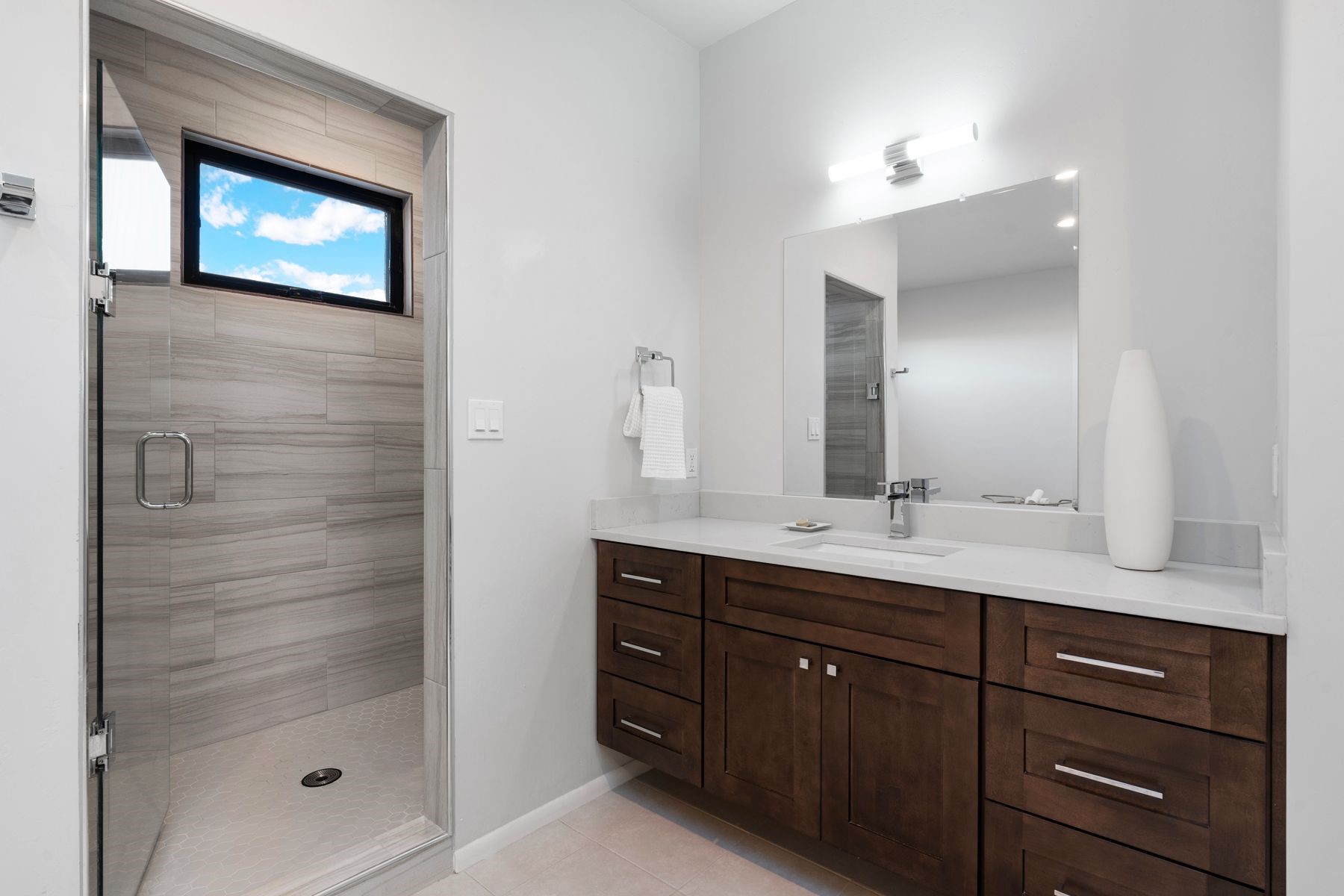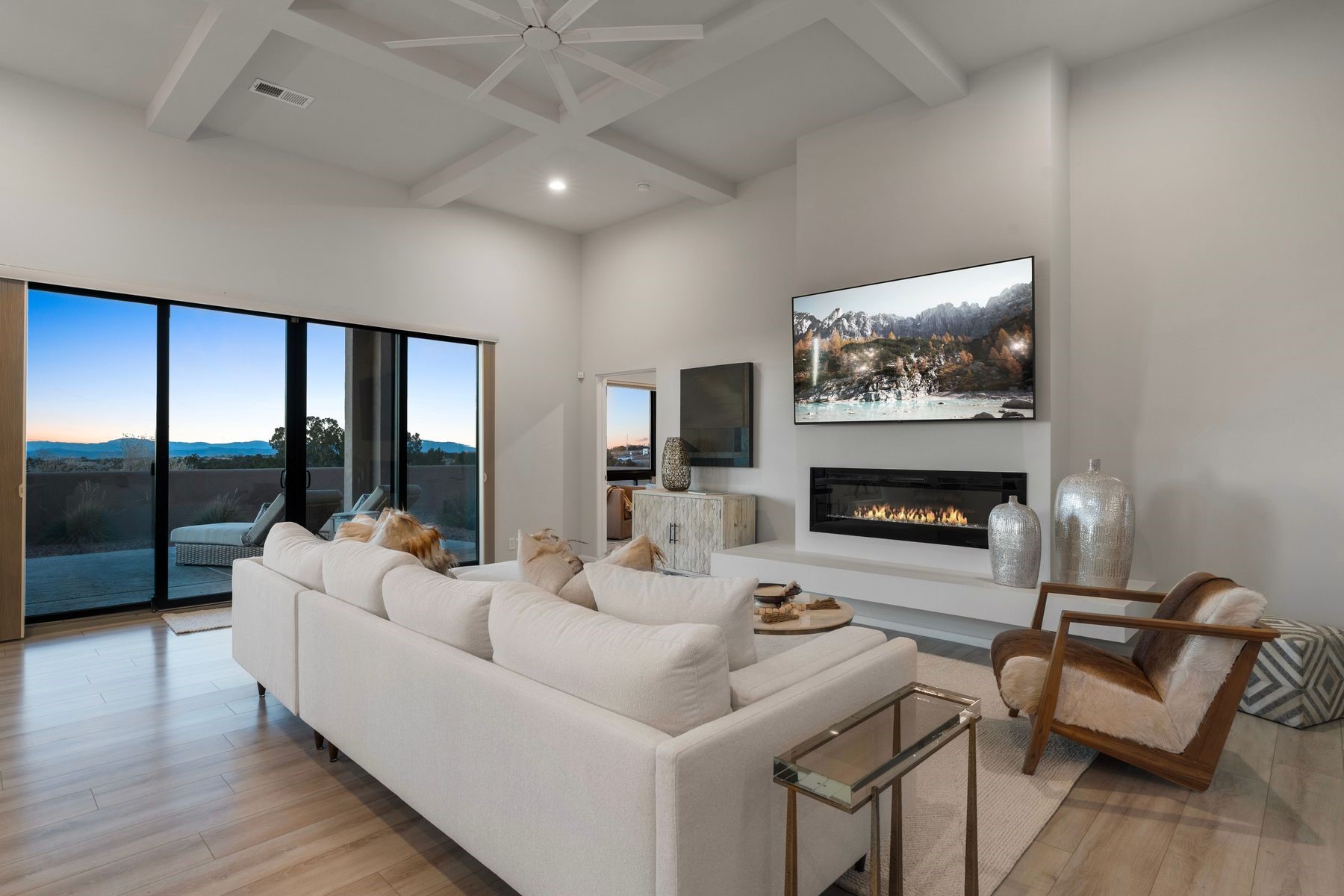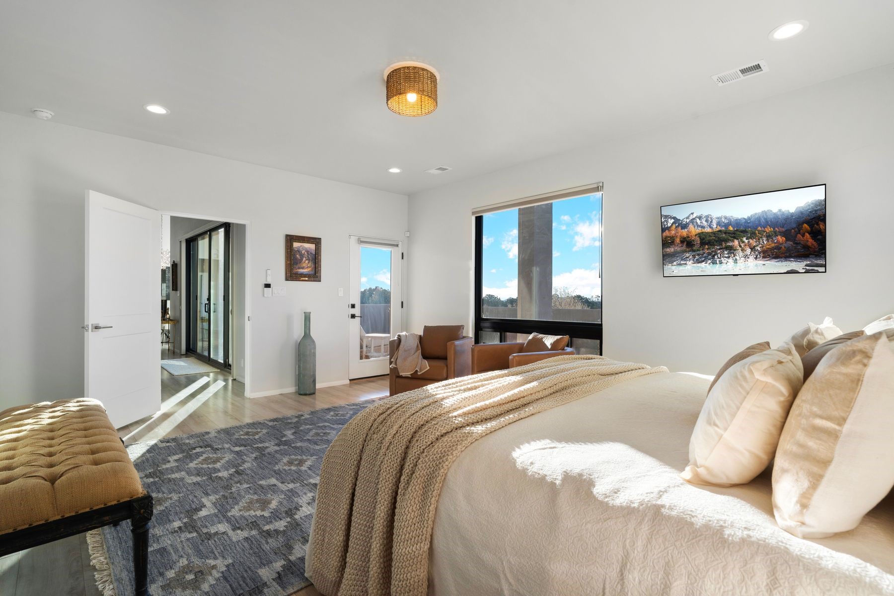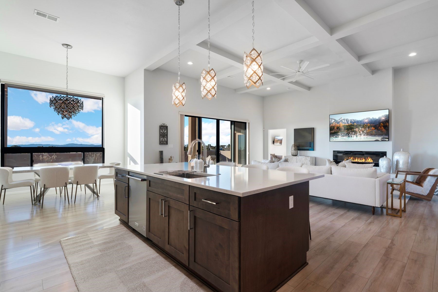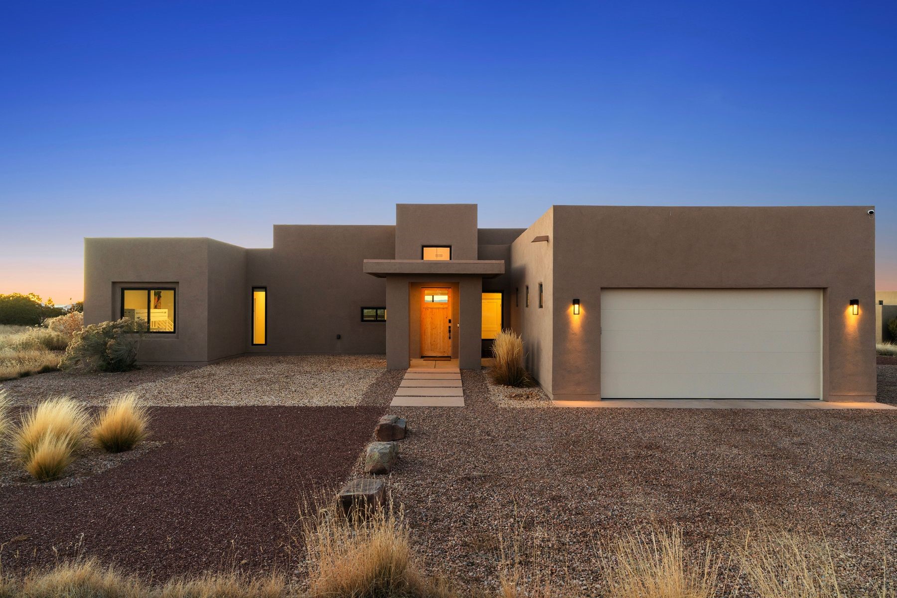Bathed in soft natural light, this refined single-level contemporary residence artfully blends warm, sophisticated finishes with sweeping vistas of the Sandia and Jemez Mountains. The open-concept living and kitchen spaces flow seamlessly, creating an atmosphere that is both elegant and welcoming. Expansive sliding glass doors extend the living experience to a generous covered portal--an ideal setting for tranquil evenings and effortless indoor-outdoor living.The primary suite is a serene sanctuary, featuring a spa-inspired bath with a deep soaking tub, dual vanities, and a walk-in closet thoughtfully connected to the laundry room for everyday ease. Two well-separated en-suite guest bedrooms offer privacy and comfort, each finished to the same elevated standard found throughout the home.Thoughtful design details abound, including curated tile selections, custom window treatments, and a garage outfitted with a Level 2 ChargePoint EV charger--balancing modern convenience with understated luxury. Set in a peaceful setting framed by endless mountain views, this exceptional home offers a daily experience of comfort, beauty, and refined living.