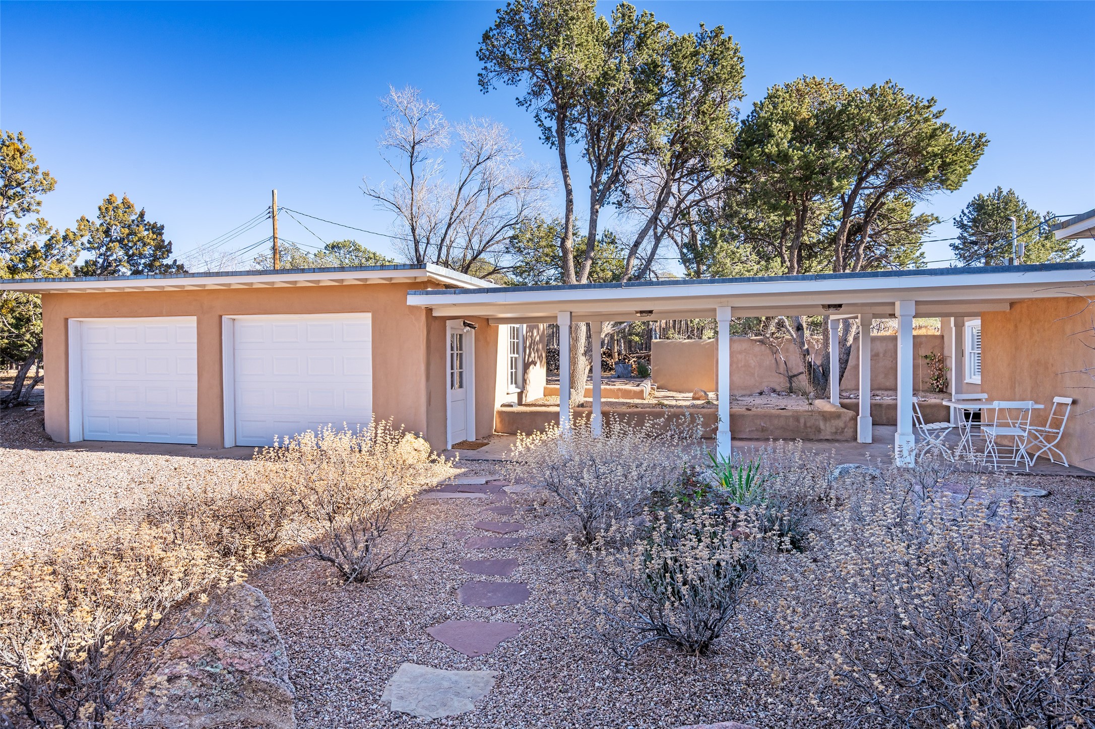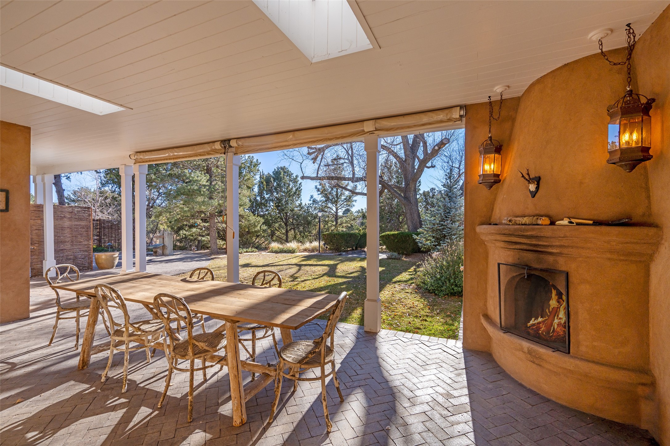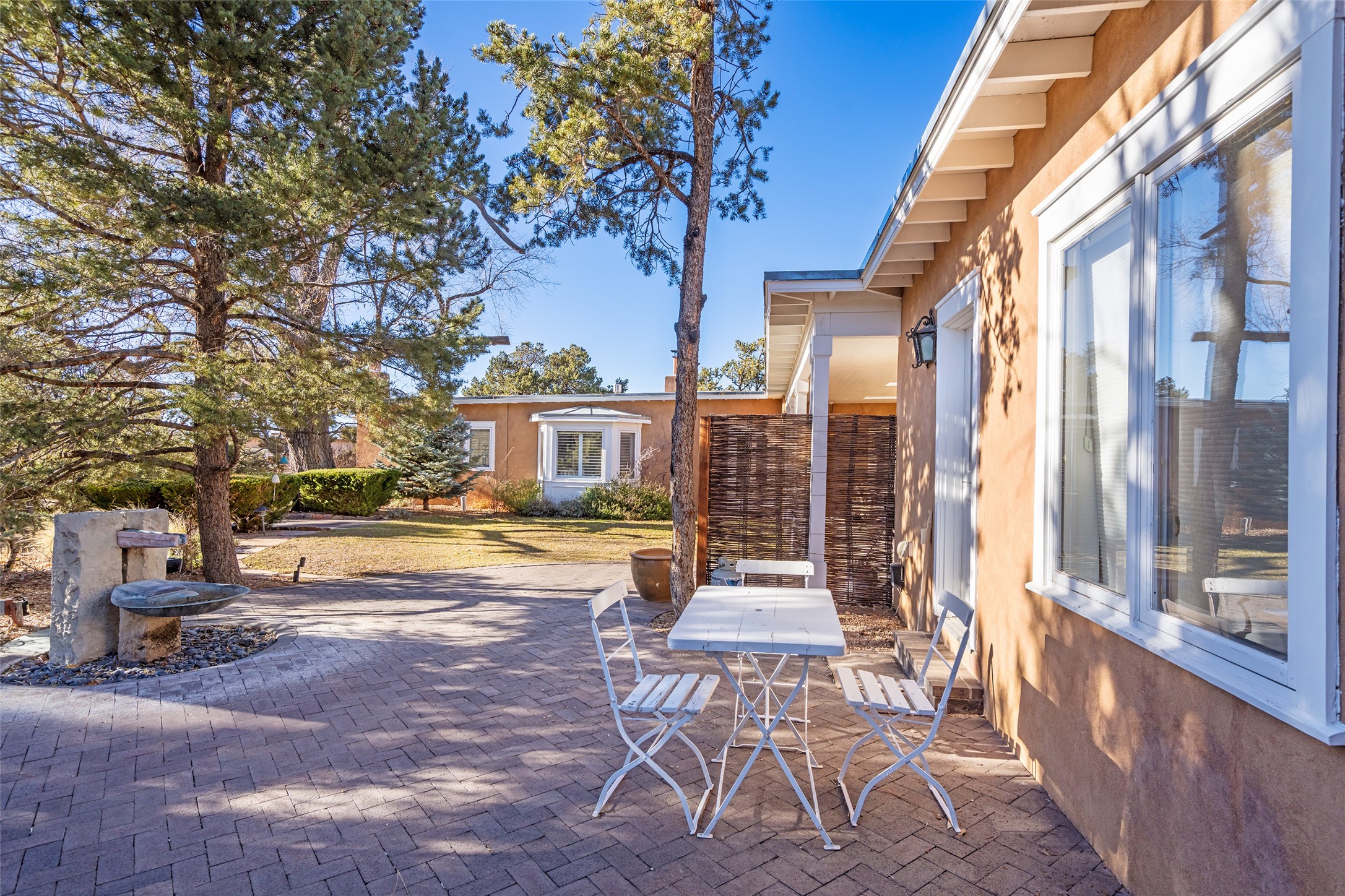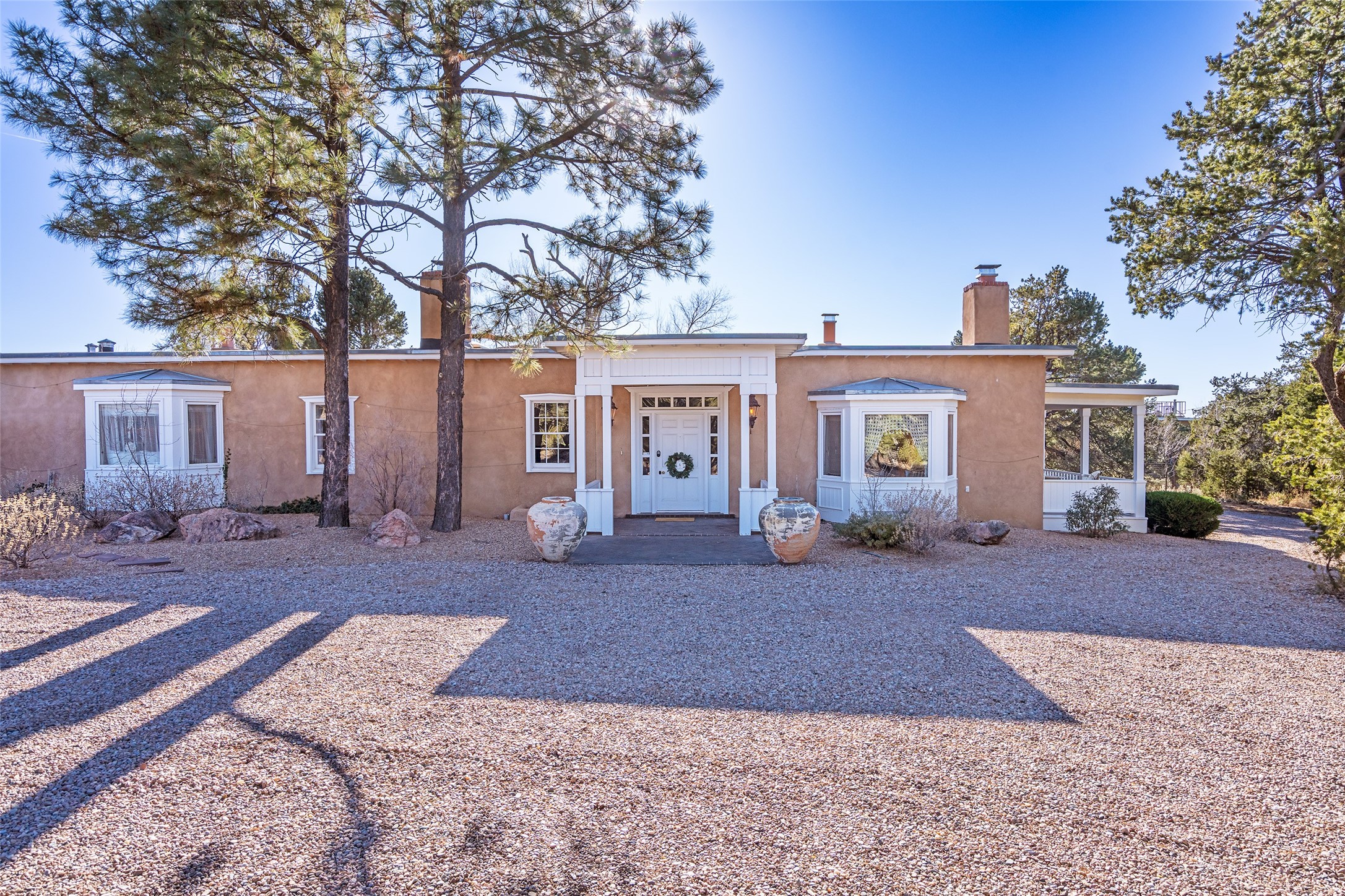 Privately nestled among mature trees on nearly three acres, this distinguished New Mexico Territorial-style estate captures sweeping views of the Sangre de Cristo, Sandia, and Ortiz Mountains. Timeless architecture and thoughtful craftsmanship define the 3,600-square-foot main residence, where a gracious brick-floored entry hall creates an immediate sense of arrival and seamlessly connects the home's refined living spaces. A separate one bedroom, one bath guest house offers a welcoming retreat for visitors, complete with a living and dining area, full kitchen, and private patio. The property also offers a substantial heated, detached garage/studio that presents endless possibilities as an artist's studio, workshop, or collector's showroom. Designed for both elegant entertaining and everyday comfort, the residence offers four bedrooms, four bathrooms, formal dining room, and a generous eat-in kitchen. The serene primary suite is a private sanctuary, featuring its own media room, walk-in closet, and secluded portal--perfect for quiet mornings or sunset views. Eight fireplaces throughout the home, including one on the expansive backyard portal, provide warmth, ambiance, and year-round livability. Multiple portals invite effortless indoor-outdoor living, ideal for enjoying Santa Fe's celebrated climate and breathtaking mountain vistas. Located in Santa Fe's coveted Historic Eastside, this exceptional property offers rare privacy just minutes from renowned hiking trails, Museum Hill, Canyon Road, and the Downtown Plaza--an extraordinary opportunity to experience refined living at the heart of Northern New Mexico's cultural landscape.