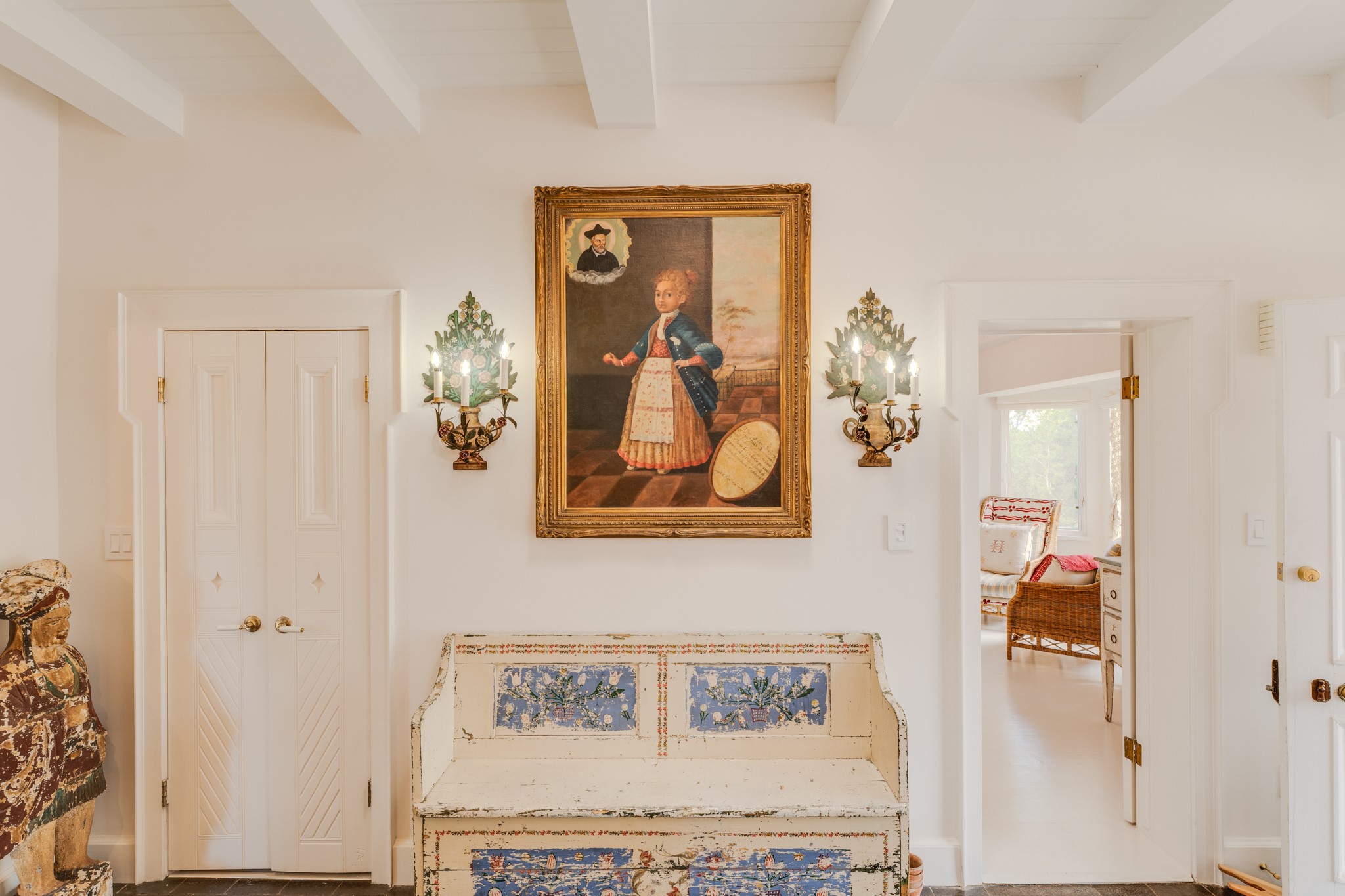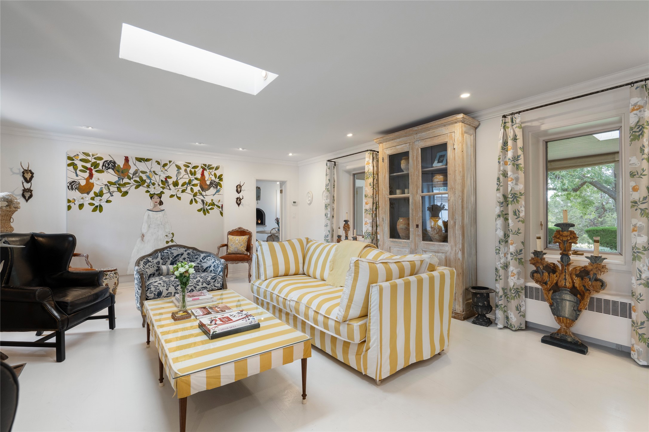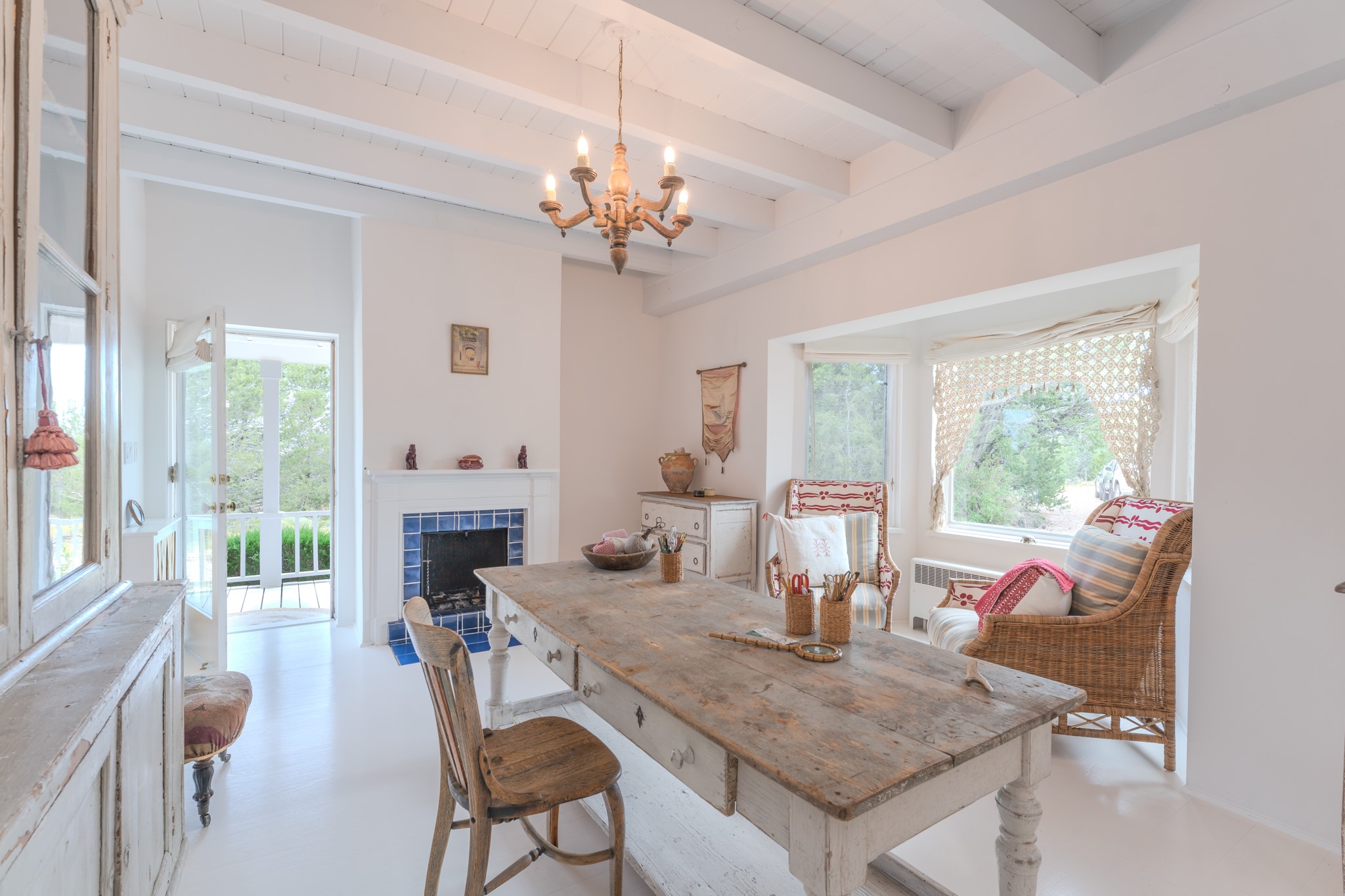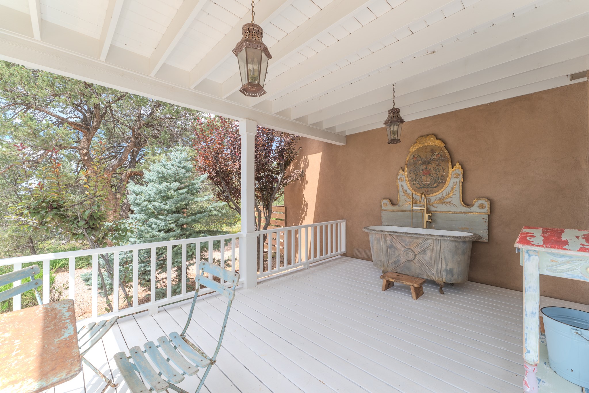 Privately nestled among mature trees on nearly three acres, this distinguished New Mexico Territorial-style estate captures sweeping views of the Sangre de Cristo, Sandia, and Ortiz Mountains. Timeless architecture and thoughtful craftsmanship define the 3,600-square-foot main residence, where a gracious brick-floored entry hall creates an immediate sense of arrival and seamlessly connects the home's refined living spaces. A separate one bedroom, one bath guest house offers a welcoming retreat for visitors, complete with a living and dining area, full kitchen, and private patio. The property also offers a substantial heated, detached garage/studio that presents endless possibilities as an artist's studio, workshop, or collector's showroom. Designed for both elegant entertaining and everyday comfort, the residence offers four bedrooms, four bathrooms, formal dining room, and a generous eat-in kitchen. The serene primary suite is a private sanctuary, featuring its own media room, walk-in closet, and secluded portal--perfect for quiet mornings or sunset views. Eight fireplaces throughout the home, including one on the expansive backyard portal, provide warmth, ambiance, and year-round livability. Multiple portals invite effortless indoor-outdoor living, ideal for enjoying Santa Fe's celebrated climate and breathtaking mountain vistas. Located in Santa Fe's coveted Historic Eastside, this exceptional property offers rare privacy just minutes from renowned hiking trails, Museum Hill, Canyon Road, and the Downtown Plaza--an extraordinary opportunity to experience refined living at the heart of Northern New Mexico's cultural landscape.