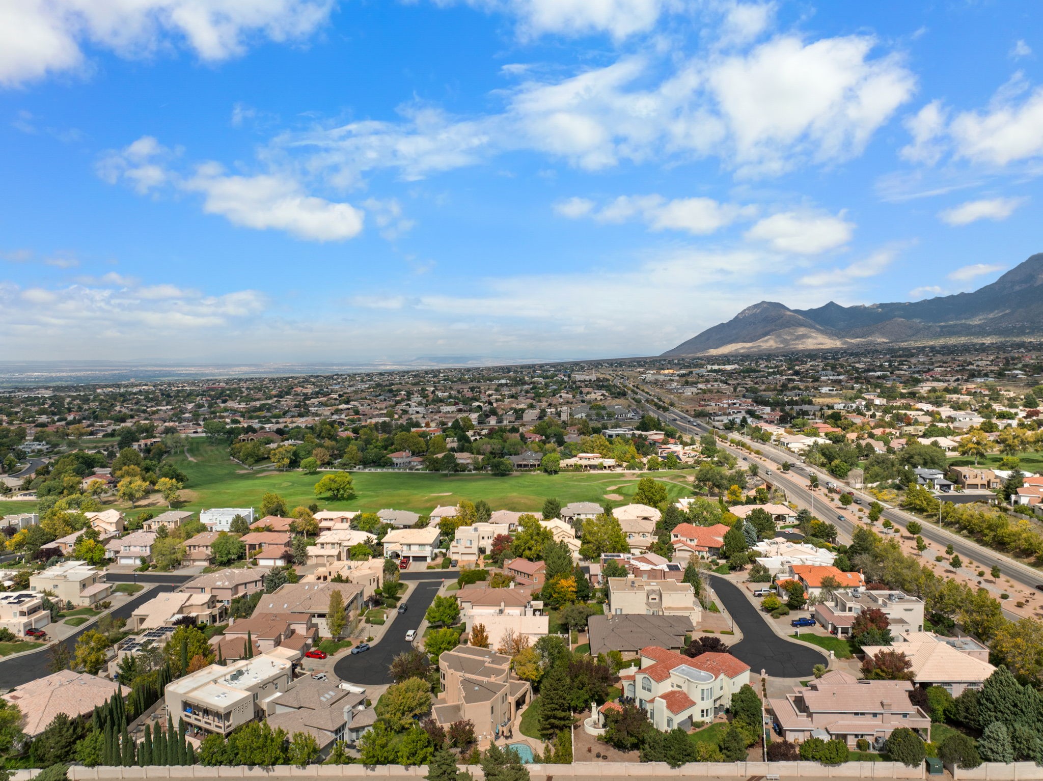 A rare offering of timeless architecture and elevated comfort, this beautifully updated residence showcases the signature design of Eric Spurlock and the craftsmanship of Tiara Homes, set within Albuquerque's only 24-hour guard-gated community Thoughtfully designed, the home offers three bedrooms plus a study or optional fourth bedroom, three baths, and an oversized three-car garage with ample space for a golf cart--perfectly suited for both daily living and resort-style enjoyment. Refrigerated air ensures year-round comfort. At the heart of the home, a dramatic circular staircase creates a striking focal point, anchoring the elegant layout. The expansive great room is an entertainer's dream, featuring a wet bar, soaring tongue-and-groove ceilings accented by handcrafted vigas, anda stunning fireplace that adds warmth and architectural presence. A cozy formal living room and a refined formal dining space provide inviting areas for intimate gatherings and special occasions.Updated kitchen is both functional and inviting, complemented by a charming breakfast room ideal for casual mornings. The luxurious owner's suite is a private retreat, featuring its own fireplace, a private balcony, and a spa-inspired ensuite bath with a large soaking tub, separate shower, and dual walk-in closets.Outdoors, the just-over-a-quarter-acre cul-de-sac lot offers privacy and space, highlighted by a sparkling, heated gunite pool with waterfall and slide, creating a true backyard oasis. The pool is 16 feet by 28 feet, with a depth going from 3 feet to 7, heated with a salt chlorination system and a new deck on deck automatic cover.Distinctive, refined, and truly one of a kind, this exceptional home blends luxury, comfort, and architectural artistry, a masterpiece not to be missed.