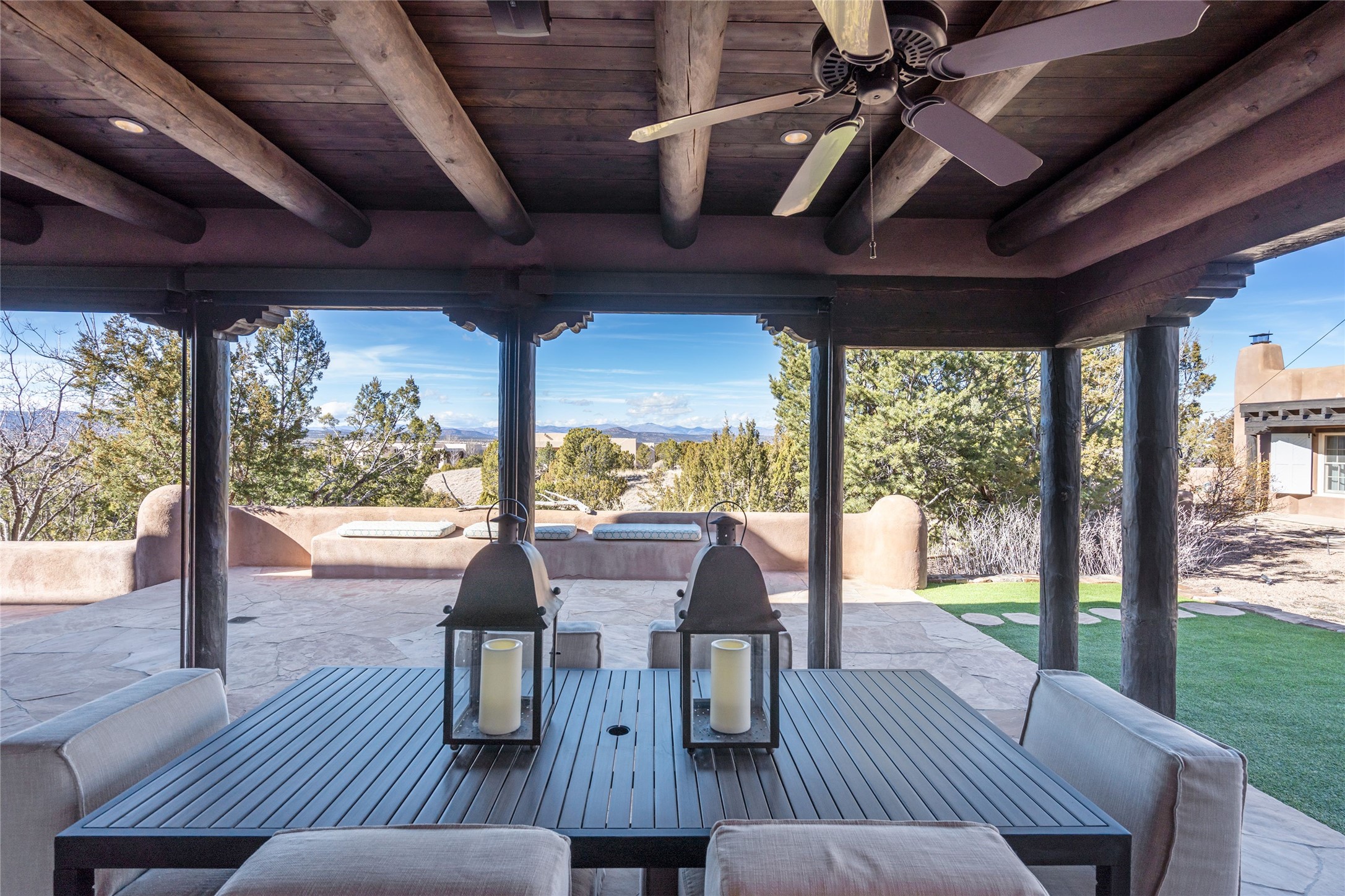 DESIGNED BY THE AWARD-WINNING ARCHITECTURAL FIRM OF CURTIS & WINDHAM ARCHITECTS, THIS SUPERB LAS CAMPANAS RESIDENCE ENJOYS THE TIMELESS HALLMARKS OF A TRADITIONAL FIRST-CLASS CUSTOM BUILD WITH EXQUISITELY LANDSCAPED GARDENS AND A WINDING PATH TO THE GUEST CASITA. Approach the home through tall natural grasses and glimpse the unique design element of wooden shutters on the windows, giving the home a European feel. Warm, rich woods throughout - most notably hand-crafted coffered ceilings, beautiful custom doors, and wooden floors as well as hand crafted tiles added by the current owners make for a sumptuous yet relaxed living space. The living room is expansive with tall windows, flanked by a handsome wall of built-in showcases, also added by the present owners, making several seating areas possible. The chef's kitchen offers a large island, top-of-the-line appliances and amenities plus a true walk-in pantry. While the property has sensational entertaining areas inside and out - the focus of this home is intimacy. High efficiency rastra type construction lends a solid, sturdy, quiet feel to the home and the enclosed rear garden is reminiscent of Provence - enjoy the sound of water from the fountain as you dine alfresco among a grove of Hawthorne trees. Rooftop deck. Excellent privacy on a large lot that spans two golf courses. Very special. Unique, one-of-a-kind property.