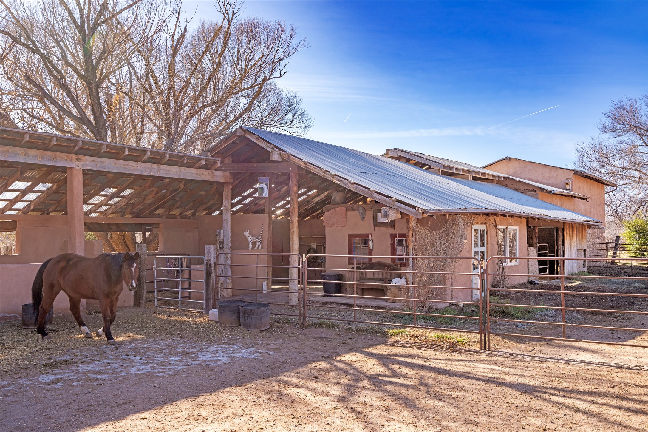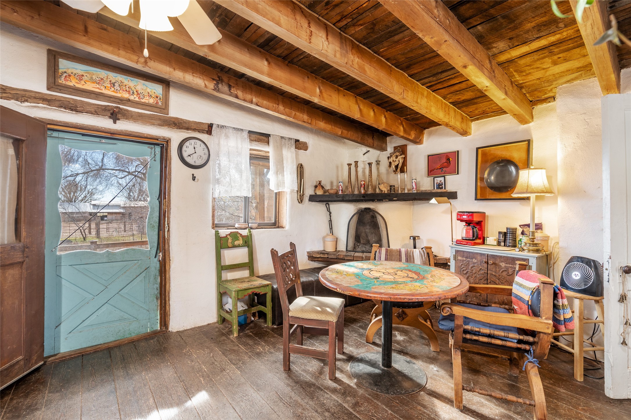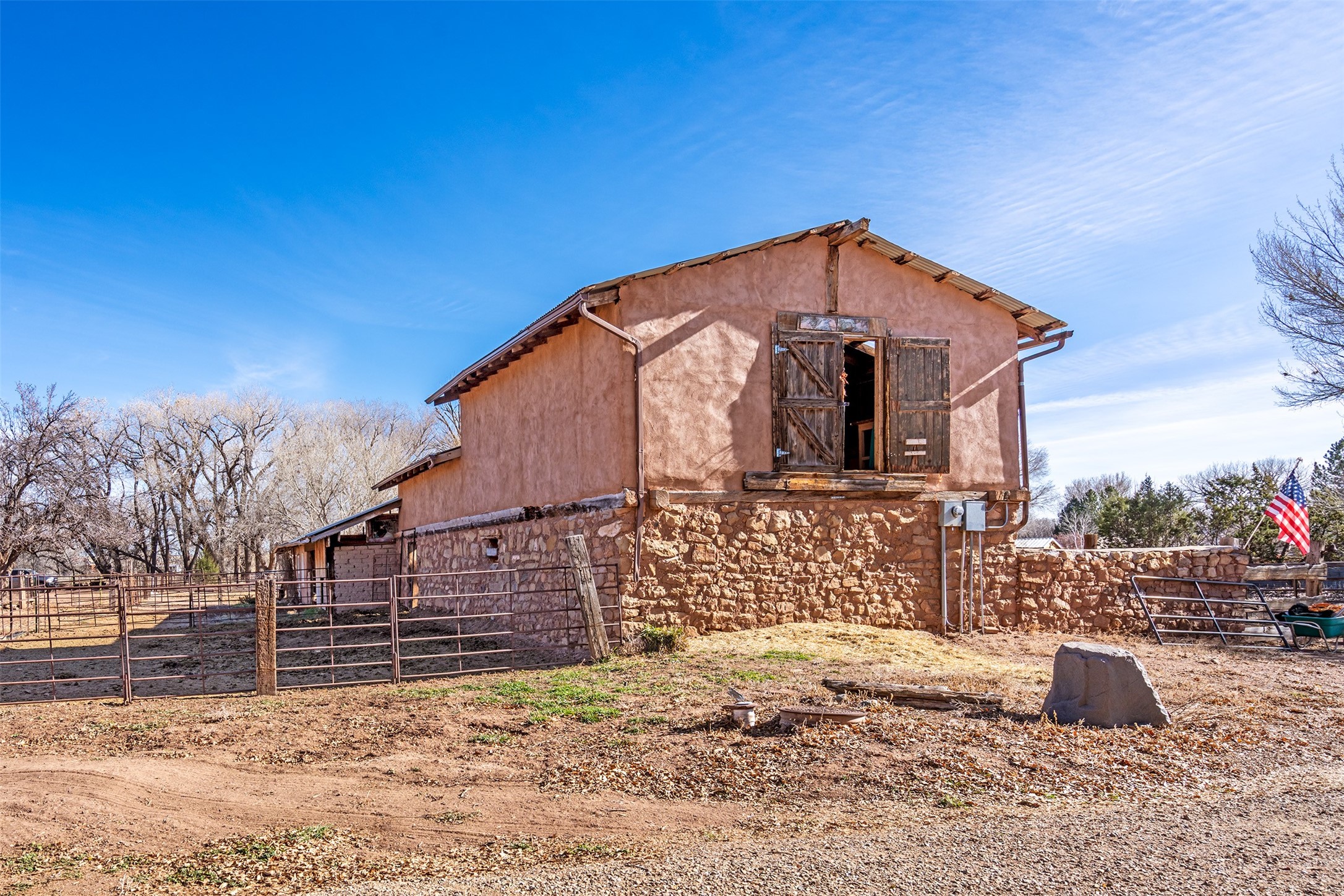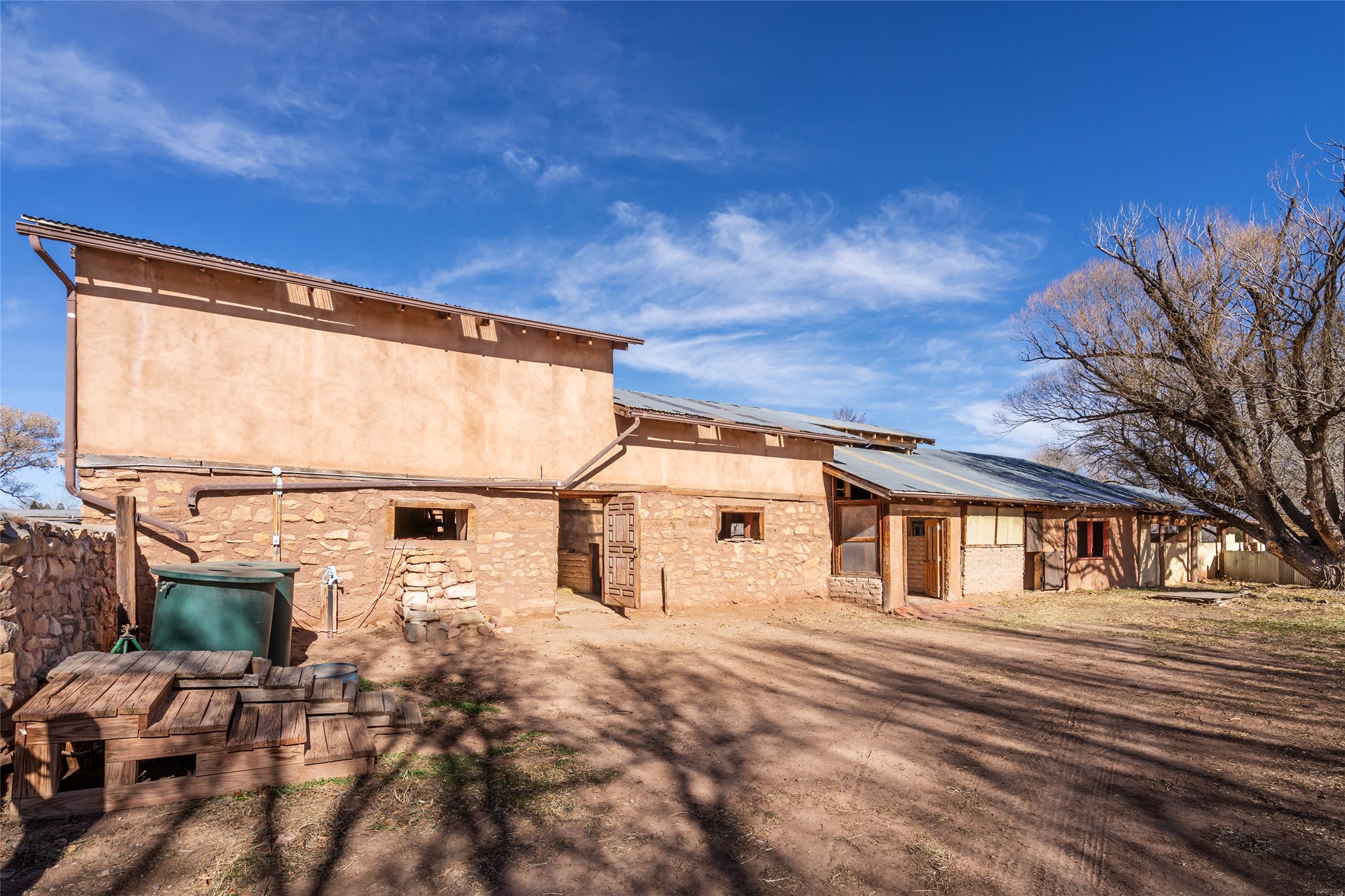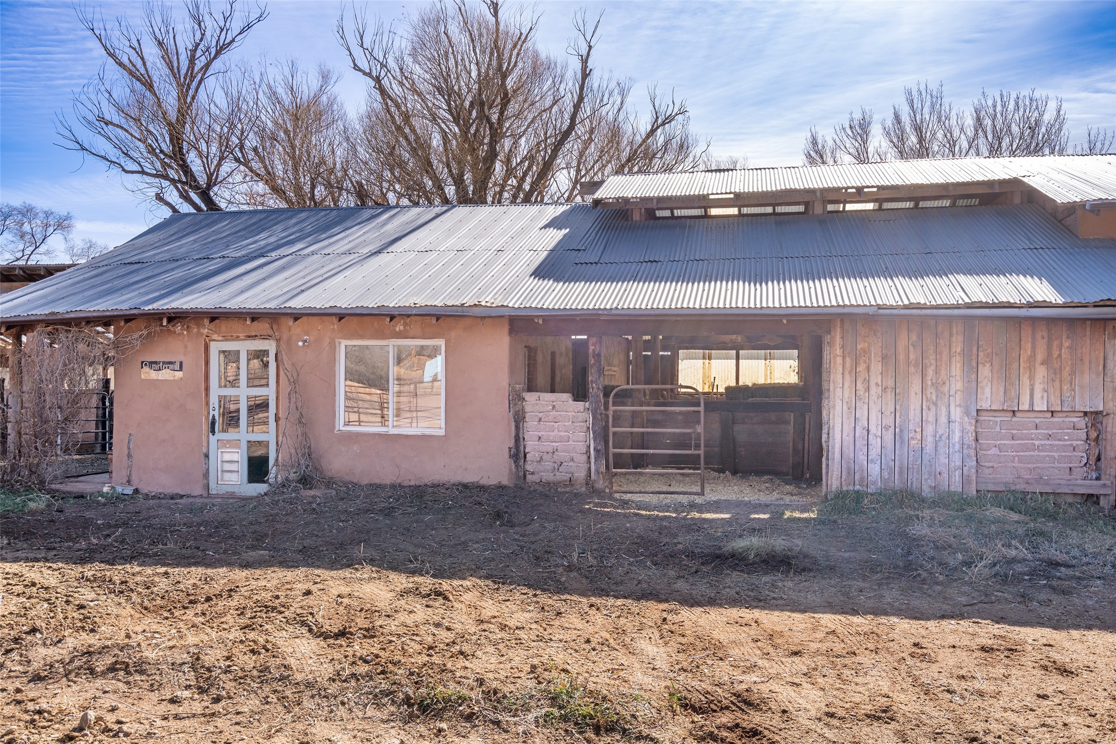 This historic Galisteo Hacienda presents a rare opportunity to restore an iconic adobe estate set on 3.7 acres within the village of Galisteo, one of the largest landholdings under Traditional Community zoning, which supports residential, live/work, and art gallery uses. Dating to the 1800s, the property once served as the headquarters of Don Jos Ortiz y Pino's sheep empire and later as the iconic Quartermill Farm - home, studio, and gallery of acclaimed artist Priscilla Hoback--making it uniquely suited to continue as a creative live/work estate. Located in the heart of Galisteo Village, the property includes a former gallery along a central village road and a substantial adobe main house privately set behind it.The hacienda features two residential wings with four bedrooms and three baths, a large library, grand living and dining rooms, multiple fireplaces, and authentic architectural details. A generous inner courtyard with mature trees, portals, and a koi pond creates a serene, campus-like setting ideal for both living and creative pursuits, complemented by fruit trees, gardens, and expansive village acreage.Equestrian facilities include a large handcrafted stone and adobe barn with spacious stalls and turnouts, wash rack, hay loft, tack room with bath, and an oversized arena, supported by a private well dedicated to the barn. Additional structures include an art studio with sink and loft, and a one-bedroom guest house--formerly the historic town bar--offering flexibility for guests, staff, or extended work use.The property is in need of renovation and restoration, presenting an exceptional opportunity for a discerning buyer to reimagine a historically significant live/work estate, blending residential life, creative enterprise, and community engagement in one of Galisteo's most storied village settings.