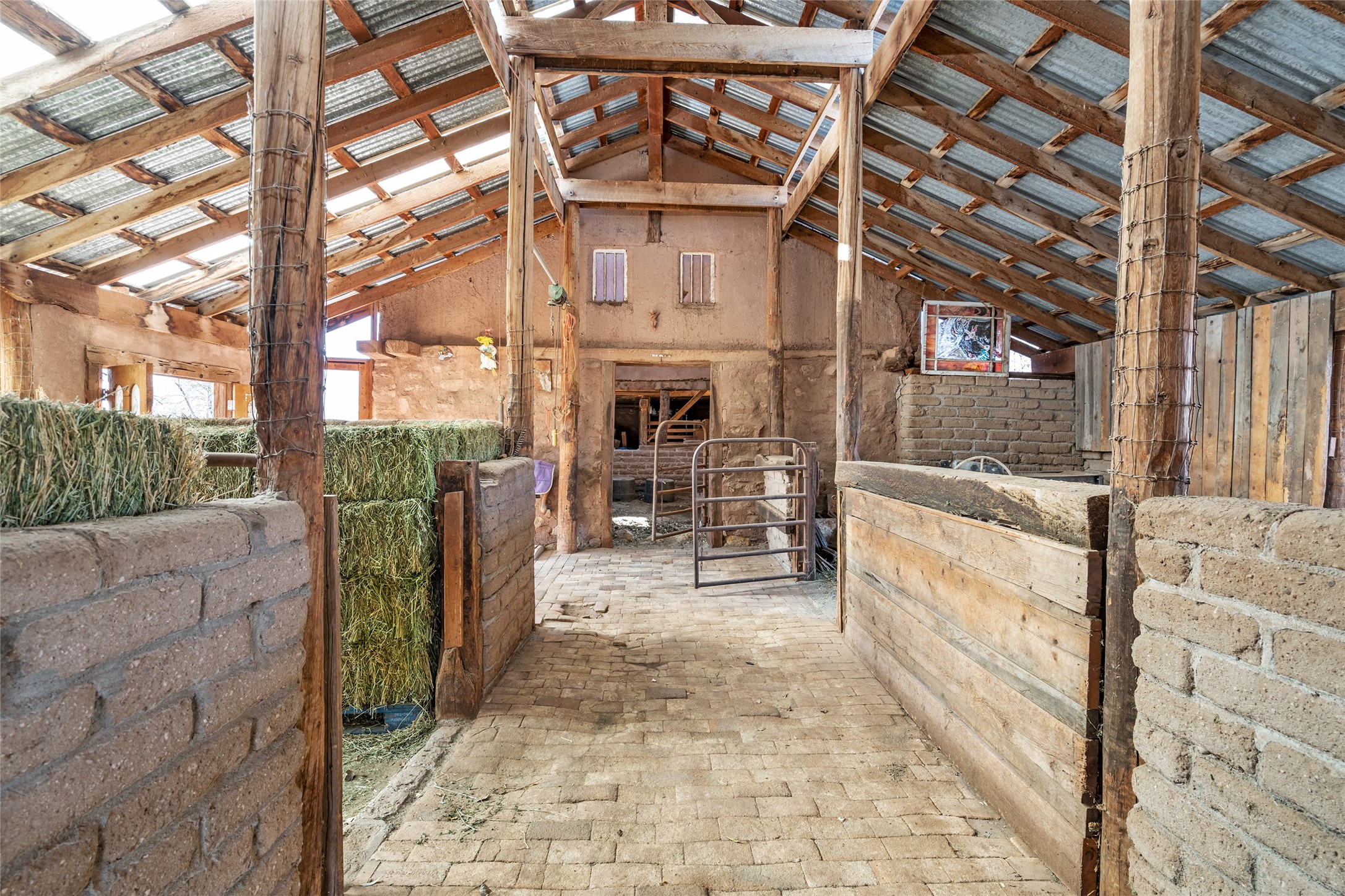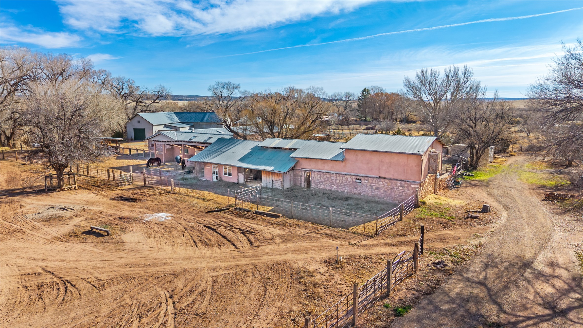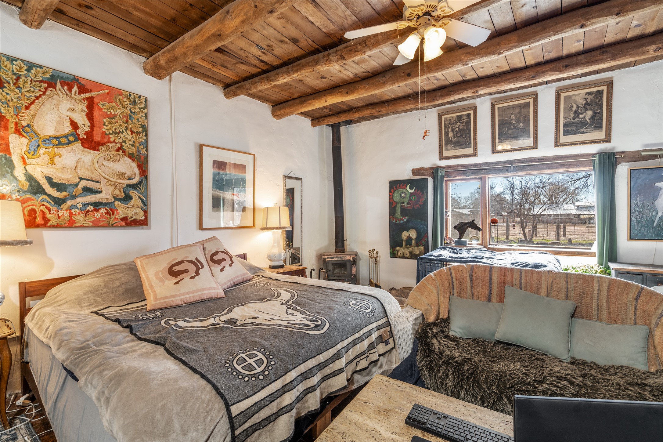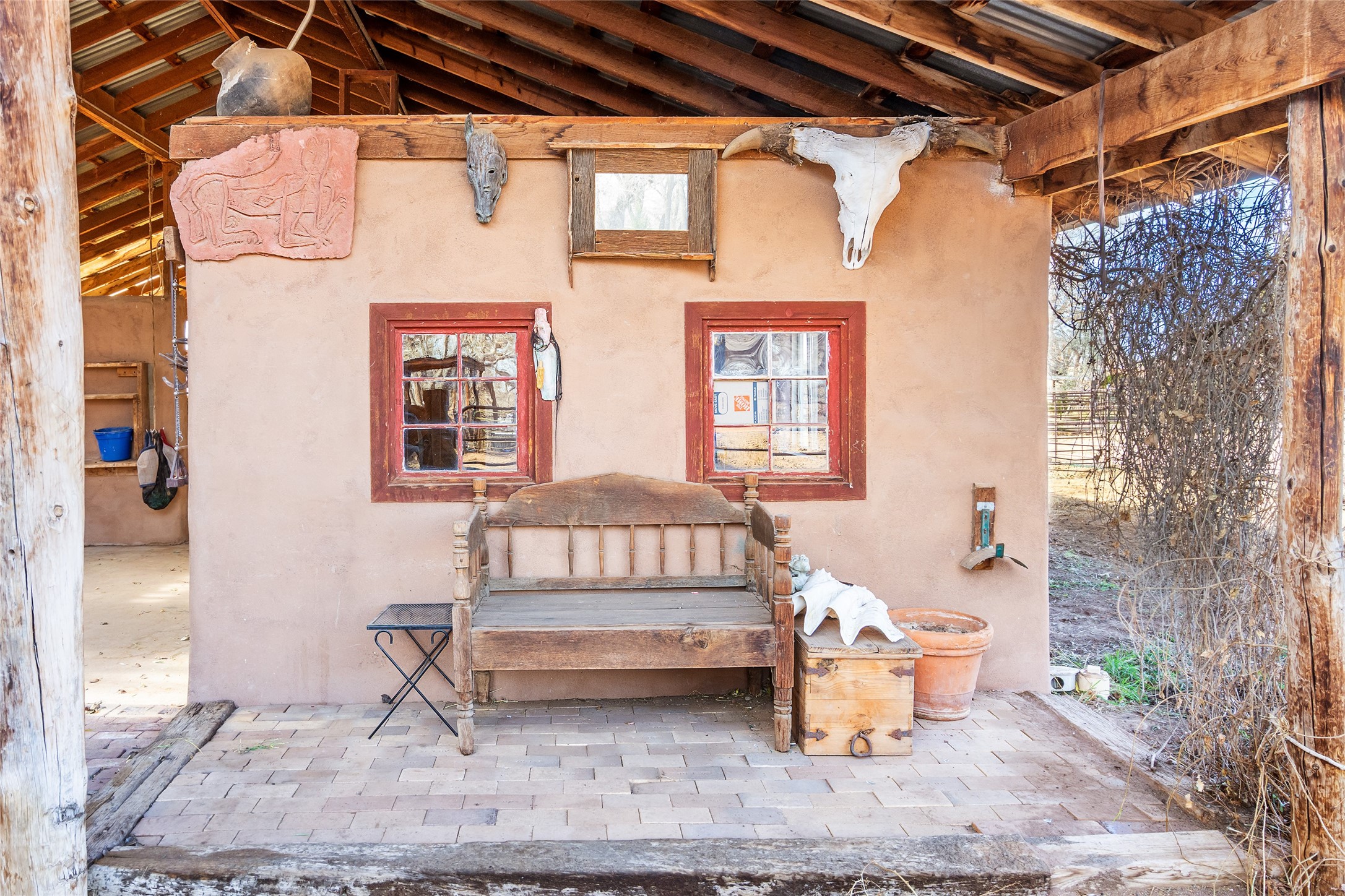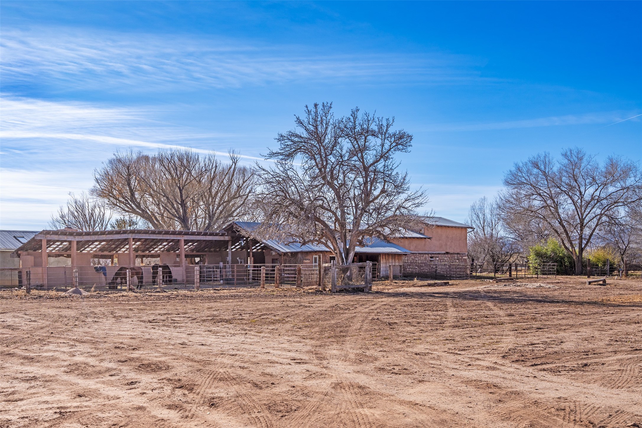 This historic Galisteo Hacienda presents a rare opportunity to restore an iconic adobe estate set on 3.7 acres within the village of Galisteo, one of the largest landholdings under Traditional Community zoning, which supports residential, live/work, and art gallery uses. Dating to the 1800s, the property once served as the headquarters of Don Jos Ortiz y Pino's sheep empire and later as the iconic Quartermill Farm - home, studio, and gallery of acclaimed artist Priscilla Hoback--making it uniquely suited to continue as a creative live/work estate. Located in the heart of Galisteo Village, the property includes a former gallery along a central village road and a substantial adobe main house privately set behind it.The hacienda features two residential wings with four bedrooms and three baths, a large library, grand living and dining rooms, multiple fireplaces, and authentic architectural details. A generous inner courtyard with mature trees, portals, and a koi pond creates a serene, campus-like setting ideal for both living and creative pursuits, complemented by fruit trees, gardens, and expansive village acreage.Equestrian facilities include a large handcrafted stone and adobe barn with spacious stalls and turnouts, wash rack, hay loft, tack room with bath, and an oversized arena, supported by a private well dedicated to the barn. Additional structures include an art studio with sink and loft, and a one-bedroom guest house--formerly the historic town bar--offering flexibility for guests, staff, or extended work use.The property is in need of renovation and restoration, presenting an exceptional opportunity for a discerning buyer to reimagine a historically significant live/work estate, blending residential life, creative enterprise, and community engagement in one of Galisteo's most storied village settings.