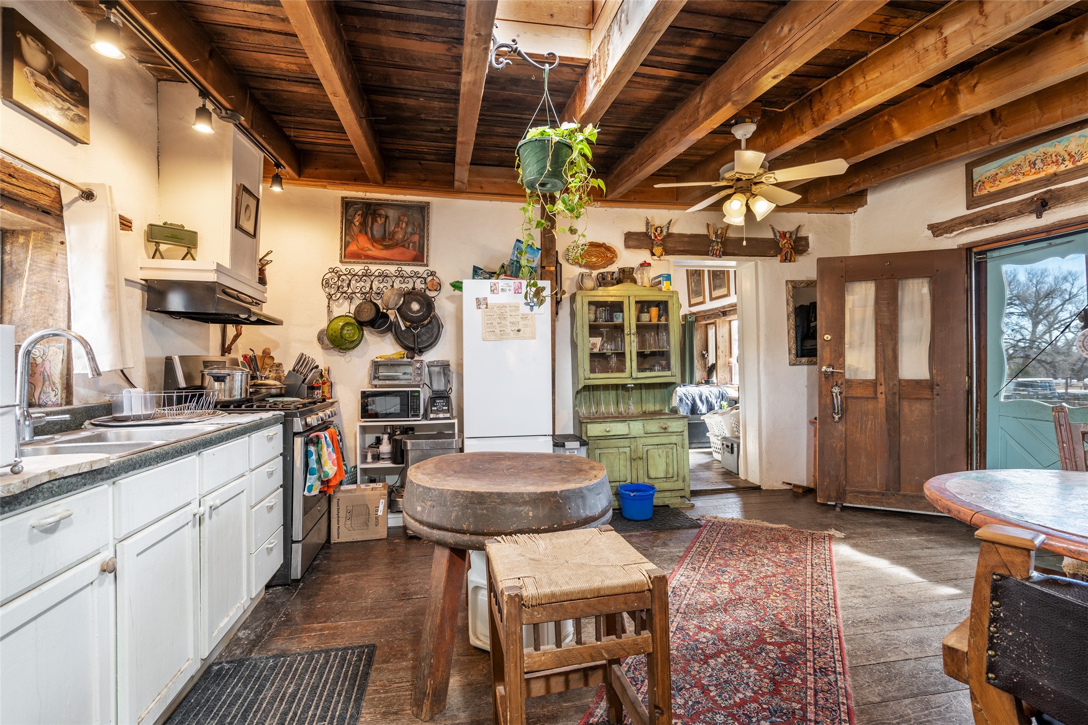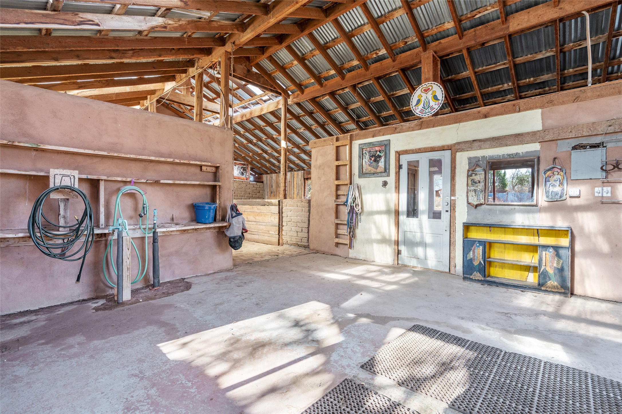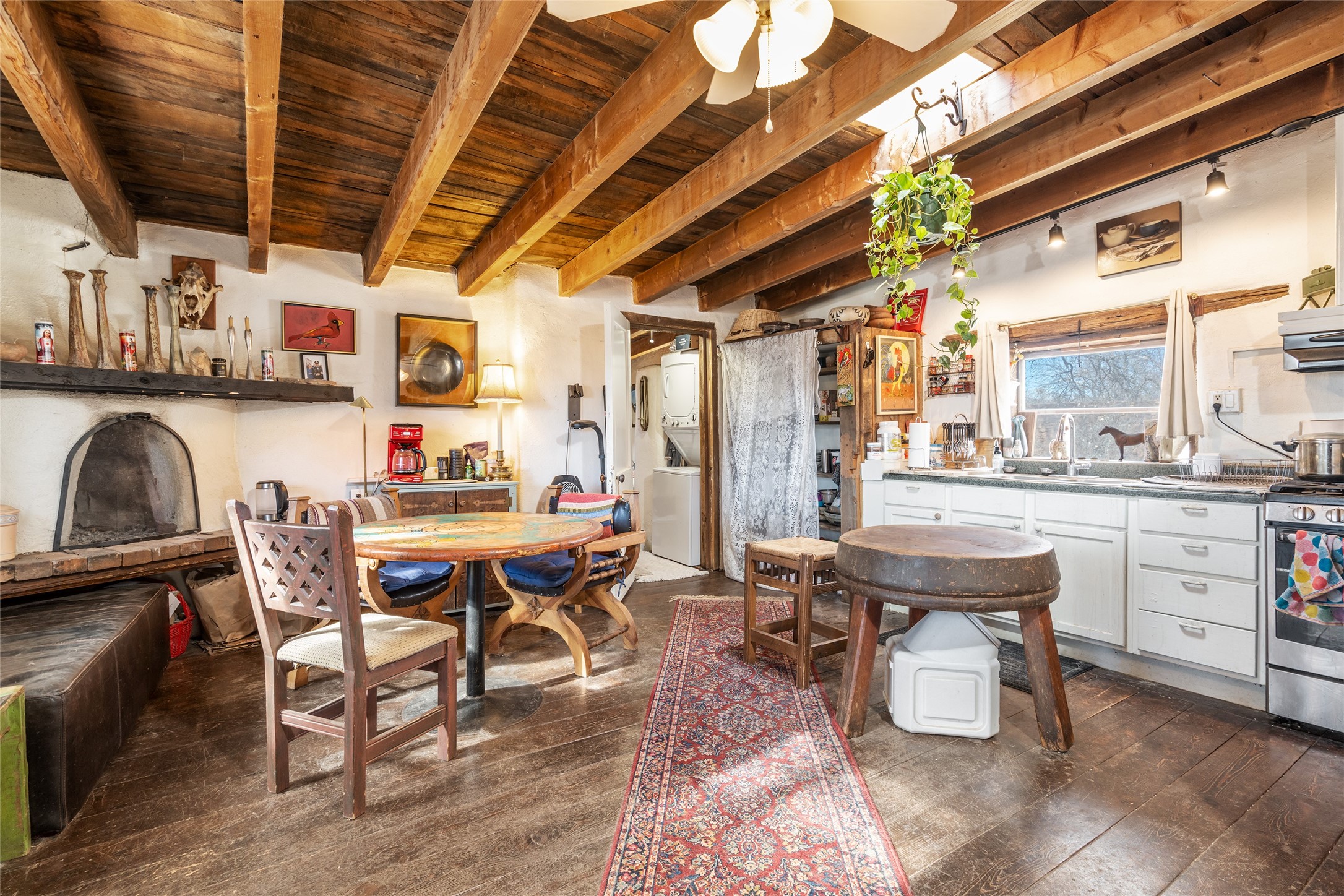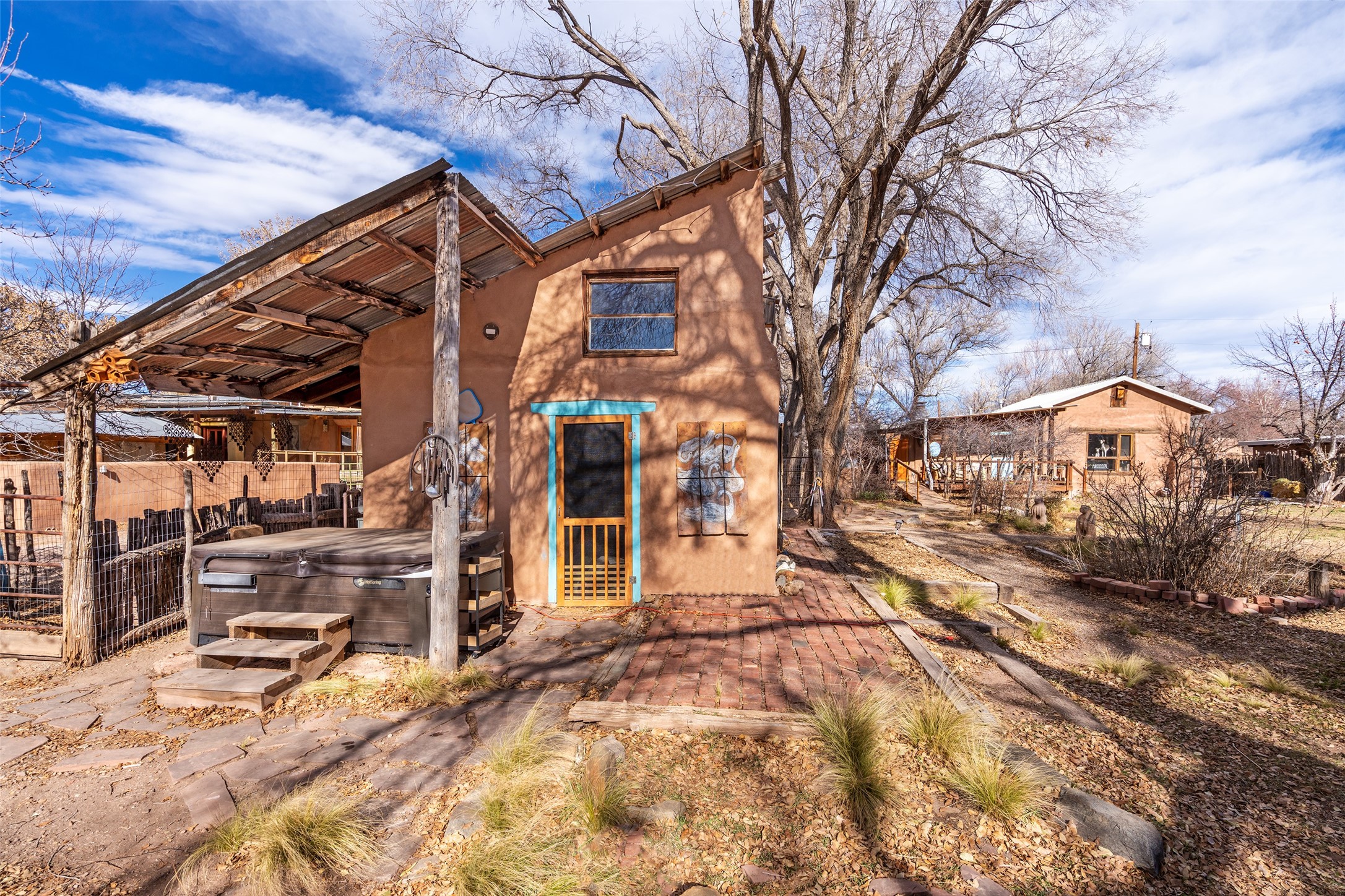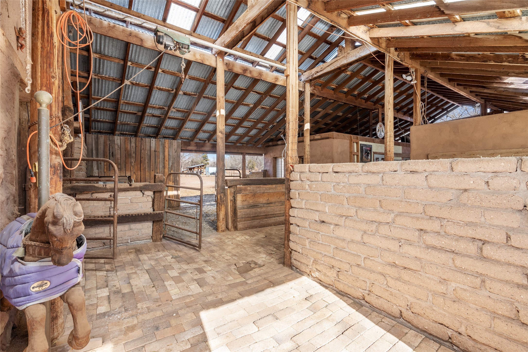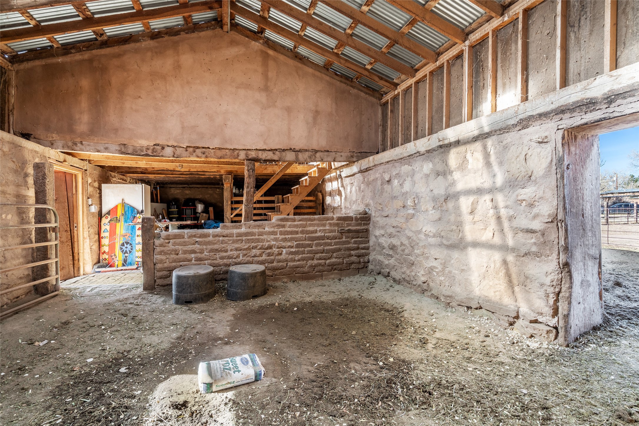 This historic Galisteo Hacienda presents a rare opportunity to restore an iconic adobe estate set on 3.7 acres within the village of Galisteo, one of the largest landholdings under Traditional Community zoning, which supports residential, live/work, and art gallery uses. Dating to the 1800s, the property once served as the headquarters of Don Jos Ortiz y Pino's sheep empire and later as the iconic Quartermill Farm - home, studio, and gallery of acclaimed artist Priscilla Hoback--making it uniquely suited to continue as a creative live/work estate. Located in the heart of Galisteo Village, the property includes a former gallery along a central village road and a substantial adobe main house privately set behind it.The hacienda features two residential wings with four bedrooms and three baths, a large library, grand living and dining rooms, multiple fireplaces, and authentic architectural details. A generous inner courtyard with mature trees, portals, and a koi pond creates a serene, campus-like setting ideal for both living and creative pursuits, complemented by fruit trees, gardens, and expansive village acreage.Equestrian facilities include a large handcrafted stone and adobe barn with spacious stalls and turnouts, wash rack, hay loft, tack room with bath, and an oversized arena, supported by a private well dedicated to the barn. Additional structures include an art studio with sink and loft, and a one-bedroom guest house--formerly the historic town bar--offering flexibility for guests, staff, or extended work use.The property is in need of renovation and restoration, presenting an exceptional opportunity for a discerning buyer to reimagine a historically significant live/work estate, blending residential life, creative enterprise, and community engagement in one of Galisteo's most storied village settings.