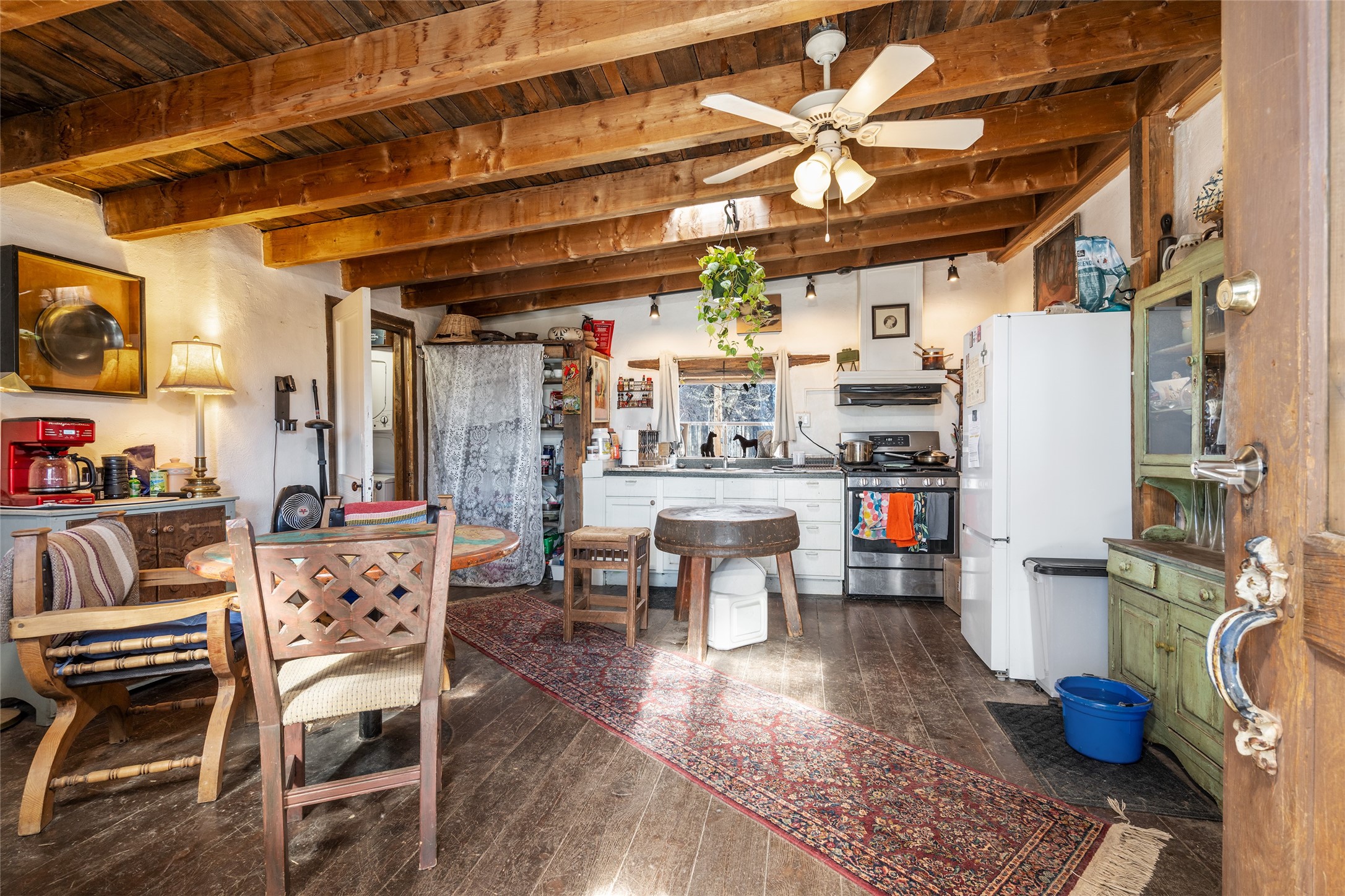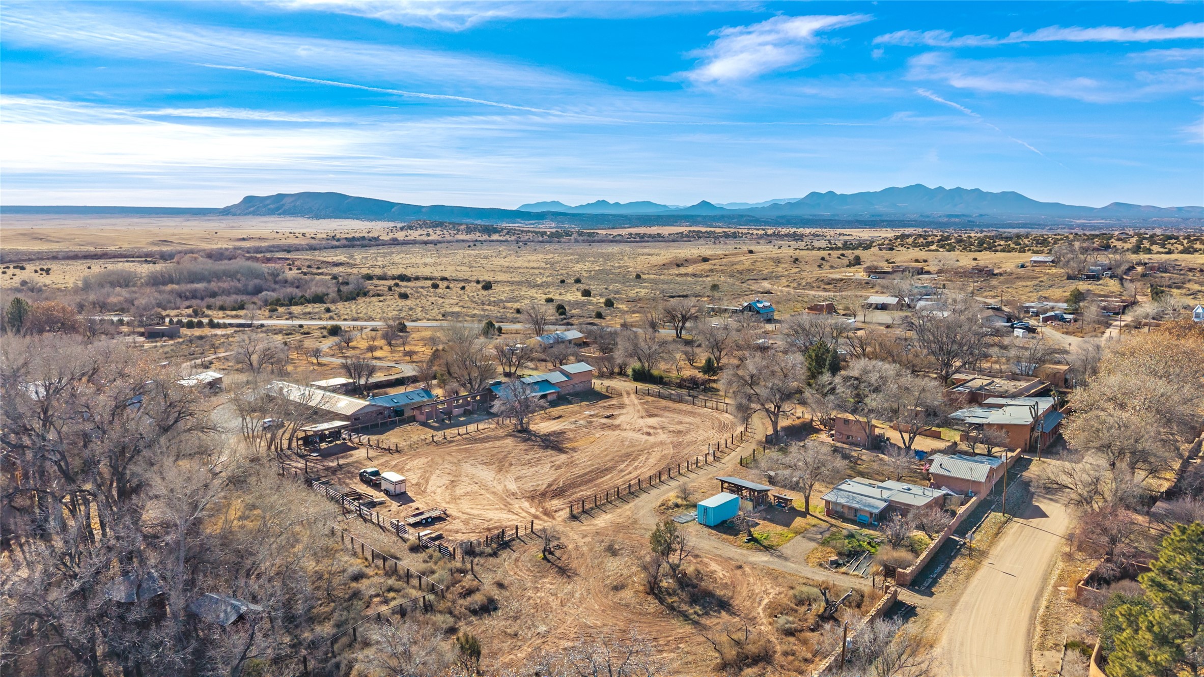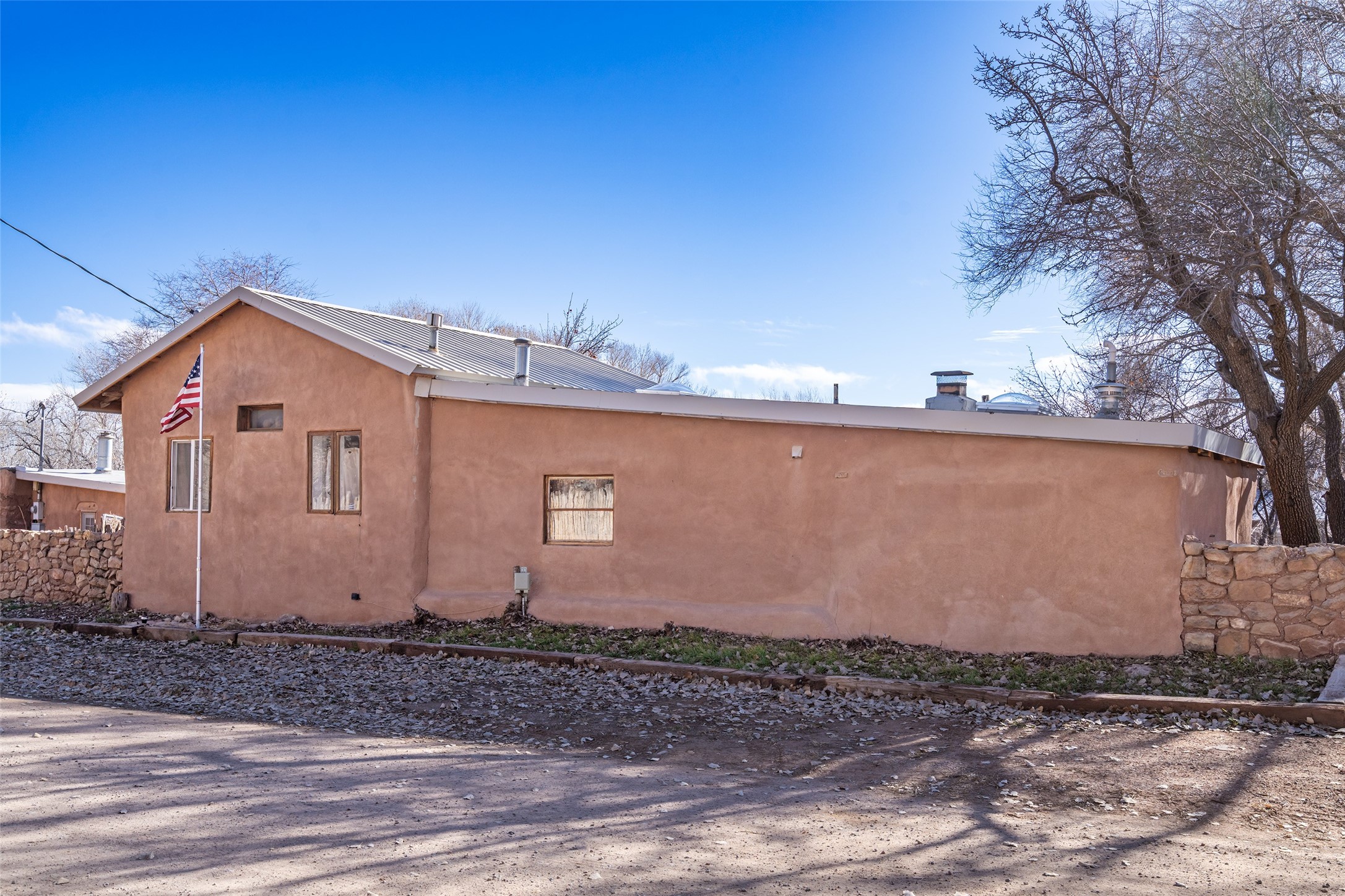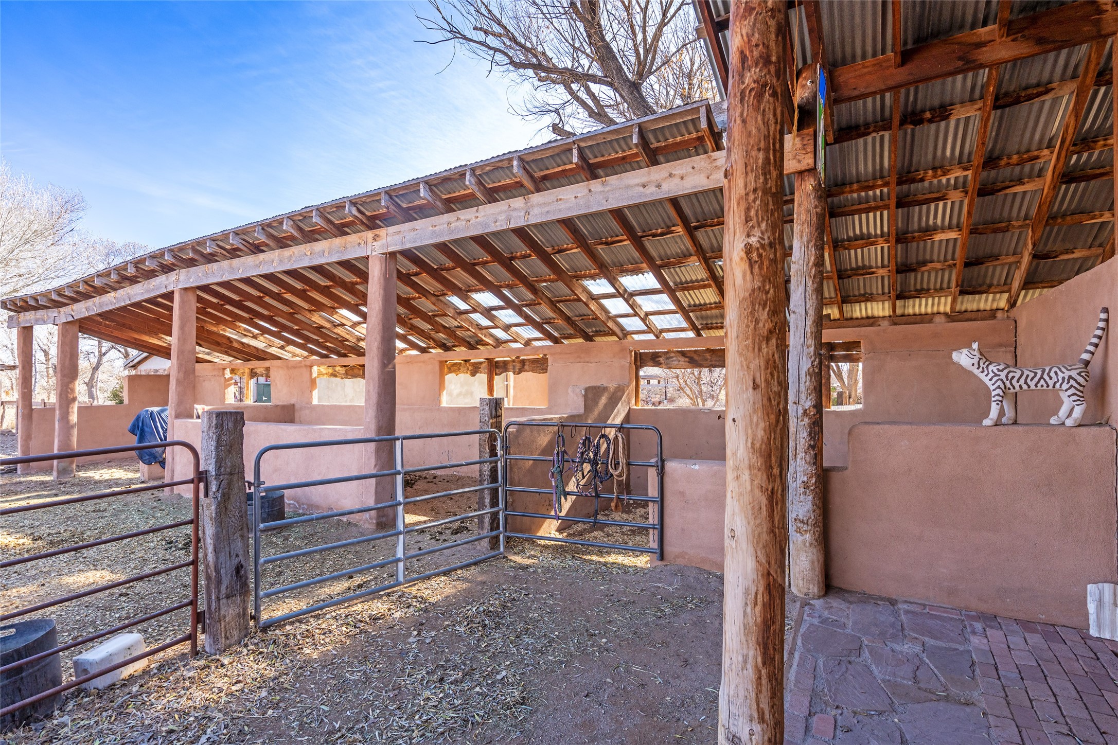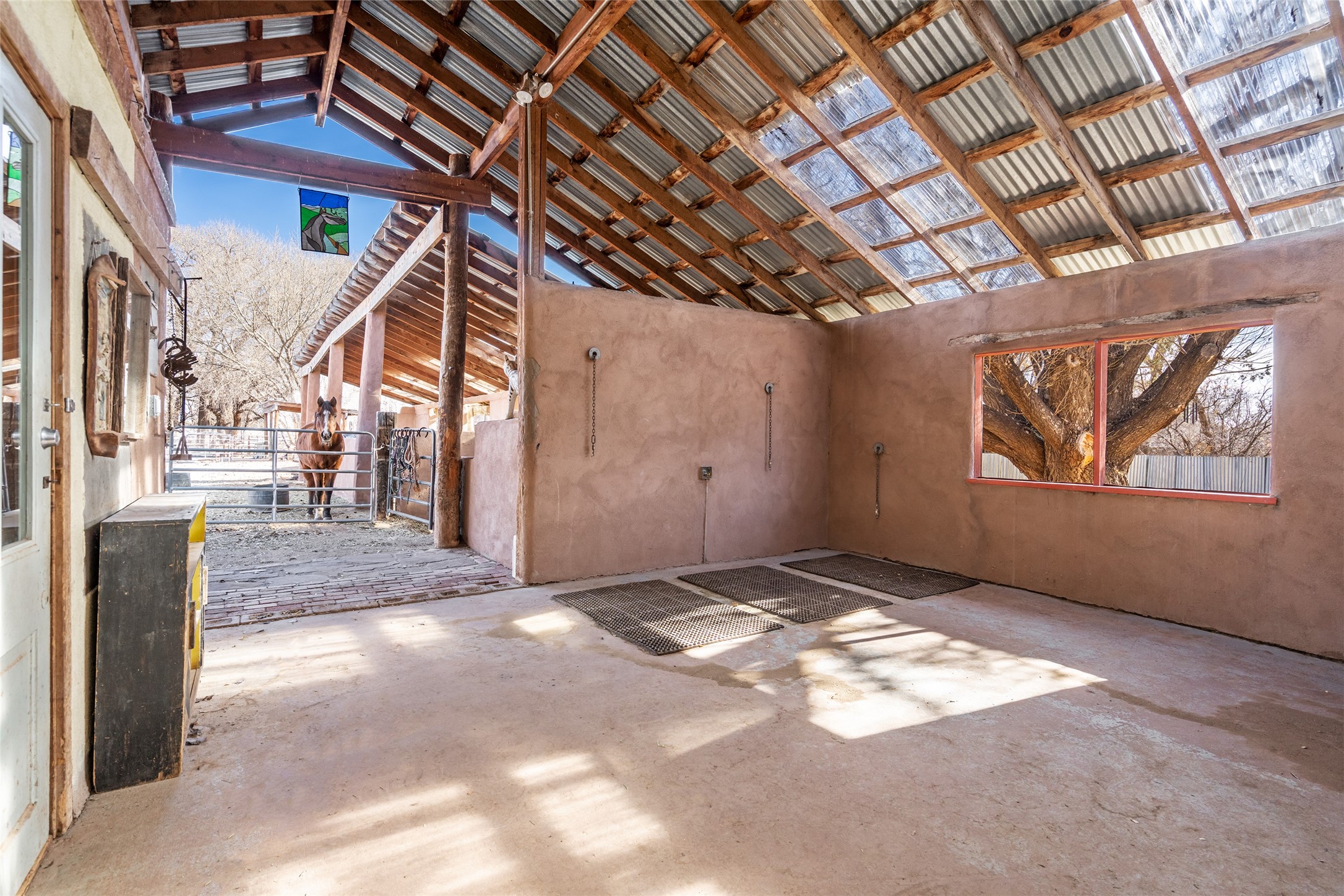 This historic Galisteo Hacienda presents a rare opportunity to restore an iconic adobe estate set on 3.7 acres within the village of Galisteo, one of the largest landholdings under Traditional Community zoning, which supports residential, live/work, and art gallery uses. Dating to the 1800s, the property once served as the headquarters of Don Jos Ortiz y Pino's sheep empire and later as the iconic Quartermill Farm - home, studio, and gallery of acclaimed artist Priscilla Hoback--making it uniquely suited to continue as a creative live/work estate. Located in the heart of Galisteo Village, the property includes a former gallery along a central village road and a substantial adobe main house privately set behind it.The hacienda features two residential wings with four bedrooms and three baths, a large library, grand living and dining rooms, multiple fireplaces, and authentic architectural details. A generous inner courtyard with mature trees, portals, and a koi pond creates a serene, campus-like setting ideal for both living and creative pursuits, complemented by fruit trees, gardens, and expansive village acreage.Equestrian facilities include a large handcrafted stone and adobe barn with spacious stalls and turnouts, wash rack, hay loft, tack room with bath, and an oversized arena, supported by a private well dedicated to the barn. Additional structures include an art studio with sink and loft, and a one-bedroom guest house--formerly the historic town bar--offering flexibility for guests, staff, or extended work use.The property is in need of renovation and restoration, presenting an exceptional opportunity for a discerning buyer to reimagine a historically significant live/work estate, blending residential life, creative enterprise, and community engagement in one of Galisteo's most storied village settings.