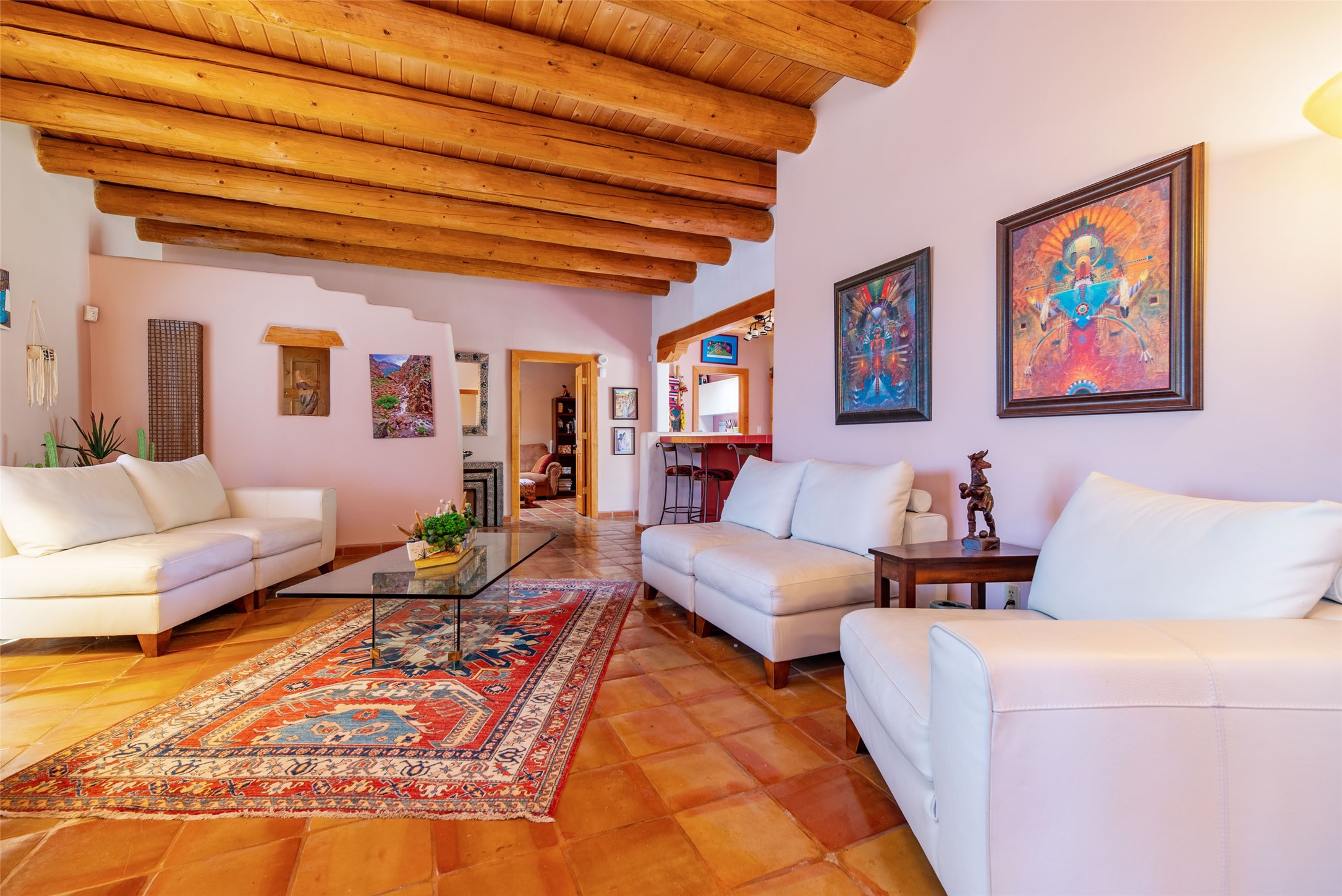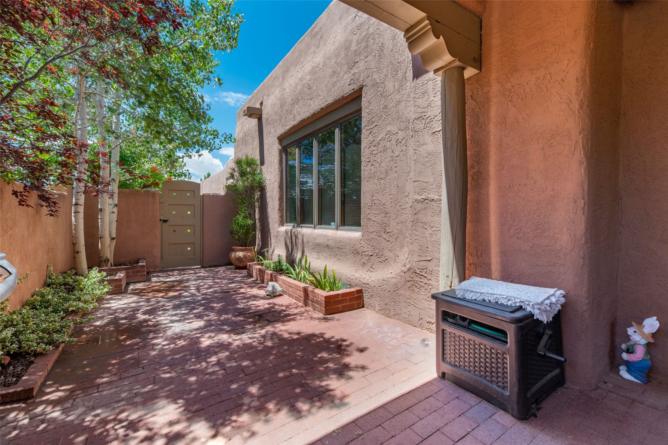 This home is in the prestigious Las Barrancas neighborhood on a property that is tree covered affording complete privacy to 3 walled courtyards, 3 steps up is a fourth ready to accommodate a large hot tub. This is one of the last modern homes constructed with authentic New Mexican materials - kivas, vigas,latillas, and saltillo tile floors. The 2-car garage is 1 1/2 stories with plenty of storage for an extra freezer and refrigerator. Entertaining is smooth and relaxing with the kitchen bar open to living & dining rooms. The 3 bedrooms, 2 baths, and laundry room -spacious & lovely! (No Interior Steps) It has Refrigerated A/C and forced air heat. Immerse yourself & your guests in the culture & vibe of the city of Santa Fe while living in a peaceful country setting. New stucco and roof maintenance. Easy access to downtown, Ten Thousand Waves, Hyde Park hiking/biking, and Ski Santa Fe!