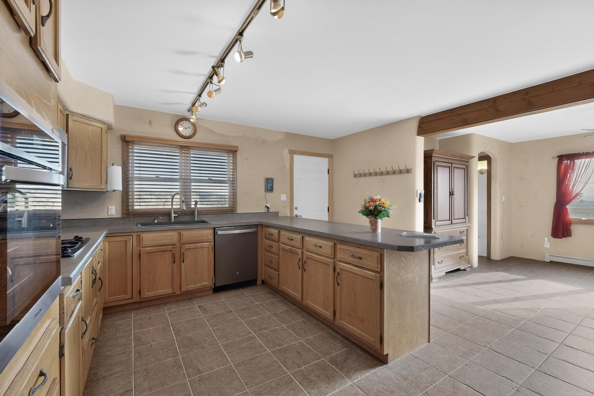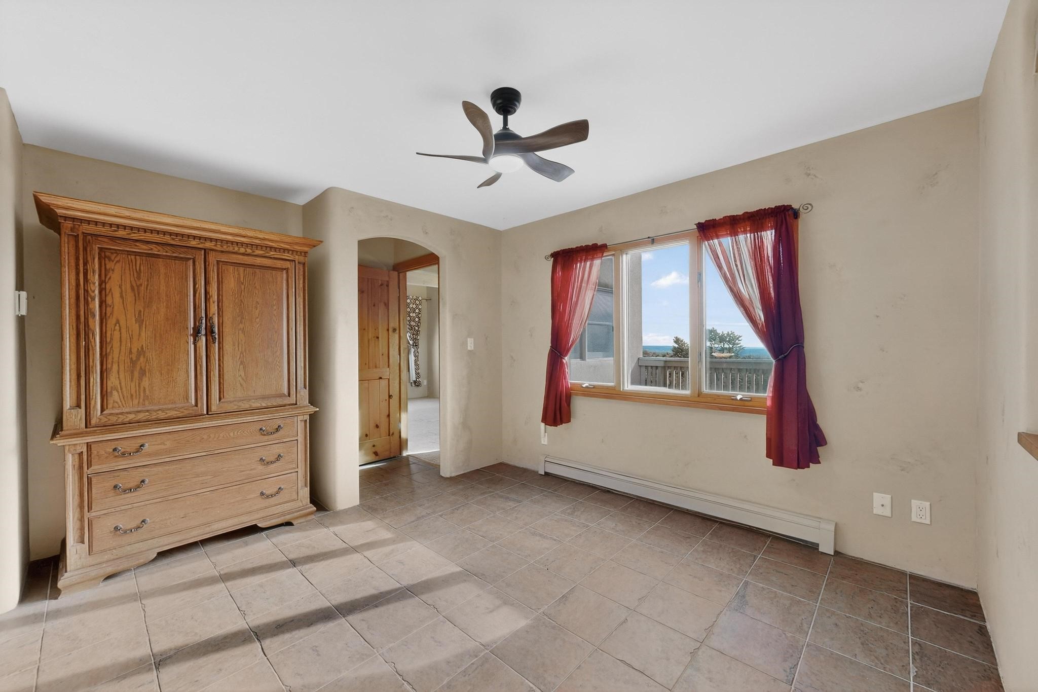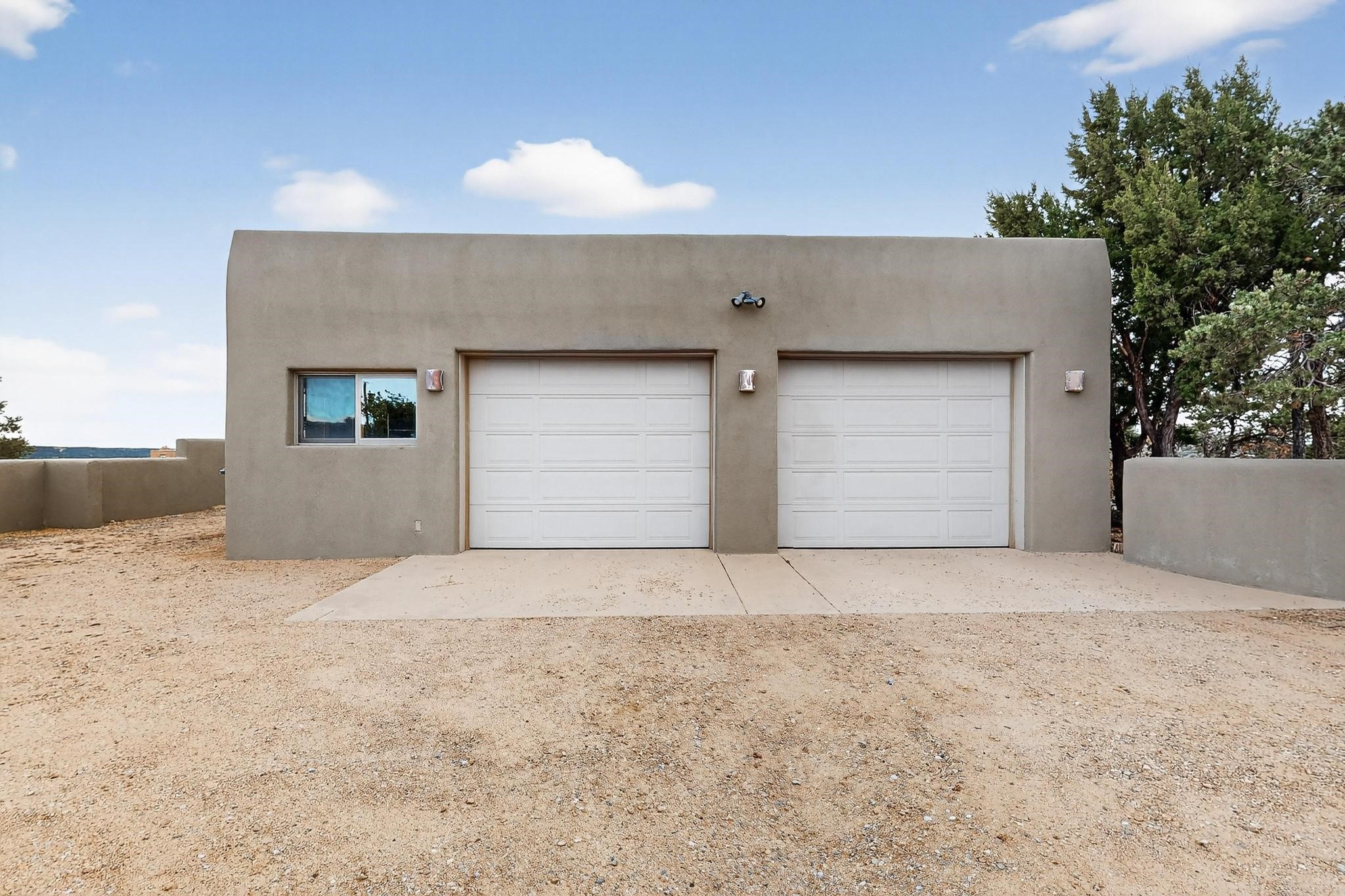 Move in Ready! Priced to Sell. Wonderful passive solar trilevel design nestled on a hilltop with decks and a lighted gazebo to enjoy the sweeping Sangre's and Pecos mountain views. A flexible floorpan with the owners suite, kitchen, dining and living areas on the main level. A TV / family room, and an office upstairs with a view deck. A walk out lower level includes 2 guest bedrooms, a full bath and laundry. The 36' x 29' heated garage also has a workshop and storage room. In 2023 the stucco and roof were replaced, 3 Bosch mini splits added, a new tankless hot water heater, plus new windows and storm doors, 2 trex/wood decks, rain downspouts and the kitchen appliances. In 2024 the well pump was replaced, and there is a 1500 gallon underground cistern. The underground 500 gallon propane tank is owned, the hot tub is ready with fabulous views. All this on 5 acres, No HOA, horses and chickens welcome, only minutes to Eldorado area local shopping and services, or into historic Santa Fe.