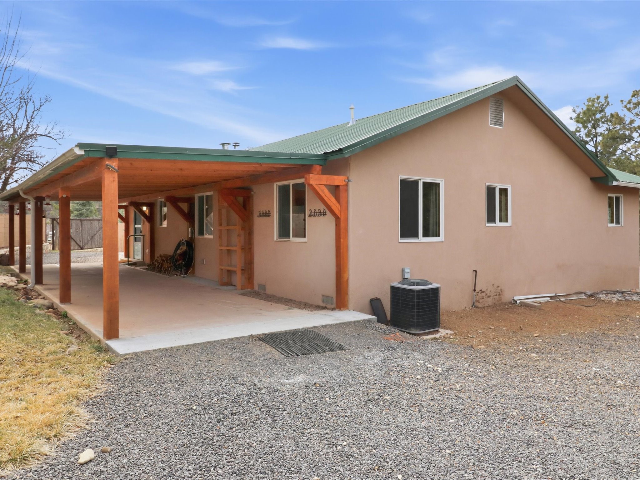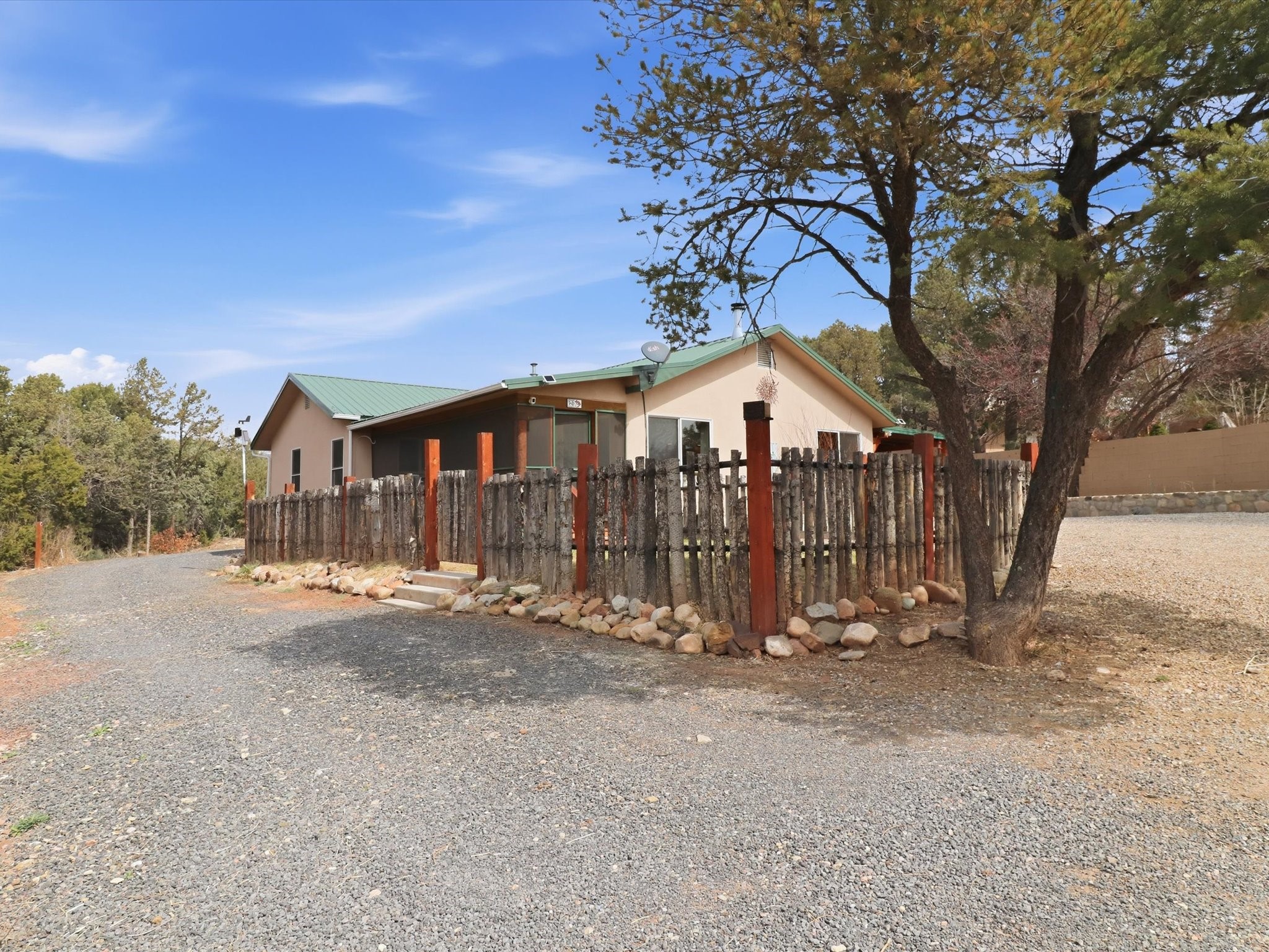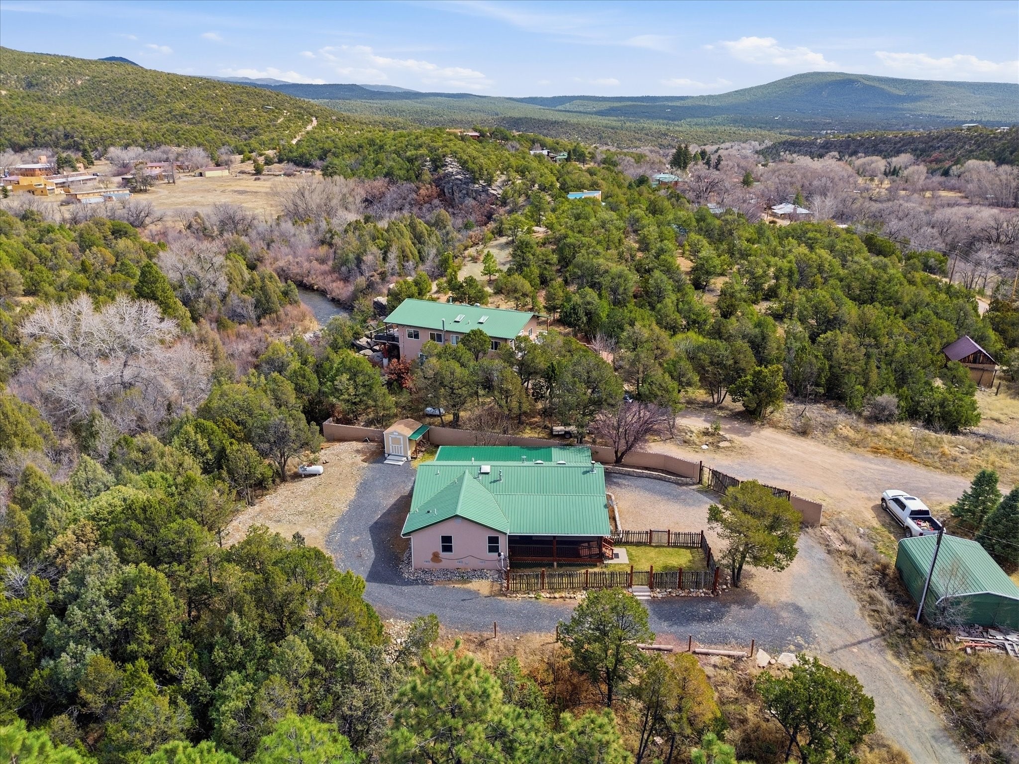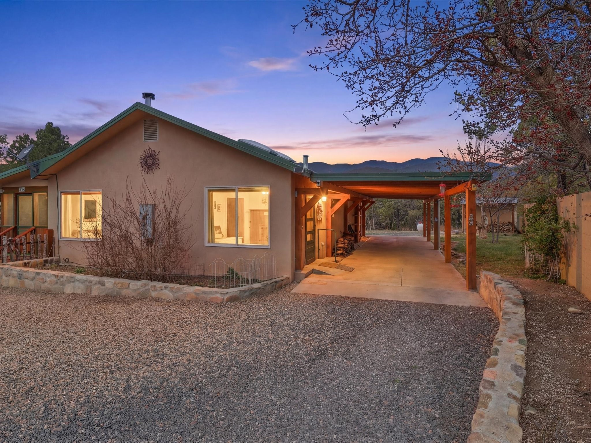 Step into this charming 3-bedroom, 2-bath single-level home, built in 2006, perfectly designed for comfort, style, and ease of living. From the moment you arrive, the spacious facade with a covered portal welcomes you inside.Enjoy the open-concept living area, where the vaulted ceiling, skylights, and abundant windows fill the space with natural light. The living room features a wood stove and flows seamlessly into the kitchen with ample cabinets, island breakfast counter, and all stainless-steel appliances.Step through the living area exit door to the covered patio, which overlooks the side yard, providing a relaxing outdoor space. A short walk leads to the Pecos River, whose soothing sounds can be enjoyed from the home. Additional features include laminate flooring, exterior storage, and a Propanel roof. The primary suite offers a spacious walk-in closet and an ensuite bath with his & her sinks and a glass-enclosed shower. With bright, inviting interiors and all living spaces on one level, this home offers comfort, convenience, and a touch of Santa Fe charm. A must-see at this price and condition!