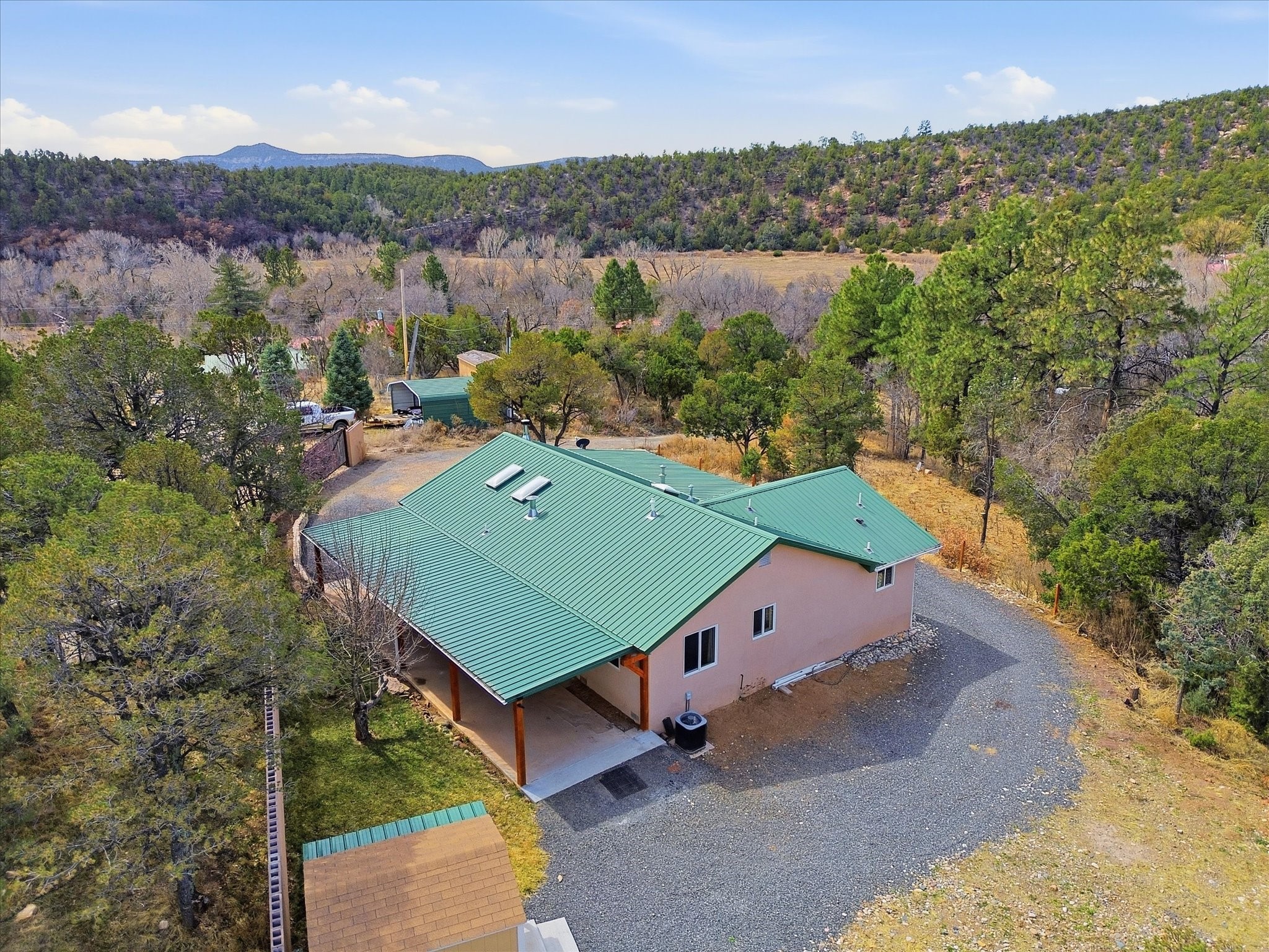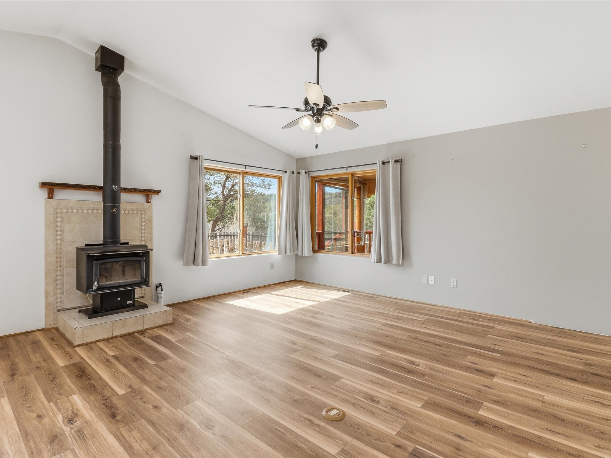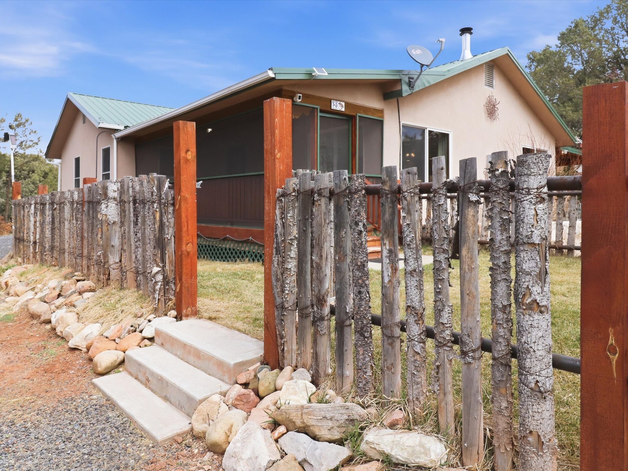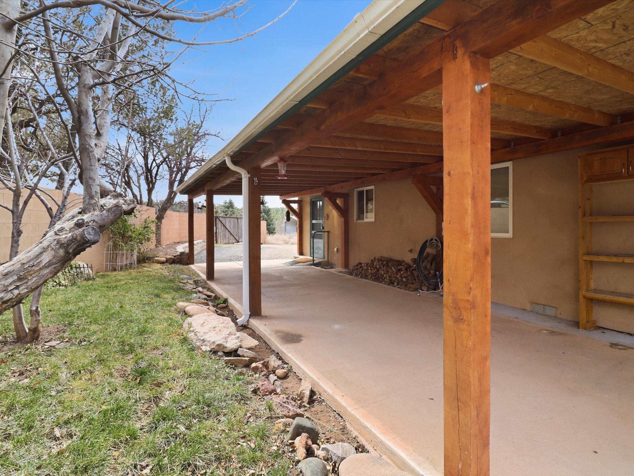 Step into this charming 3-bedroom, 2-bath single-level home, built in 2006, perfectly designed for comfort, style, and ease of living. From the moment you arrive, the spacious facade with a covered portal welcomes you inside.Enjoy the open-concept living area, where the vaulted ceiling, skylights, and abundant windows fill the space with natural light. The living room features a wood stove and flows seamlessly into the kitchen with ample cabinets, island breakfast counter, and all stainless-steel appliances.Step through the living area exit door to the covered patio, which overlooks the side yard, providing a relaxing outdoor space. A short walk leads to the Pecos River, whose soothing sounds can be enjoyed from the home. Additional features include laminate flooring, exterior storage, and a Propanel roof. The primary suite offers a spacious walk-in closet and an ensuite bath with his & her sinks and a glass-enclosed shower. With bright, inviting interiors and all living spaces on one level, this home offers comfort, convenience, and a touch of Santa Fe charm. A must-see at this price and condition!