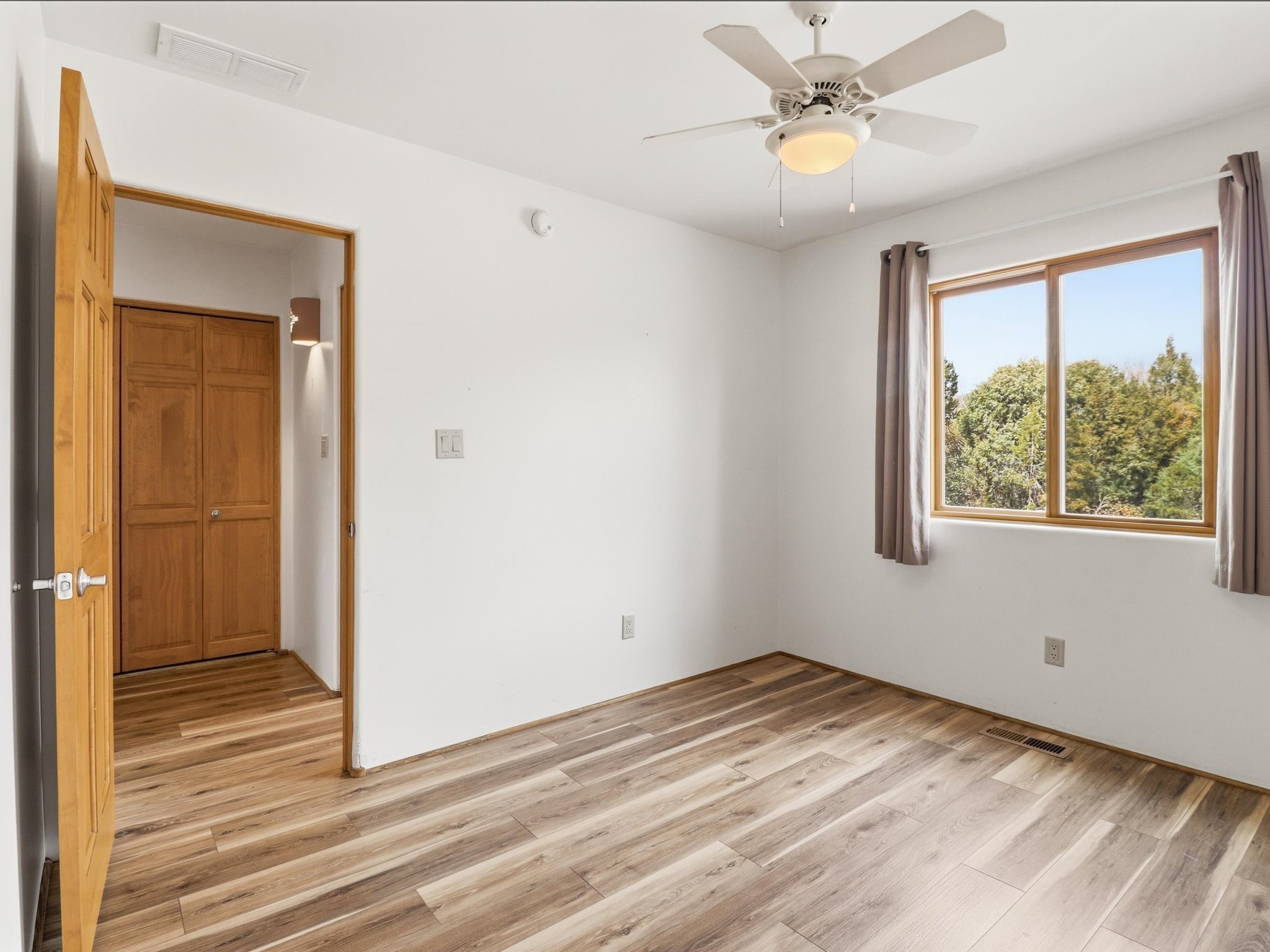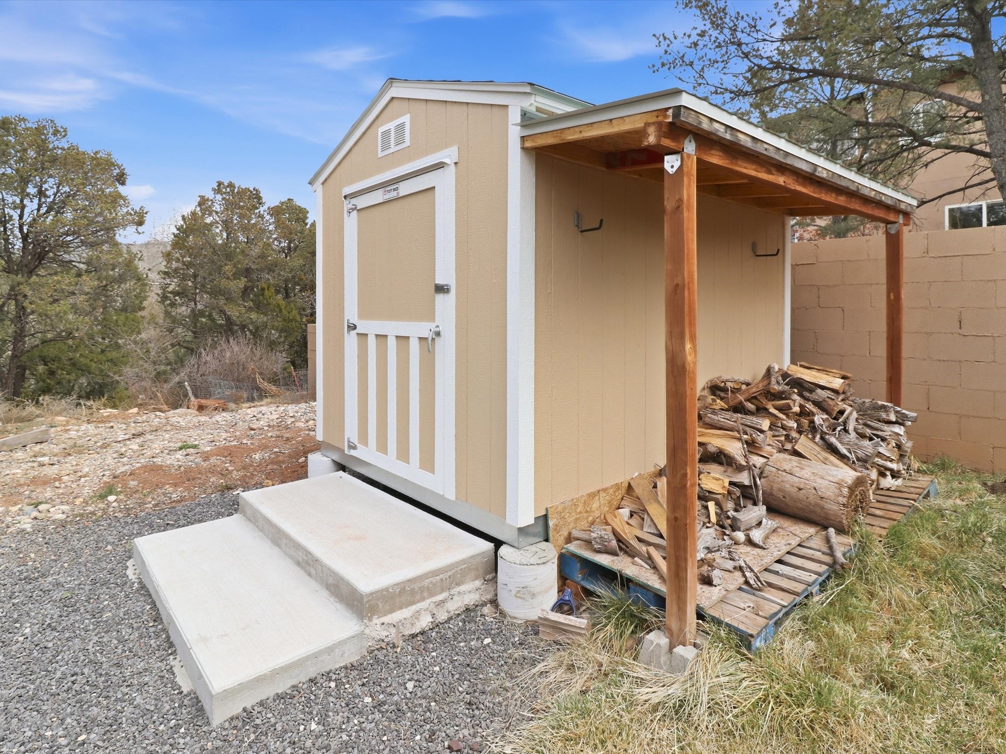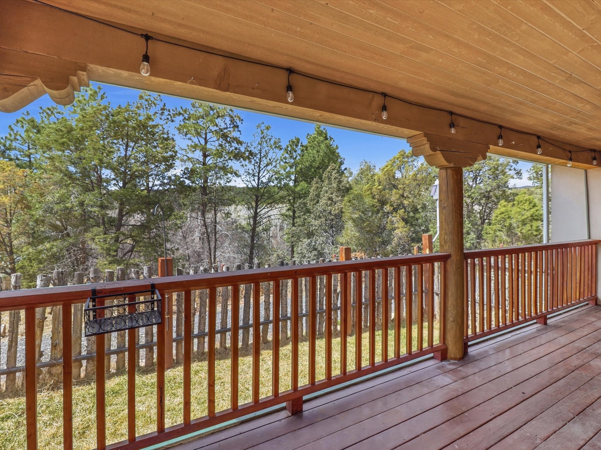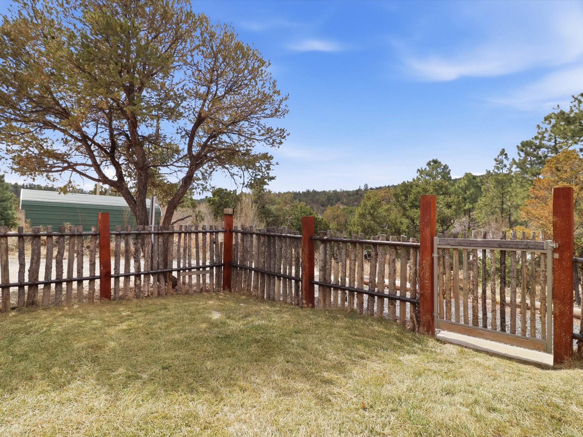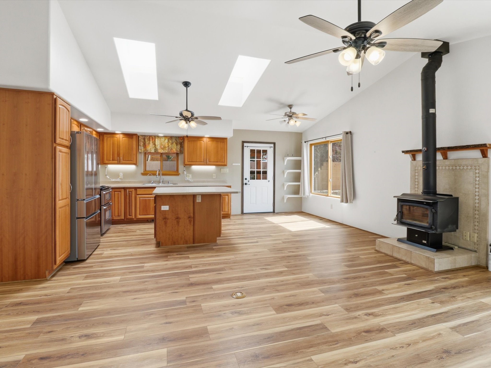 Step into this charming 3-bedroom, 2-bath single-level home, built in 2006, perfectly designed for comfort, style, and ease of living. From the moment you arrive, the spacious facade with a covered portal welcomes you inside.Enjoy the open-concept living area, where the vaulted ceiling, skylights, and abundant windows fill the space with natural light. The living room features a wood stove and flows seamlessly into the kitchen with ample cabinets, island breakfast counter, and all stainless-steel appliances.Step through the living area exit door to the covered patio, which overlooks the side yard, providing a relaxing outdoor space. A short walk leads to the Pecos River, whose soothing sounds can be enjoyed from the home. Additional features include laminate flooring, exterior storage, and a Propanel roof. The primary suite offers a spacious walk-in closet and an ensuite bath with his & her sinks and a glass-enclosed shower. With bright, inviting interiors and all living spaces on one level, this home offers comfort, convenience, and a touch of Santa Fe charm. A must-see at this price and condition!