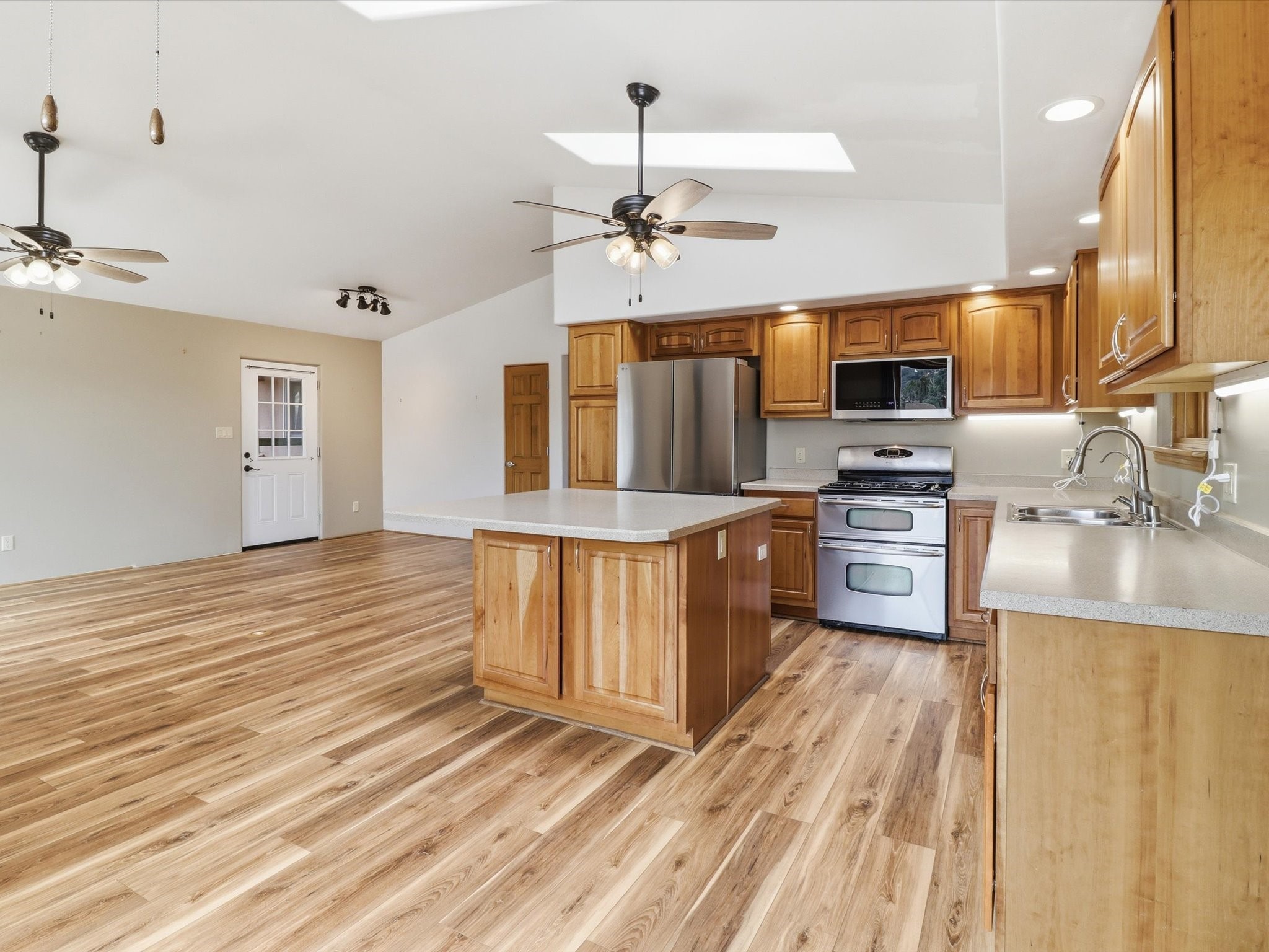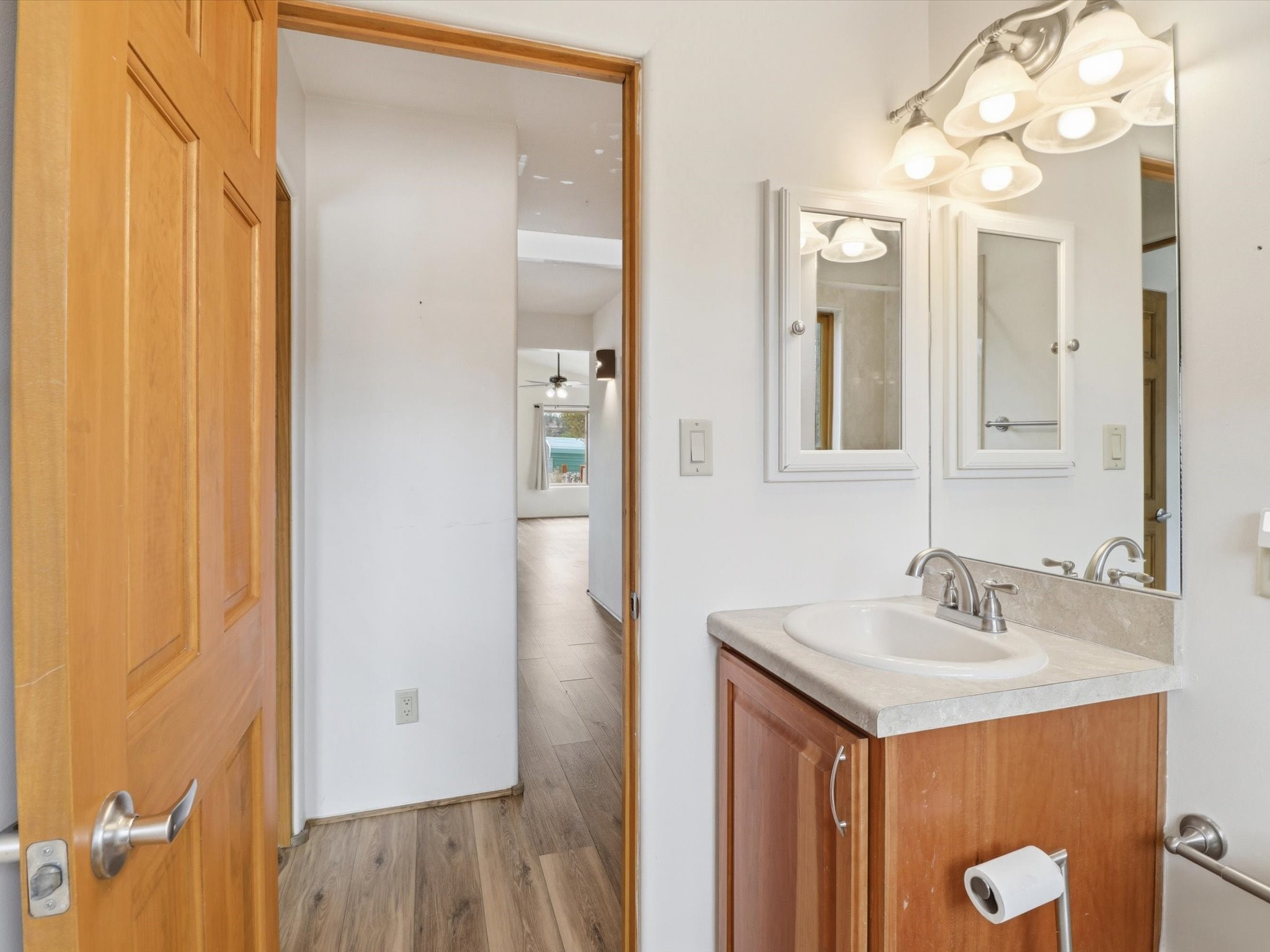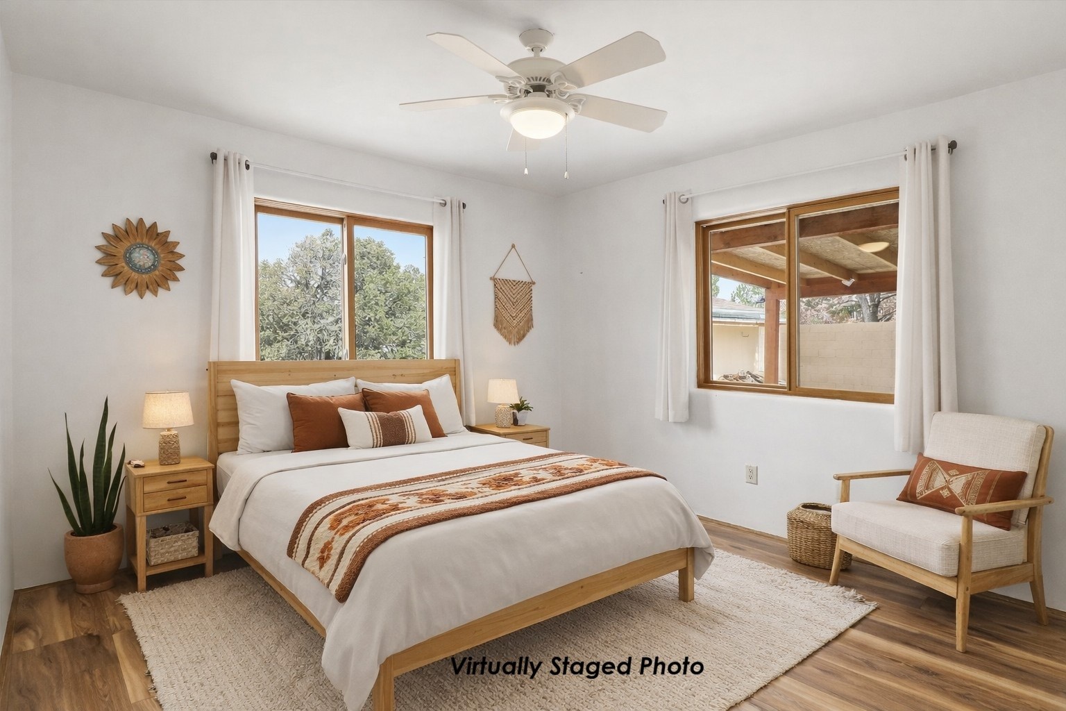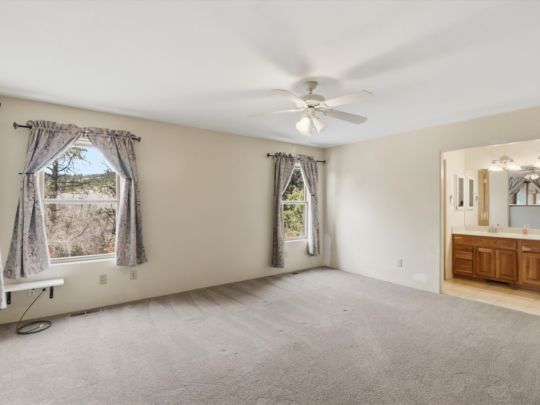 Step into this charming 3-bedroom, 2-bath single-level home, built in 2006, perfectly designed for comfort, style, and ease of living. From the moment you arrive, the spacious facade with a covered portal welcomes you inside.Enjoy the open-concept living area, where the vaulted ceiling, skylights, and abundant windows fill the space with natural light. The living room features a wood stove and flows seamlessly into the kitchen with ample cabinets, island breakfast counter, and all stainless-steel appliances.Step through the living area exit door to the covered patio, which overlooks the side yard, providing a relaxing outdoor space. A short walk leads to the Pecos River, whose soothing sounds can be enjoyed from the home. Additional features include laminate flooring, exterior storage, and a Propanel roof. The primary suite offers a spacious walk-in closet and an ensuite bath with his & her sinks and a glass-enclosed shower. With bright, inviting interiors and all living spaces on one level, this home offers comfort, convenience, and a touch of Santa Fe charm. A must-see at this price and condition!