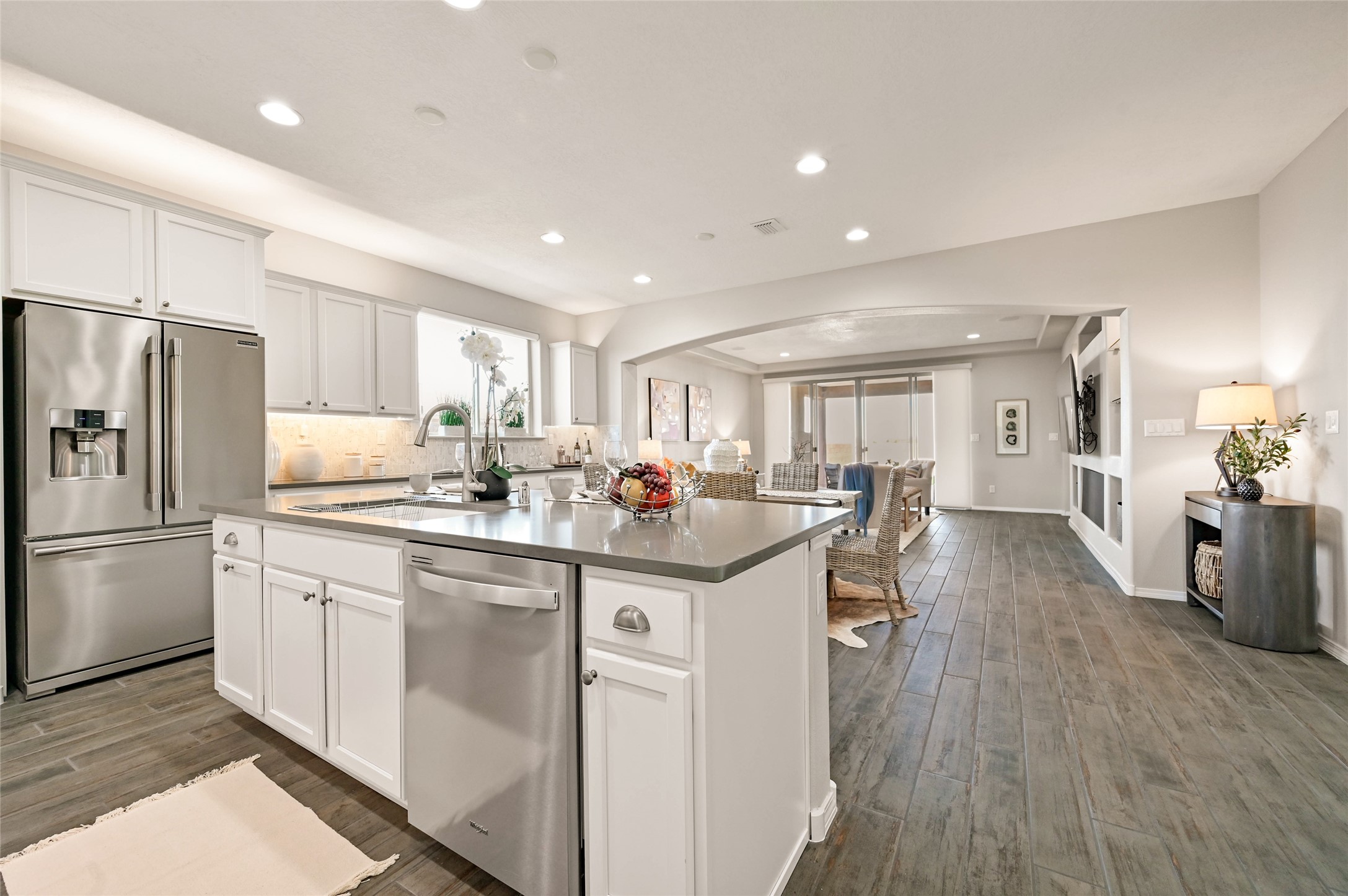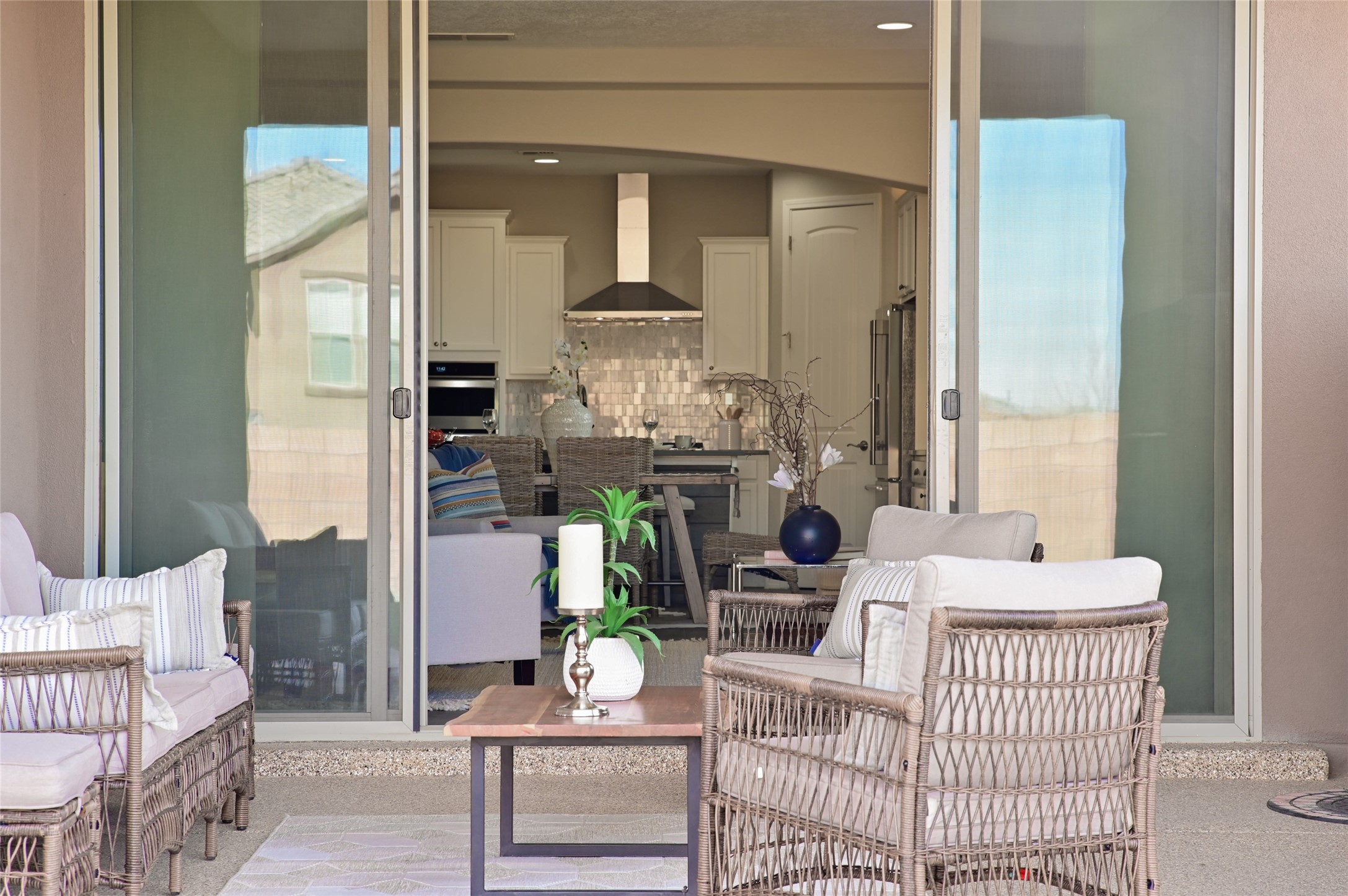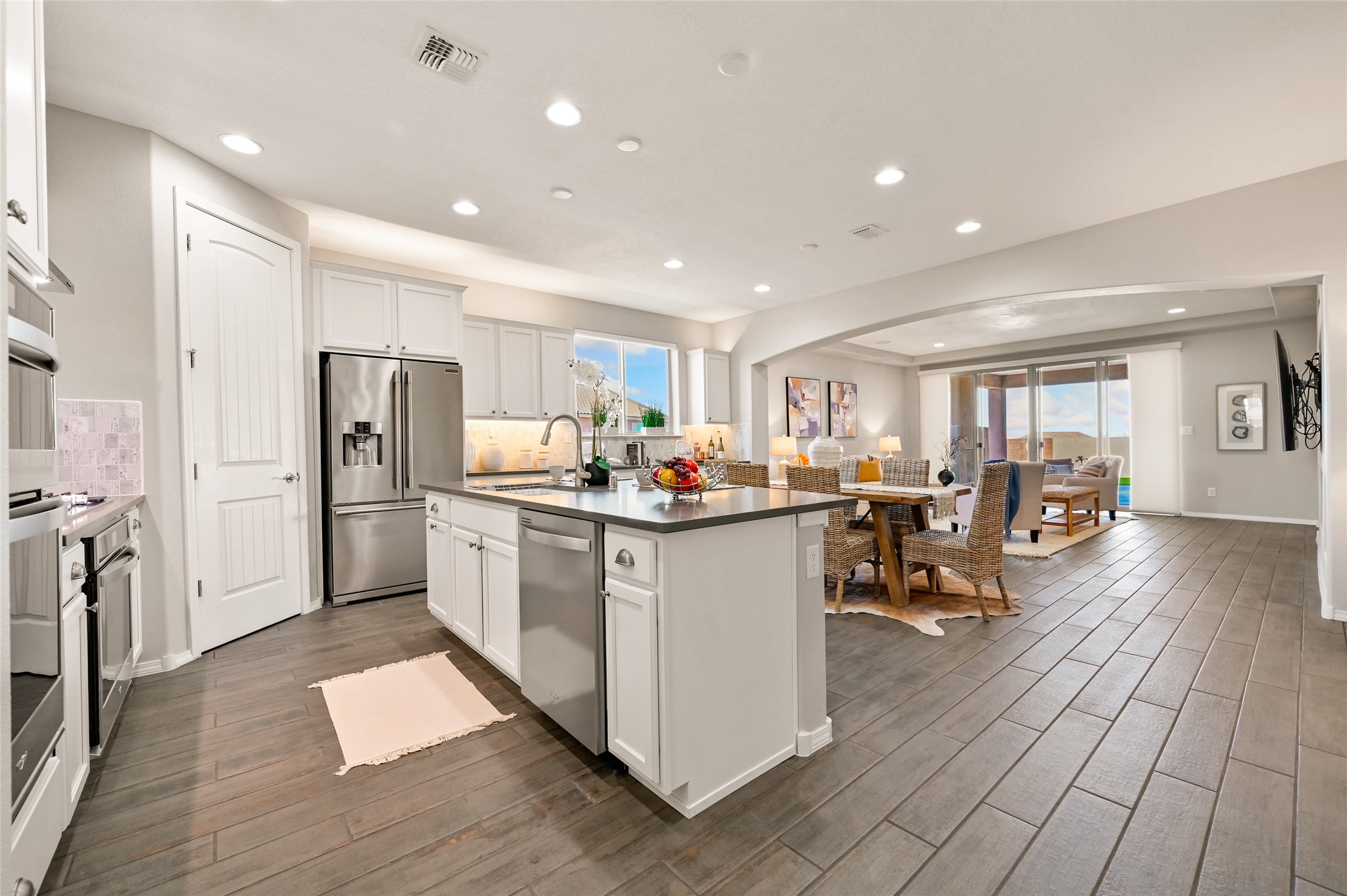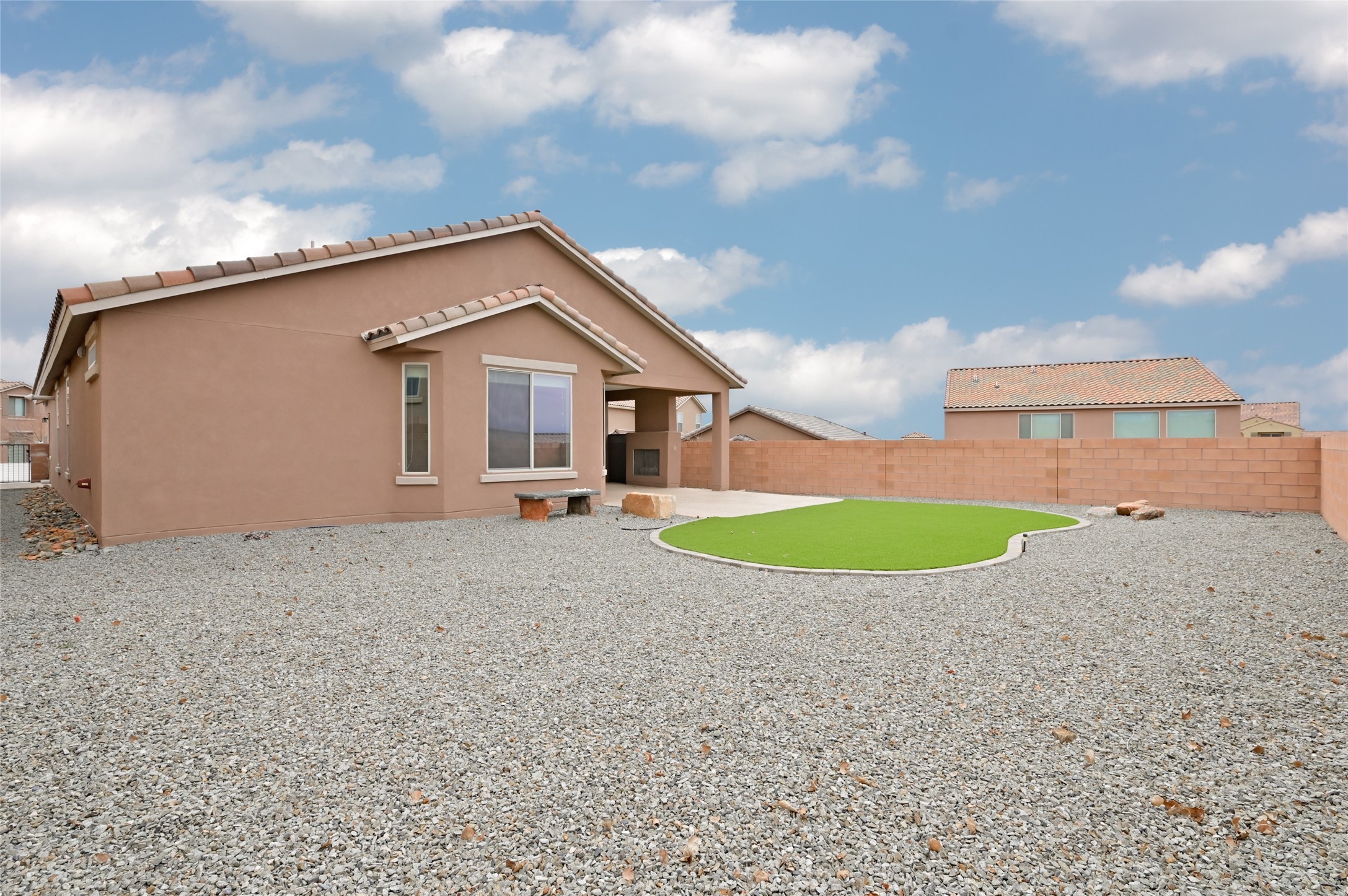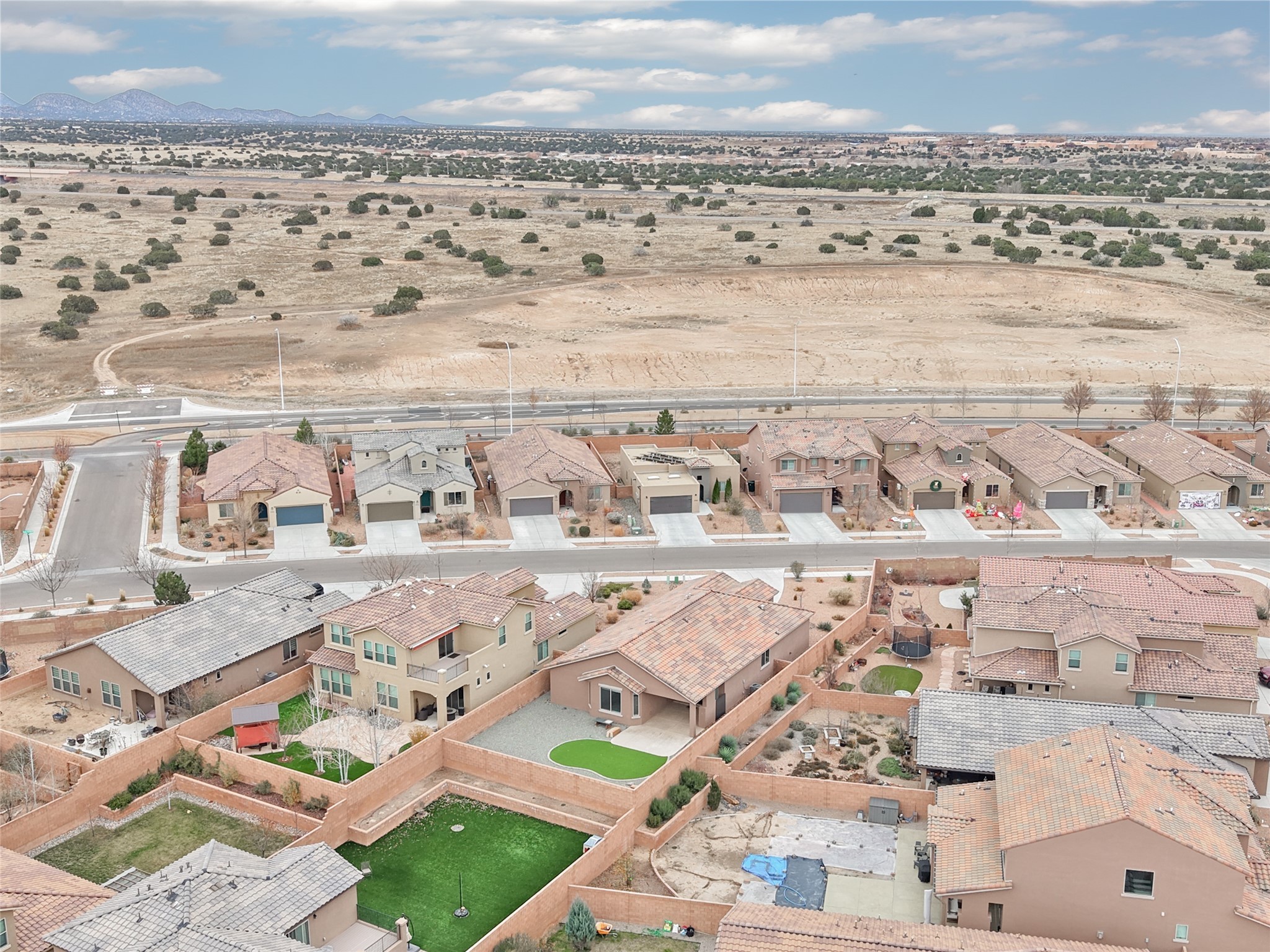 Built by Pulte in 2019, this beautifully maintained single-level 2,184 sq. ft. 3 bedroom/2 bathroom home is sited on a premium 0.20-acre lot, offering both privacy and captivating sunset views. Thoughtfully designed for comfortable living, the open-concept floor plan creates seamless flow between the kitchen, living, and dining areas. An elegant archway defines the living/kitchen/dining areas while framing a view of Santa Fe's expansive skies from the kitchen--a touch that brings both beauty and warmth to everyday living. The kitchen is a true standout, featuring extensive quartz counter space, abundant cabinetry, and stainless steel appliances. At its heart is a generous island with a sink and seating for four, perfect for a social gathering and sunset viewing. The generous primary suite has a large walk-in shower, double vanities and a substantial walk-in closet. The primary suite also has views of the private back yard. The large back portal has a beautiful gas fireplace and the back courtyard comes with green turf that never needs to be mowed! An attached 2-car garage and a mudroom/laundry room with a sink and a side-by-side washer and dryer complete this wonderful home. This beautiful home is newer in age and timeless. The premium lot and views definitely make it a stand out!