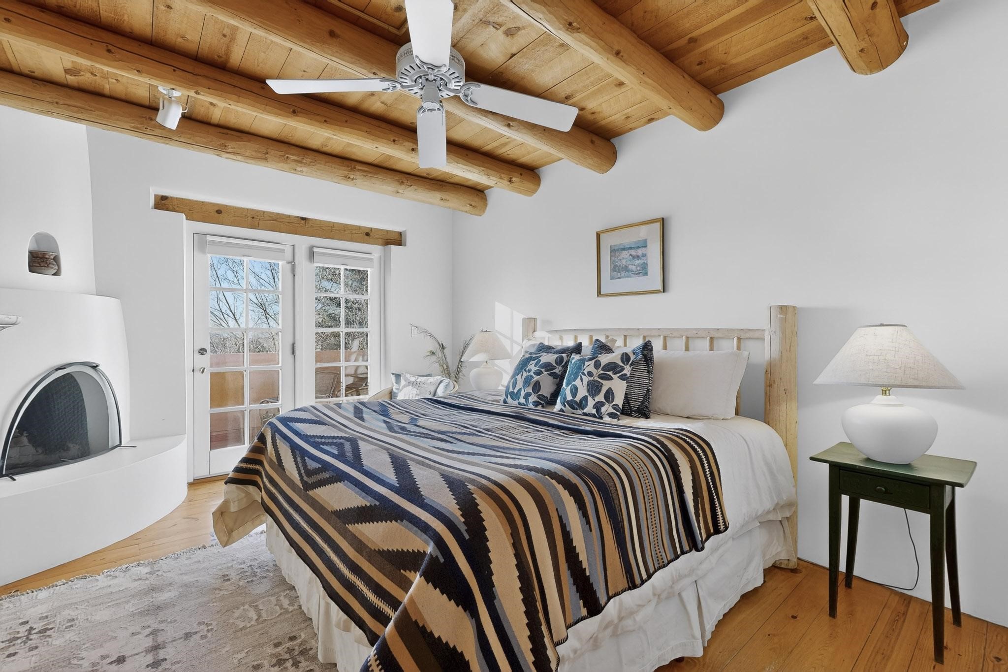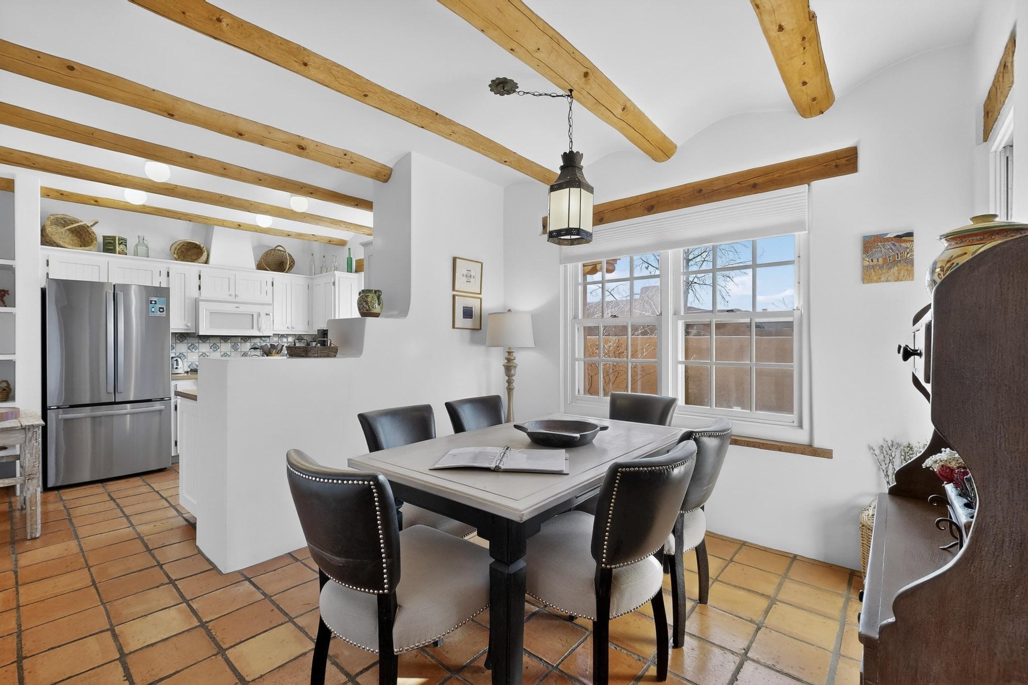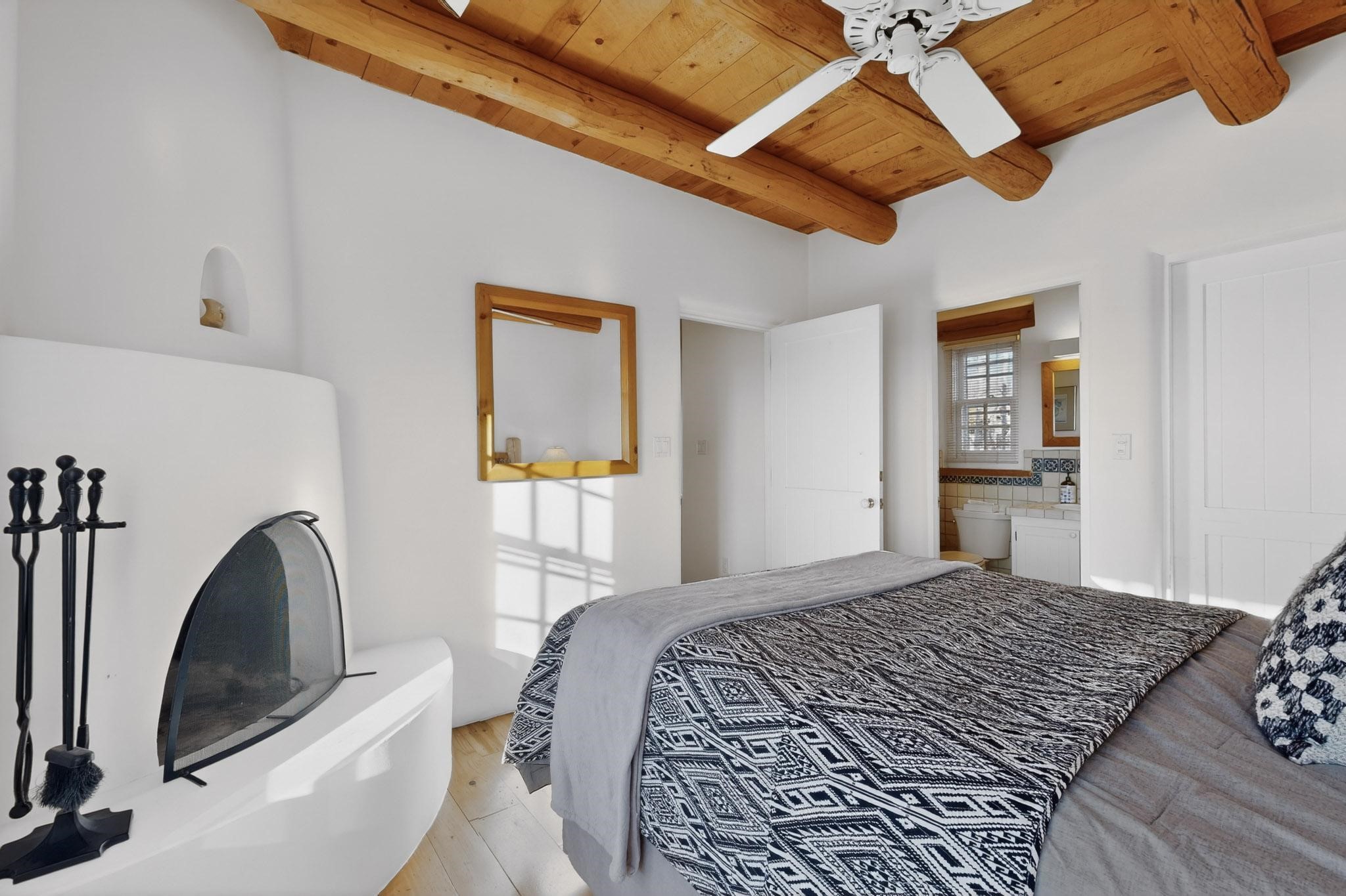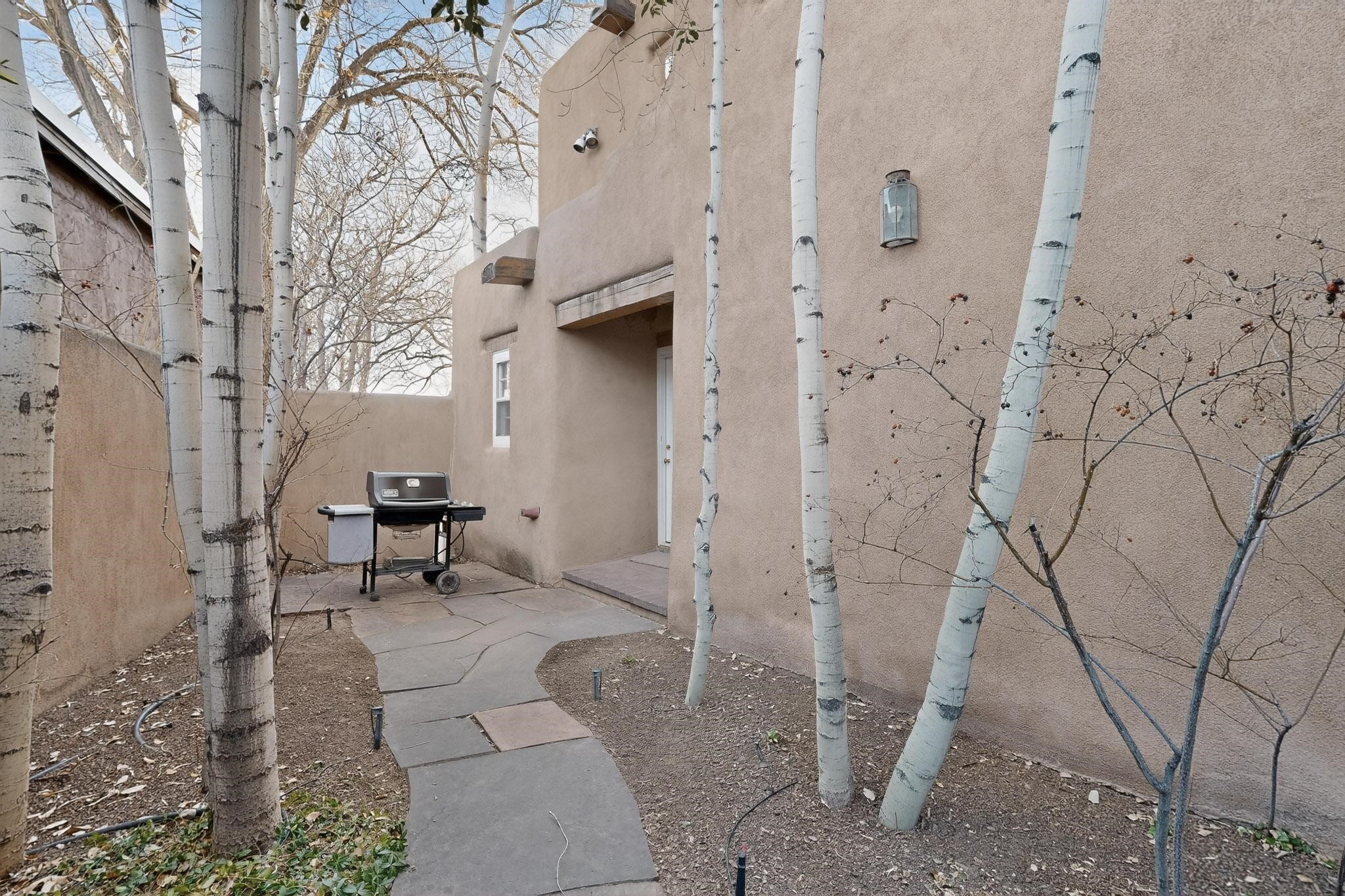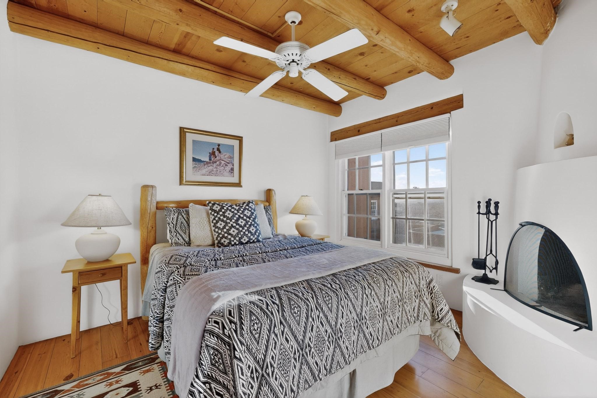 Santa Fe architectural details plus management to tend to every detail inside and out of this quarterownership property. Very nice two story condo, two bedrooms, each with private bath. Especially well situated on the property, this home enjoys sunset and city lights views from the upstairs deck. Walk through a handcrafted gate at the front entry courtyard and into a wel furnished and impeccably maintained home, completely cared for by the condominium owners association staff. Inside are smooth plastered wals, kiva fireplaces in the living room and both bedrooms, ceiling vigas throughout, Saltillo tile and wide plank pine floors, and Talavera tile kitchen and baths. There's a completely enclosed landscaped back yard with gas grill and patio furnishings for outdoor dining and quiet relaxation. The HOA provides dedicated on-site management, all building and equipment maintenance, furnishings, landscaping, cleaning, and an established rental program. Quarter-share interest available in unit 11 of Campanilla Compound.