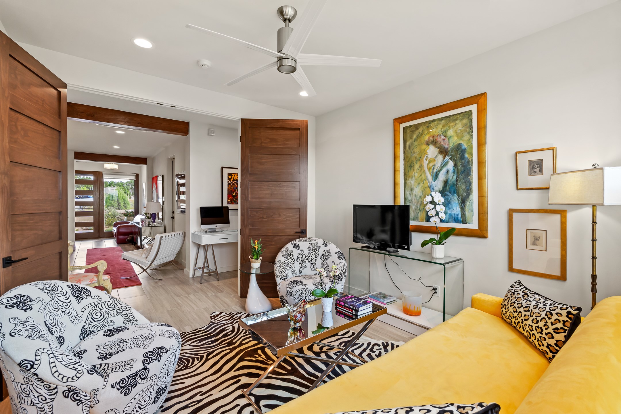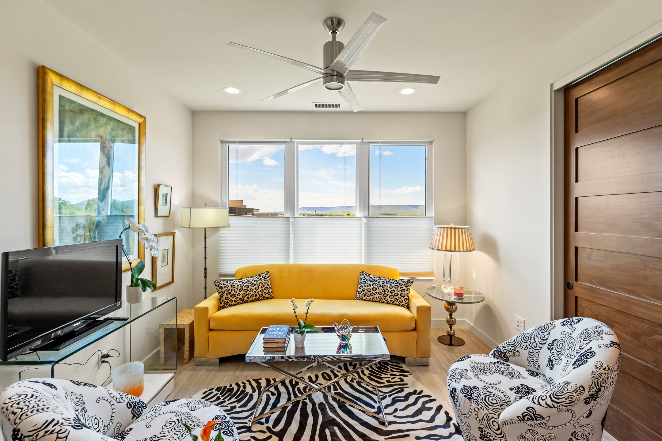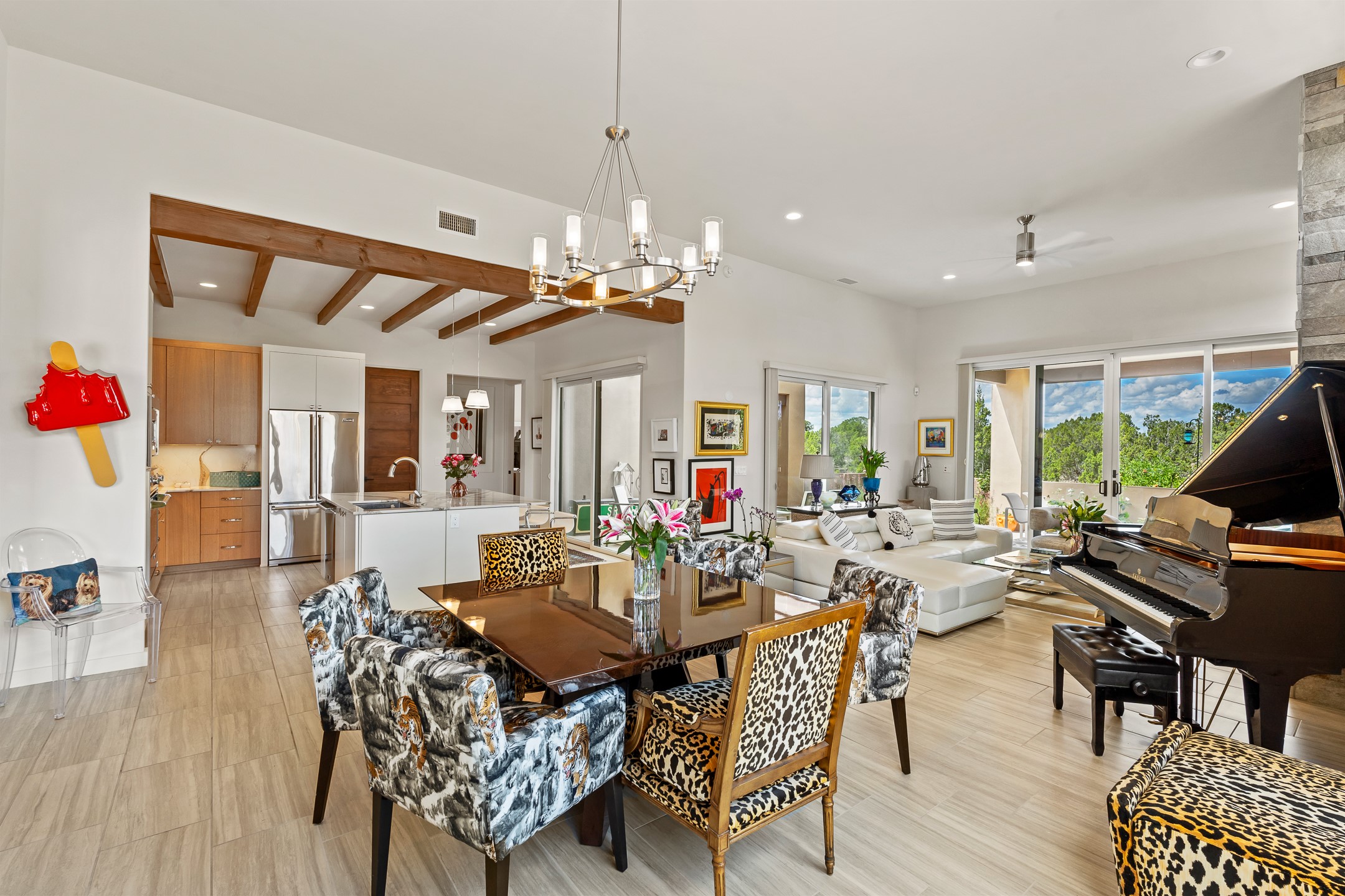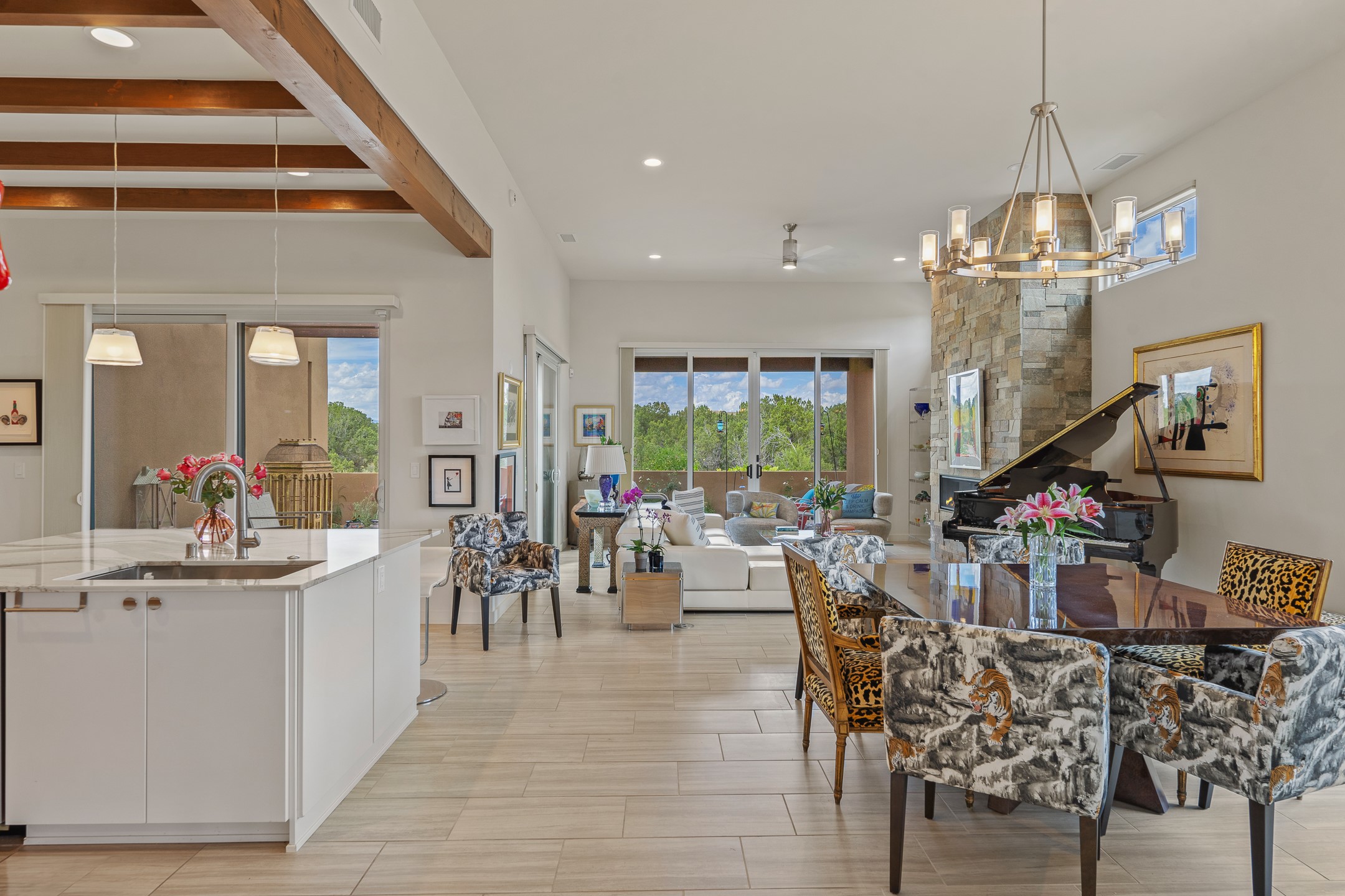 Discover the perfect blend of modern luxury and Southwest charm in this newer home built in 2022 and located in Las Campanas, a premier gated community located just 8 miles from town. Designed in a striking contemporary Pueblo style, the home boasts an open-concept floor plan that seamlessly connects indoor and outdoor spaces, all while framing the mountain views and famous sunsets of Santa. Enjoy multiple professionally landscaped outdoor living areas, thoughtfully designed with water features for relaxation and ambiance. Whether it's morning coffee, dining al fresco, entertaining or unwinding, this home offers serene outdoor retreats in every direction. Inside, the layout is open and light-filled, with high-end finishes and thoughtful details throughout. The spacious primary suite is a true sanctuary, featuring a generous seating area, a luxurious spa-like bath with a soaking tub, walk-in shower, dual vanities, and an expansive closet complete with built-in organizers. Eco-conscious amenities include solar panels and two electric vehicle charging hookups, offering both sustainability and convenience. The home also includes natural gas, central heating, and air conditioning to ensure year-round comfort. Perfect for full-time living or as a lock-and-leave second home, this property offers the ideal combination of style, efficiency, and tranquility. HOA fees cover road and common area maintenance, 24-hour roaming security, and on-site emergency medical technicians. Membership to The Club at Las Campanas is optional, offering amenities such as indoor and outdoor swimming pools, tennis courts, a fitness center, equestrian facilities, fine dining options, and two Jack Nicklaus Signature Golf Courses.
