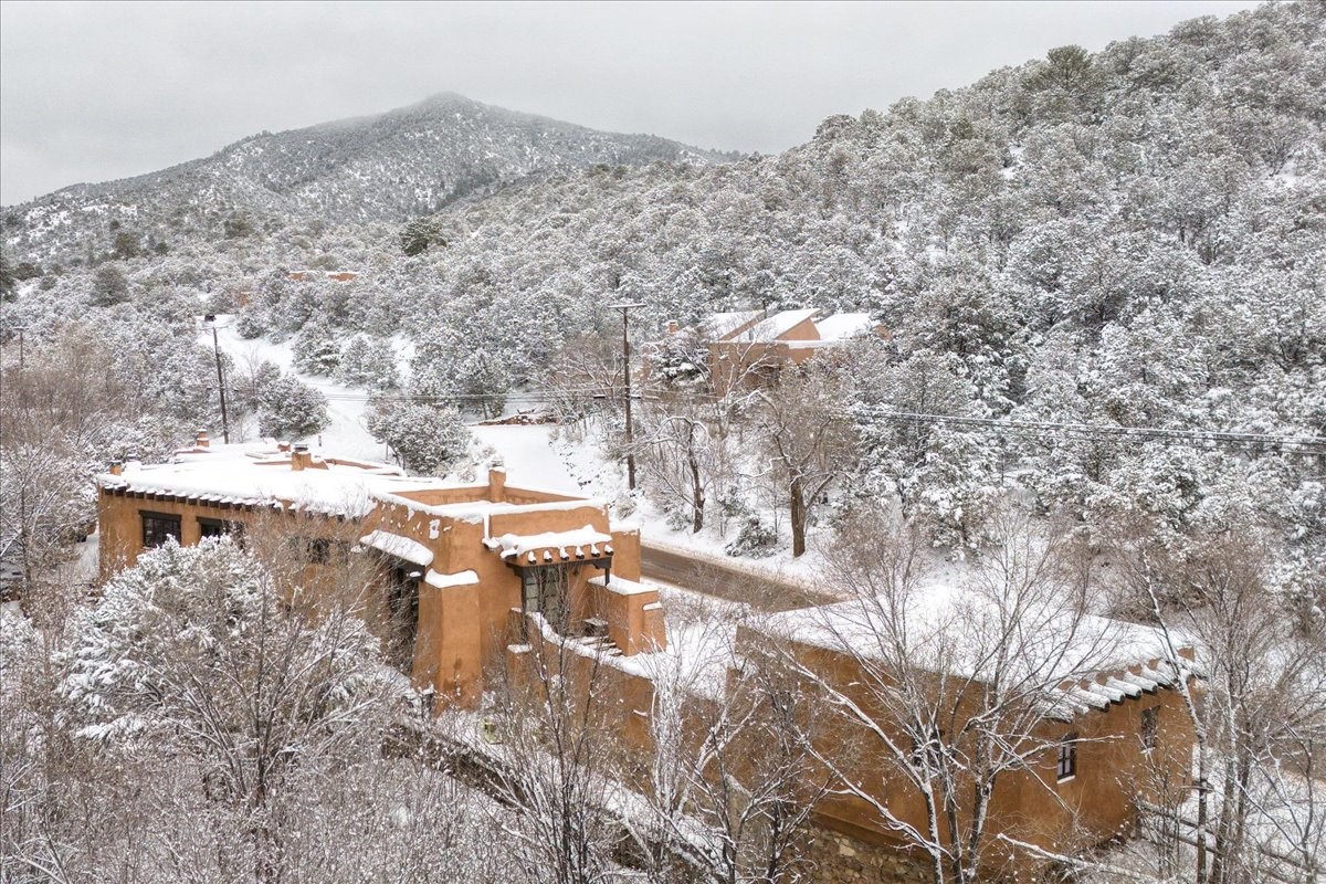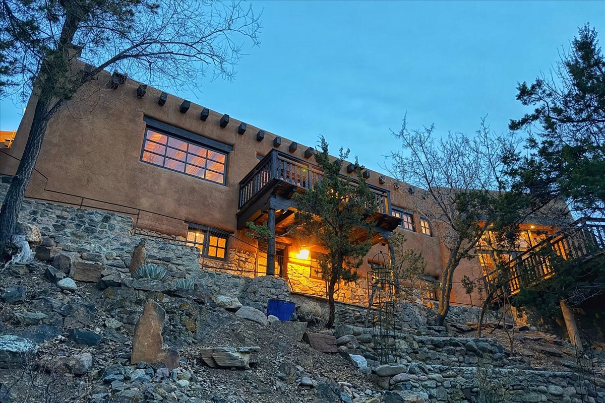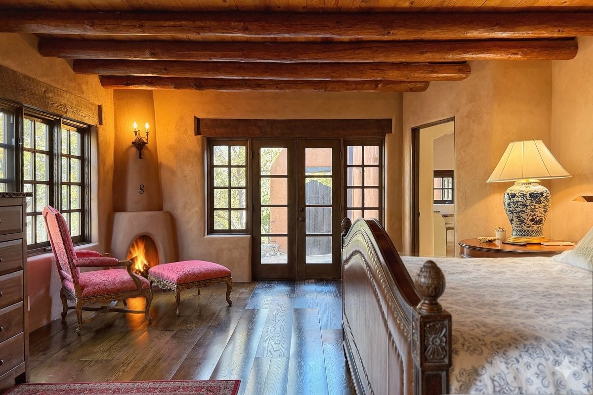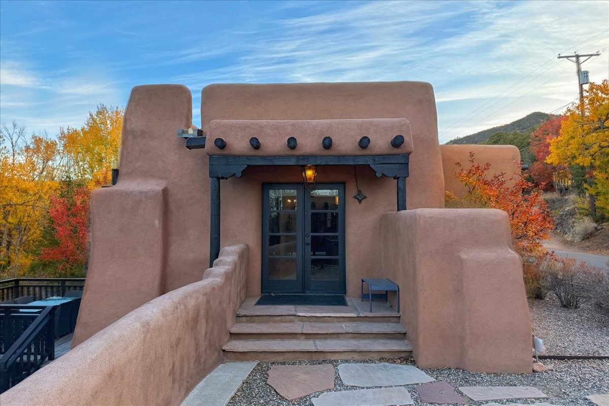 Discover Las Crucitas, a fully restored 1950s Santa Fe adobe blending timeless Southwestern charm with modern luxury, ideally located on coveted Upper Canyon Road in the Historic East Side. This remarkable property offers four bedrooms and four bathrooms (two full, one three-quarter, and one half) within 4,258 square feet of refined living space. A 492-square-foot attached casita, detached two-car garage, and over 200 linear feet of Santa Fe River frontage creates a rare and private setting. The upper level features a beautifully appointed chef's kitchen with top-of-the-line appliances, custom hood, two dishwashers, quartz countertops, custom Ernest Thompson cabinetry, and travertine floors. A spacious great room showcases classic Santa Fe details including columns, vigas with corbels, latillas, and wide-plank oak floors, American clay and plaster walls. Three sets of French doors open to a serene interior courtyard, while an additional set leads to a balcony ideal for sunset views. Also on the upper level are a guest suite with a three-quarter bath and an elegant owner's suite featuring two corner kiva wood-burning fireplaces, a luxurious en-suite full bath with mosaic tile shower and travertine floors, a walk-in closet with custom built-ins, and French doors opening to the outdoor area. The lower level offers a media area with custom Ernest Thompson cabinetry, a study nook, an additional guest bedroom with exposed rock walls, a powder room, and a three-quarter bath. The attached casita includes a wood-burning kiva fireplace, kitchenette, and full bath ideal for guests. Outdoor spaces include a back deck, a floating terrace with sunset views, and a flagstone path with direct river access. Additional features include in-floor radiant heat, a new boiler, a rock garden, and a dog run with room to expand. Las Crucitas is a rare opportunity to own a property that seldom changes hands--just minutes from Canyon Road's galleries and restaurants and the Santa Fe Plaza.