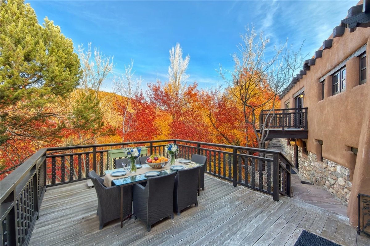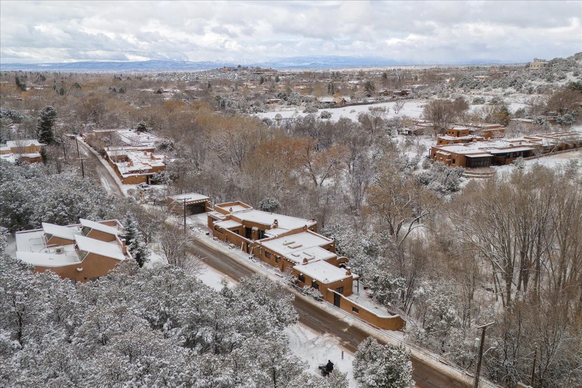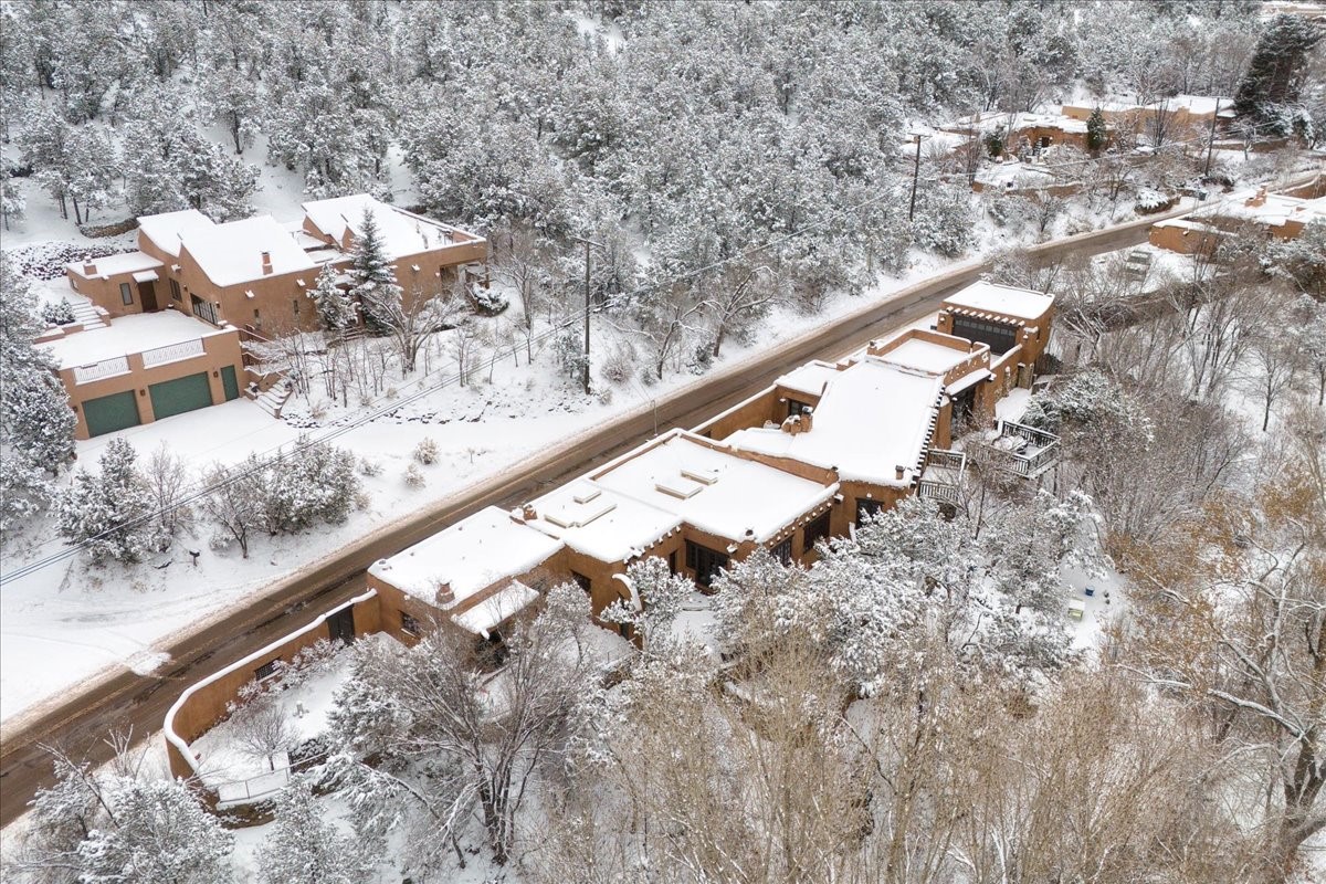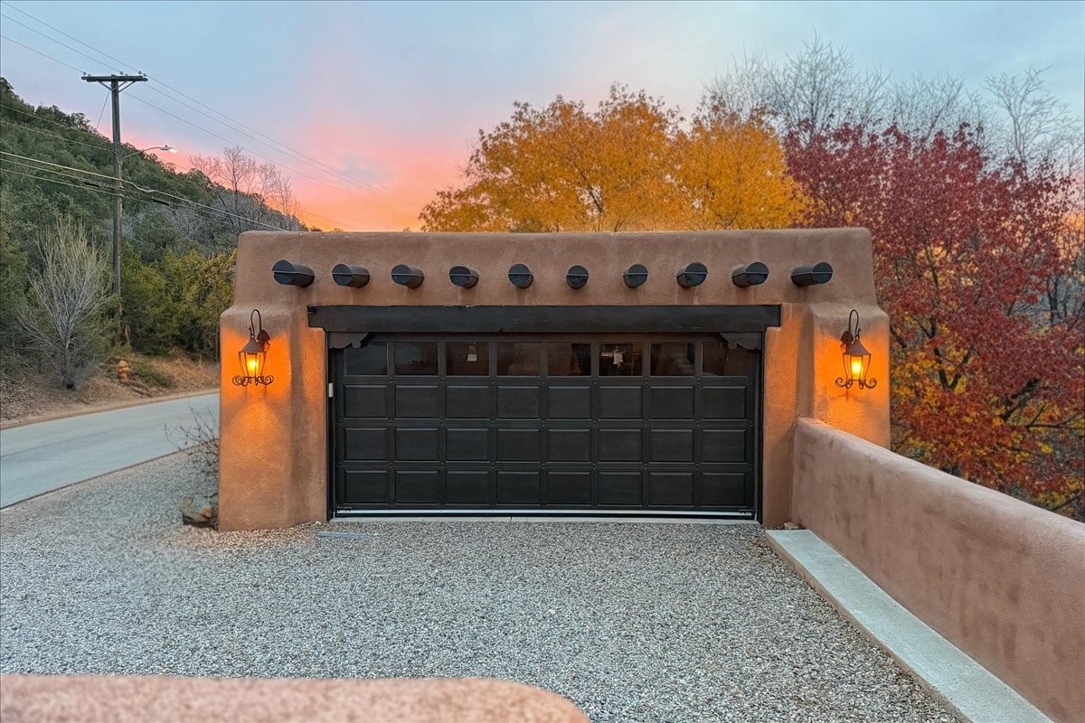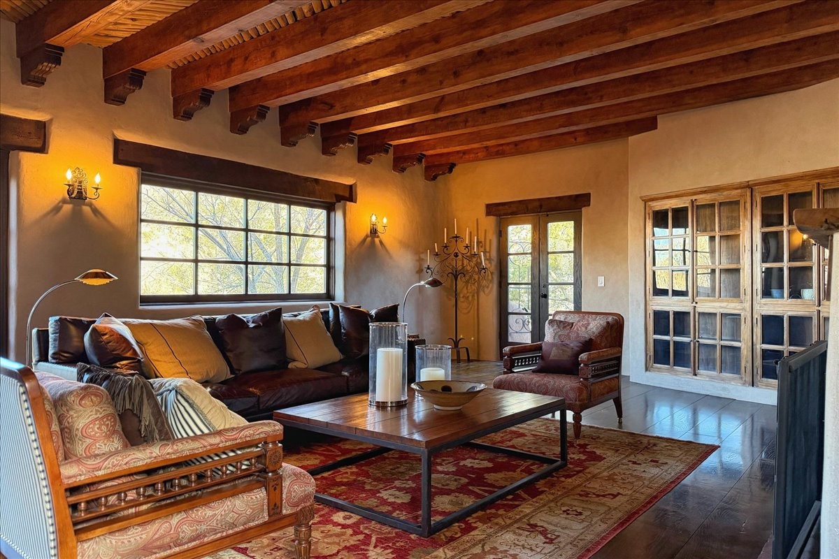 Discover Las Crucitas, a fully restored 1950s Santa Fe adobe blending timeless Southwestern charm with modern luxury, ideally located on coveted Upper Canyon Road in the Historic East Side. This remarkable property offers four bedrooms and four bathrooms (two full, one three-quarter, and one half) within 4,258 square feet of refined living space. A 492-square-foot attached casita, detached two-car garage, and over 200 linear feet of Santa Fe River frontage creates a rare and private setting. The upper level features a beautifully appointed chef's kitchen with top-of-the-line appliances, custom hood, two dishwashers, quartz countertops, custom Ernest Thompson cabinetry, and travertine floors. A spacious great room showcases classic Santa Fe details including columns, vigas with corbels, latillas, and wide-plank oak floors, American clay and plaster walls. Three sets of French doors open to a serene interior courtyard, while an additional set leads to a balcony ideal for sunset views. Also on the upper level are a guest suite with a three-quarter bath and an elegant owner's suite featuring two corner kiva wood-burning fireplaces, a luxurious en-suite full bath with mosaic tile shower and travertine floors, a walk-in closet with custom built-ins, and French doors opening to the outdoor area. The lower level offers a media area with custom Ernest Thompson cabinetry, a study nook, an additional guest bedroom with exposed rock walls, a powder room, and a three-quarter bath. The attached casita includes a wood-burning kiva fireplace, kitchenette, and full bath ideal for guests. Outdoor spaces include a back deck, a floating terrace with sunset views, and a flagstone path with direct river access. Additional features include in-floor radiant heat, a new boiler, a rock garden, and a dog run with room to expand. Las Crucitas is a rare opportunity to own a property that seldom changes hands--just minutes from Canyon Road's galleries and restaurants and the Santa Fe Plaza.