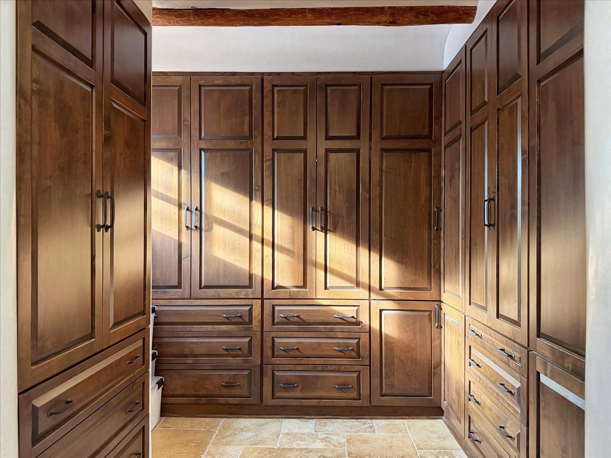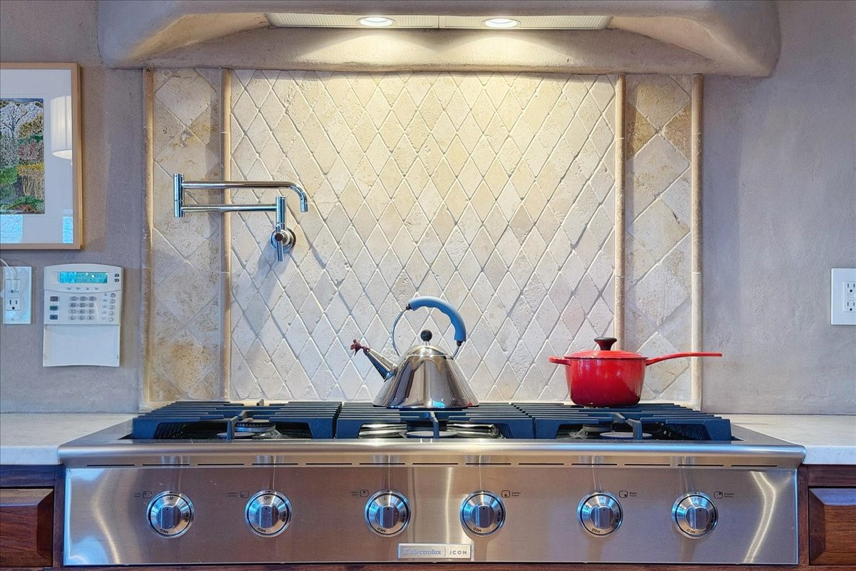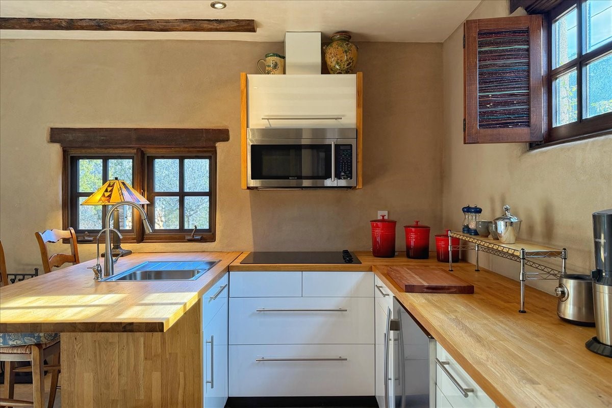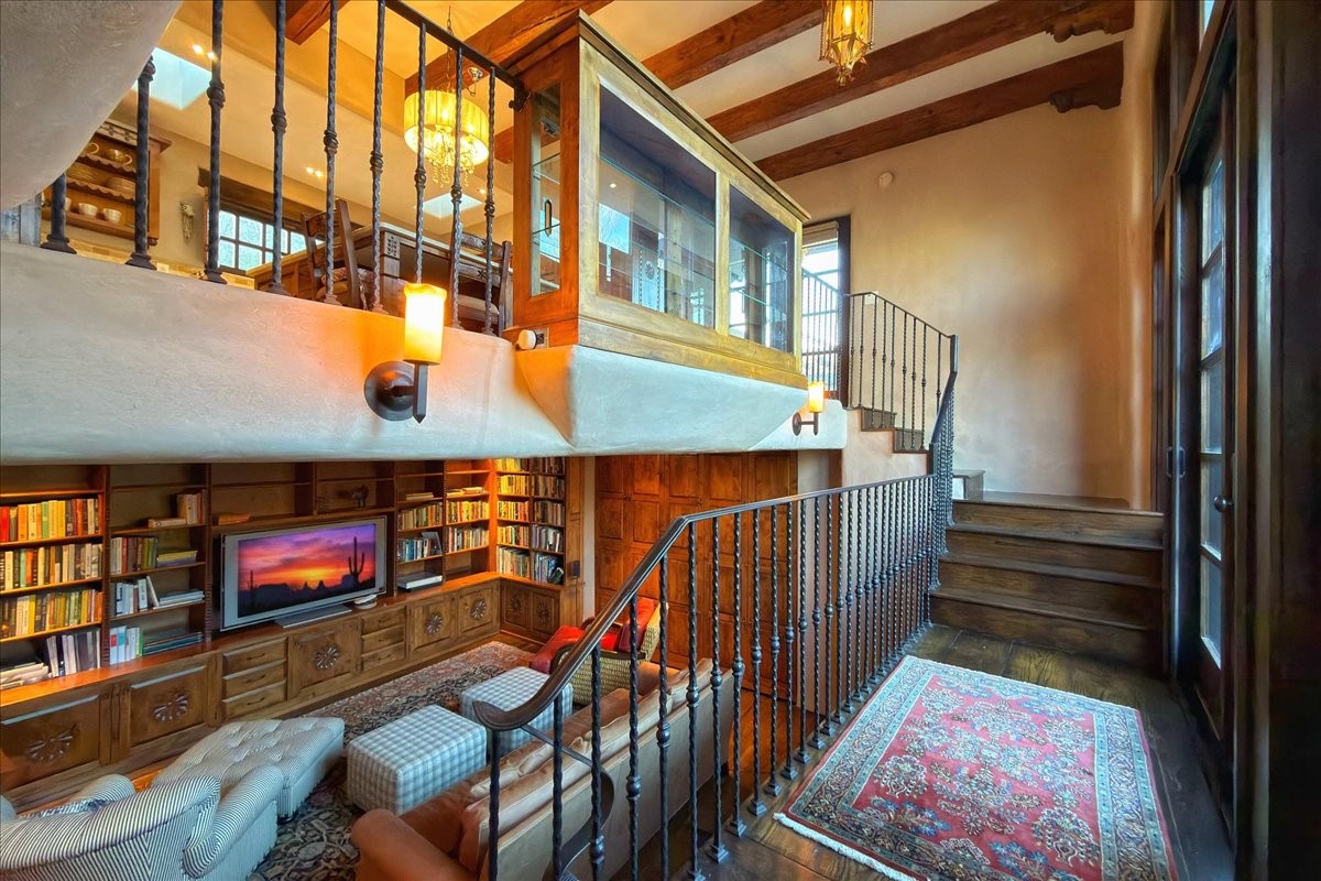 Discover Las Crucitas, a fully restored 1950s Santa Fe adobe blending timeless Southwestern charm with modern luxury, ideally located on coveted Upper Canyon Road in the Historic East Side. This remarkable property offers four bedrooms and four bathrooms (two full, one three-quarter, and one half) within 4,258 square feet of refined living space. A 492-square-foot attached casita, detached two-car garage, and over 200 linear feet of Santa Fe River frontage creates a rare and private setting. The upper level features a beautifully appointed chef's kitchen with top-of-the-line appliances, custom hood, two dishwashers, quartz countertops, custom Ernest Thompson cabinetry, and travertine floors. A spacious great room showcases classic Santa Fe details including columns, vigas with corbels, latillas, and wide-plank oak floors, American clay and plaster walls. Three sets of French doors open to a serene interior courtyard, while an additional set leads to a balcony ideal for sunset views. Also on the upper level are a guest suite with a three-quarter bath and an elegant owner's suite featuring two corner kiva wood-burning fireplaces, a luxurious en-suite full bath with mosaic tile shower and travertine floors, a walk-in closet with custom built-ins, and French doors opening to the outdoor area. The lower level offers a media area with custom Ernest Thompson cabinetry, a study nook, an additional guest bedroom with exposed rock walls, a powder room, and a three-quarter bath. The attached casita includes a wood-burning kiva fireplace, kitchenette, and full bath ideal for guests. Outdoor spaces include a back deck, a floating terrace with sunset views, and a flagstone path with direct river access. Additional features include in-floor radiant heat, a new boiler, a rock garden, and a dog run with room to expand. Las Crucitas is a rare opportunity to own a property that seldom changes hands--just minutes from Canyon Road's galleries and restaurants and the Santa Fe Plaza.