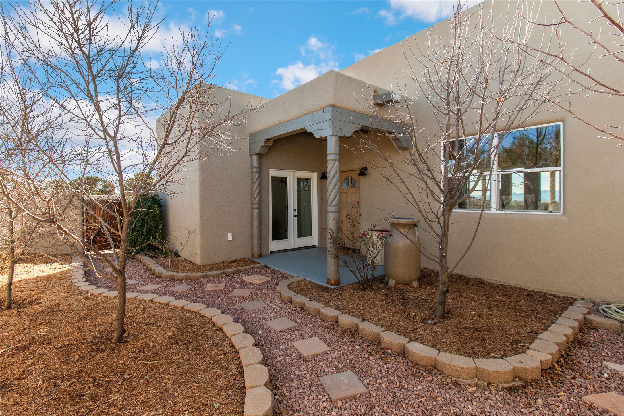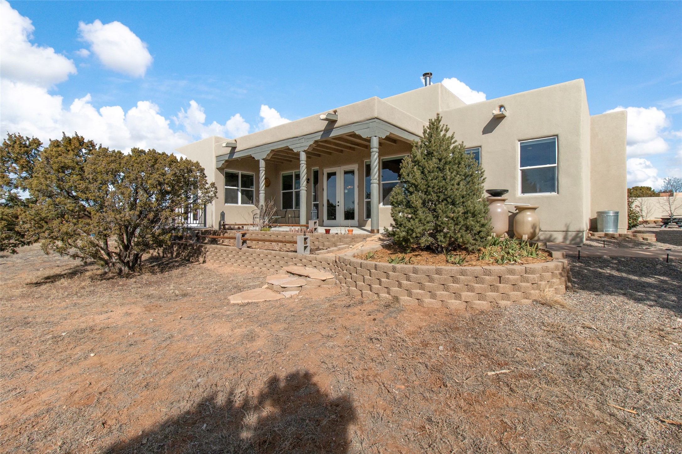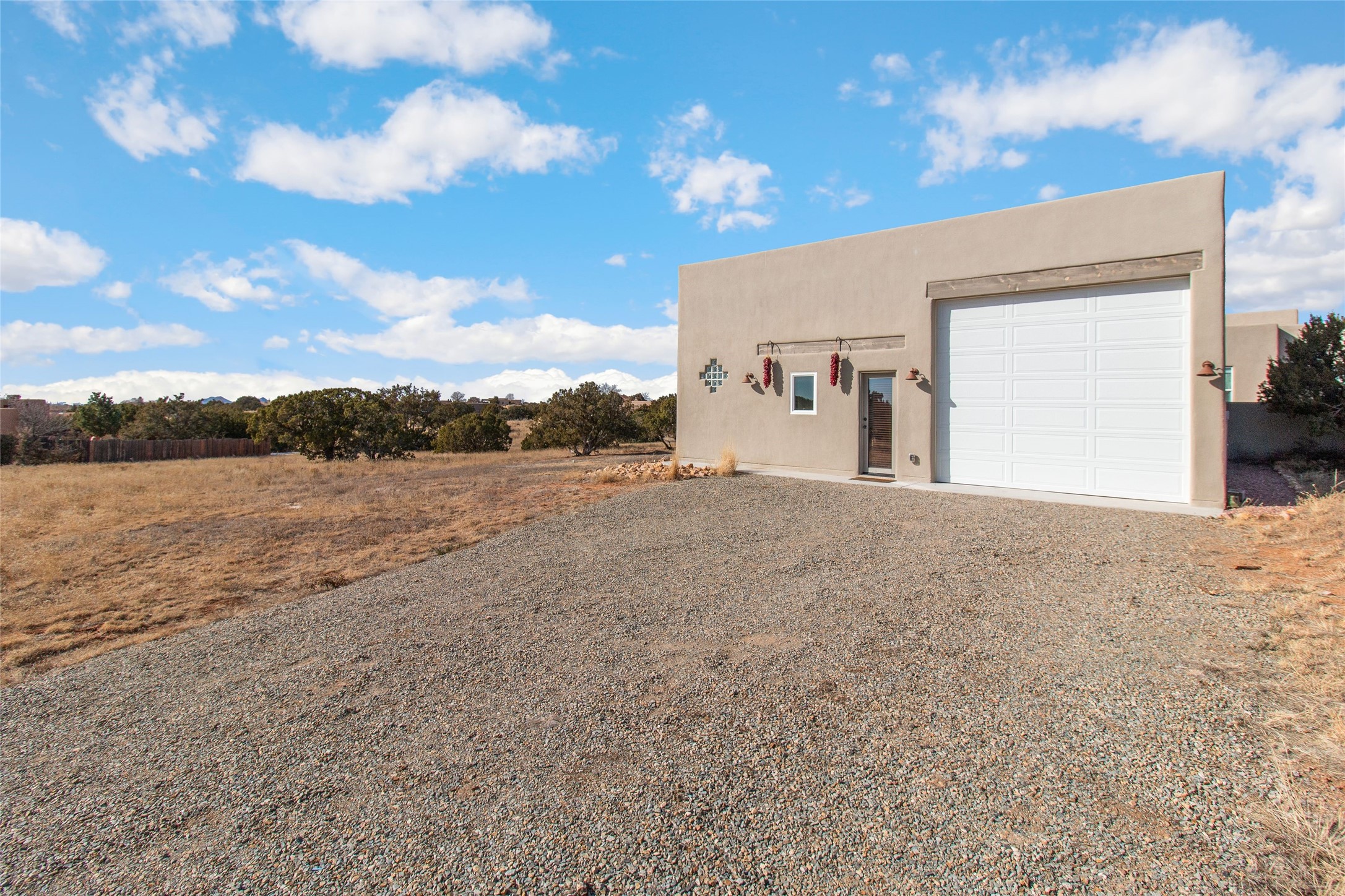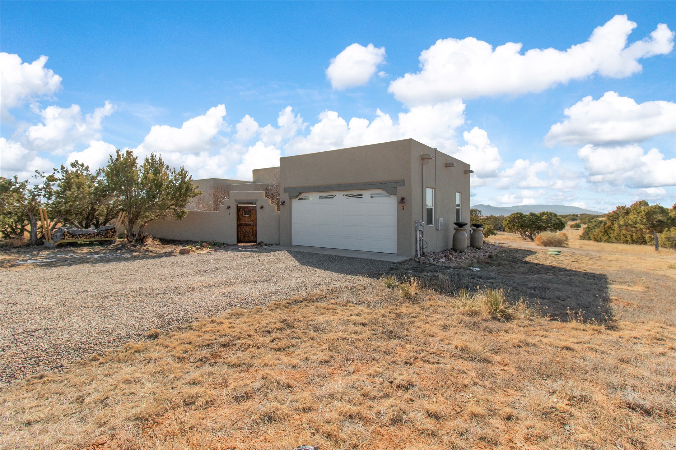 Pride of ownership is apparent the minute you walk into this 2019 contemporary build in Eldorado. Upon entry into the front court yard, you are greeted by apple, peach and cherry trees. The main house offers 3 bedrooms, 2 baths and open living concept with a split bedroom configuration for owner and guest privacy. Stunning views from the living room and back portal await you on this 1.4 acres. This home was built for energy efficiency as a priority with a HERS rating of 70. A solar panel system attached to the grid was added to the home in 2024 for ultra low electric bills. A Hearthstone Green Mountain convection wood stove takes the chill off those really cold winter evenings. An annually serviced tankless water heater ensures you never run out of hot water. Central cooling and heating. A detached one bedroom casita with a 3/4 quarters bathroom is perfect for guests or an in-law suite, plus an adjacent RV garage. For all the amenities available to homeowners in Eldorado, check out www.eldoradosf.org