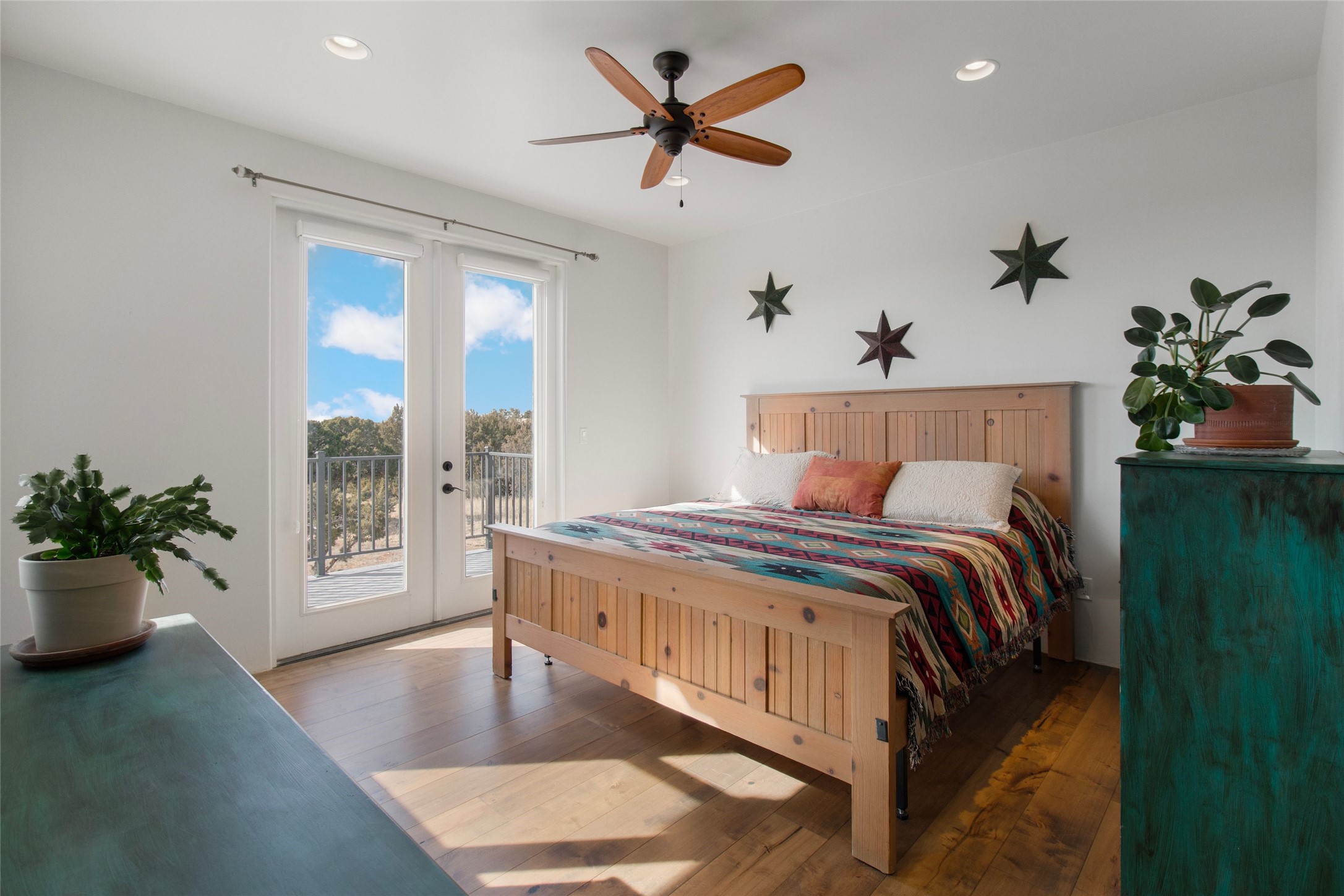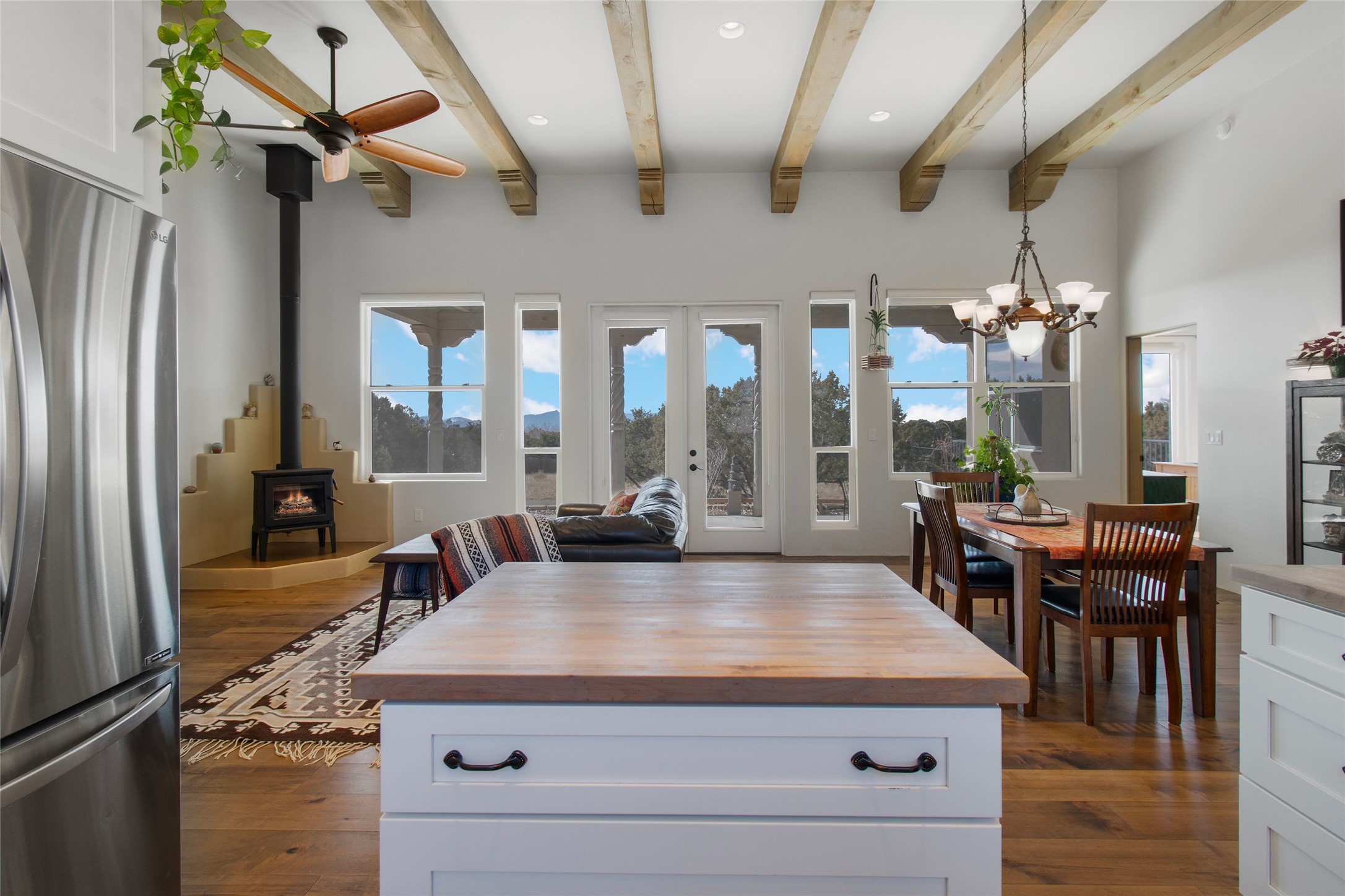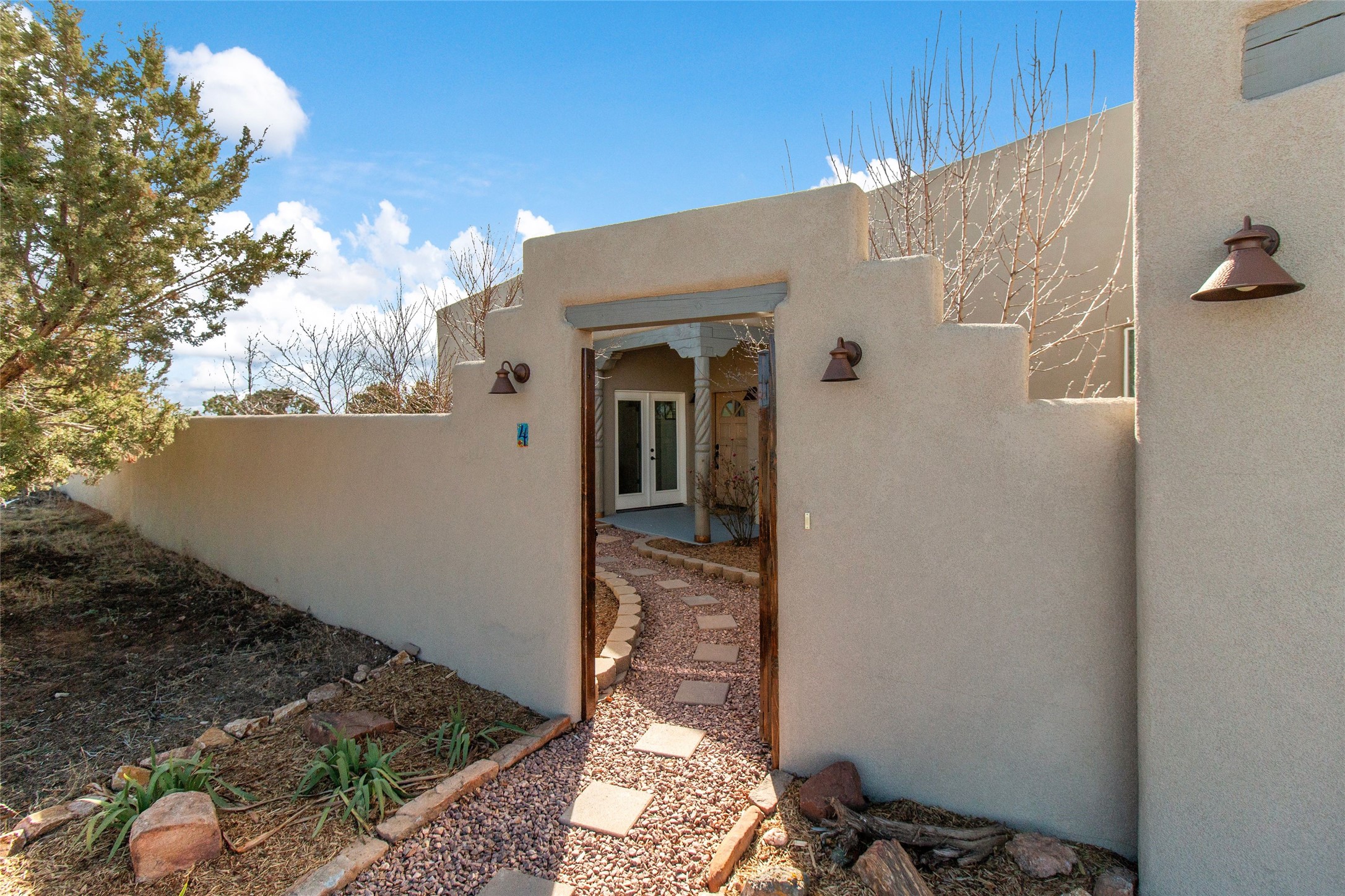 Pride of ownership is apparent the minute you walk into this 2019 contemporary build in Eldorado. Upon entry into the front court yard, you are greeted by apple, peach and cherry trees. The main house offers 3 bedrooms, 2 baths and open living concept with a split bedroom configuration for owner and guest privacy. Stunning views from the living room and back portal await you on this 1.4 acres. This home was built for energy efficiency as a priority with a HERS rating of 70. A solar panel system attached to the grid was added to the home in 2024 for ultra low electric bills. A Hearthstone Green Mountain convection wood stove takes the chill off those really cold winter evenings. An annually serviced tankless water heater ensures you never run out of hot water. Central cooling and heating. A detached one bedroom casita with a 3/4 quarters bathroom is perfect for guests or an in-law suite, plus an adjacent RV garage. For all the amenities available to homeowners in Eldorado, check out www.eldoradosf.org
