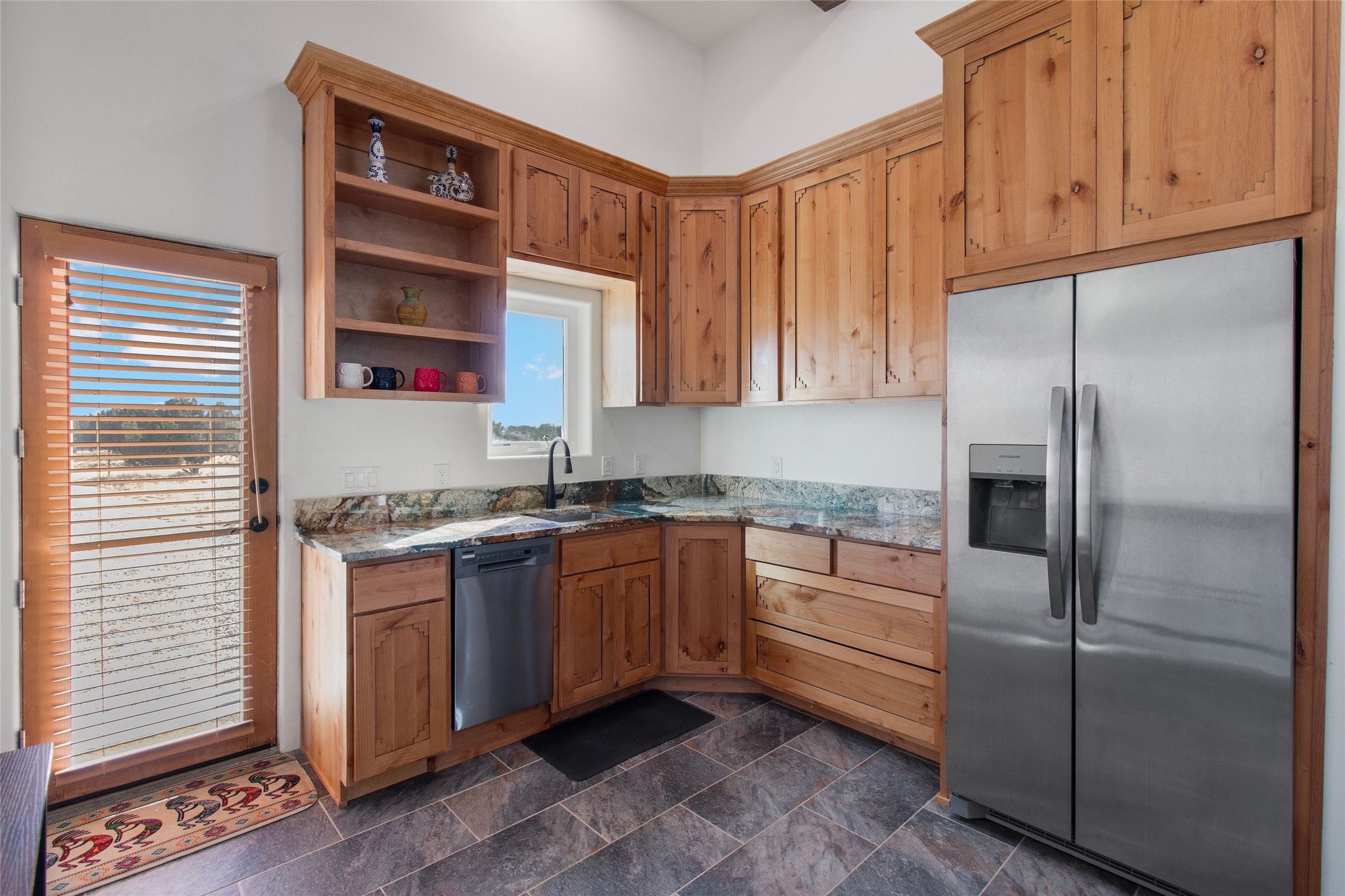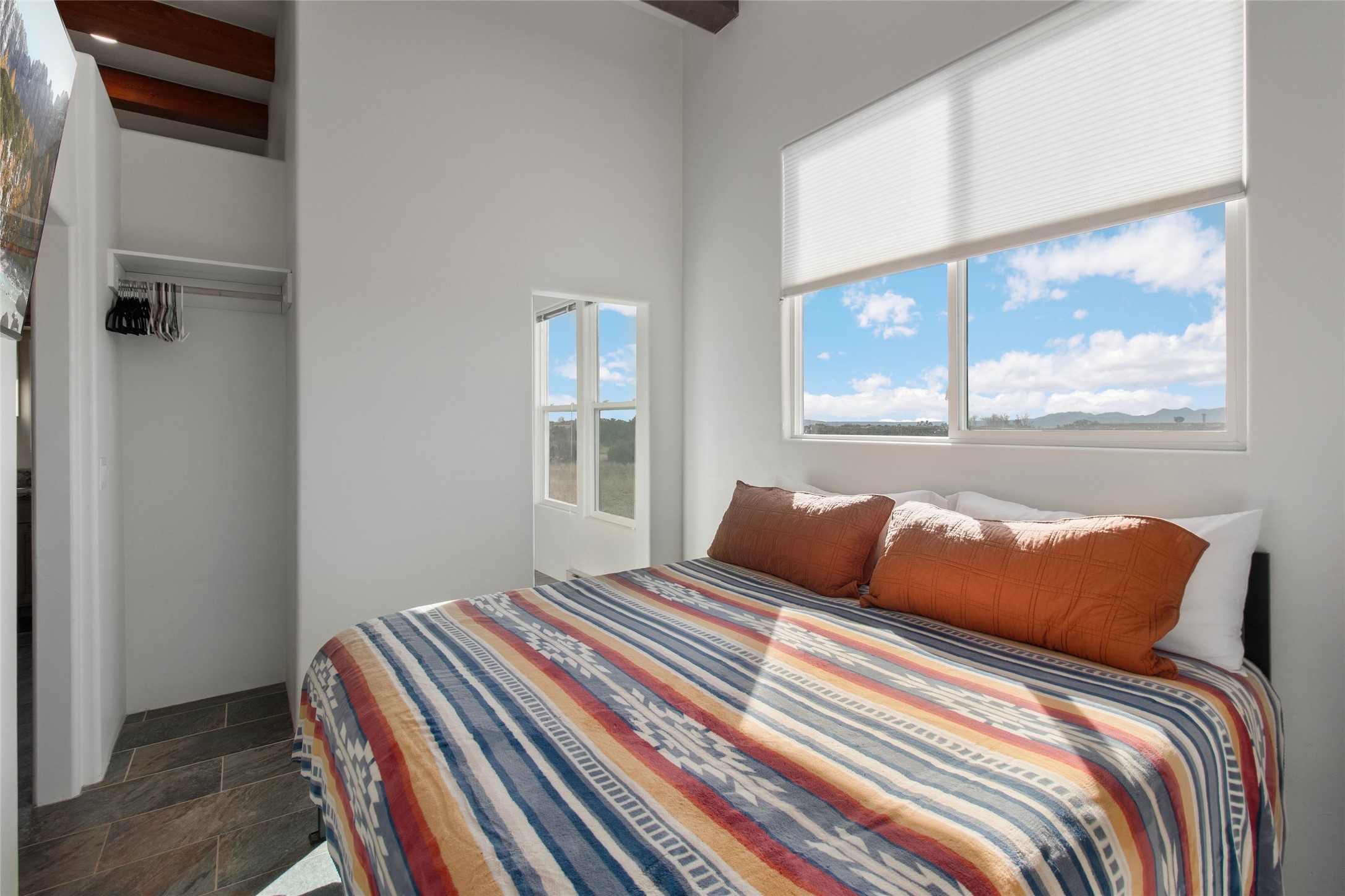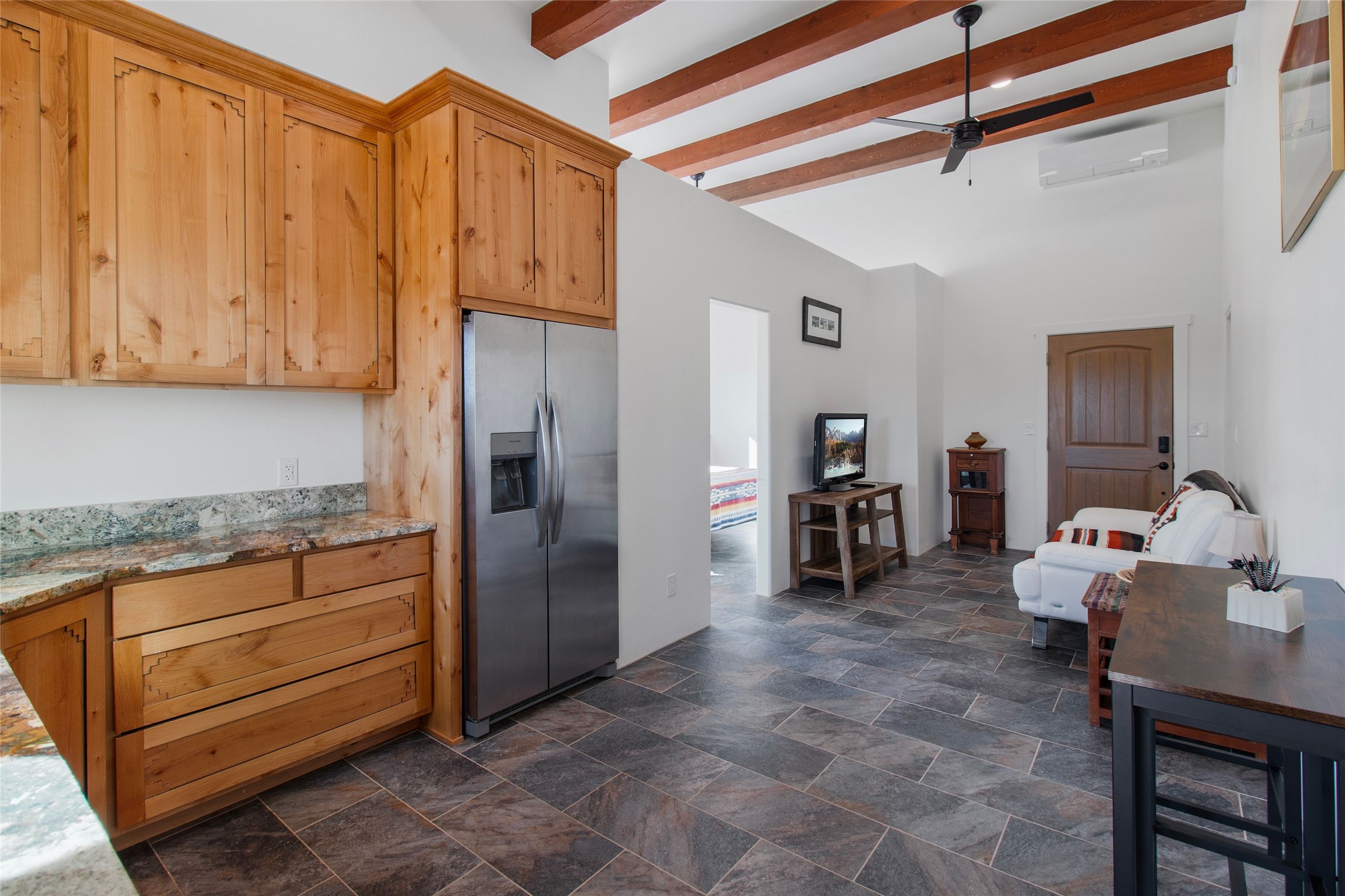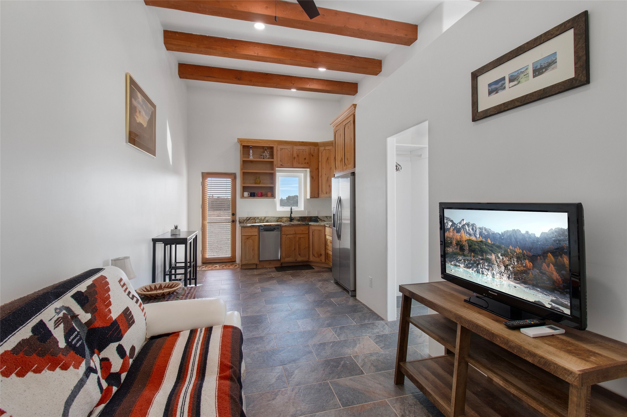 Pride of ownership is apparent the minute you walk into this 2019 contemporary build in Eldorado. Upon entry into the front court yard, you are greeted by apple, peach and cherry trees. The main house offers 3 bedrooms, 2 baths and open living concept with a split bedroom configuration for owner and guest privacy. Stunning views from the living room and back portal await you on this 1.4 acres. This home was built for energy efficiency as a priority with a HERS rating of 70. A solar panel system attached to the grid was added to the home in 2024 for ultra low electric bills. A Hearthstone Green Mountain convection wood stove takes the chill off those really cold winter evenings. An annually serviced tankless water heater ensures you never run out of hot water. Central cooling and heating. A detached one bedroom casita with a 3/4 quarters bathroom is perfect for guests or an in-law suite, plus an adjacent RV garage. For all the amenities available to homeowners in Eldorado, check out www.eldoradosf.org