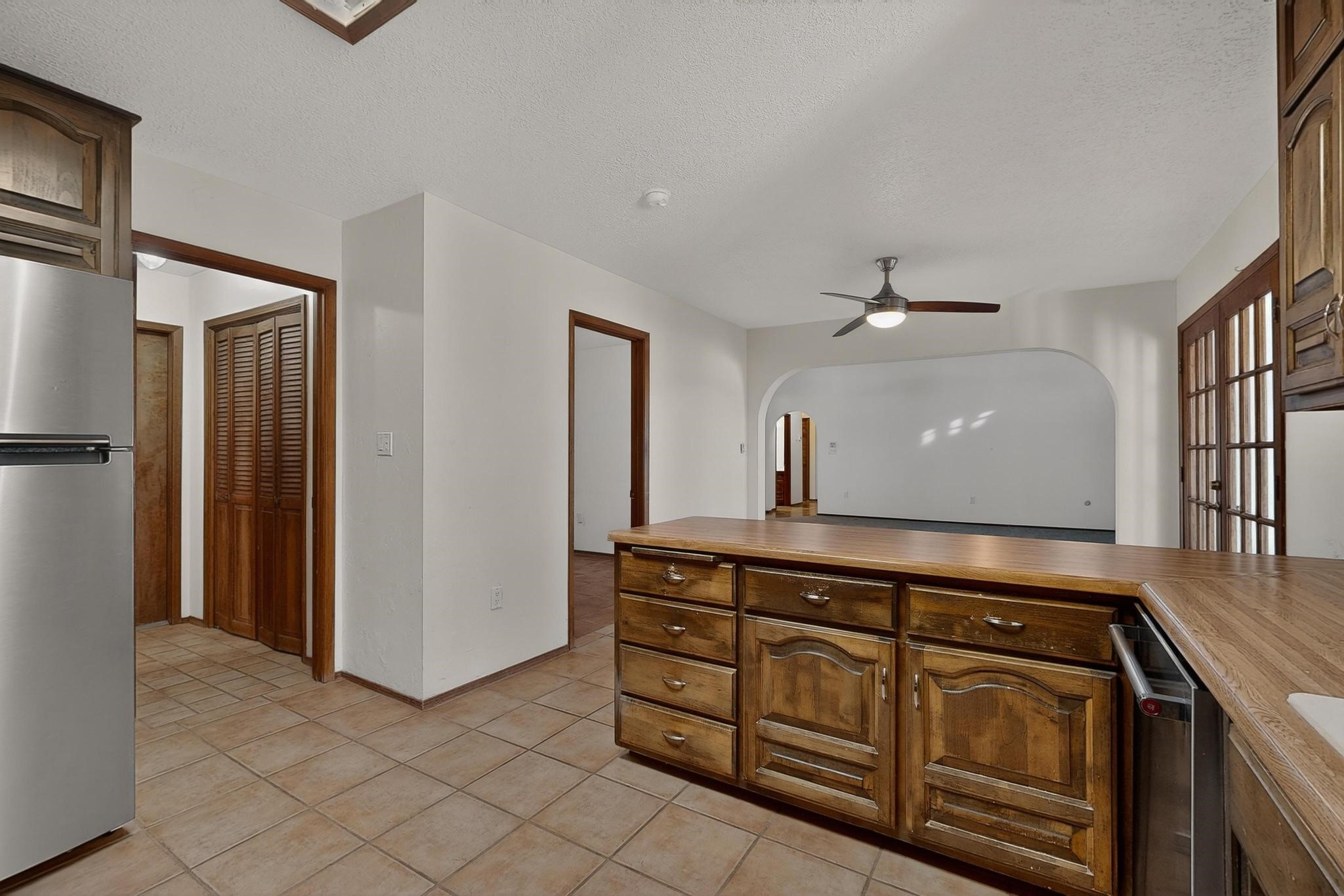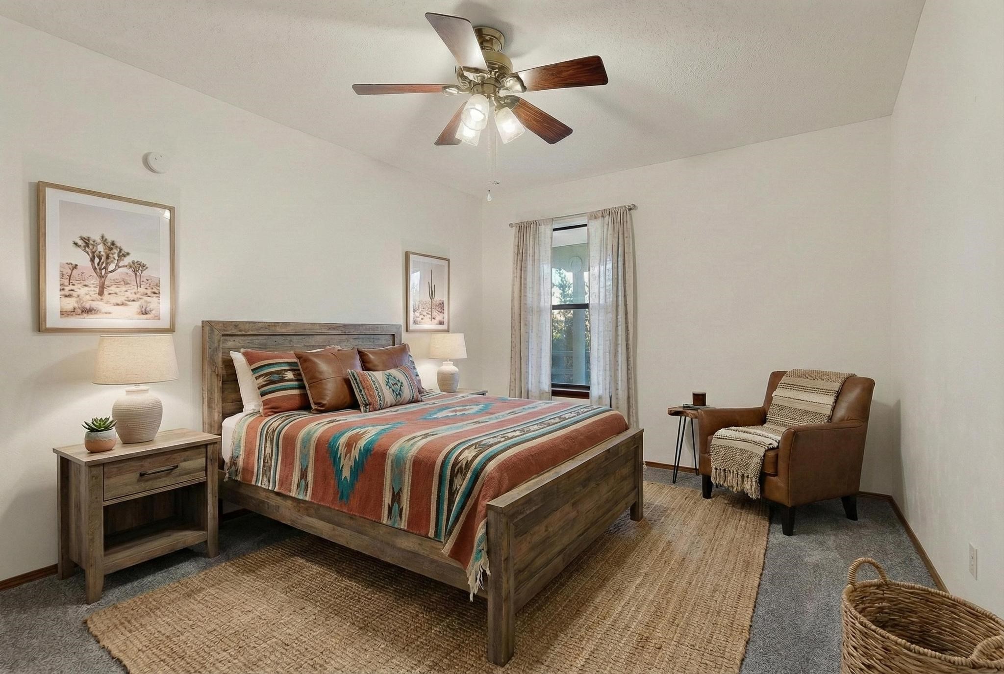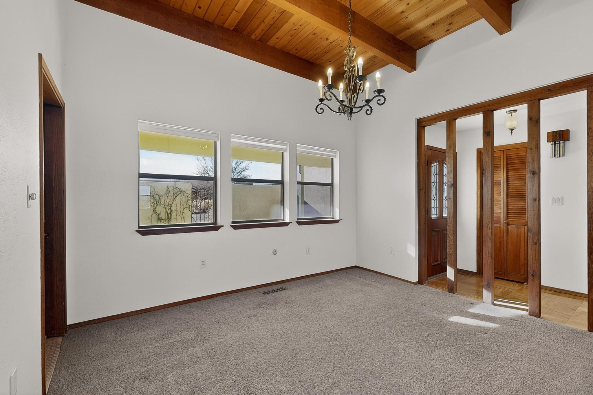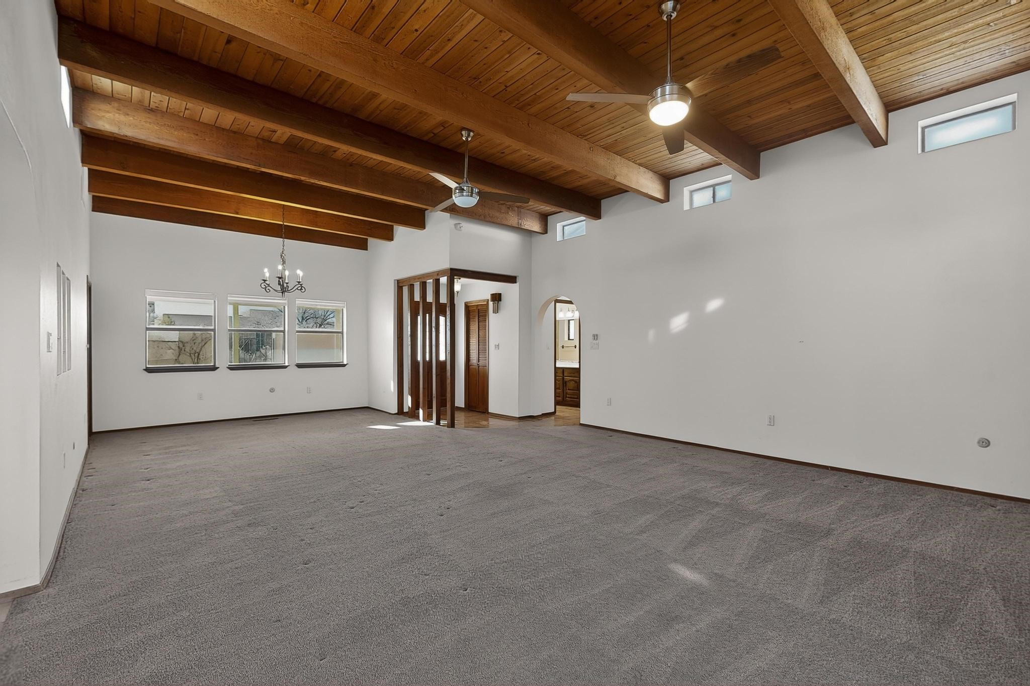 Thoughtfully designed approx. 2,500 sq ft, 3-bedroom plus flex room, 3-bath, 2-car garage home on a desirable double lot backing to open space, offering added privacy and beautiful views. The spacious living area, with room for an office or sitting area, features vaulted wood beam ceilings, a stone gas fireplace updated in 2023, and built-in shelving.The well-planned layout includes two primary bedrooms with en-suite baths, one with a walk-in closet, plus a third bedroom and an additional full bath. Bathrooms have been thoughtfully updated, including a remodeled primary bath with a walk-in shower. A sunroom, small office area off the kitchen, direct-access garage, and dedicated laundry room provide excellent flexibility for daily living.Notable improvements include a new furnace and water heater (2019), updated kitchen appliances and lighting, newer washer and dryer, insulated garage door, updated interior and exterior lighting, ceiling fans, window coverings, replaced window pulleys and screens, UV/heat-filtering window film, and new carpet in the living area and bedrooms. Additional amenities include marble flooring, forced air heating, central evaporative cooling, raised garden beds, fruit trees, and recent exterior updates.A wonderful opportunity to enjoy space, privacy, views, and relaxed Cochiti living. Please see the documents section for a complete list of updates and improvements.