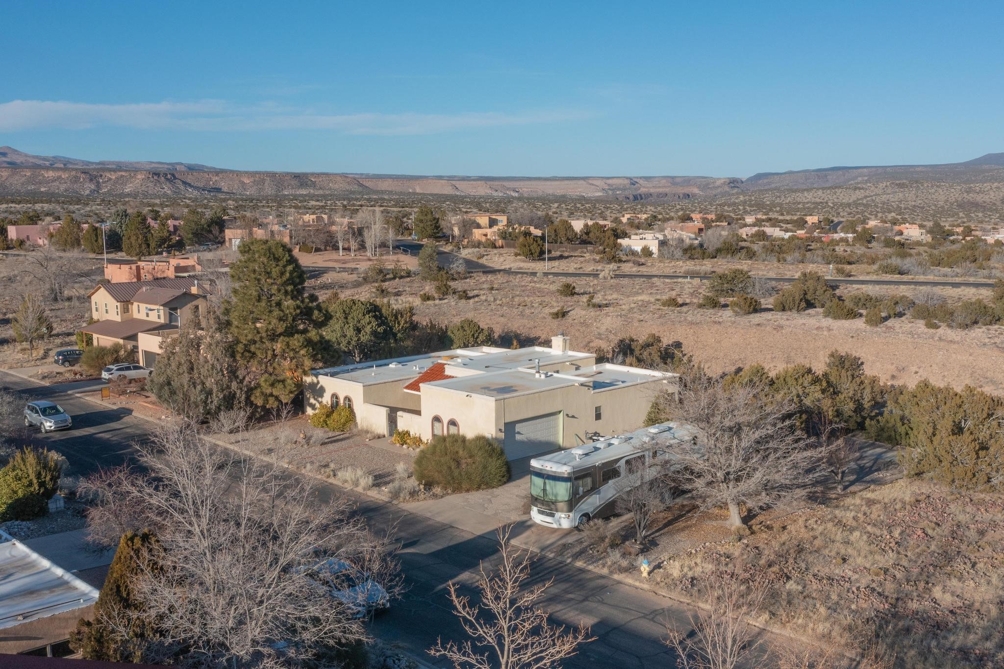PRICE REDUCED!! Thoughtfully designed approx. 2,500 sq ft, 3-bedroom plus flex room, 3-bath, 2-car garage home on a desirable double lot backing to open space, offering added privacy and beautiful views. The spacious living area, with room for an office or sitting area, features vaulted wood beam ceilings, a stone gas fireplace updated in 2023, and built-in shelving. The well-planned layout includes two primary bedrooms with en-suite baths, one with a walk-in closet, plus a third bedroom and an additional full bath. Bathrooms have been thoughtfully updated, including a remodeled primary bath with a walk-in shower. A sunroom, small office area off the kitchen, direct-access garage, and dedicated laundry room provide excellent flexibility for daily living. Notable improvements include a new furnace and water heater (2019), updated kitchen appliances and lighting, newer washer and dryer, insulated garage door, updated interior and exterior lighting, ceiling fans, window coverings, replaced window pulleys and screens, UV/heat-filtering window film, and new carpet in the living area and bedrooms. Additional amenities include marble flooring, forced air heating, central evaporative cooling, raised garden beds, fruit trees, and recent exterior updates. A wonderful opportunity to enjoy space, privacy, views, and relaxed Cochiti living. Please see the documents section for a complete list of updates and improvements.