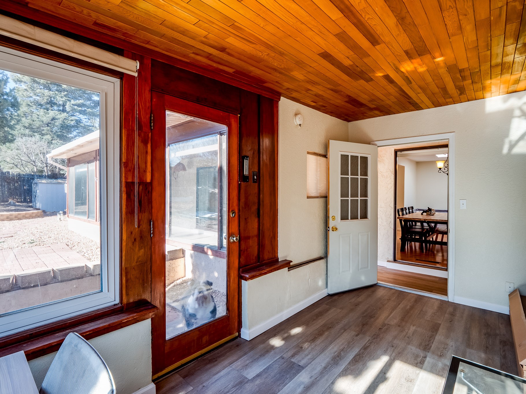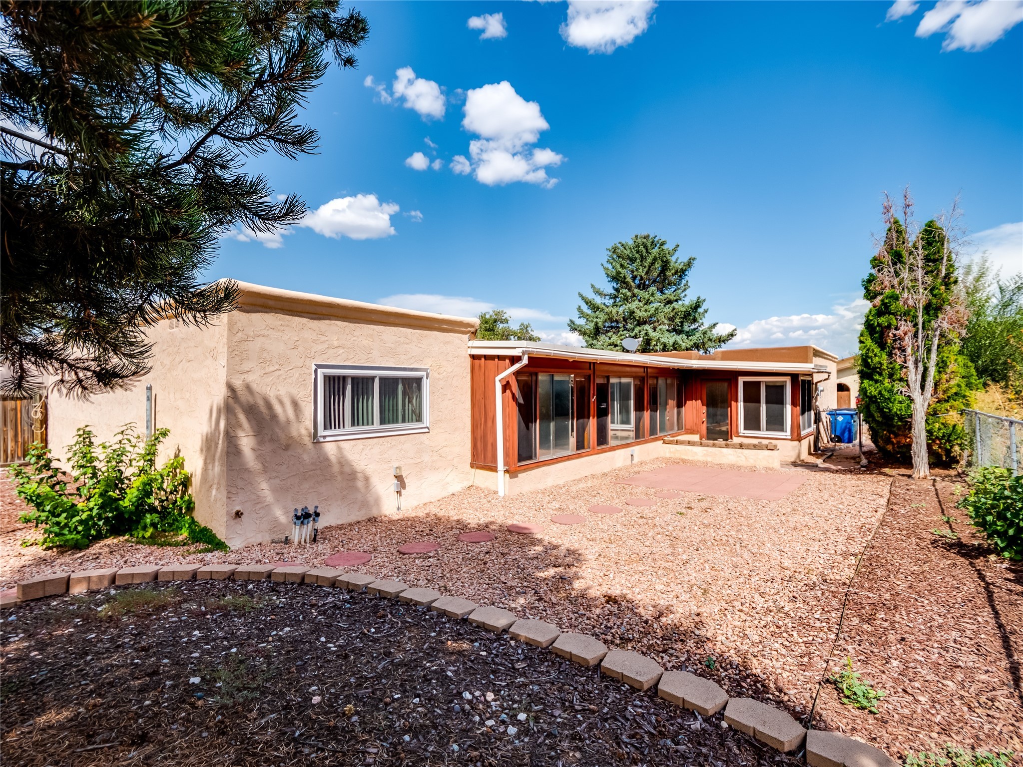 This charming single-story home in White Rock offers beautiful xeriscape landscaping and a welcoming layout. Step through the front entrance onto laminate wood floors that extend through the main living areas. A coat closet and convenient access to the two-car garage greet you at the entry. The spacious living room features a large front-facing window and a skylight, filling the space with natural light. Adjacent to the living room is a dining space with sliders leading to a bright sunroom with new laminate wood flooring. The bonus room, with the same new floors, offers additional space and leads to the backyard, with another access point to the garage for convenience. The galley-style kitchen boasts wood cabinets with glass inlays, hard surface countertops, tile flooring, stainless steel appliances, and a gas oven/range. Another skylight brightens up this functional space. Down the hallway, you'll find a large guest room with a double-door walk-in closet and sliders leading to the sunroom, a guest bathroom with a single sink vanity and a tiled shower/tub, and an open laundry space with upper cabinets that could easily be enclosed. The spacious primary en-suite includes a walk-in closet and sliders to the sunroom, while the primary bathroom has a single sink vanity and tiled shower/tub. The sunroom is surrounded by windows, offering a perfect view of the fenced-in backyard with its low-maintenance landscaping, mature trees, and room to create your dream garden or outdoor living area. With parks, trails, shopping, and restaurants just a short distance away, this home is in an ideal location. Come take a tour today!