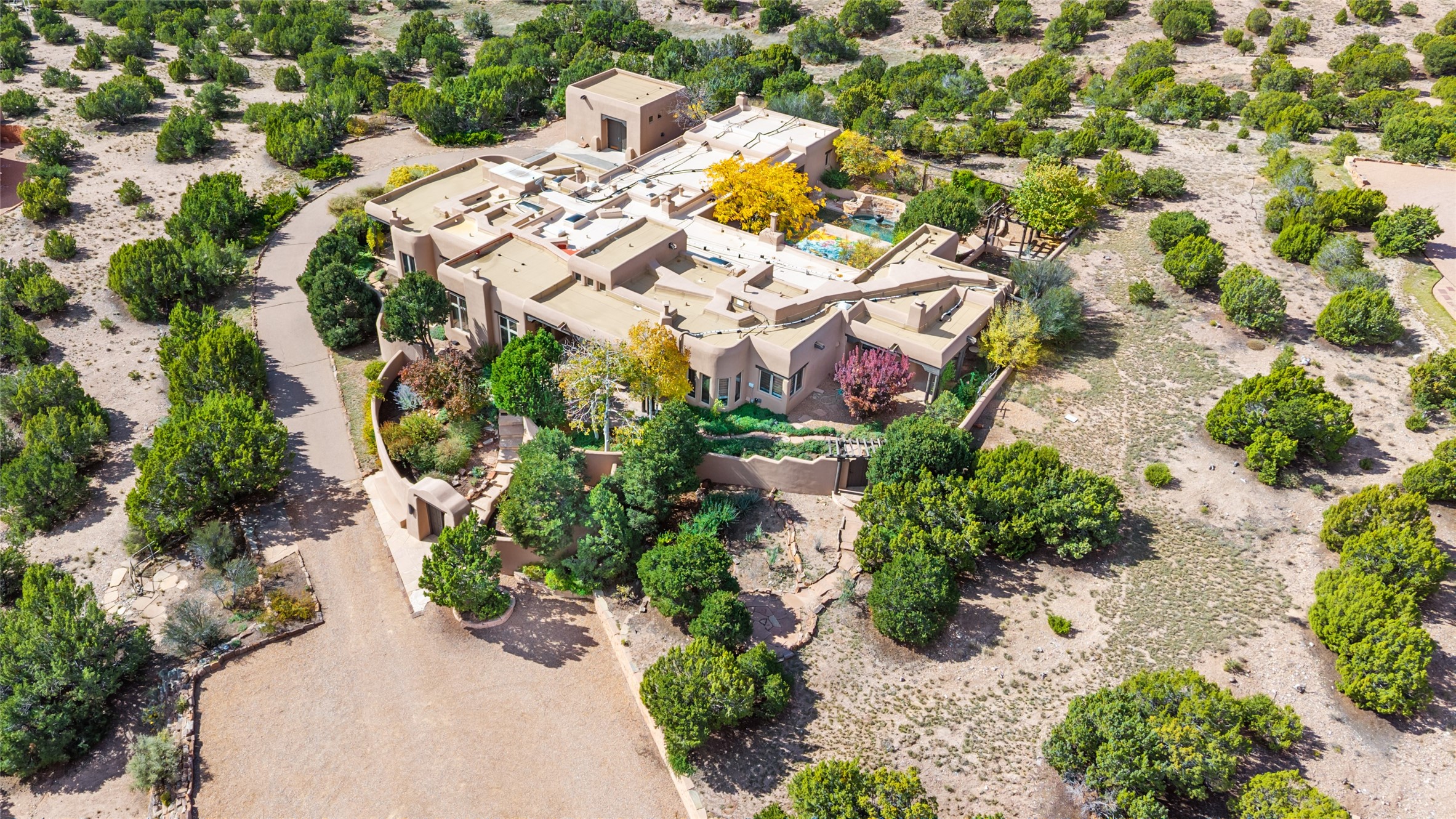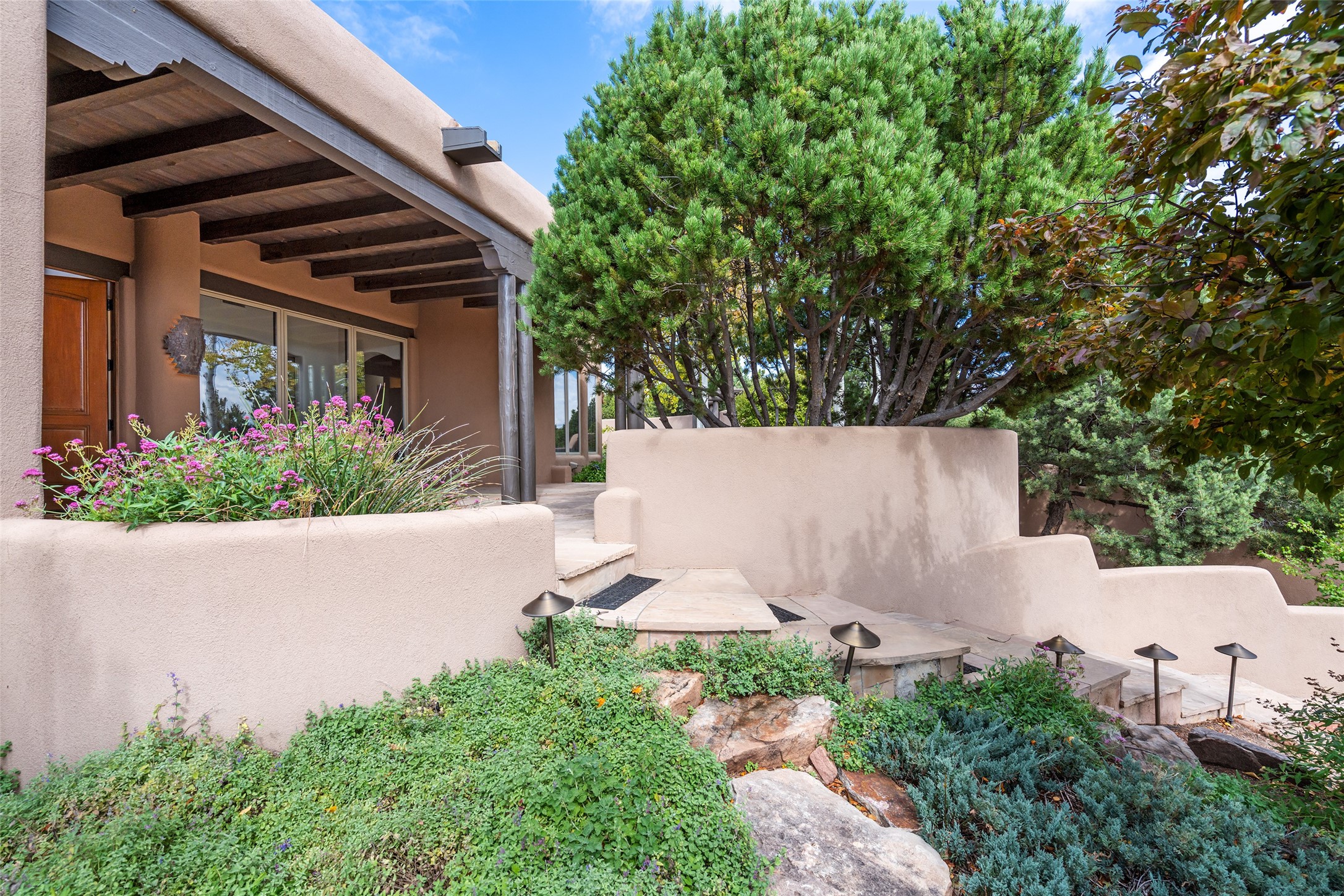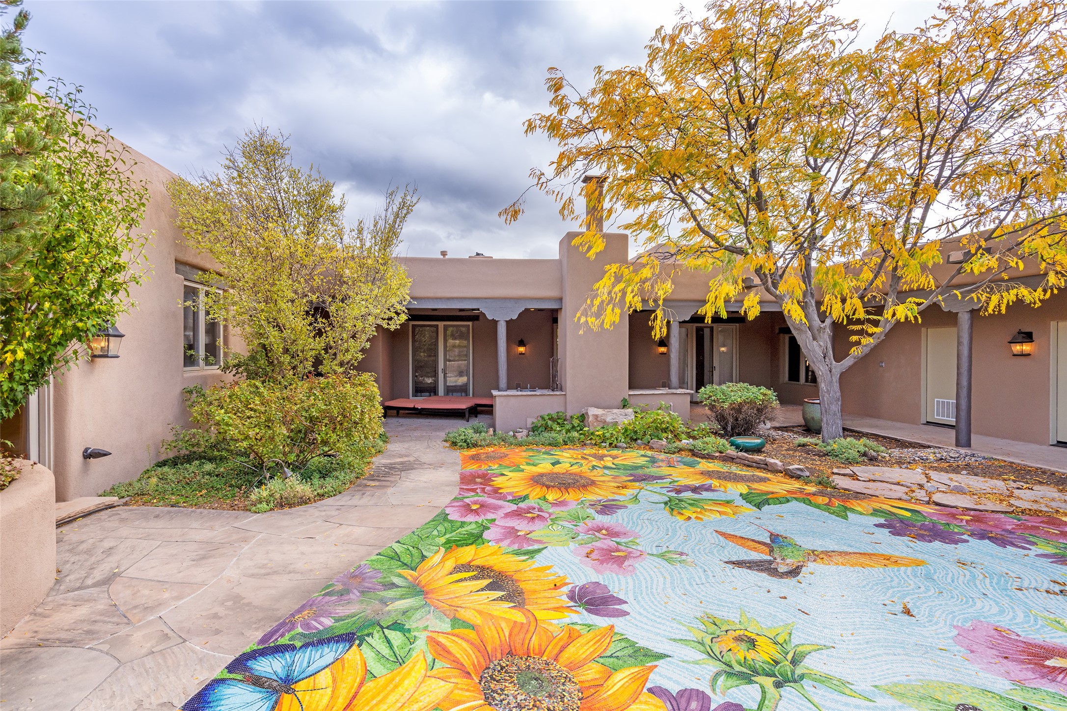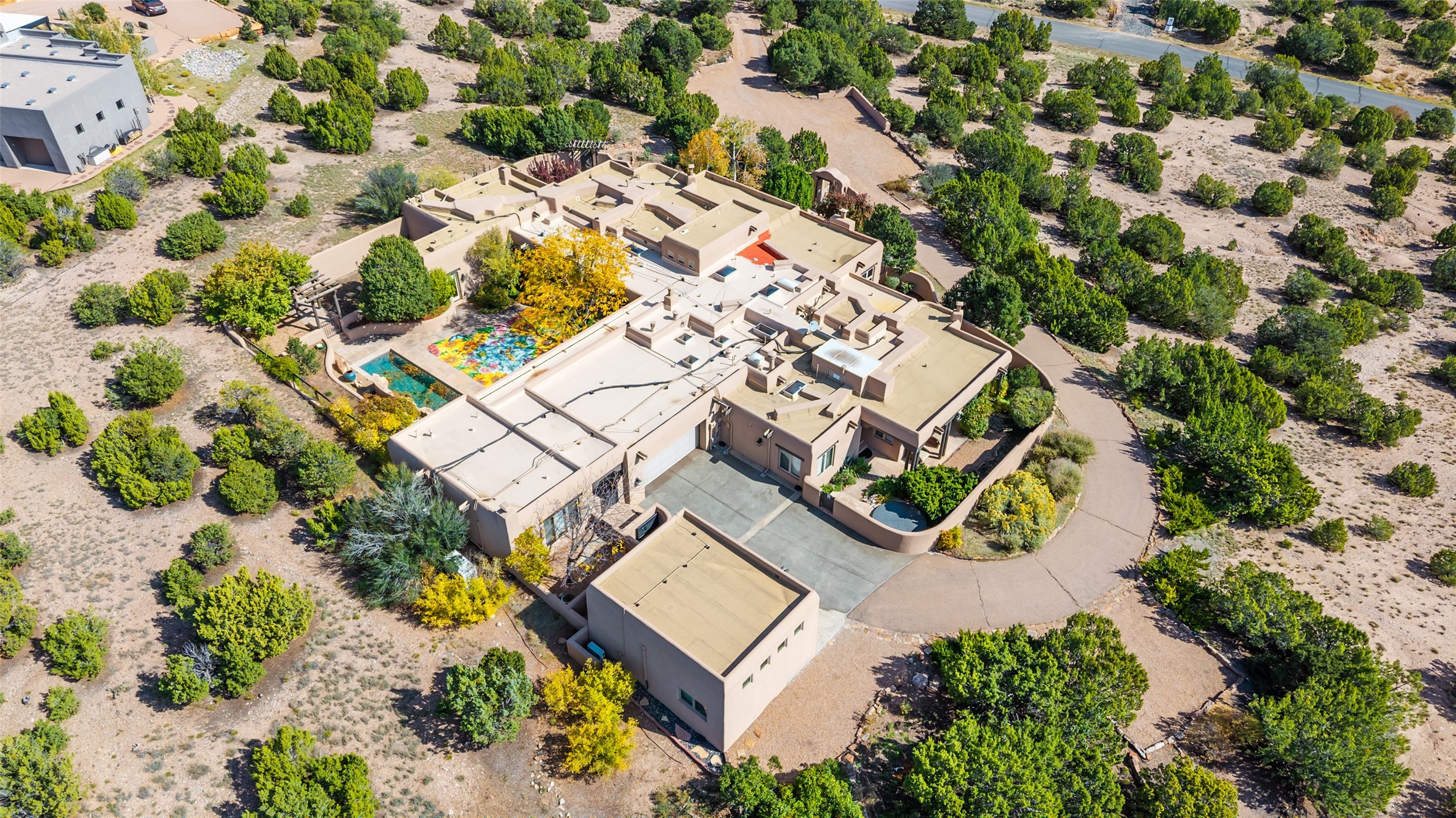 Expansive two bedroom home with guest house and studio. Exceptional views from your front porch and broad portal and large private back yard area perfect for entertaining. 230 square foot lap pool and hot tub for relaxing or entertaining. The main house has a grand foyer ready for art work with a back door showcasing the rear portal and back yard. The large kitchen has plenty of cabinet space, a butlers pantry, quartz counter tops, Wolf 5 burner stove, Cove Dishwasher, Subzero refrigerator, and a cozy banco/breakfast nook offset by a kiva fire place. Adjacent to the kitchen is a dining room that can easily seat 8 with nice views into the back courtyard and front yard. Down two steps past the office and large great room with fireplace to the massive main suite, full bathroom, soaking tub, two walk-in closets, sitting areas and easy access to the 8' hot tub. Guest house has a full kitchen and full bath. Detached studio ready for your endeavors. 2025 roof update with 5 year limited warranty on labor and materials. Must see this gem. Set up a showing today.