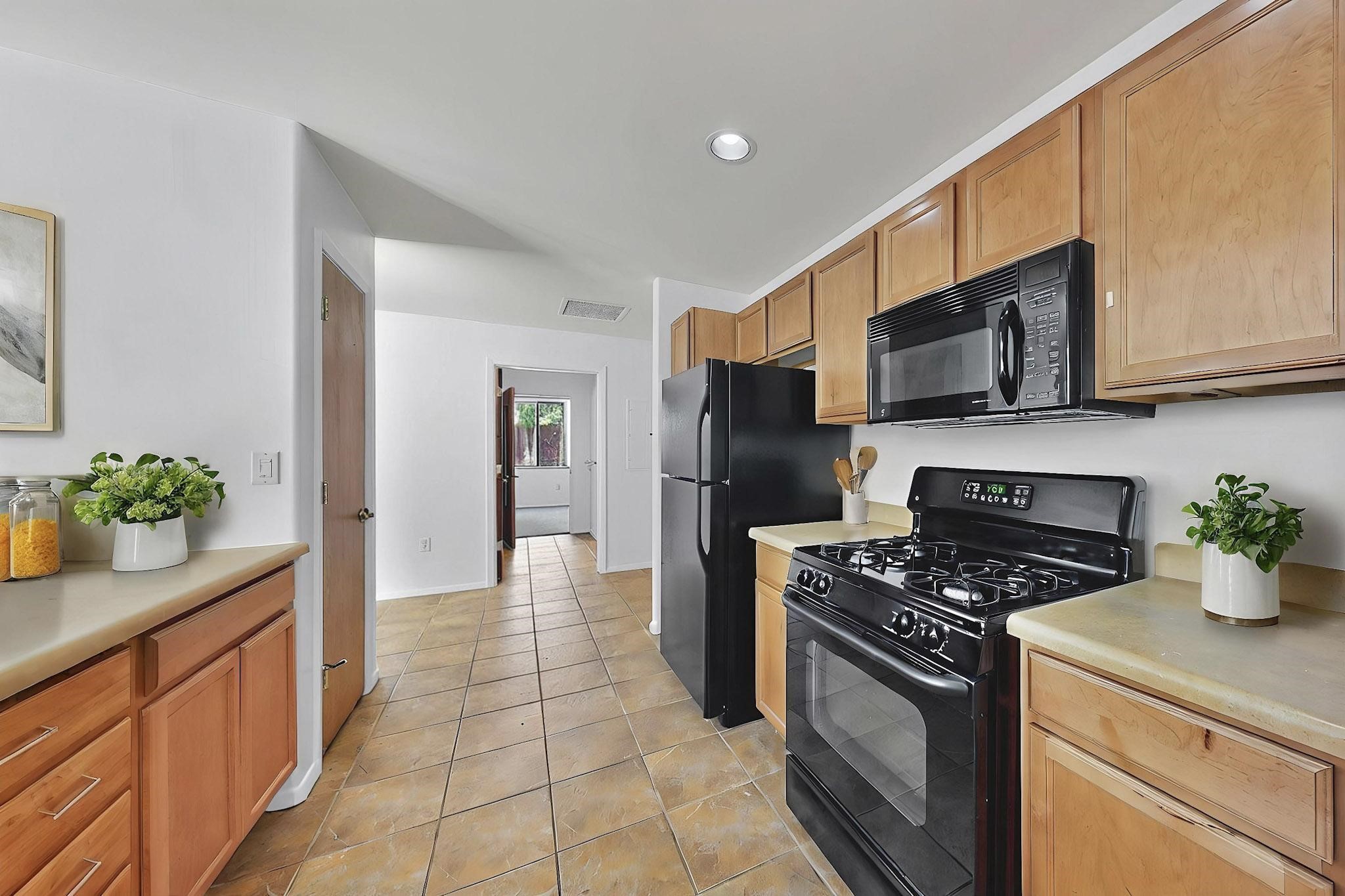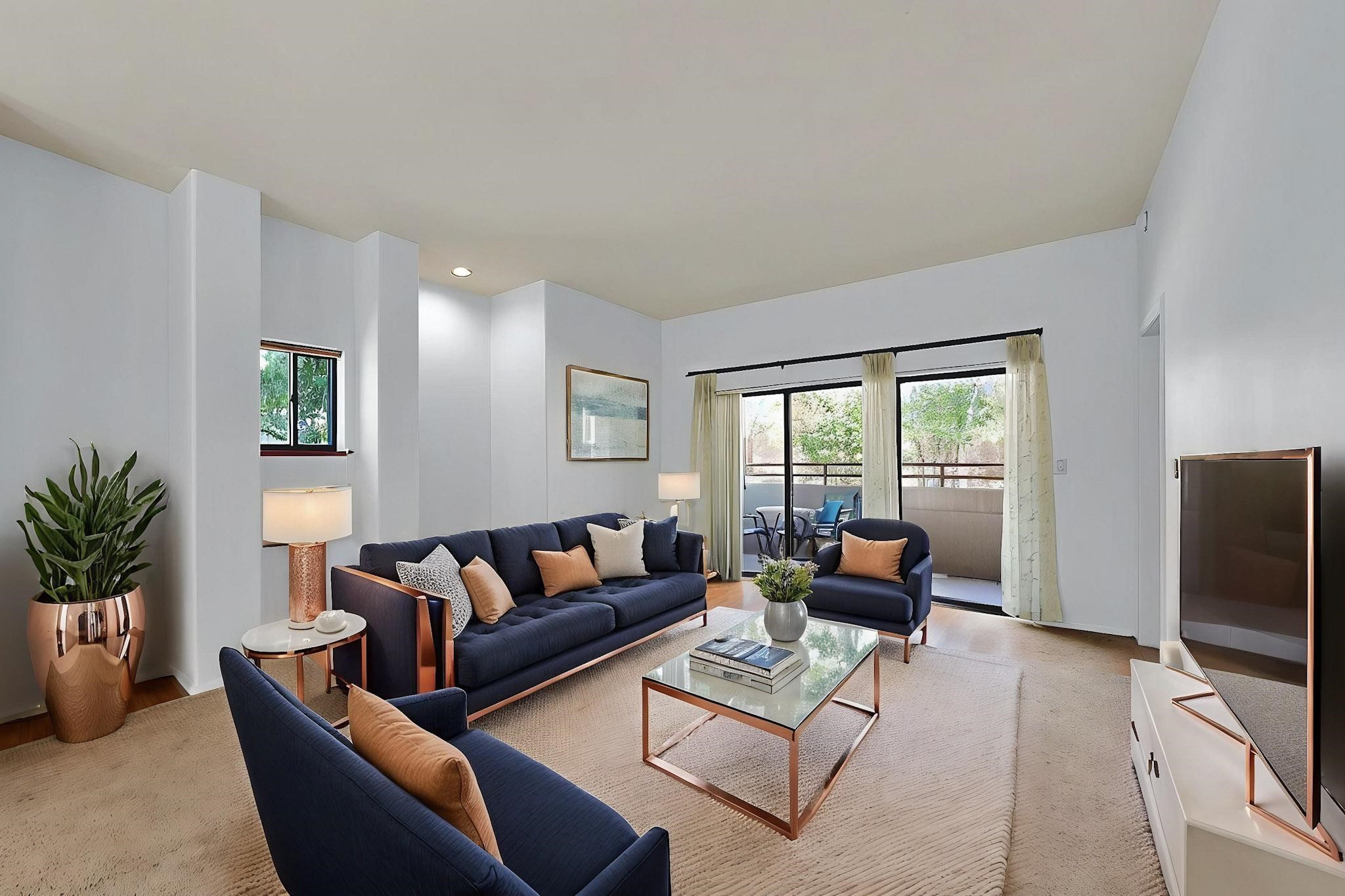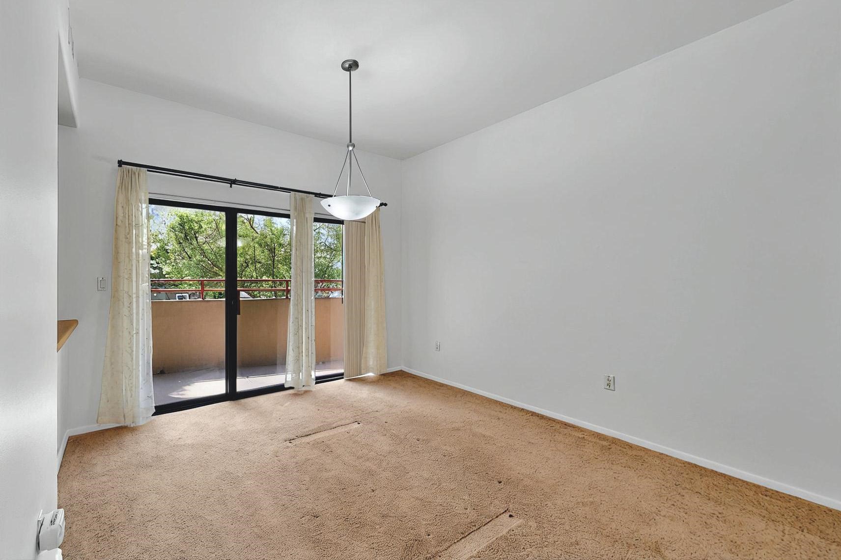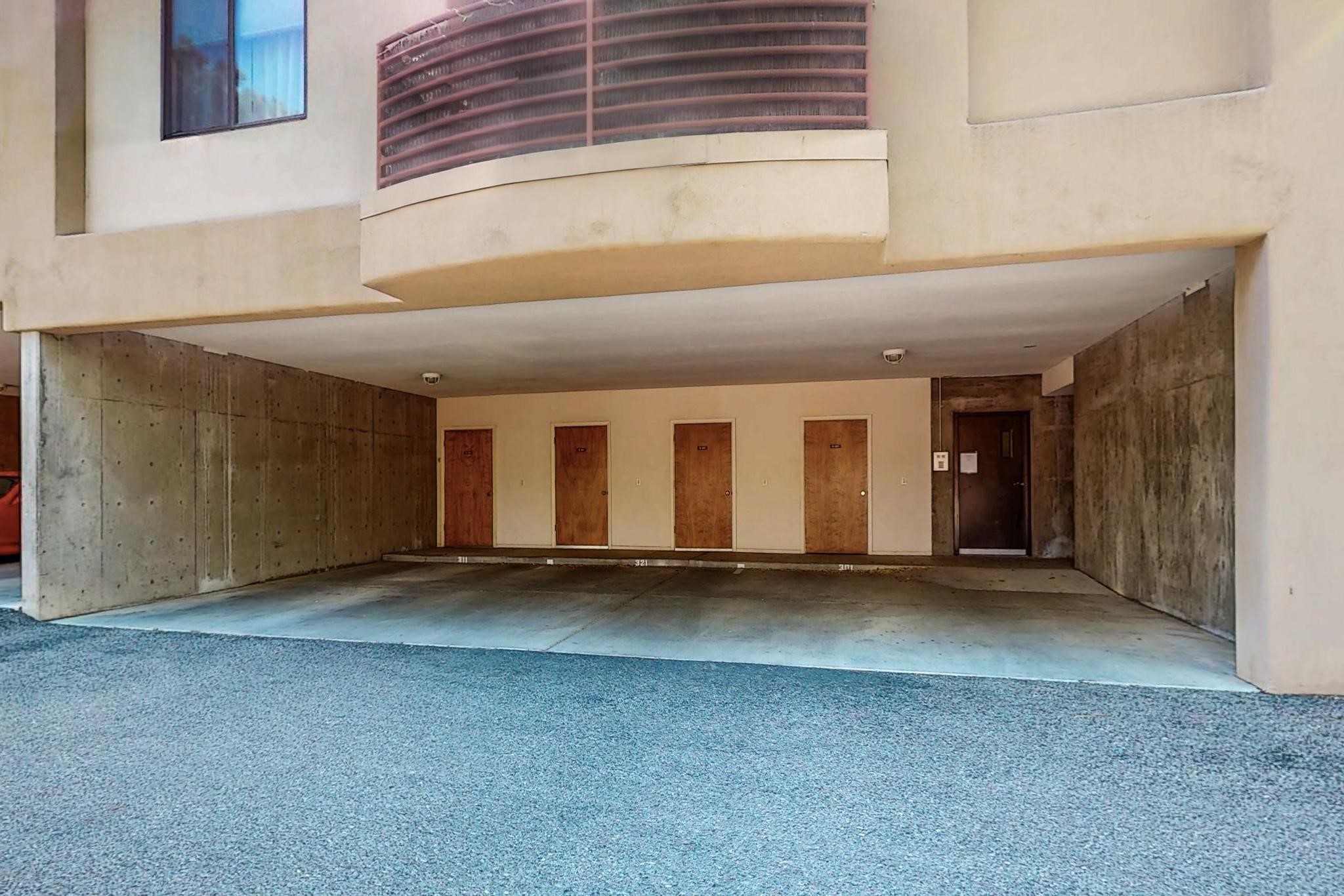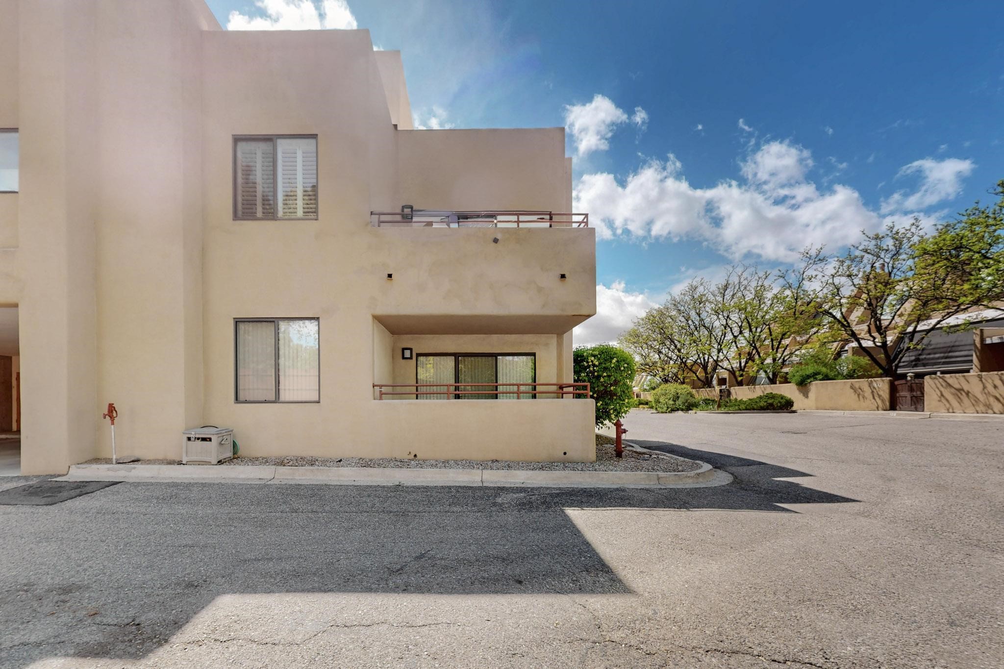 Grandparents need a crash pad? Student without campus housing? Or, just downsizing? Midtown ground floor end unit with secured direct entry right off the assigned covered carport and no stairs! Huge 17' x 6 1/2' storage closet perfect for skis, biclycles, etc., to free up condo space. Close to Trader Joe's, State buildings, shopping and restaurants. Contemporary spacious layout flanked by 2 private terraces; east for breakfast and west for sunset cocktails. Open concept living/dining/kitchen with 10' ceilings. Large galley kitchen with laundry and central A/C. Public transportation to The Plaza is about 5 to 10 minutes away and the close by Rail Runner takes about an hour to Albuquerque. This small complex is close to everything yet discretely hidden for quiet and privacy with a nicely landscaped courtyard.