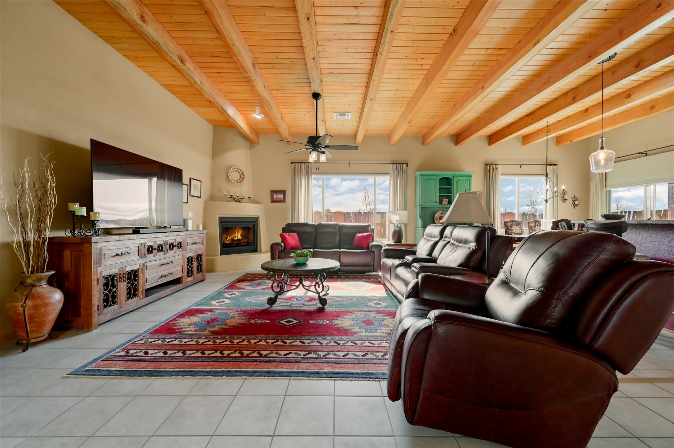 Located in the highly sought-after La Pradera subdivision, this refined Pueblo-style residence embodies the ease and elegance of Santa Fe living. The property features a spacious 1,692 sq ft main home and a charming 394 sq ft casita--ideal for hosting guests, creating a private studio, or generating rental income. The main home welcomes you with an expansive open-concept great room, where the kitchen, dining, and living areas blend seamlessly under warm Southwestern accents and a classic kiva fireplace. A thoughtful floor plan provides excellent bedroom separation, ensuring comfort and privacy for both residents and guests. The luxurious primary suite offers a soaking tub, walk-in shower, and dual walk-in closets, creating a serene retreat. Across a beautifully designed courtyard, the casita offers its own bedroom, 3/4 bath, a cozy living area, and a kitchenette, providing guests with independence and comfort throughout their stay. A rare 3-car garage enhances both convenience and storage. The neighborhood features extensive paved and natural walking trails, as well as a playground, making it ideal for an active lifestyle. The home also backs to protected open space, offering added privacy and unobstructed views. Designed for low-maintenance living, the xeriscaped landscaping makes this an ideal second home or lock-and-leave retreat. Even better, all furniture conveys (excluding art, rugs & TVs), allowing you to step effortlessly into the Santa Fe lifestyle from the moment you arrive. The furniture package is optional.