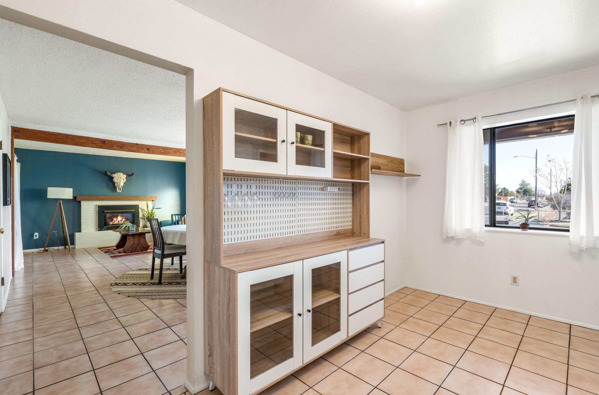 Lovingly maintained and full of charm, this inviting home is nestled in a well-established Santa Fe neighborhood just minutes from shopping, restaurants, healthcare, and everyday conveniences.Step inside to a bright and welcoming open living and dining area featuring beautiful tile floors, a cozy gas fireplace, and sliding glass doors that lead to an expansive covered portal--perfect for outdoor dining, relaxing, or entertaining while overlooking the generous backyard.The thoughtfully updated kitchen blends style and functionality with a classic farm sink, elegant quartz countertops, and a delightful blue-and-white backsplash that frames the newer electric stove with personality and flair.Practical upgrades add to the home's appeal. The insulated, dry-walled garage includes the laundry area and offers a convenient exterior hookup for an electric car charger.All three bedrooms feature attractive wood-look vinyl flooring and sliding glass-paneled closet doors. The spacious primary suite is a true retreat, offering an oversized layout, a wall of closets with charming barn doors, and a cute ensuite bath. The full guest bath is equally appealing with a glass tub-and-shower enclosure and tasteful tile accents behind the sink and toilet.Natural light fills the home throughout, creating a warm and airy feel. Outside, the large backyard provides plenty of room to garden, play, or simply enjoy the outdoors, and includes a spacious garden shed for storage or hobbies.Energy-efficient features complete the package, including solar electric, a newer electric heat pump, and refrigerated A/C for year-round comfort.This delightful Santa Fe home offers character, thoughtful updates, and comfortable living in a fantastic location.